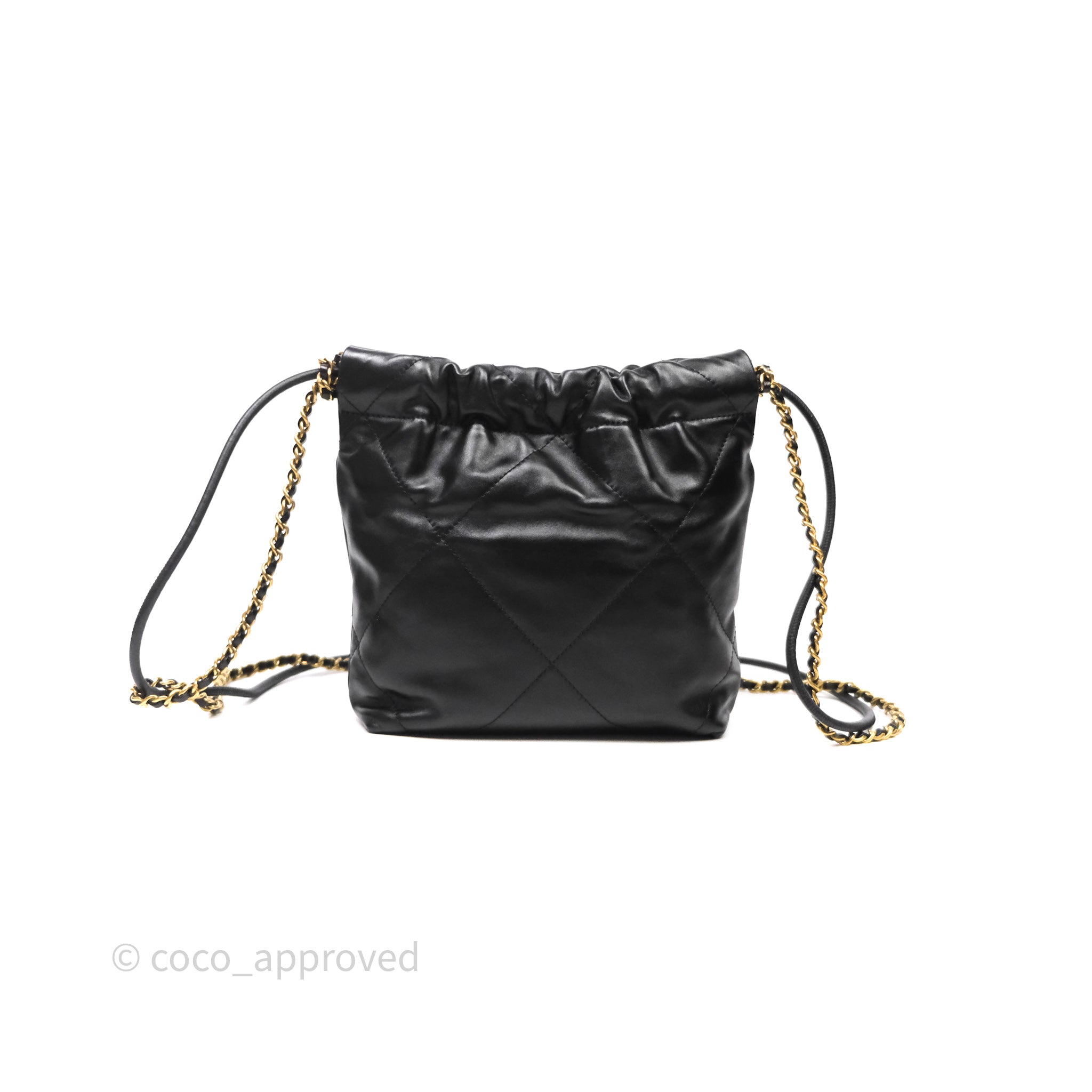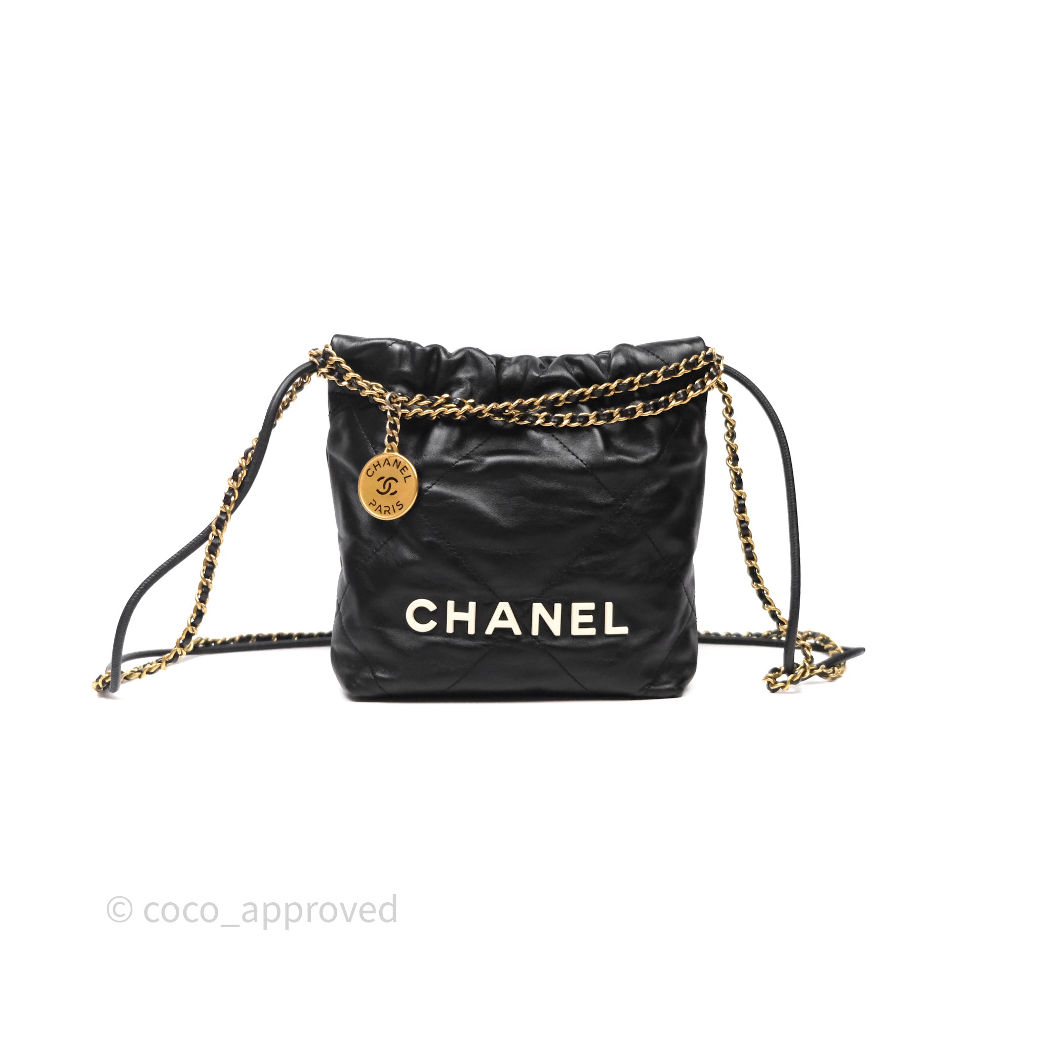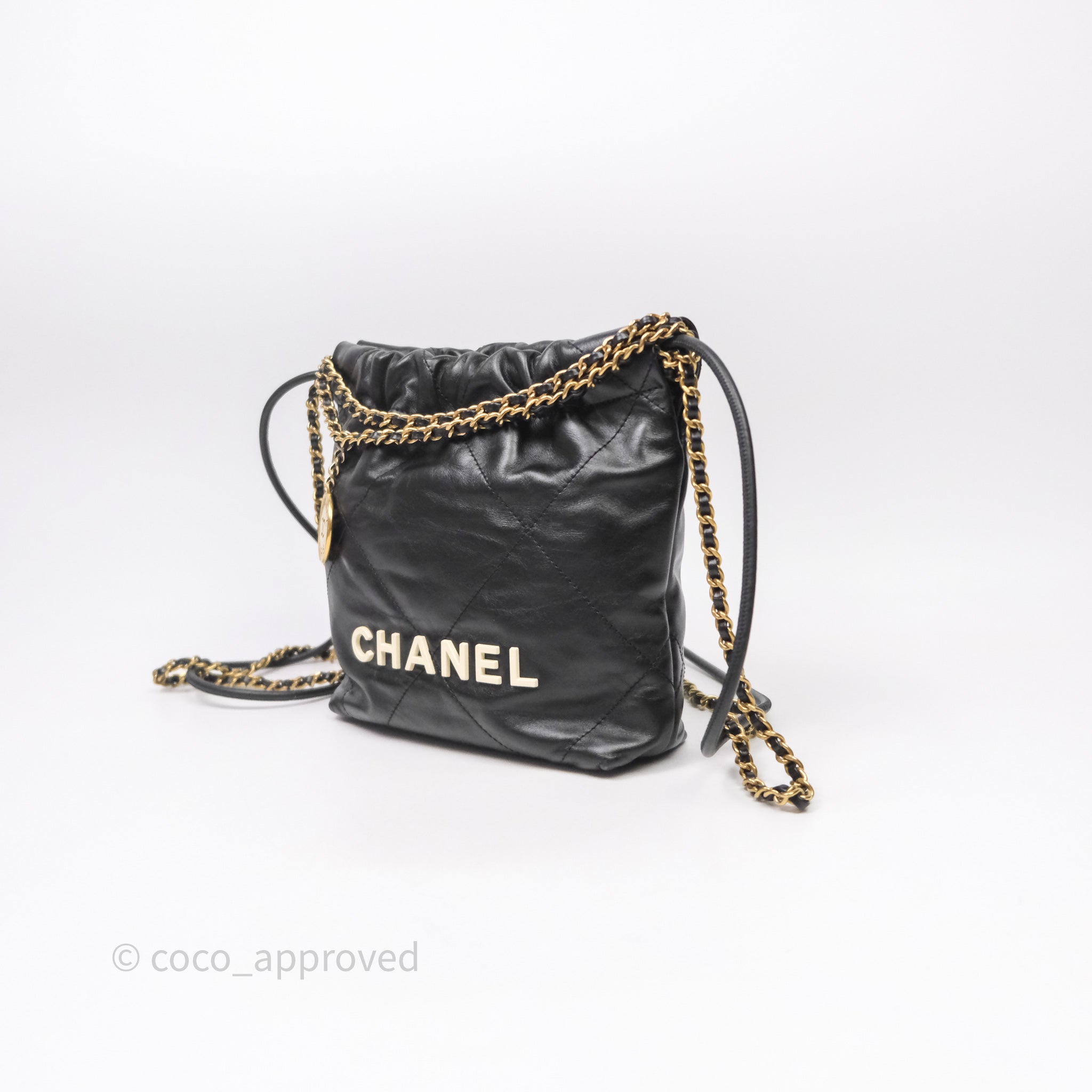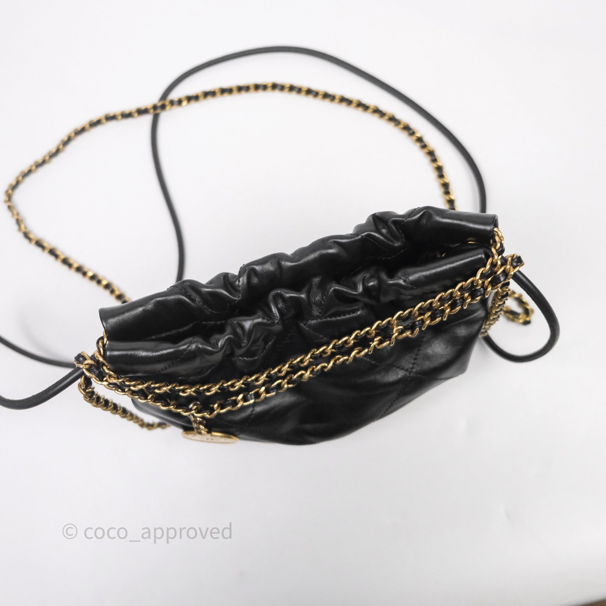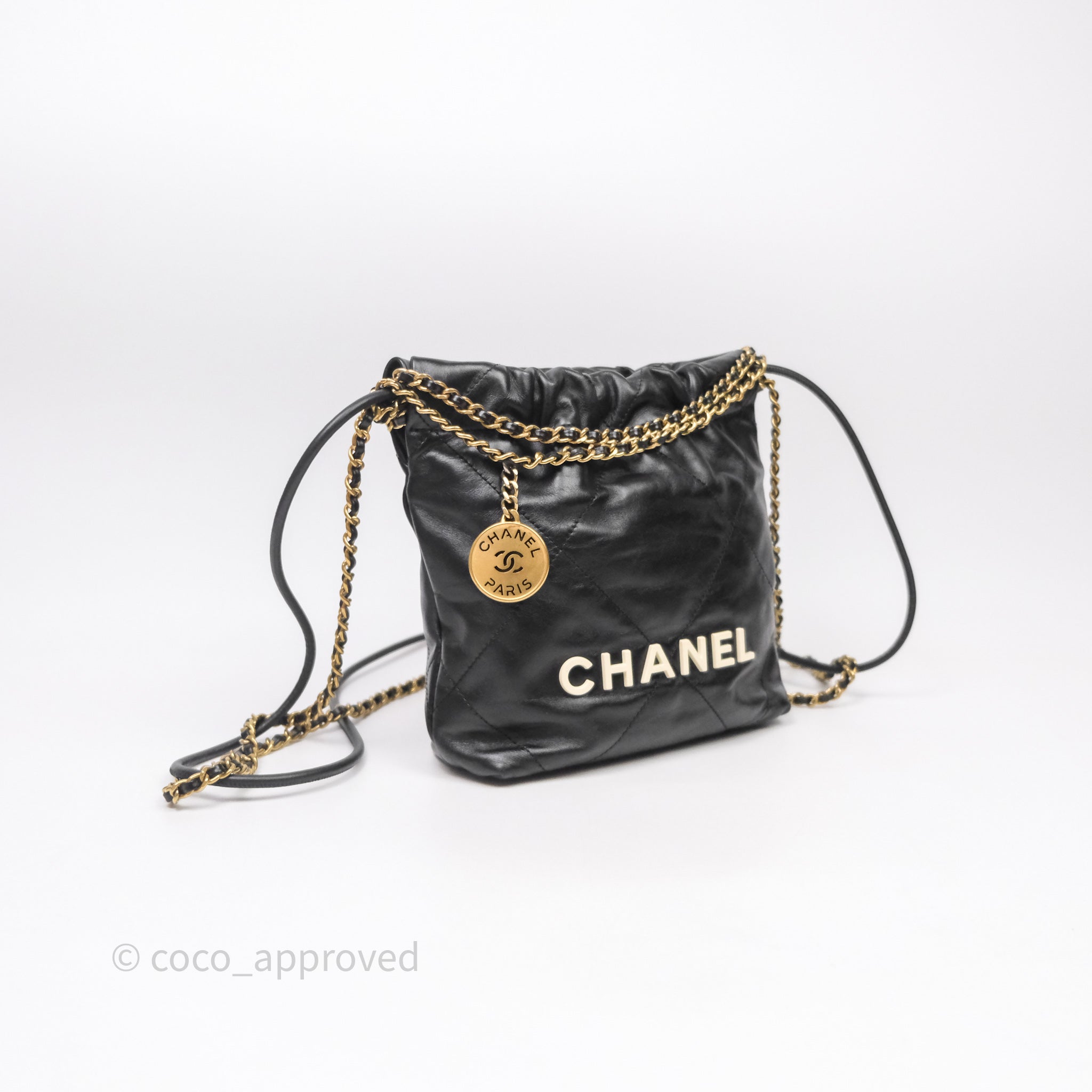 Chanel 22 Mini Bag Black Crumpled Calfskin White Lacquered Metal Logo