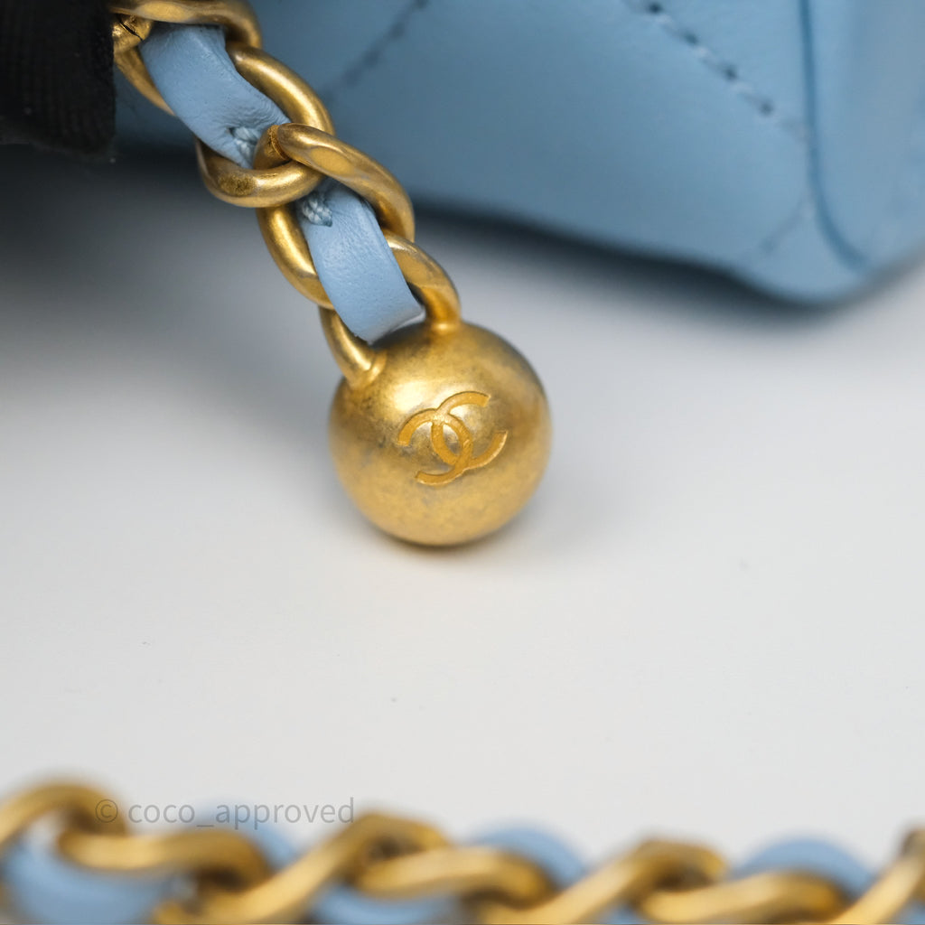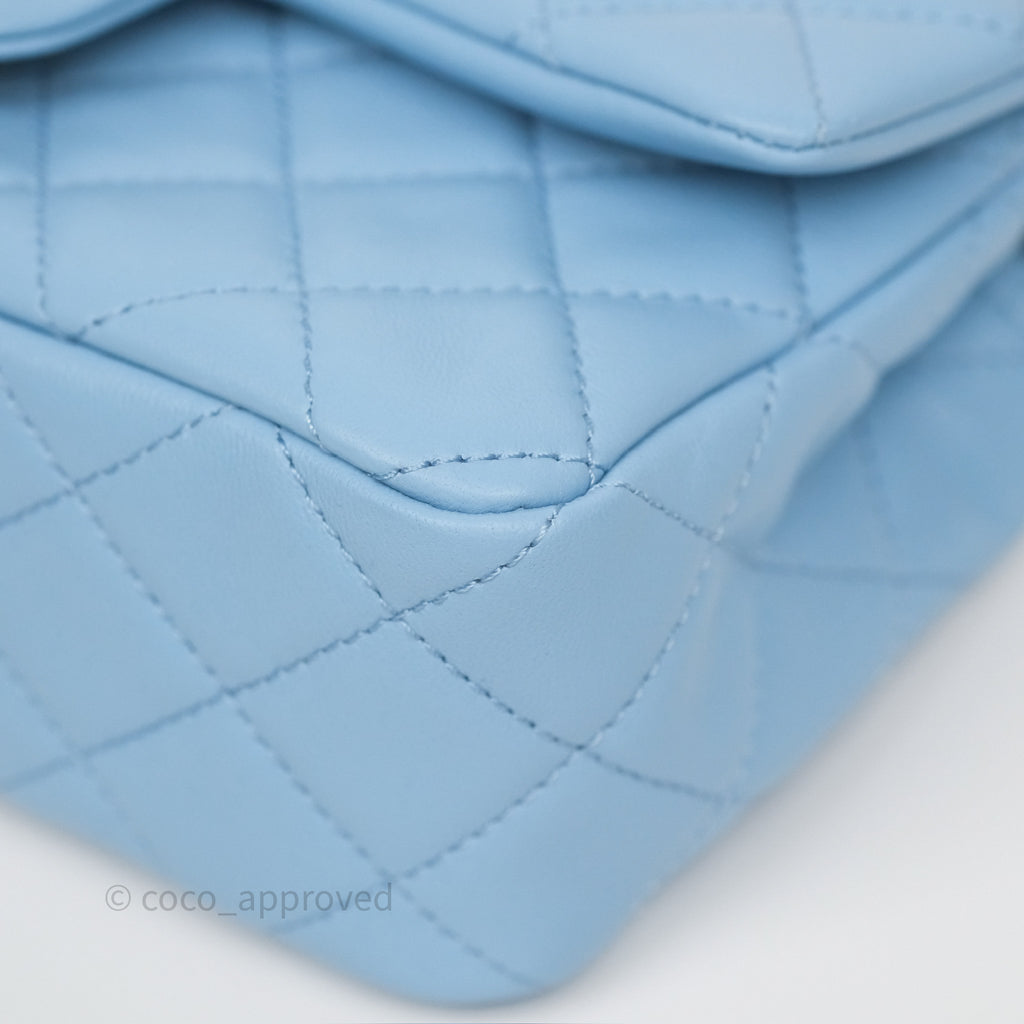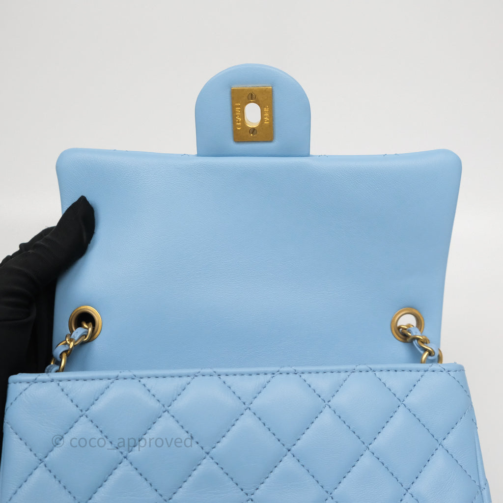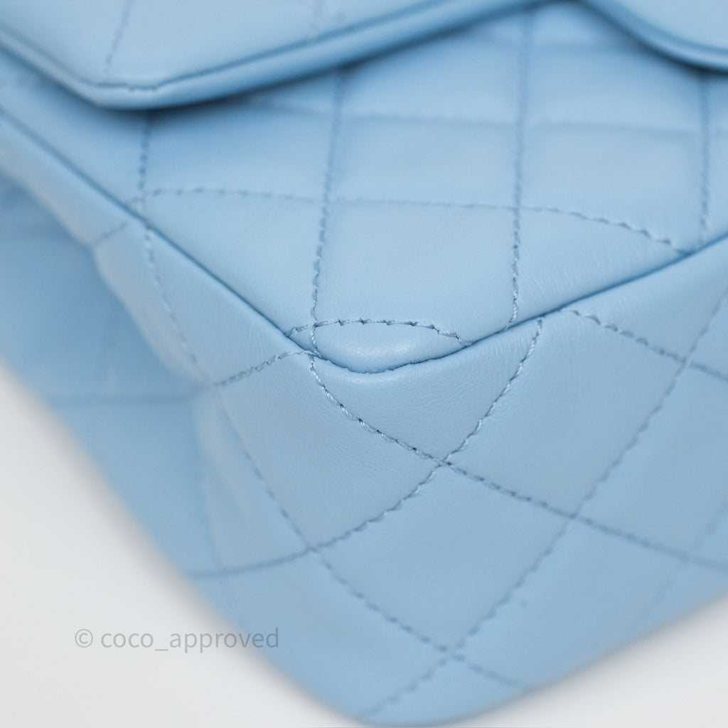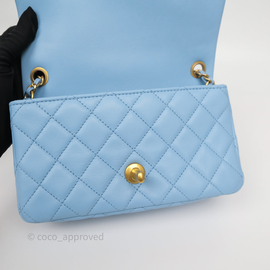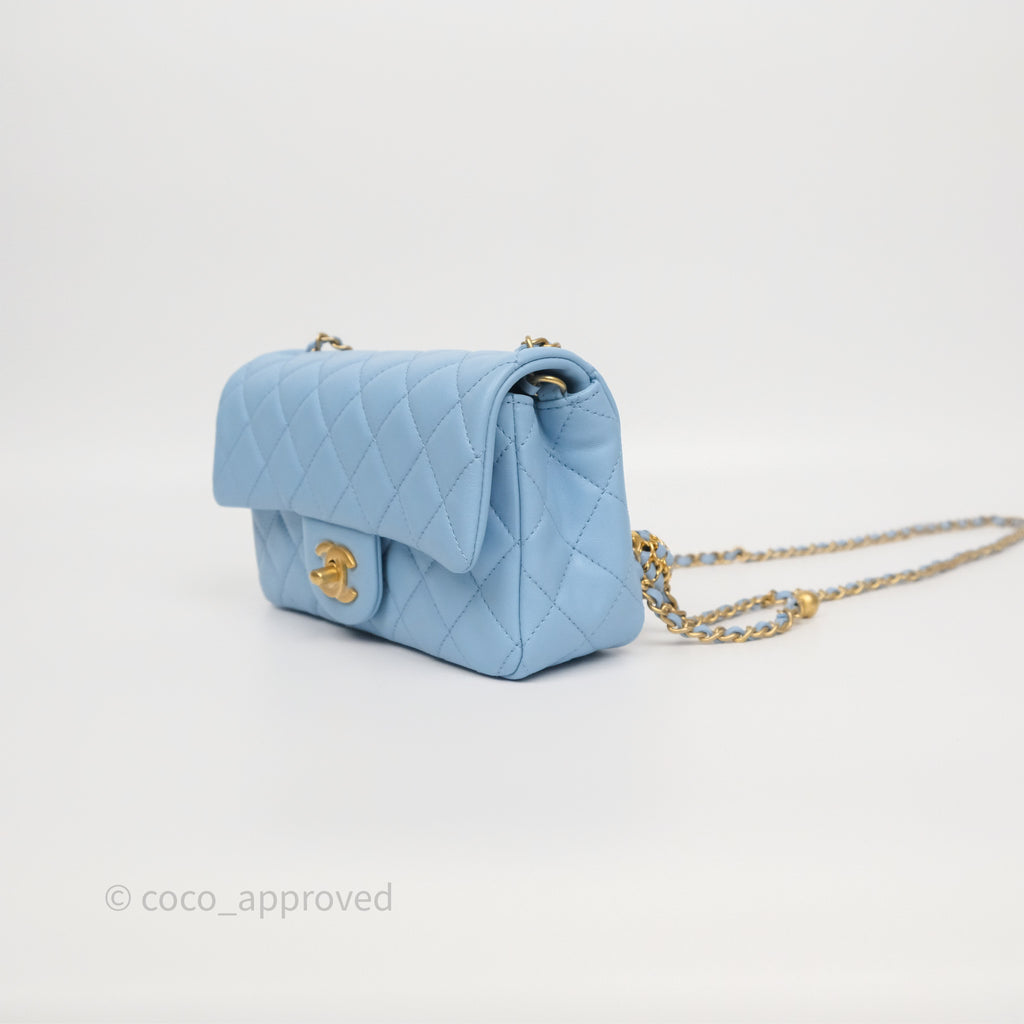 Chanel Mini Rectangular Pearl Crush Quilted Sky Blue Lambskin Aged Gold Hardware