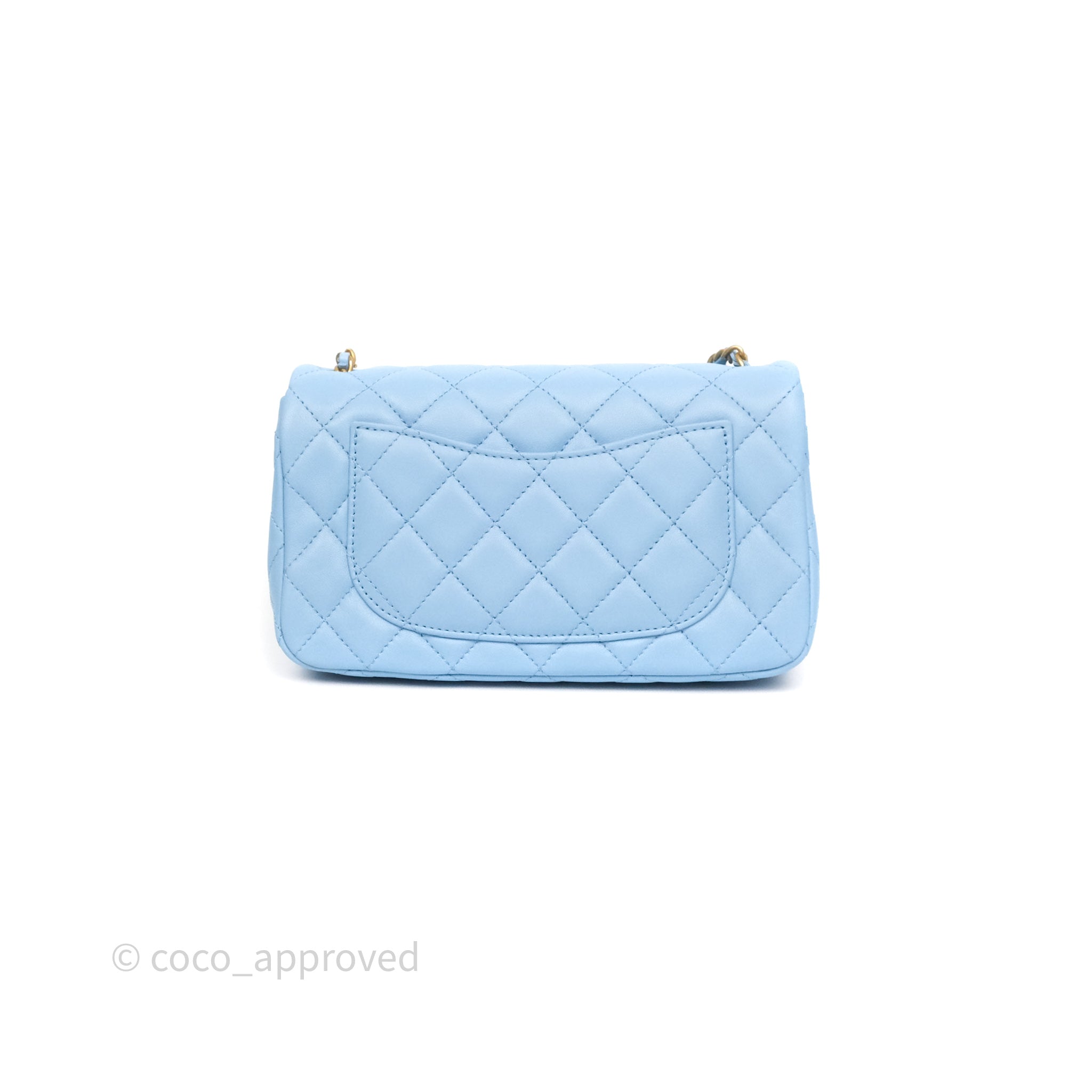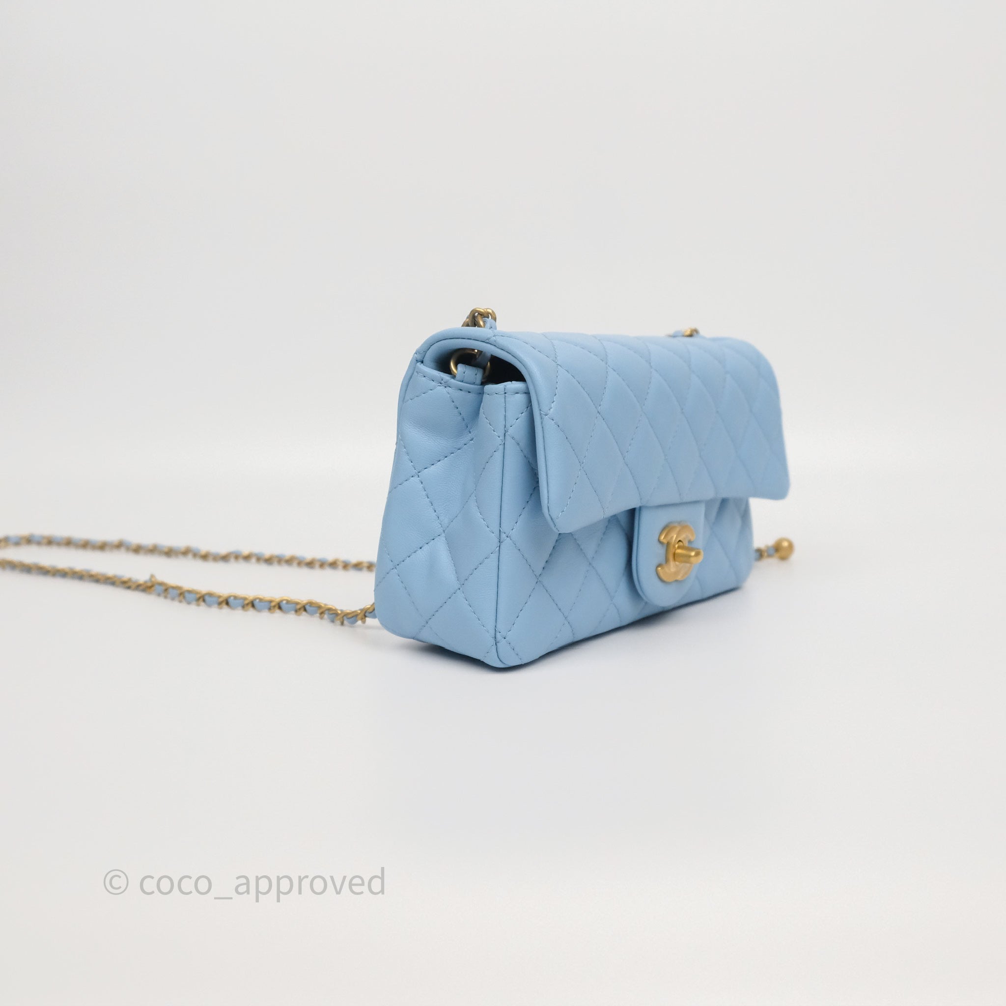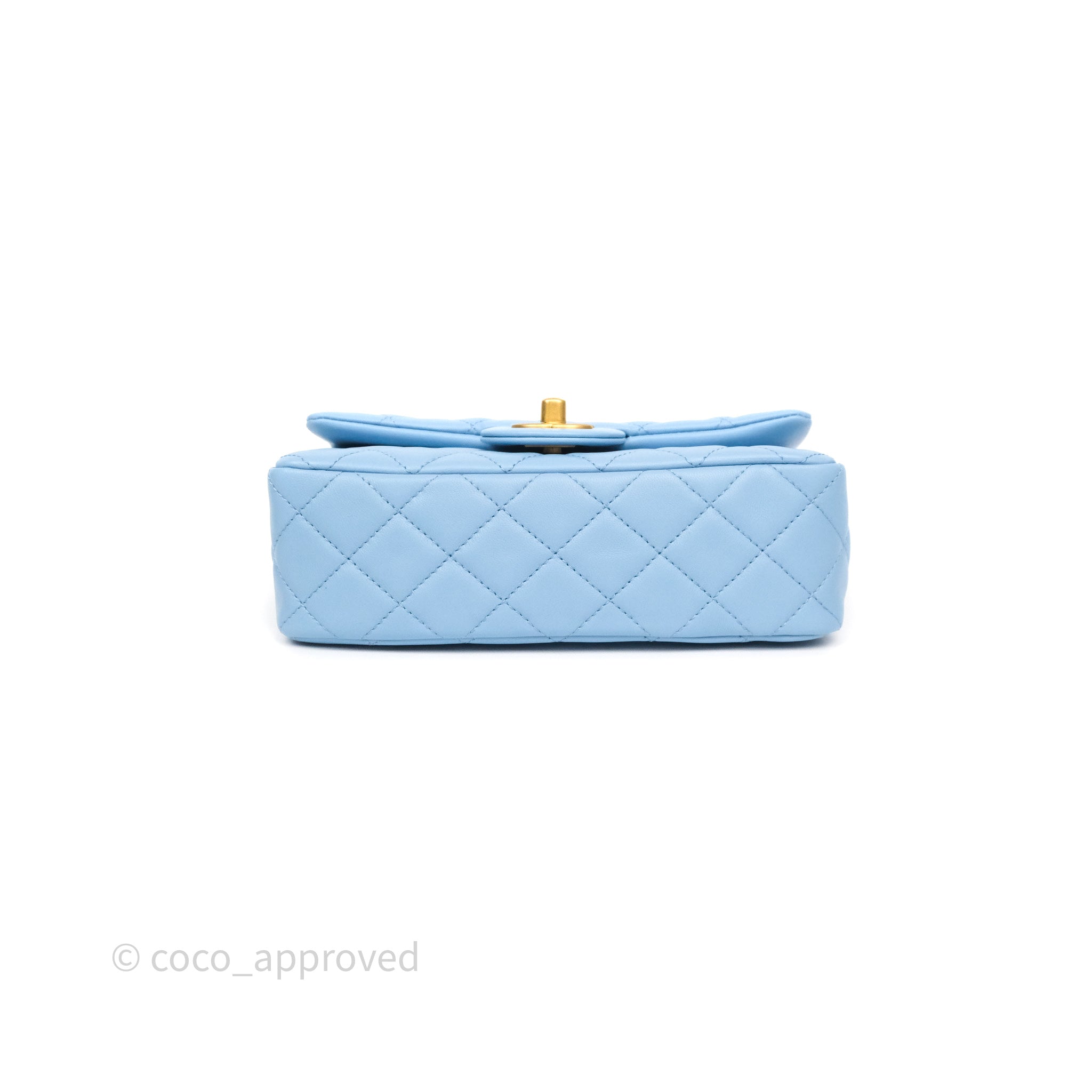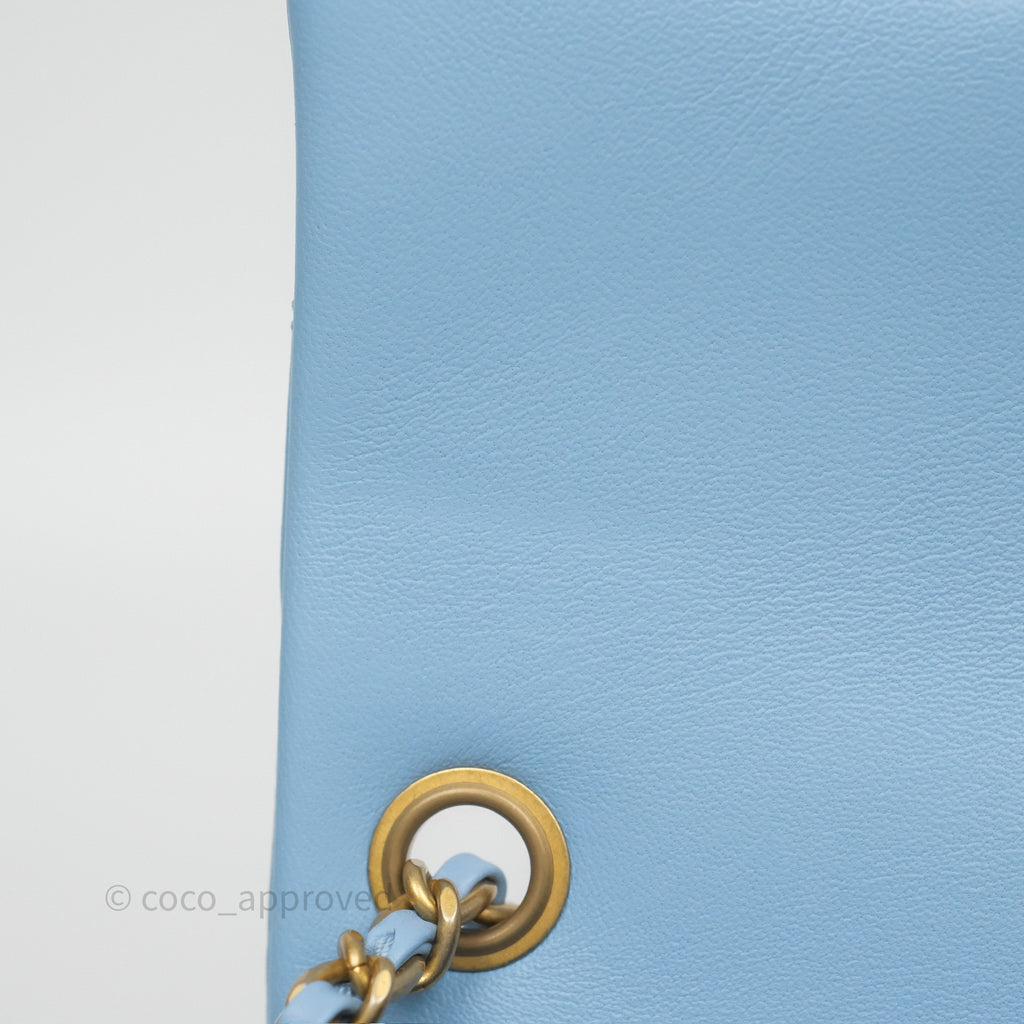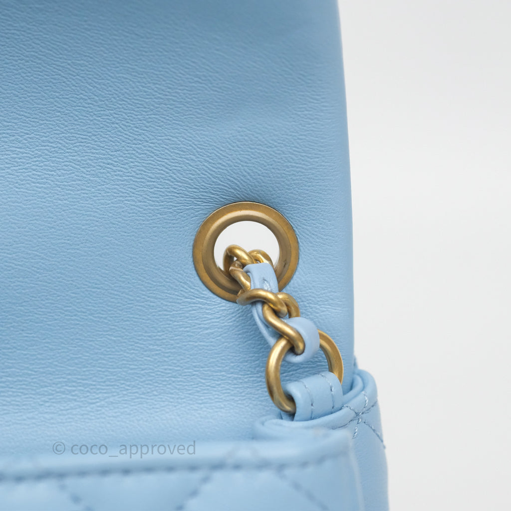 Chanel Mini Rectangular Pearl Crush Quilted Sky Blue Lambskin Aged Gold Hardware