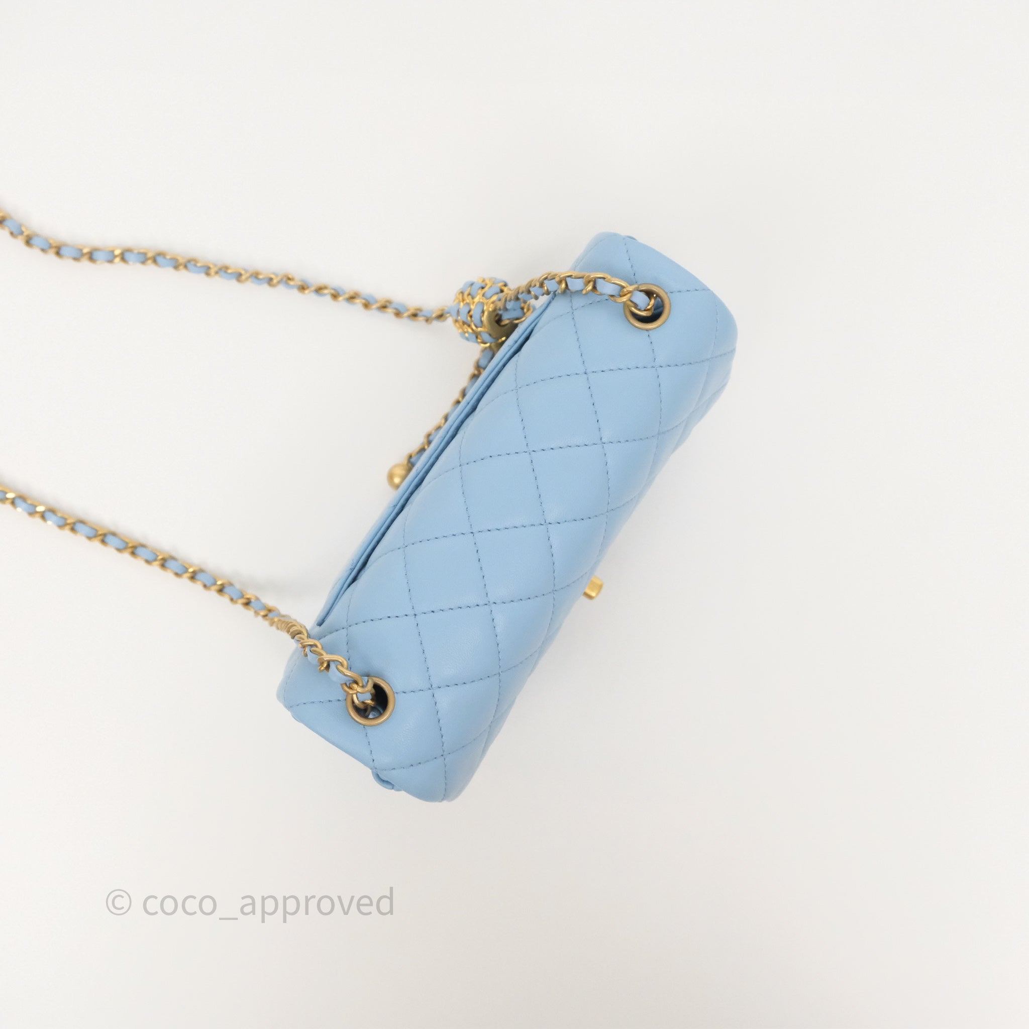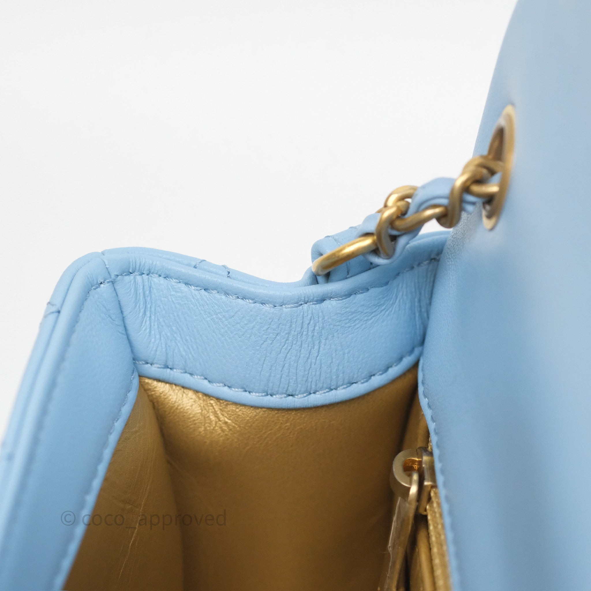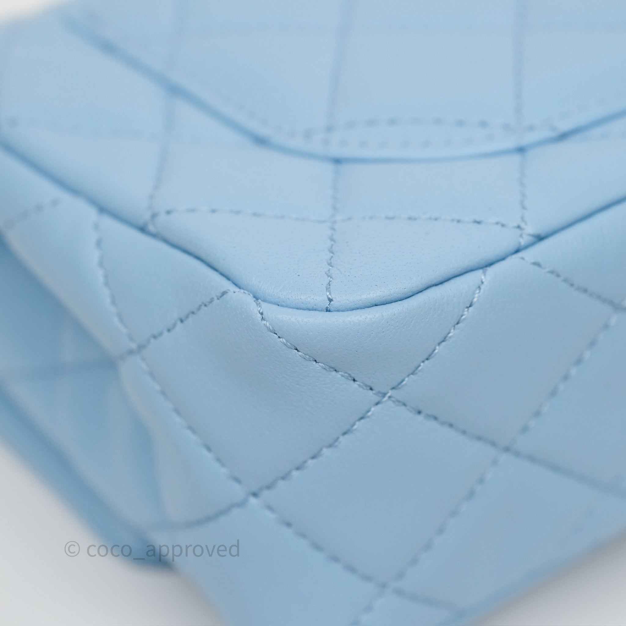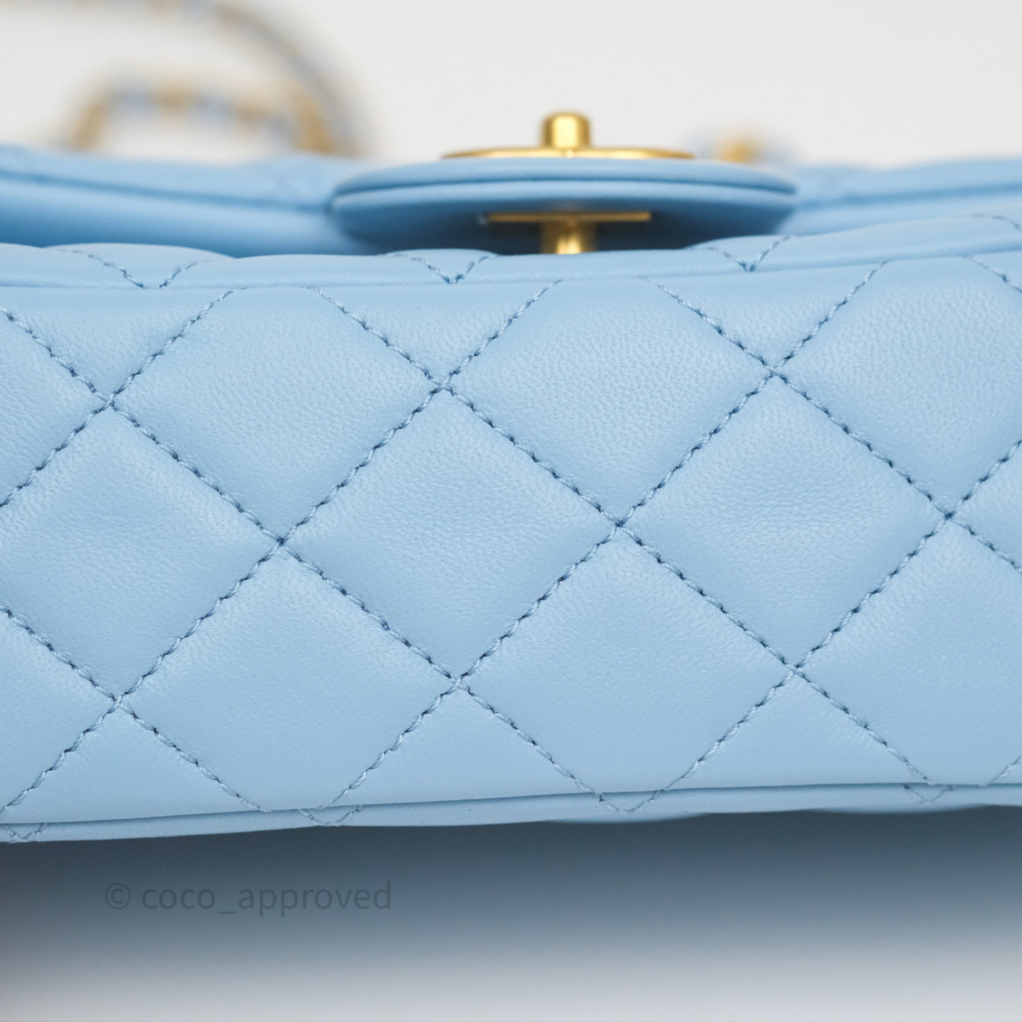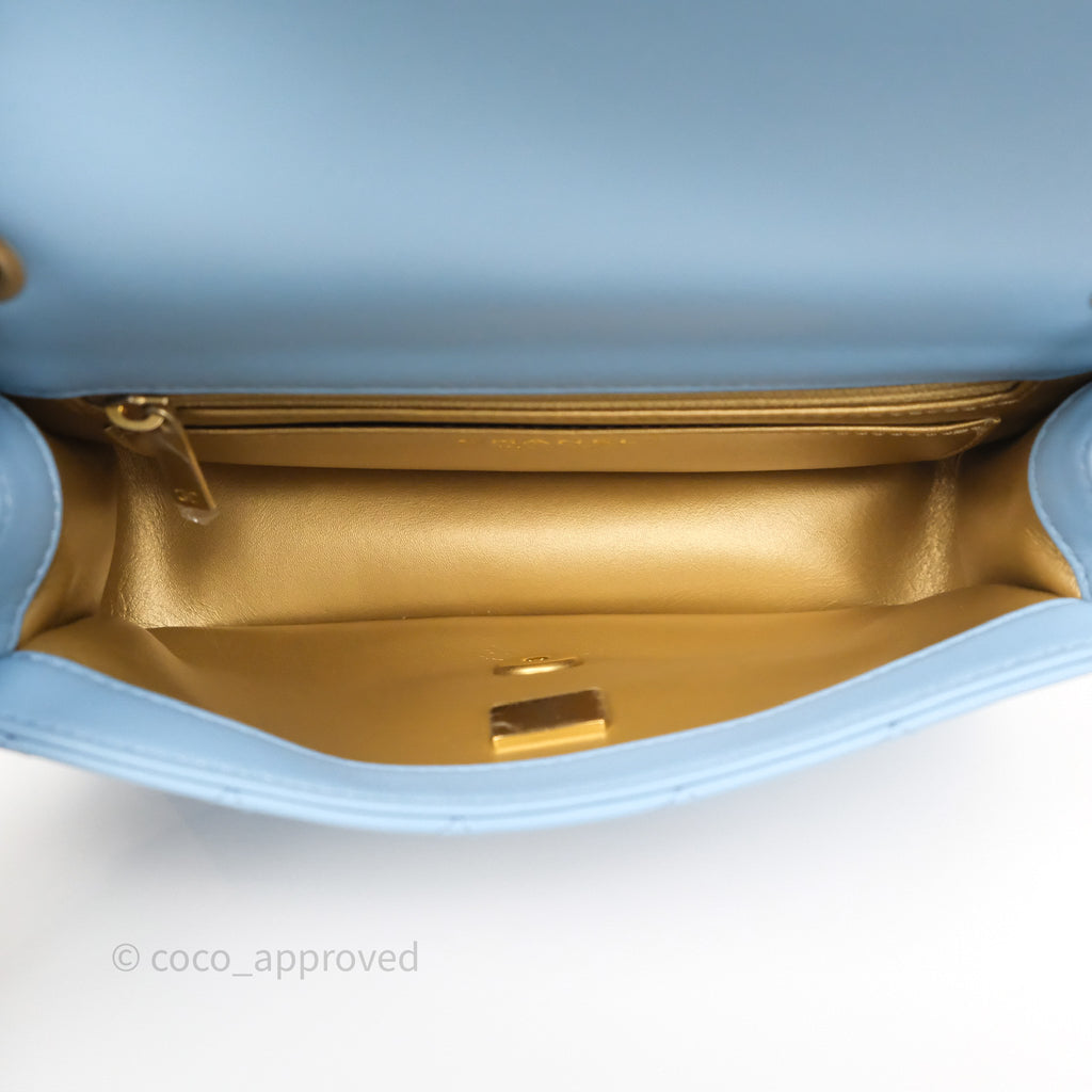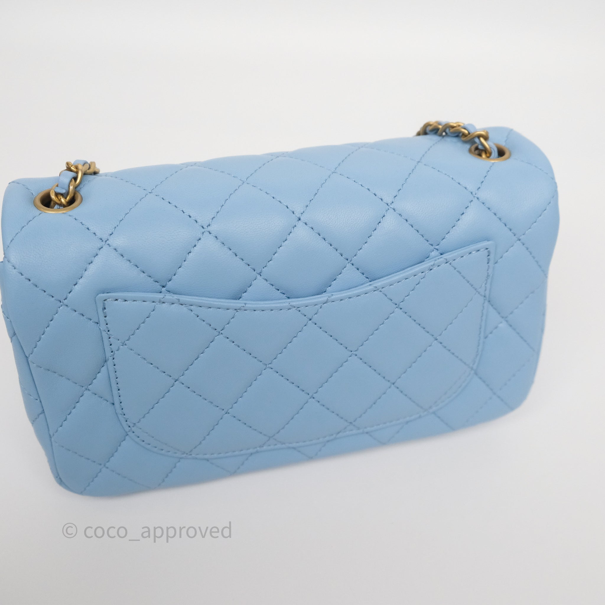 Chanel Mini Rectangular Pearl Crush Quilted Sky Blue Lambskin Aged Gold Hardware