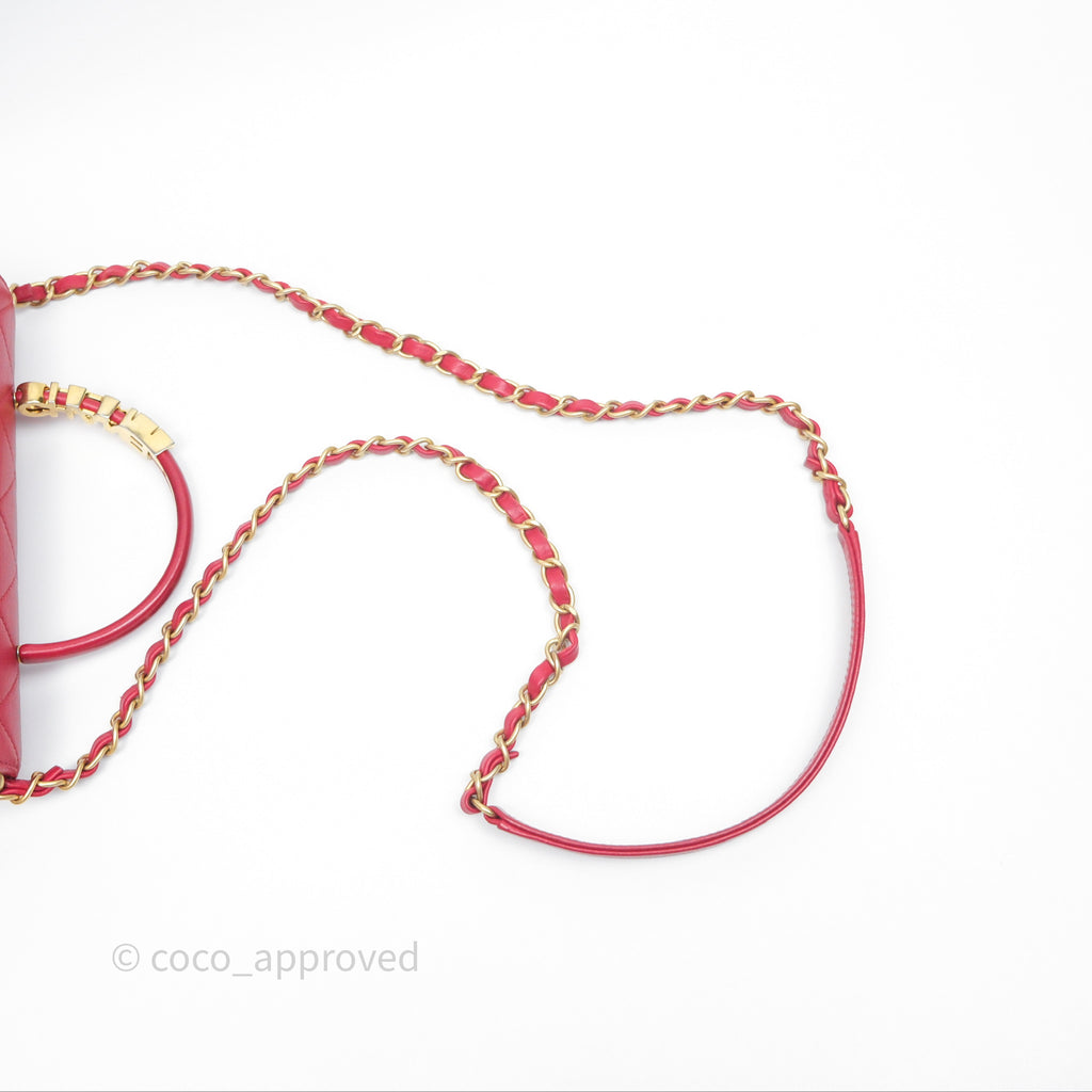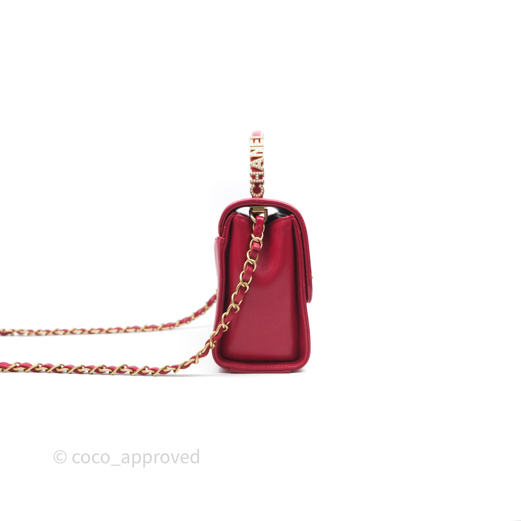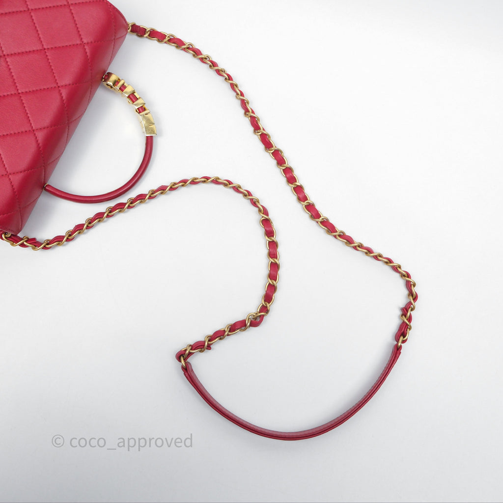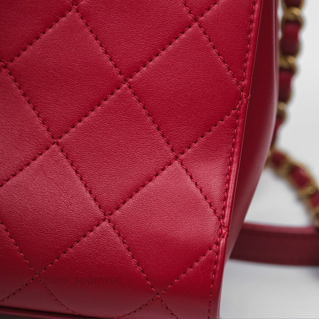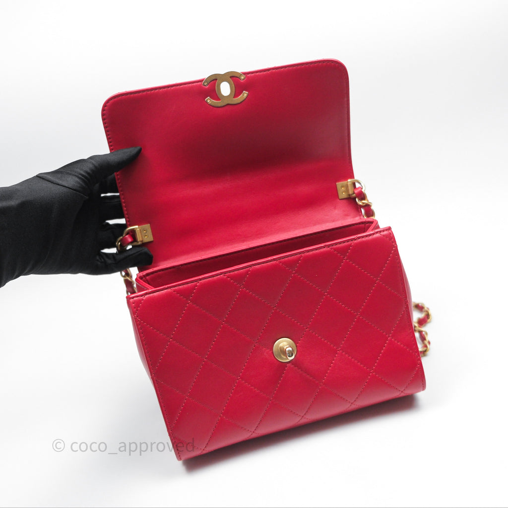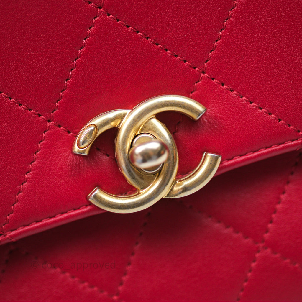 Chanel Quilted Flap Bag with Pearl Logo Top Handle Red Lambskin Aged Gold Hardware