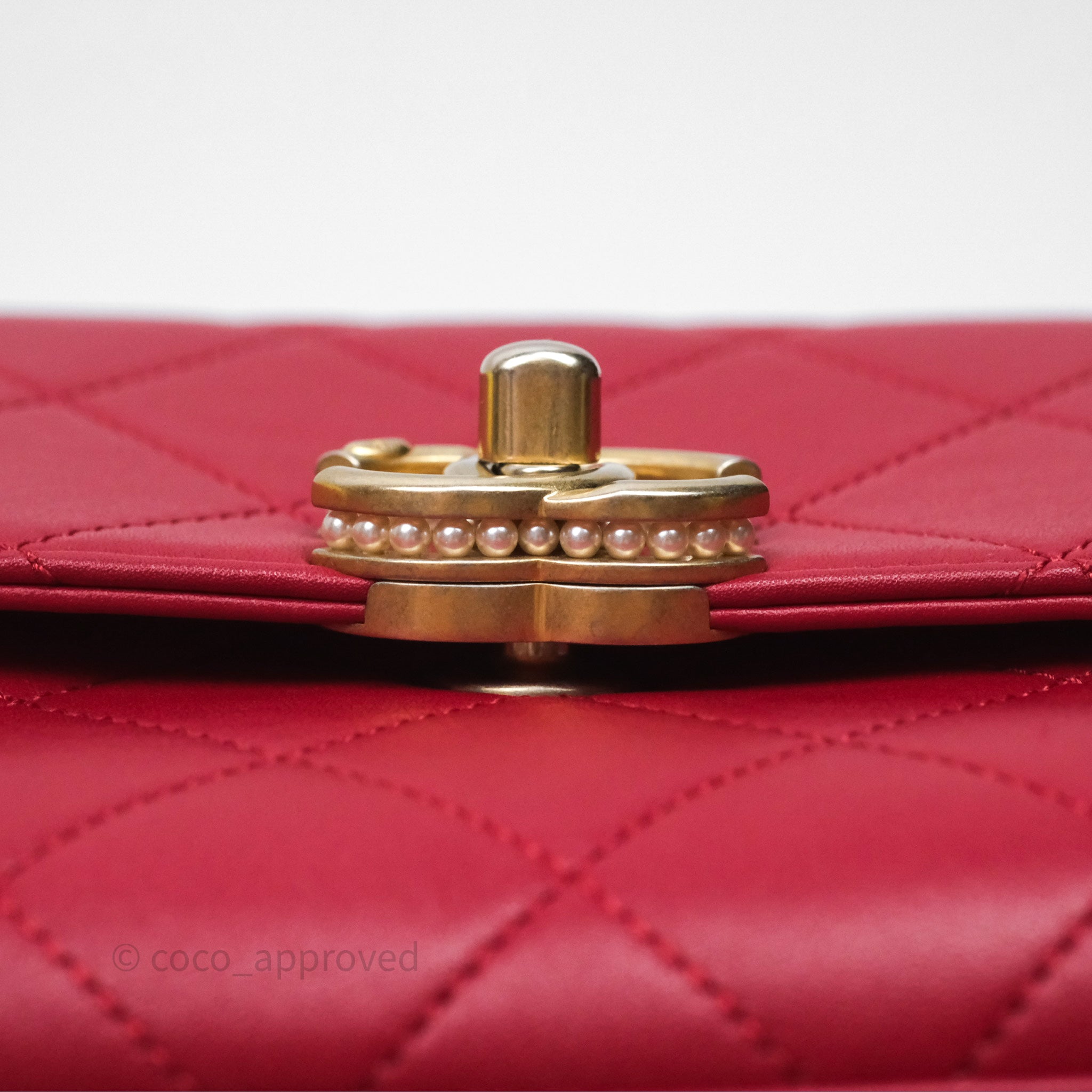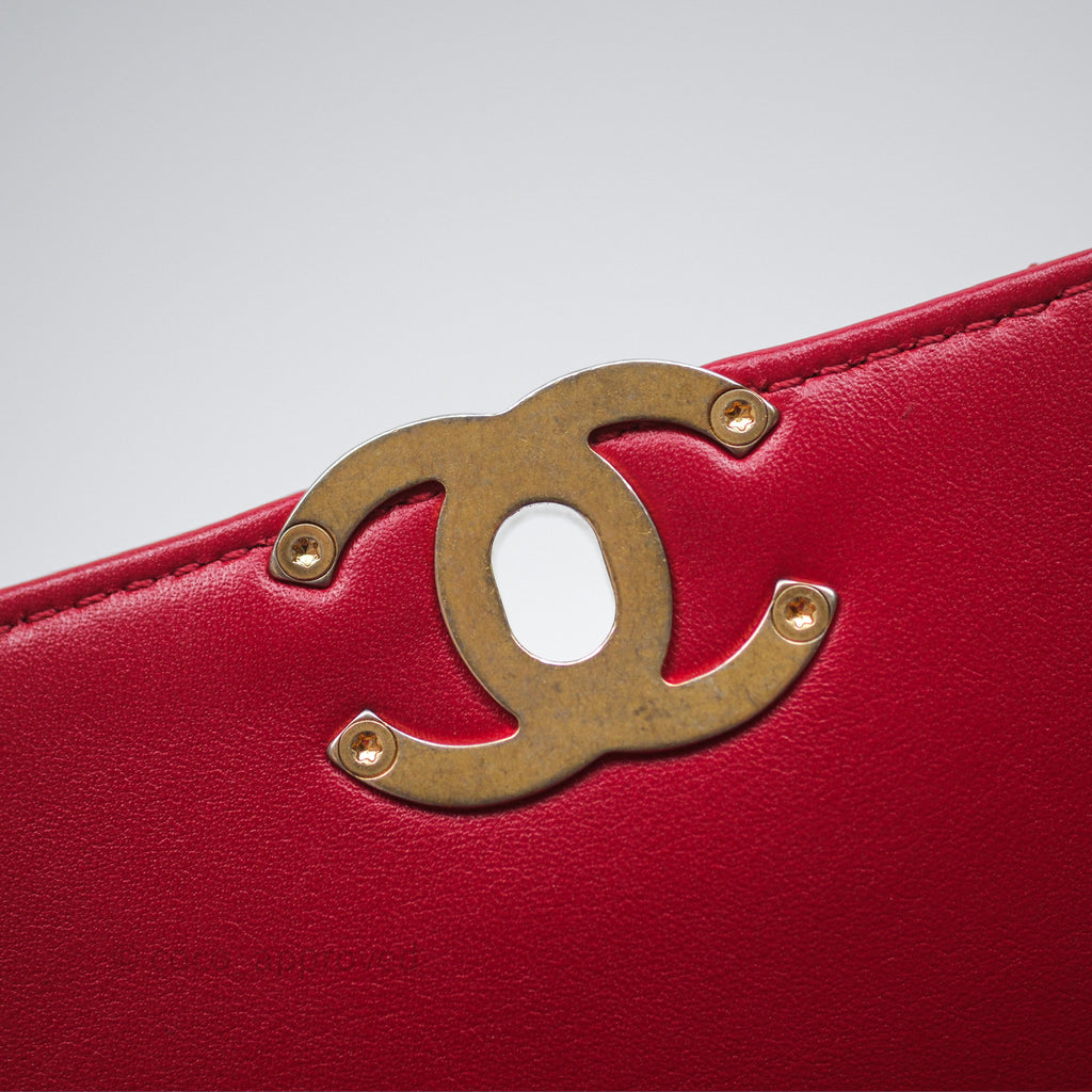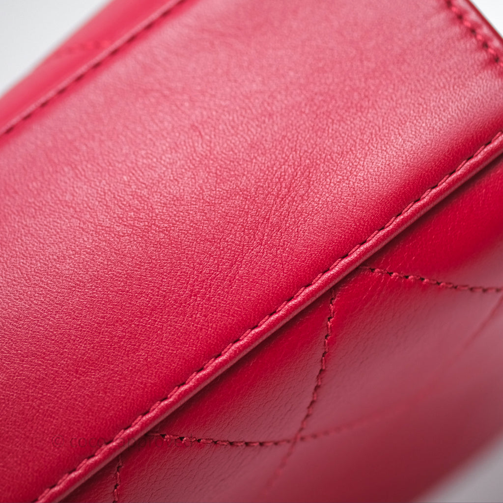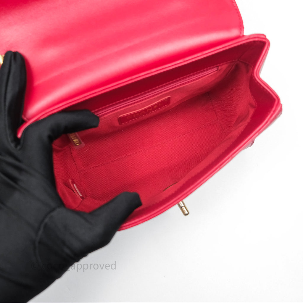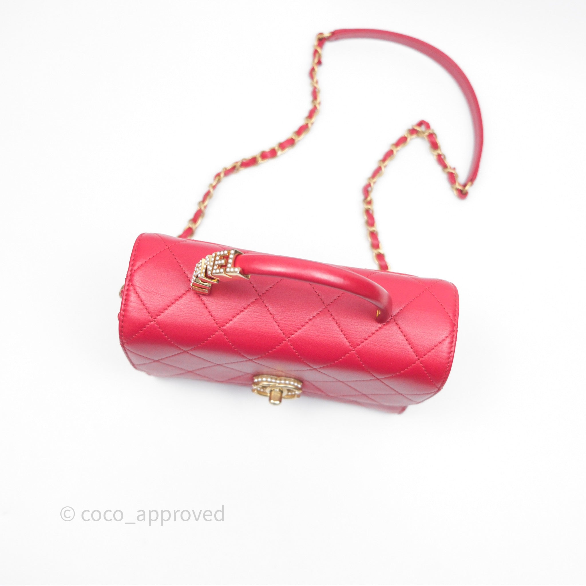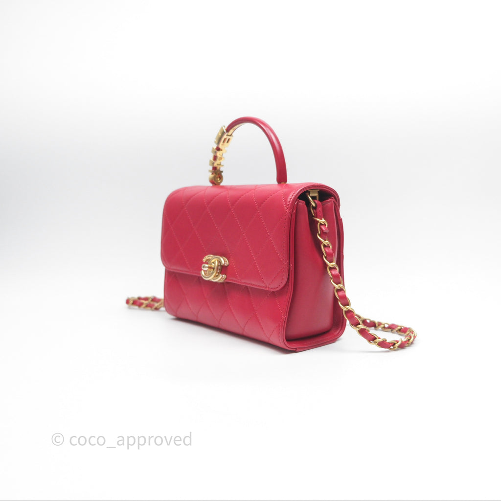 Chanel Quilted Flap Bag with Pearl Logo Top Handle Red Lambskin Aged Gold Hardware