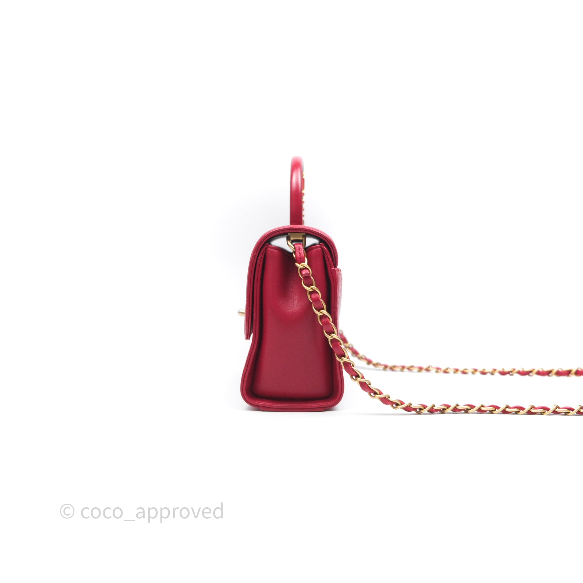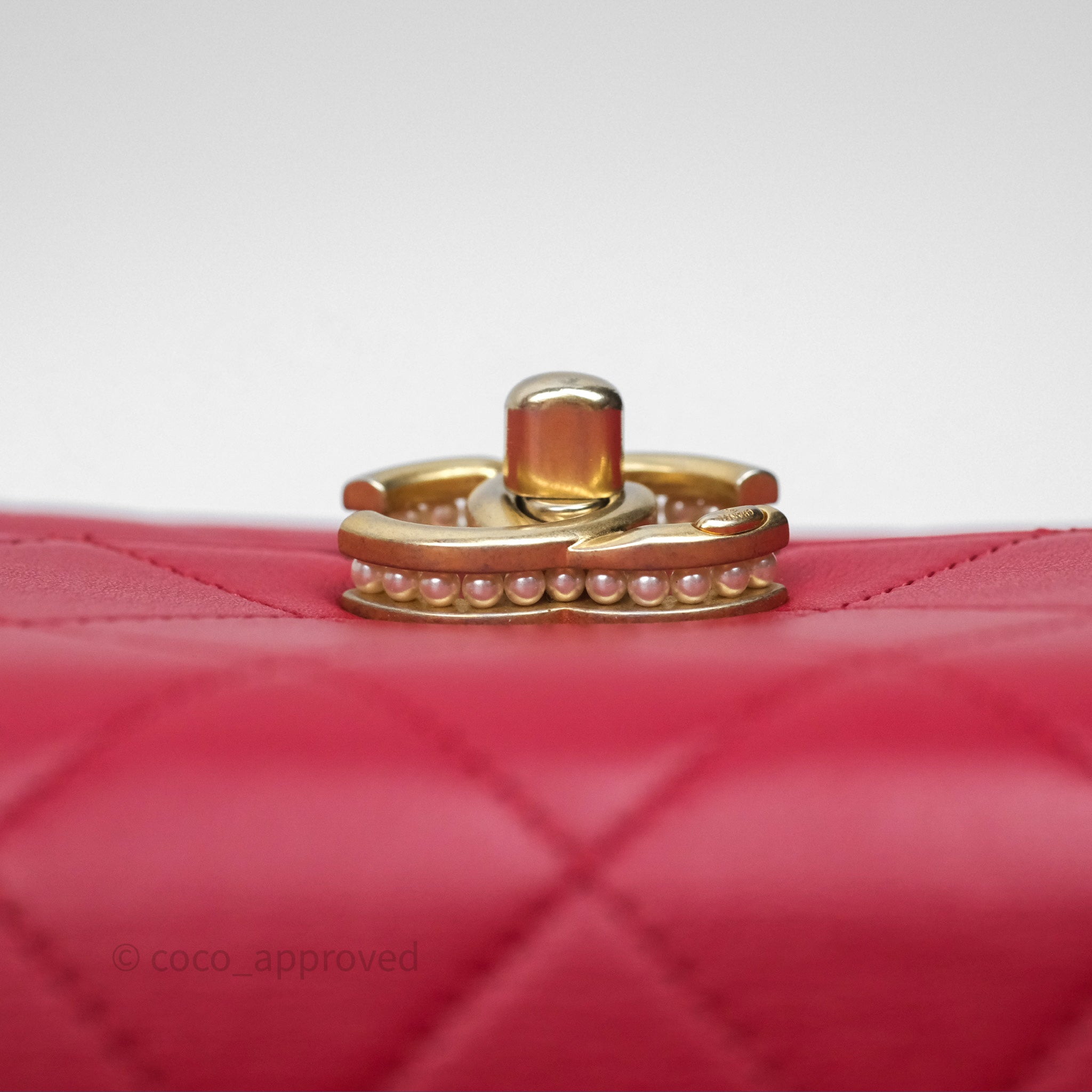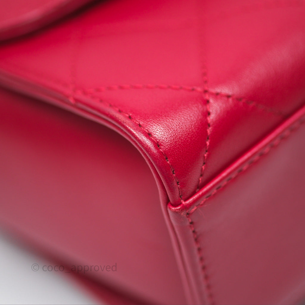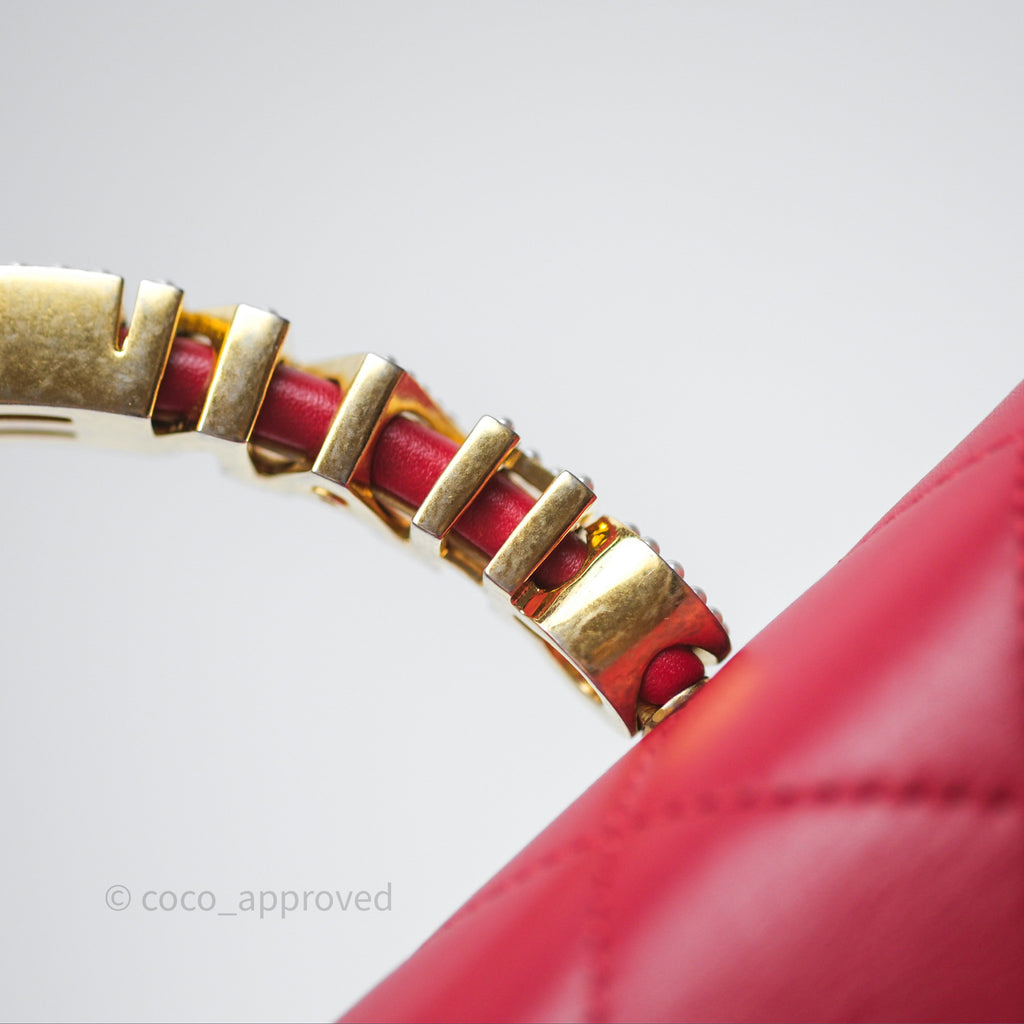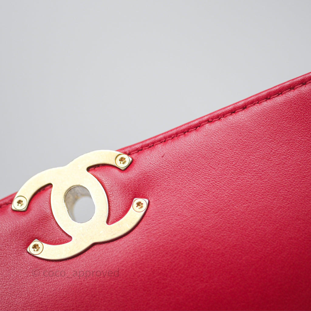 Chanel Quilted Flap Bag with Pearl Logo Top Handle Red Lambskin Aged Gold Hardware