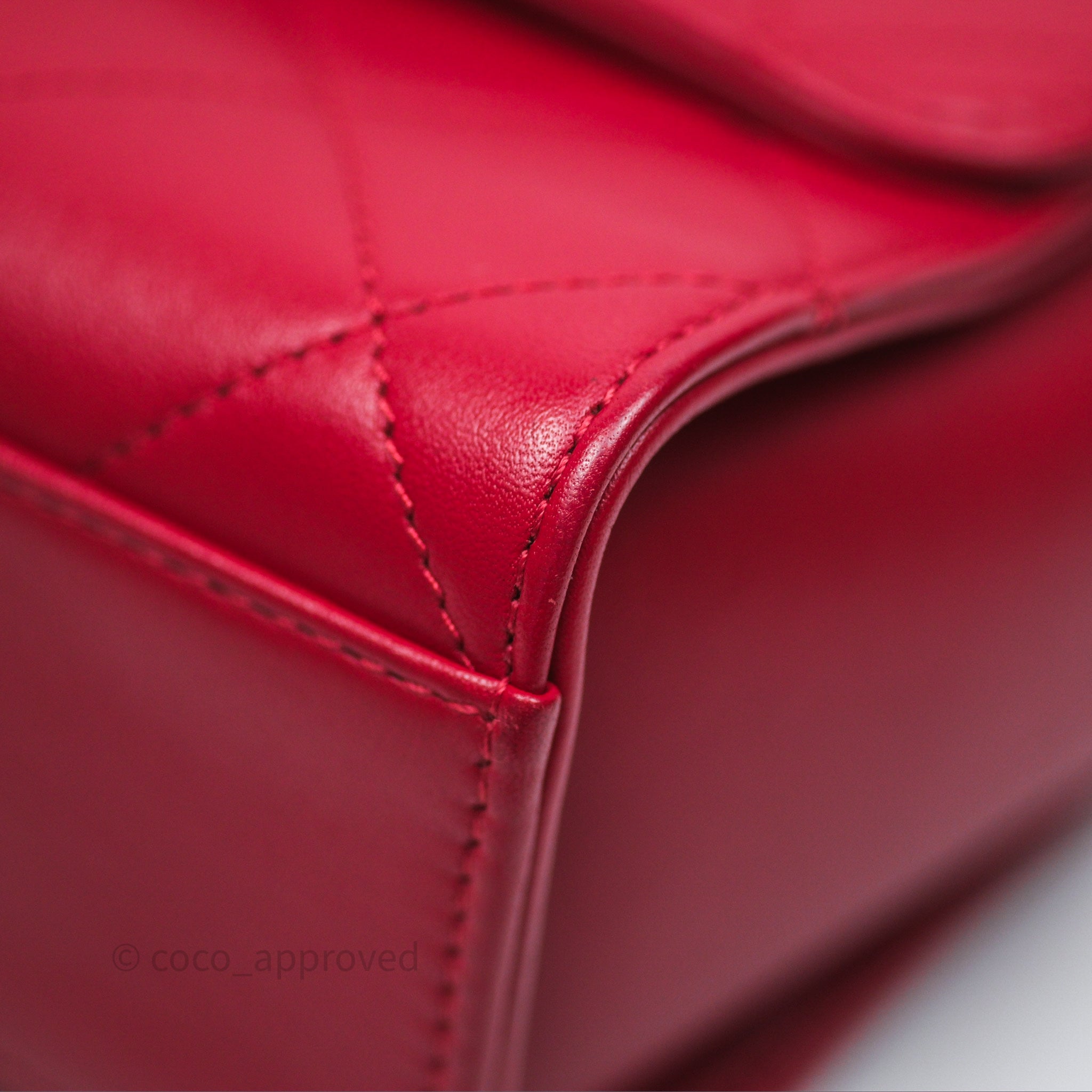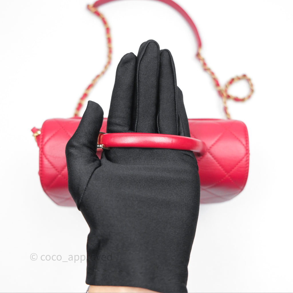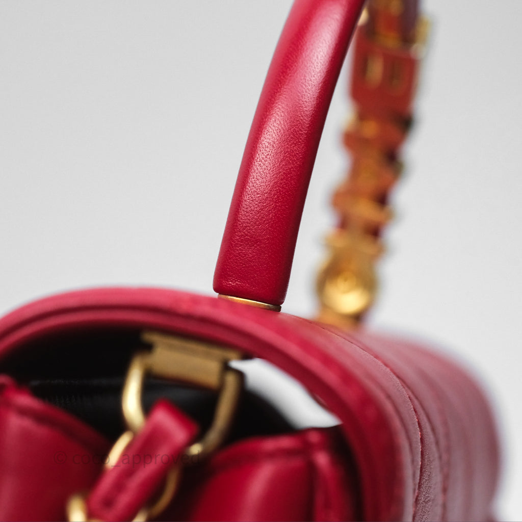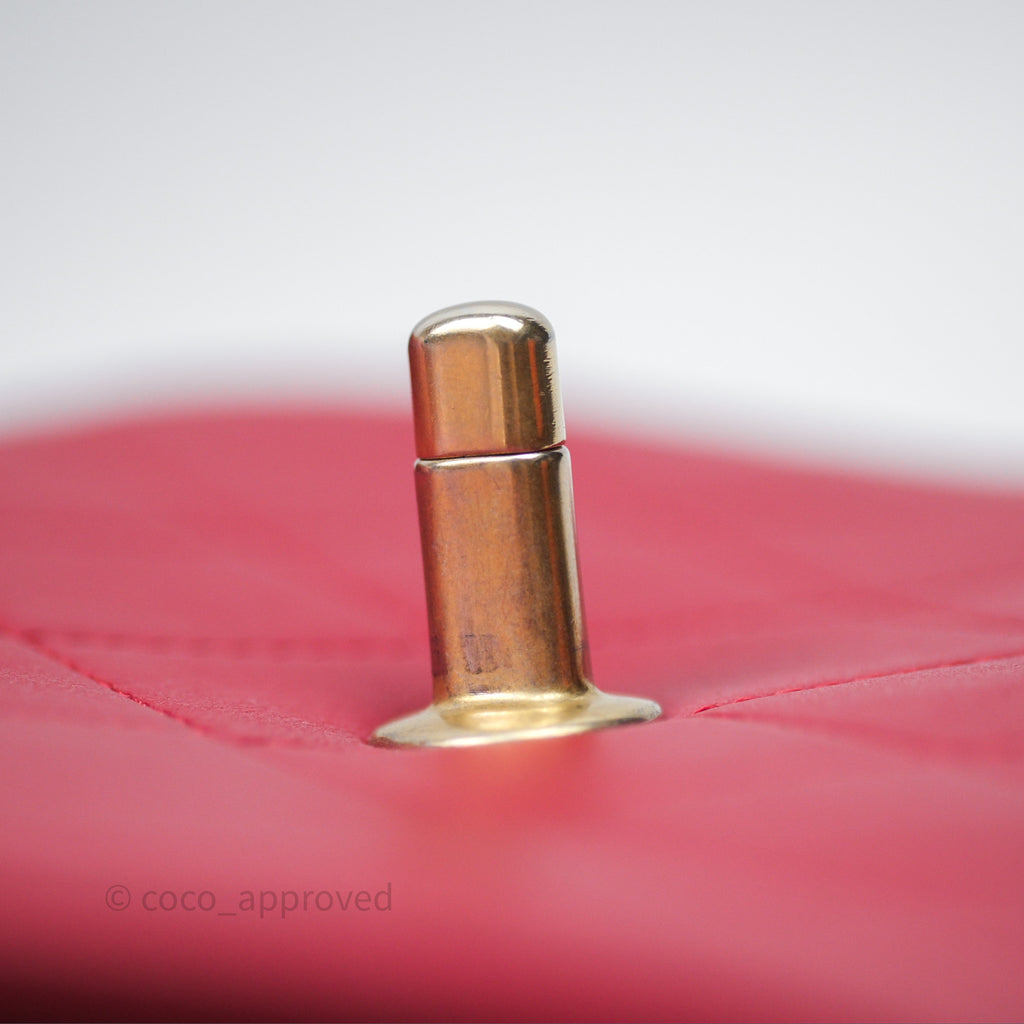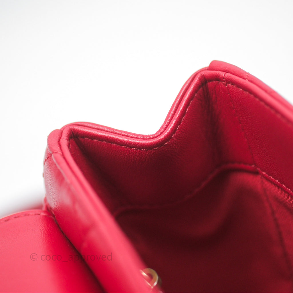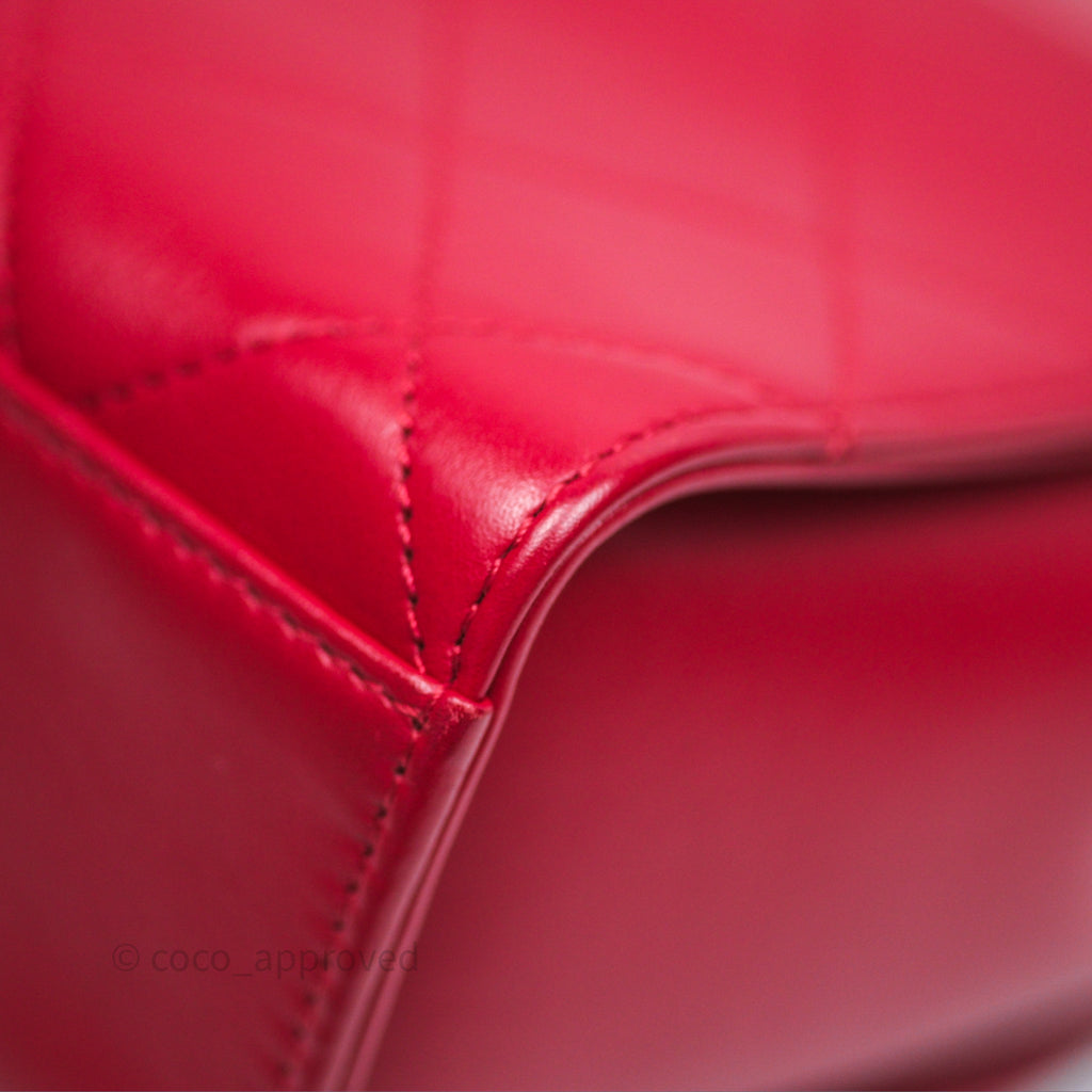 Chanel Quilted Flap Bag with Pearl Logo Top Handle Red Lambskin Aged Gold Hardware