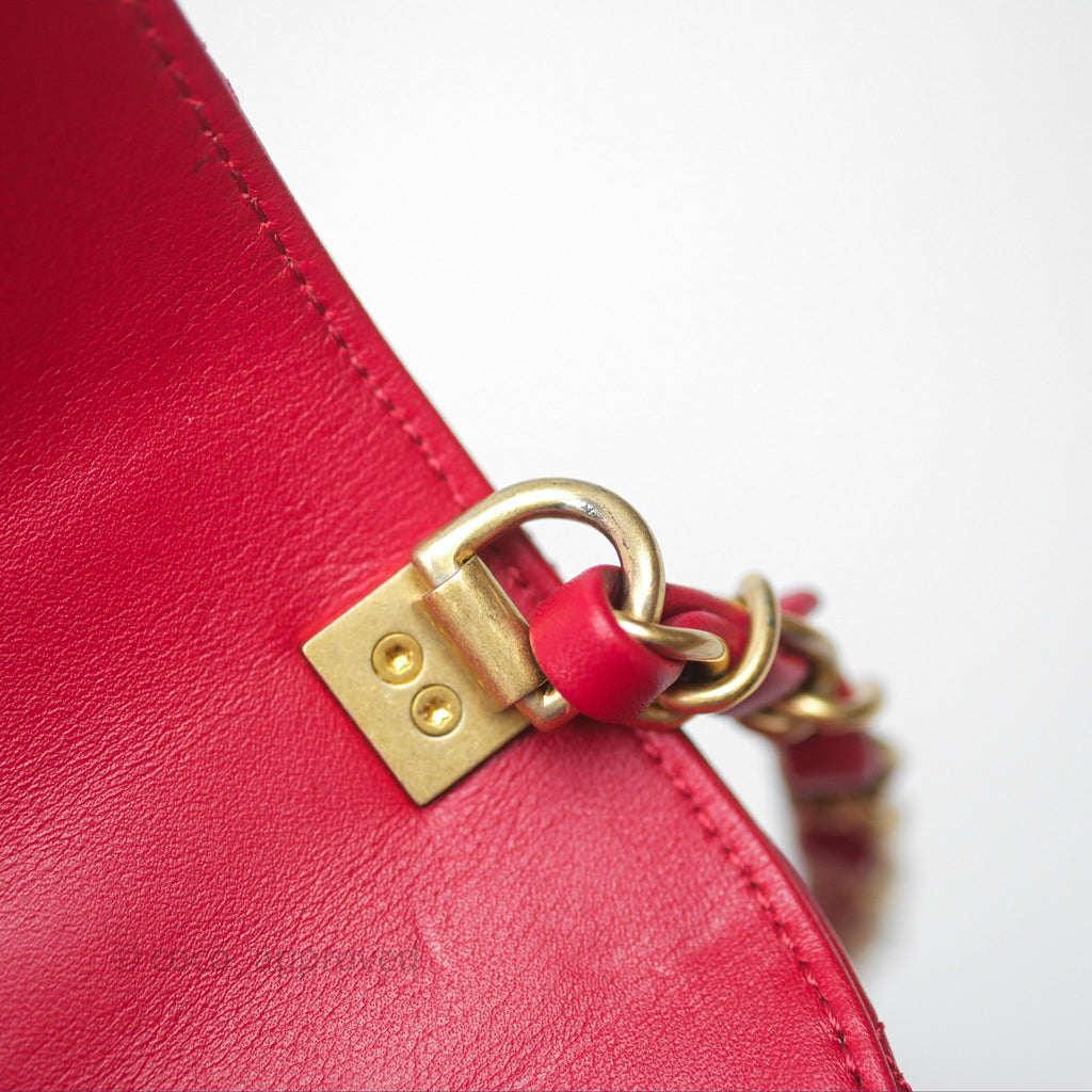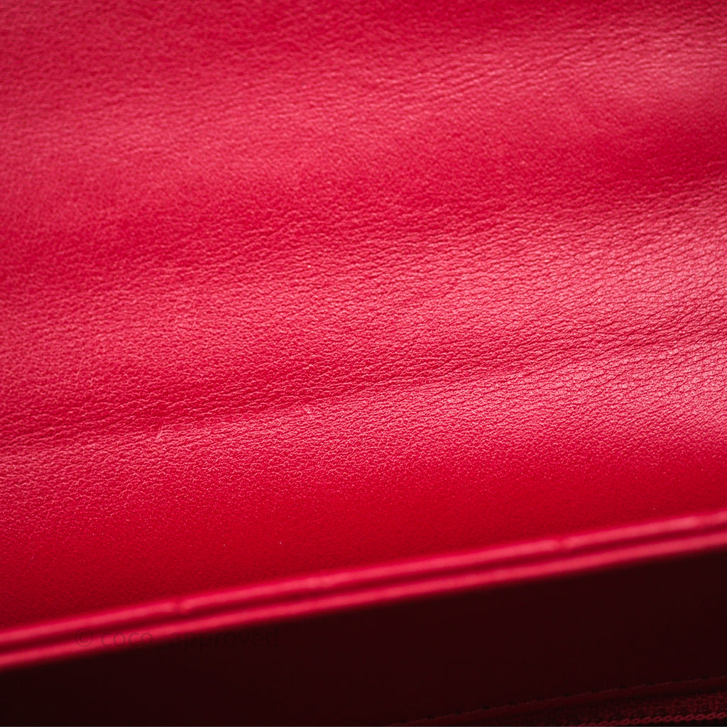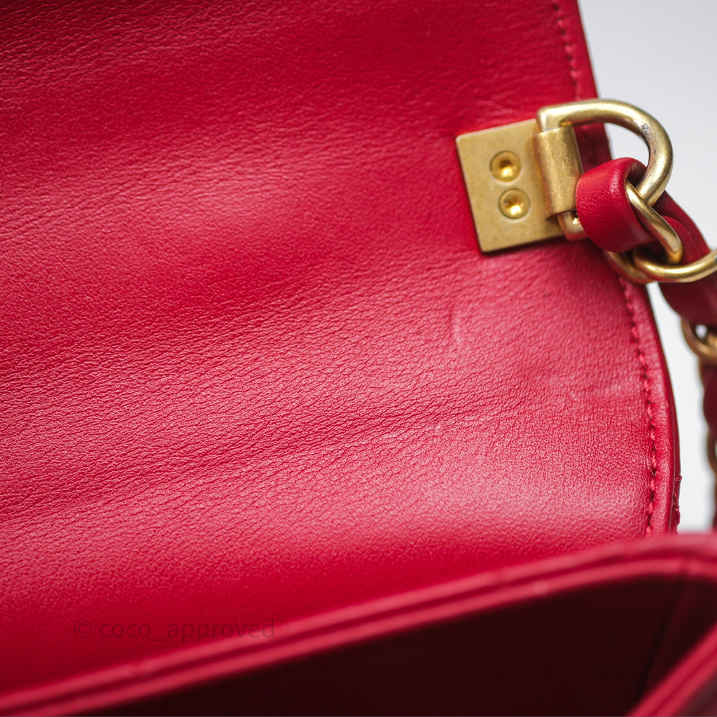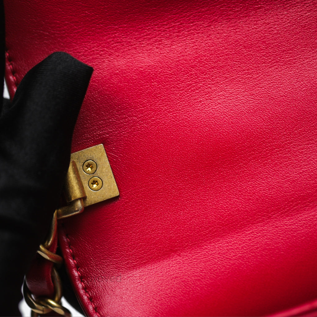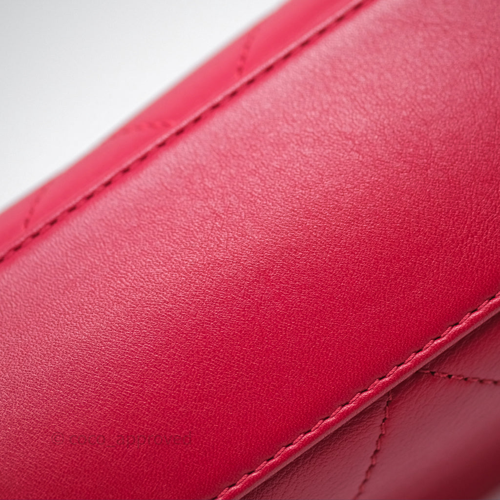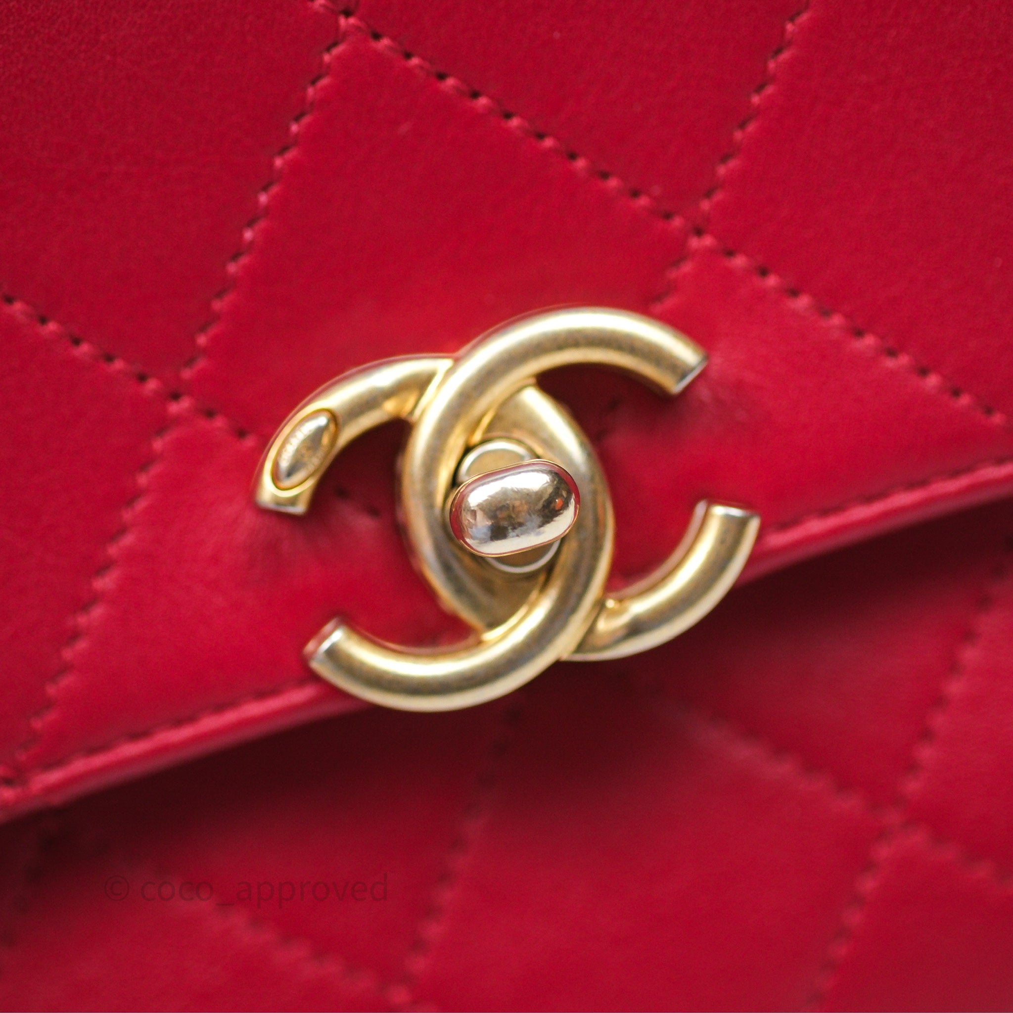 Chanel Quilted Flap Bag with Pearl Logo Top Handle Red Lambskin Aged Gold Hardware