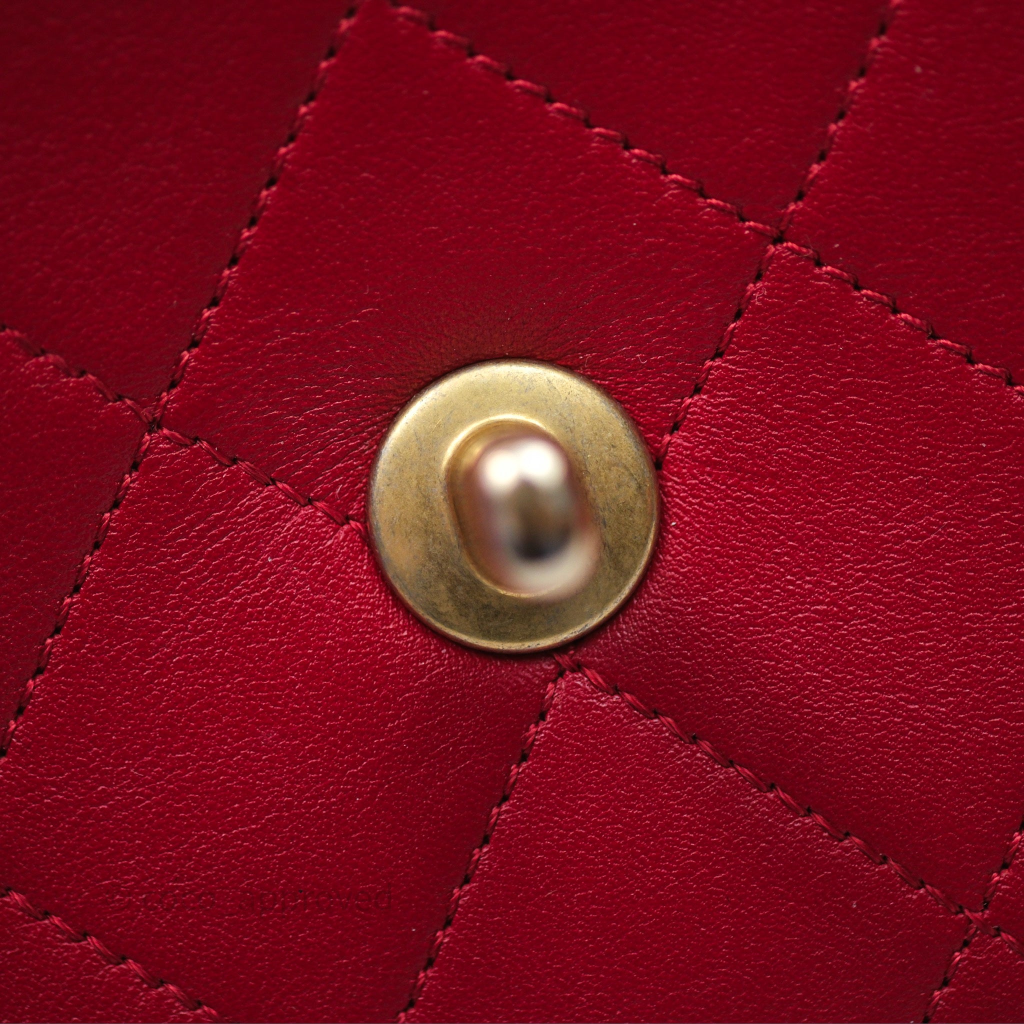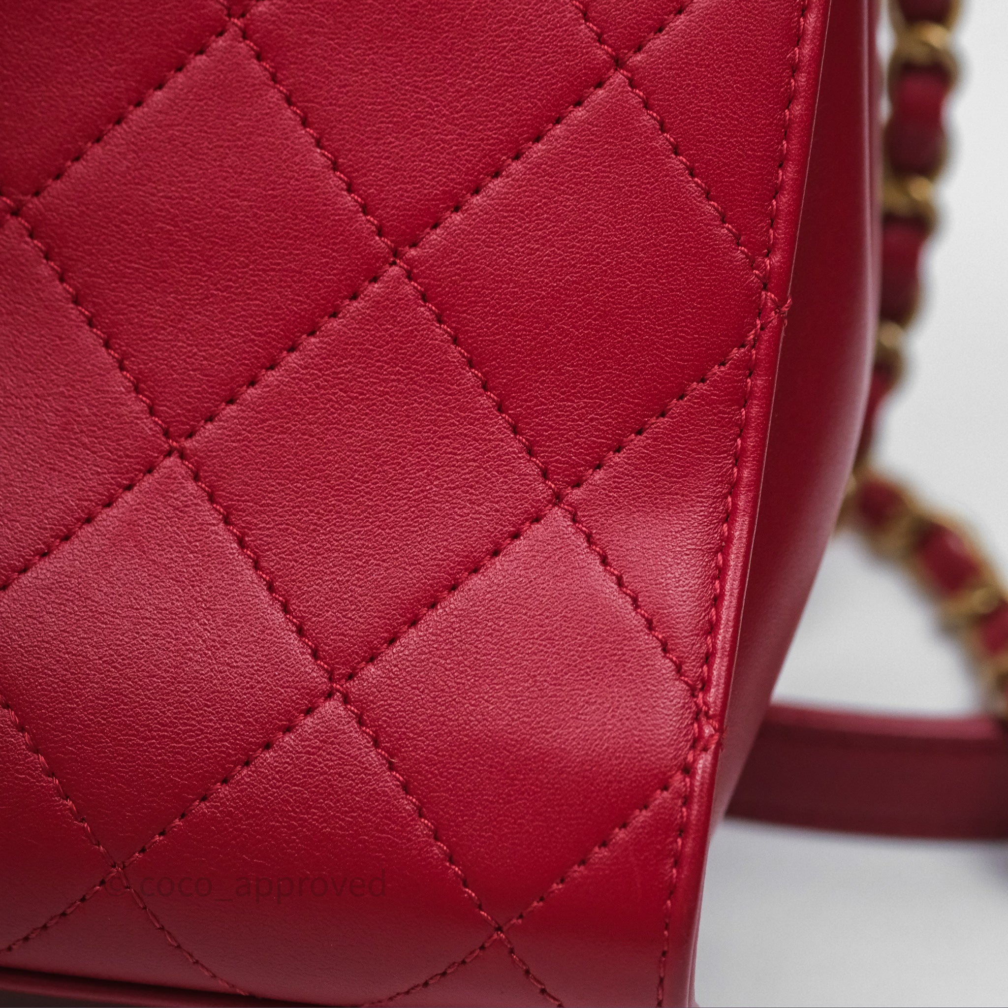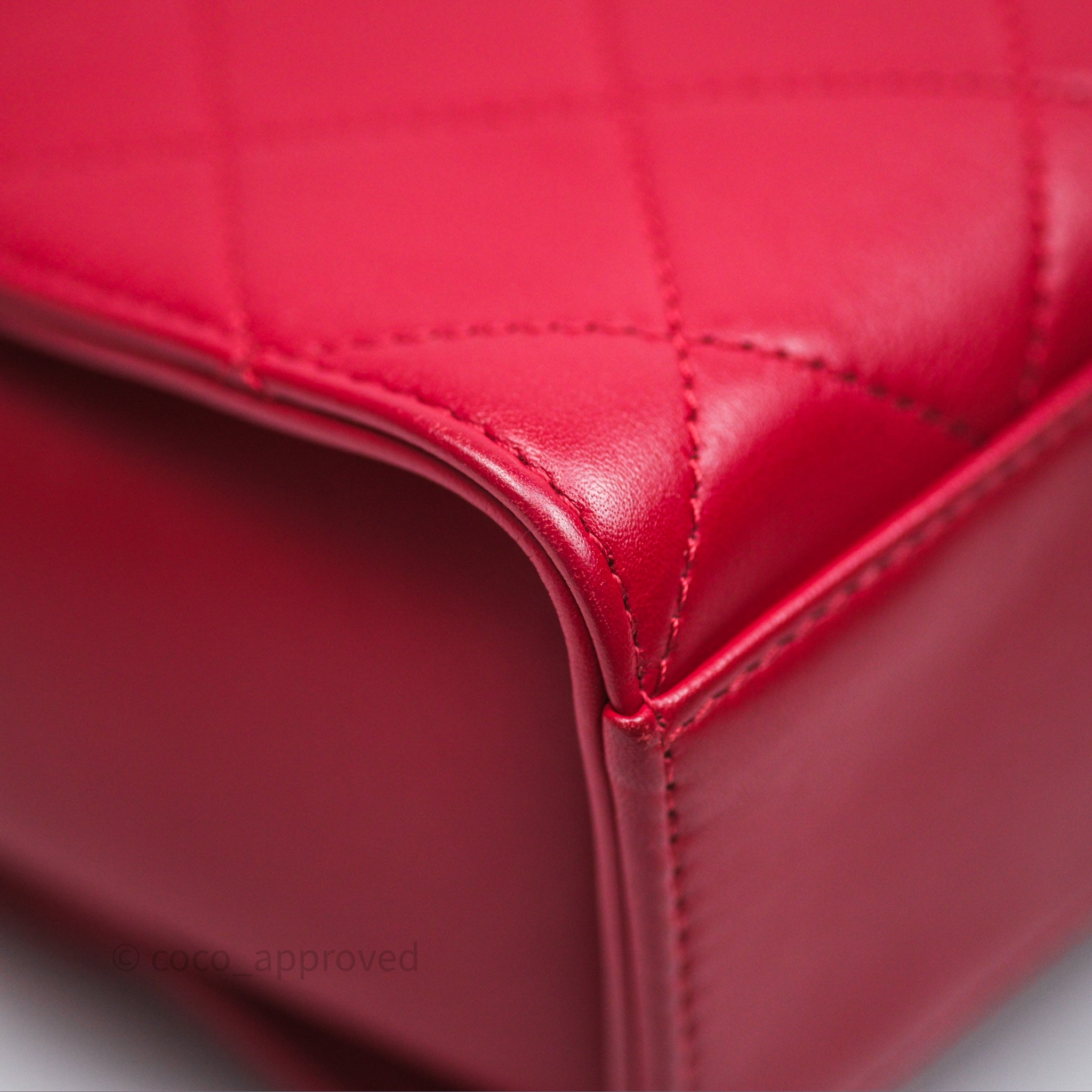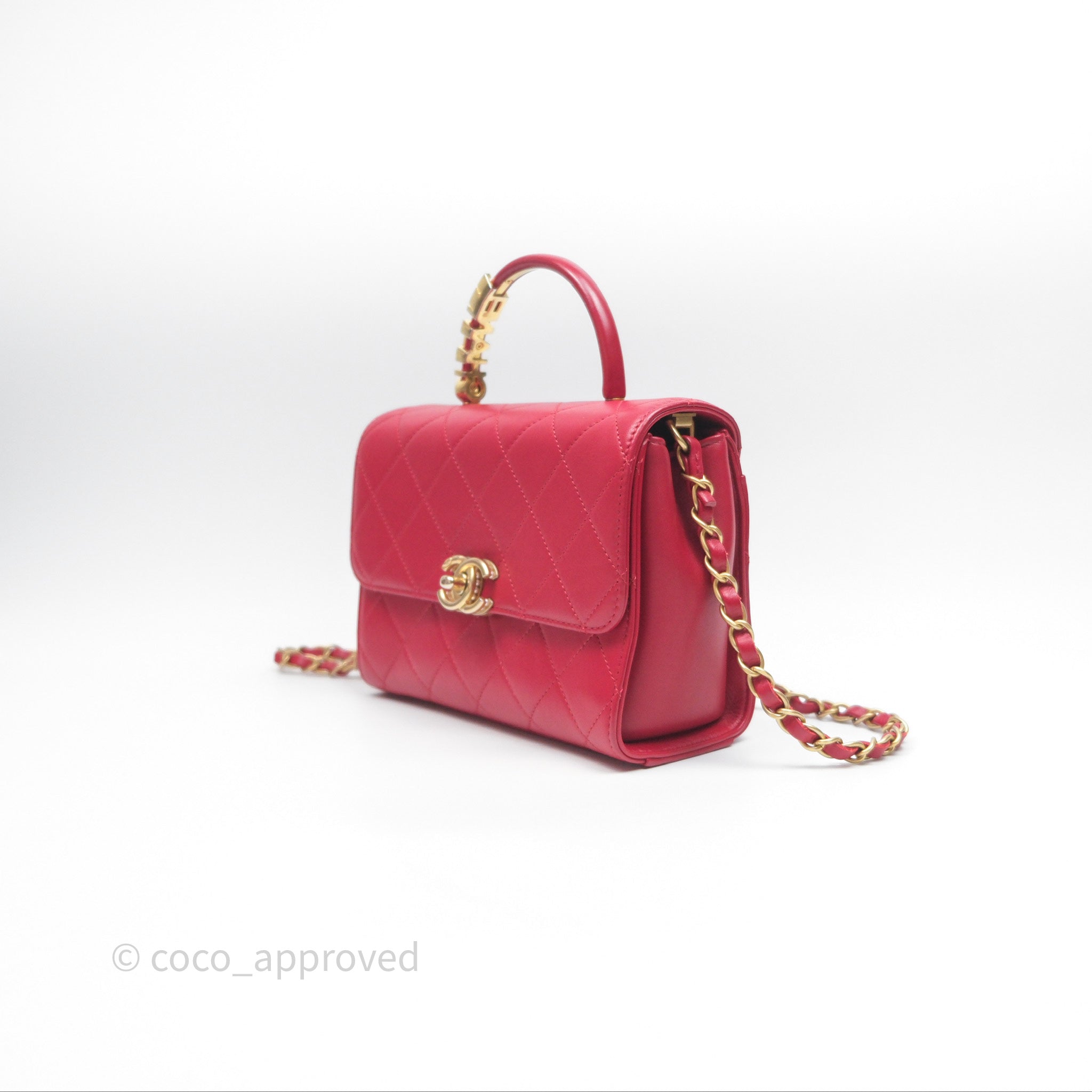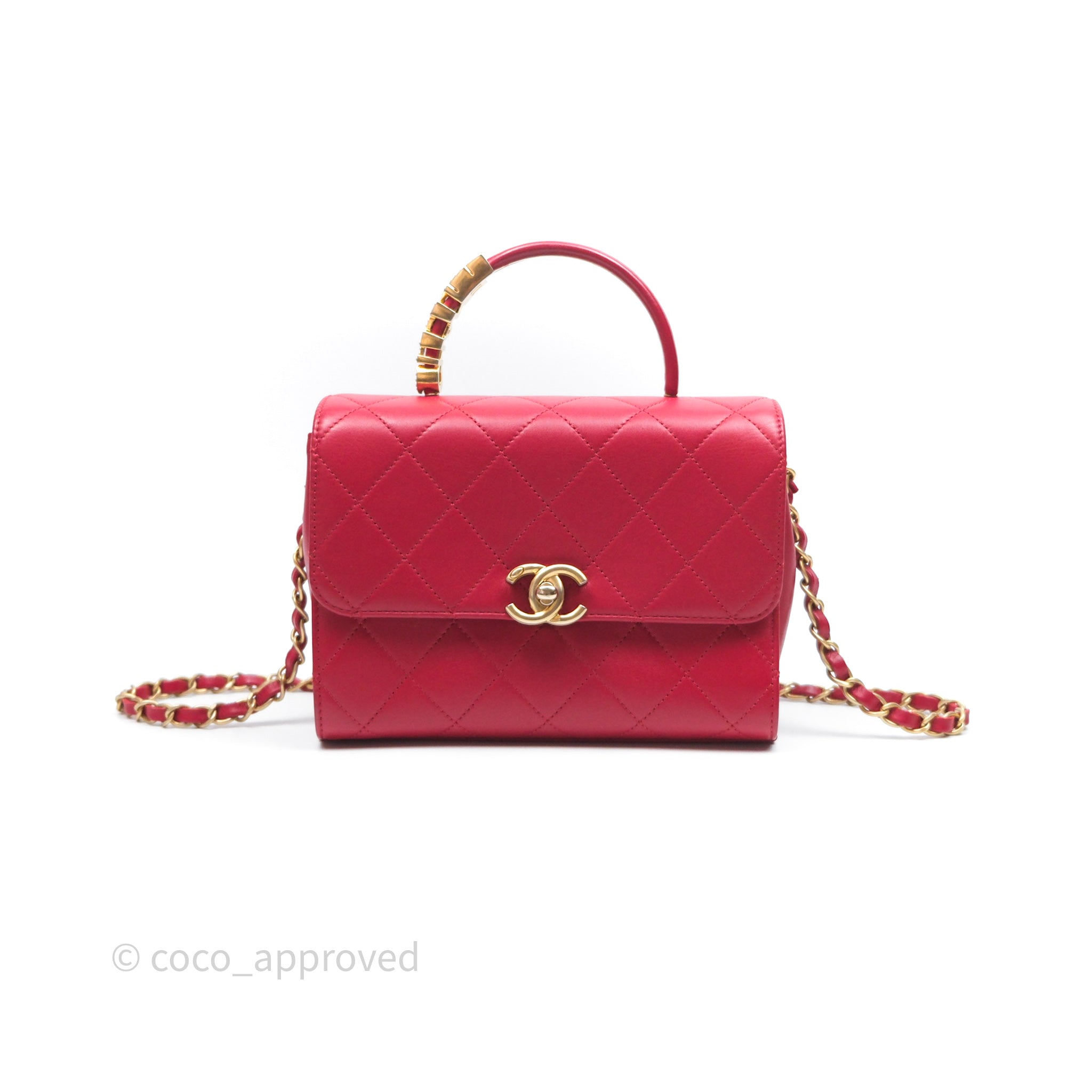 Chanel Quilted Flap Bag with Pearl Logo Top Handle Red Lambskin Aged Gold Hardware is now sold. Please subscribe for any updates if similar item becomes available.