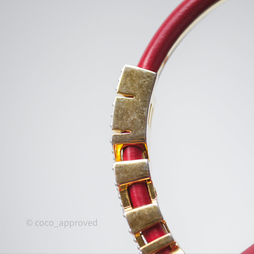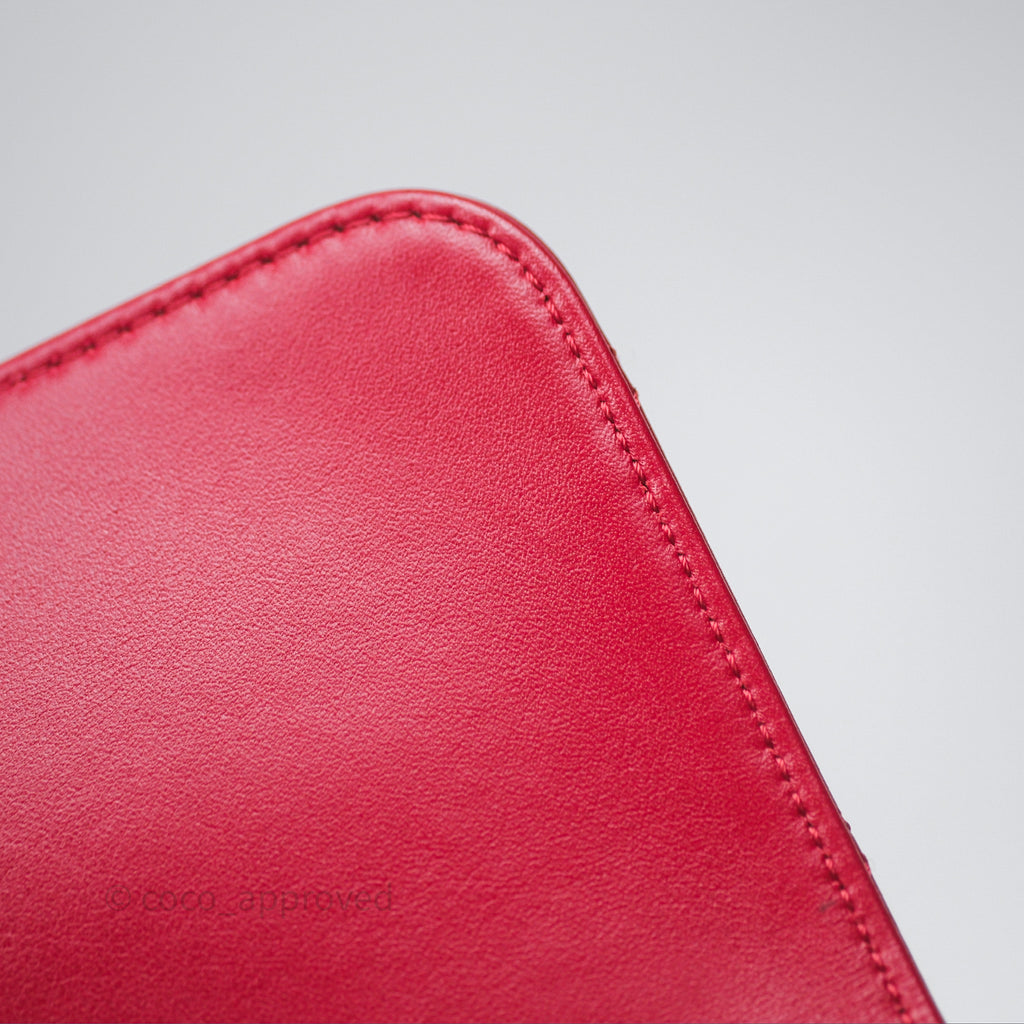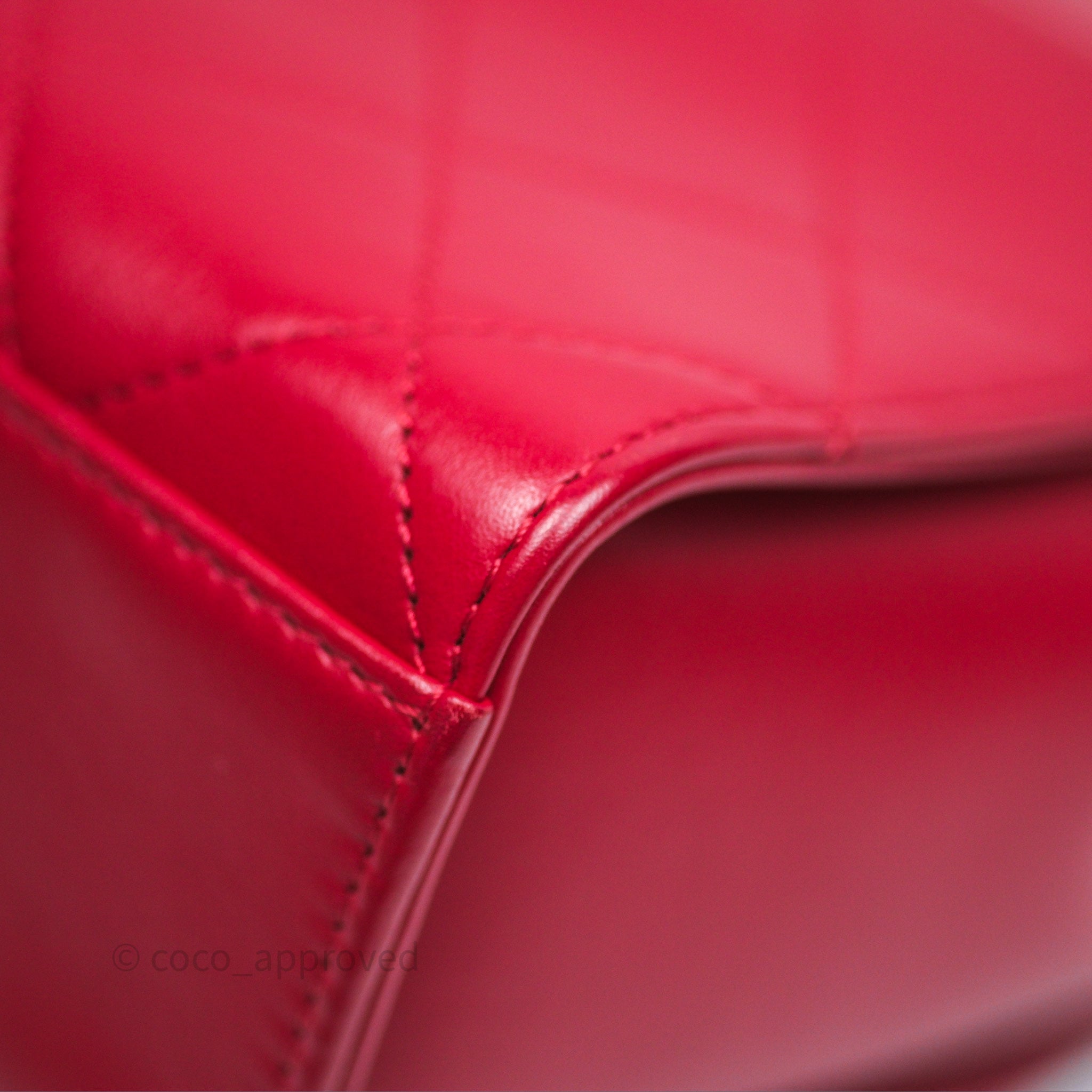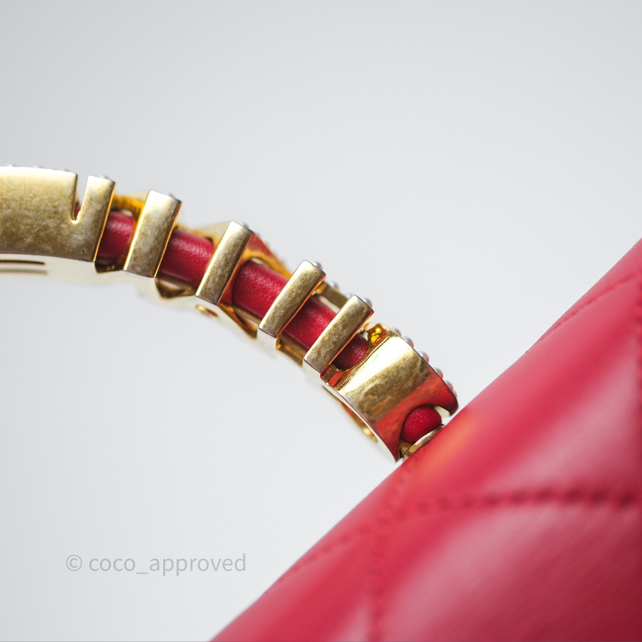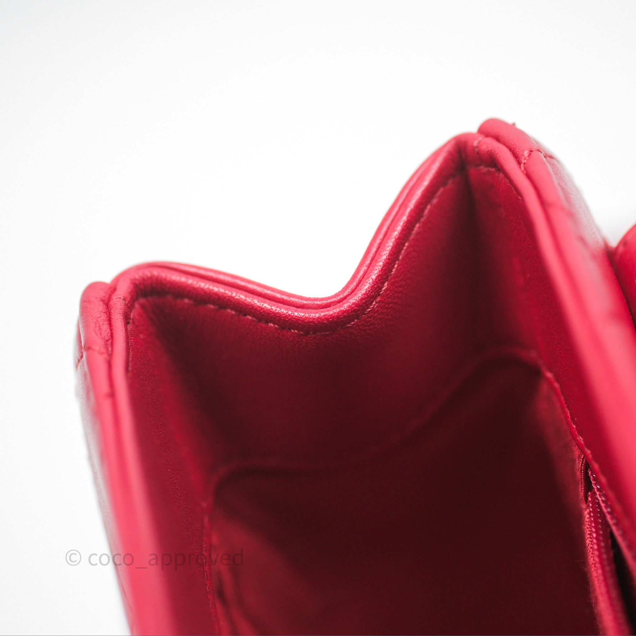 Chanel Quilted Flap Bag with Pearl Logo Top Handle Red Lambskin Aged Gold Hardware is now sold. Please subscribe for any updates if similar item becomes available.