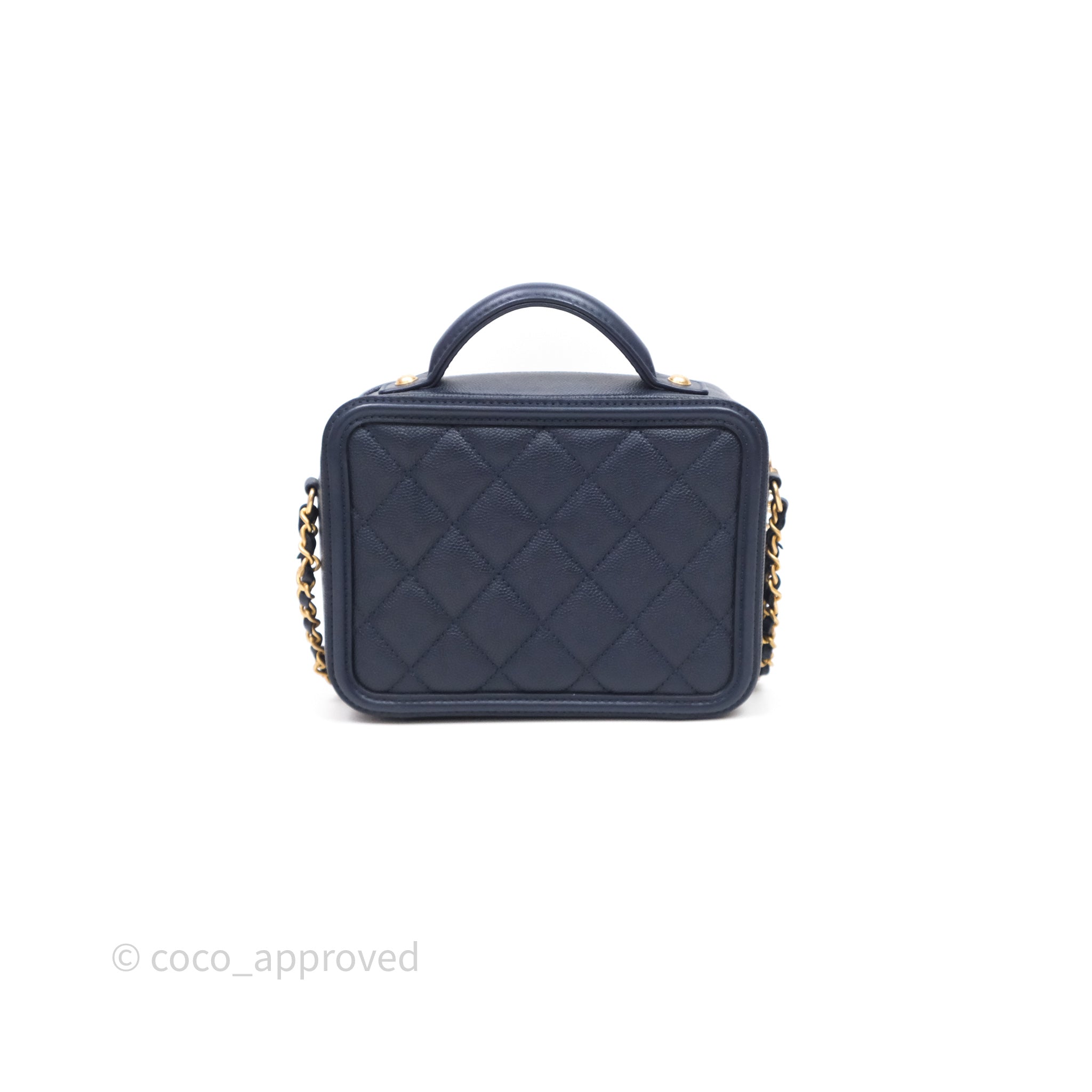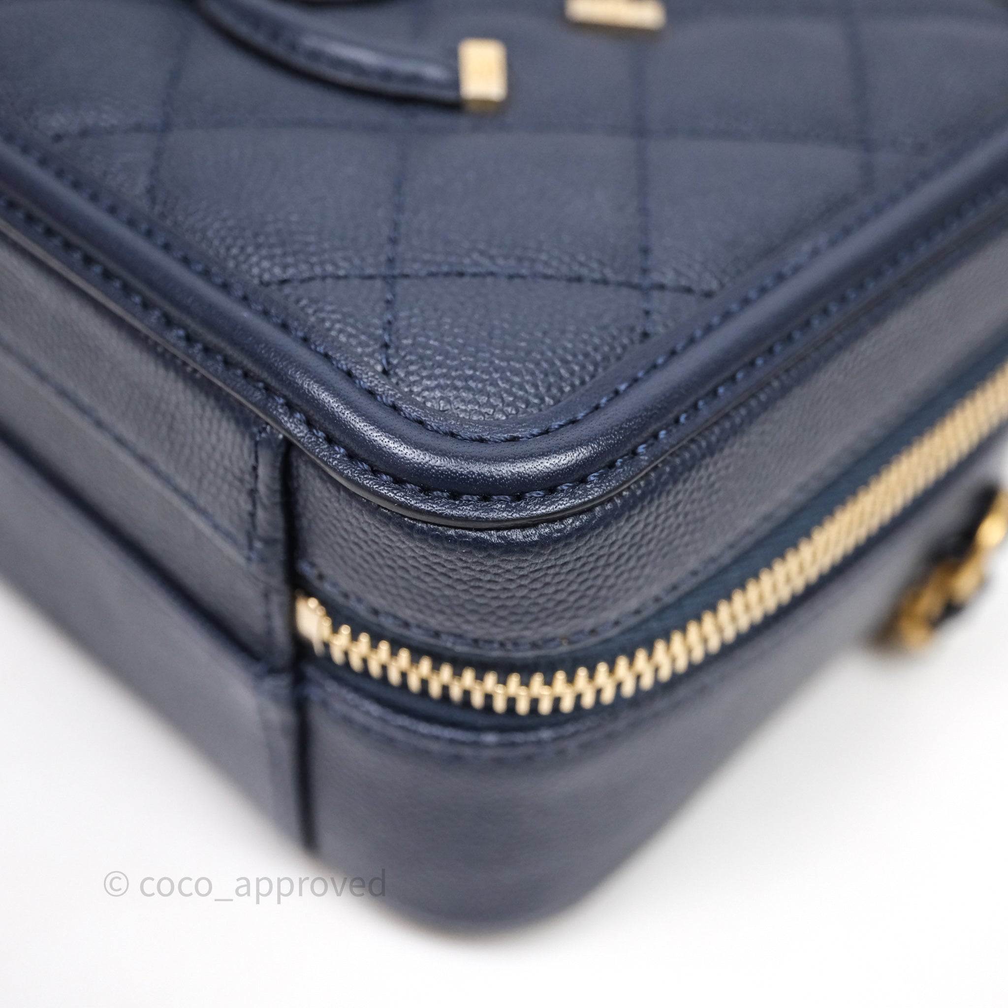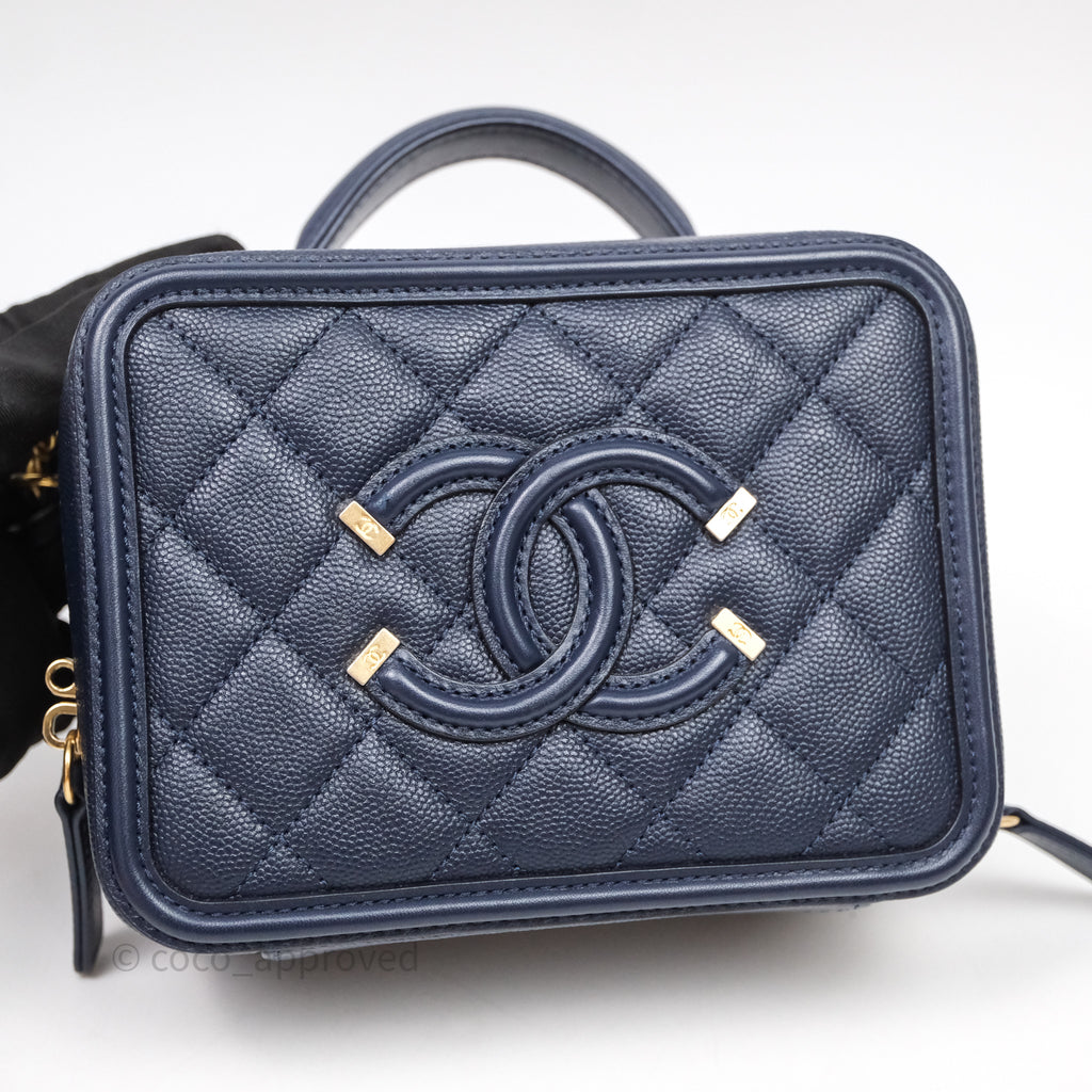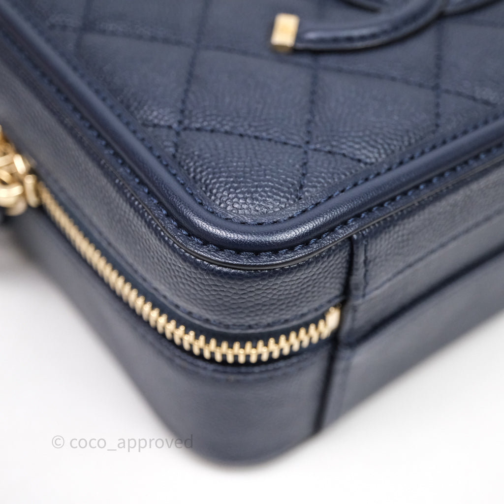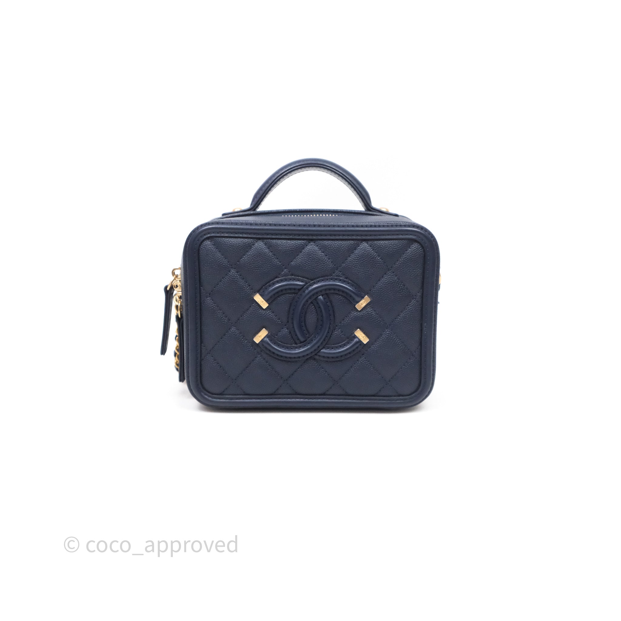 Chanel Quilted Small CC Filigree Vanity Case Navy Caviar Gold Hardware