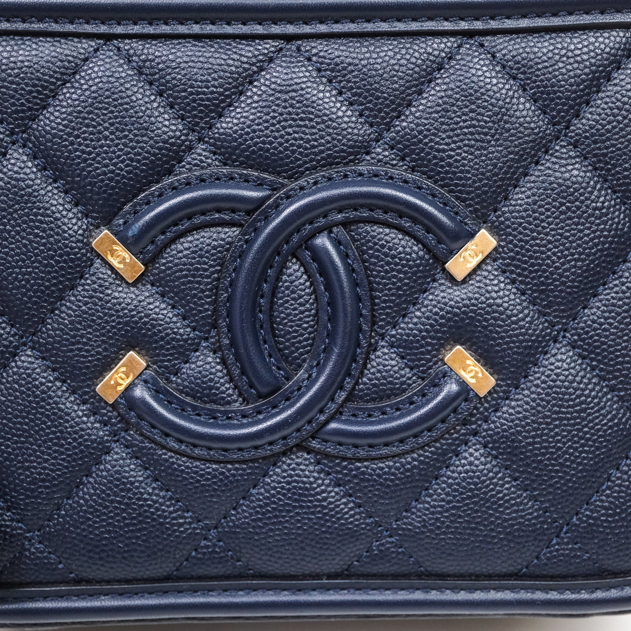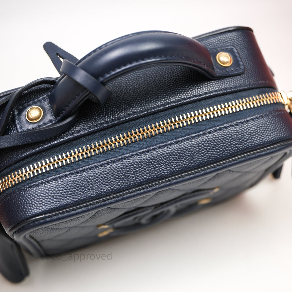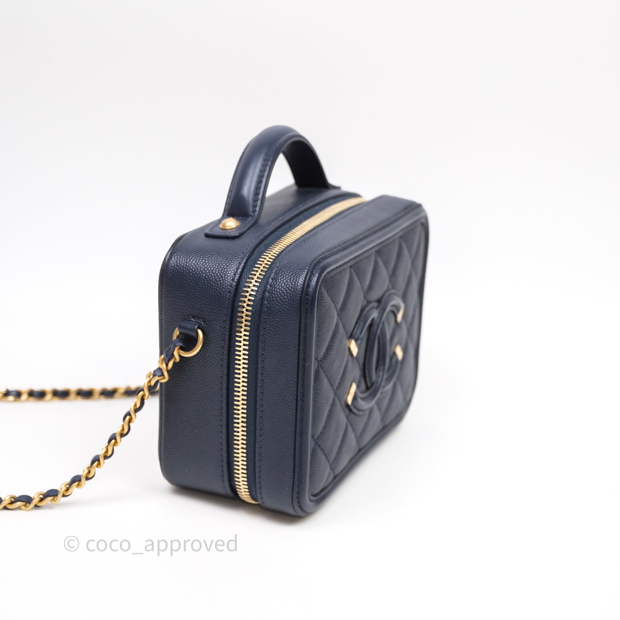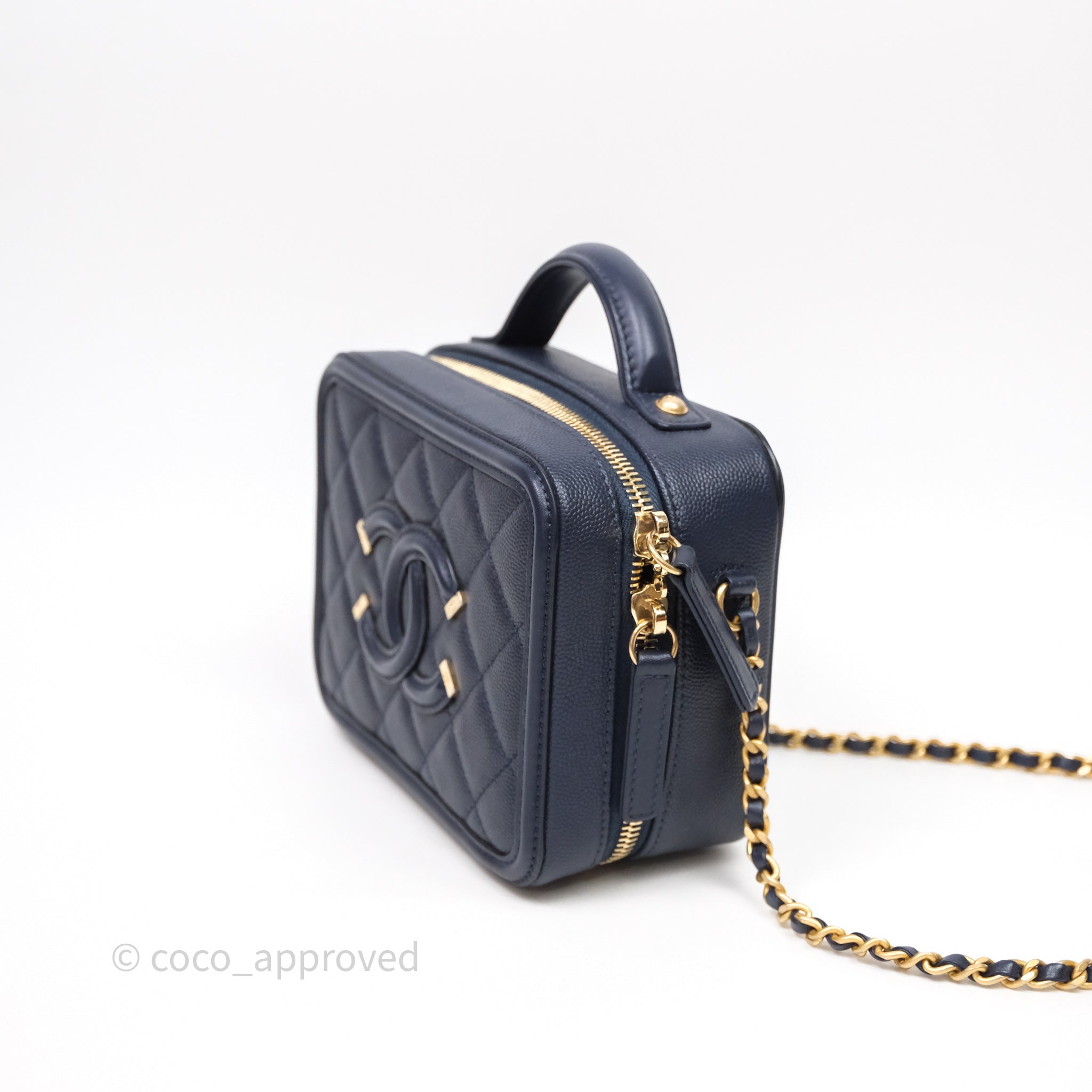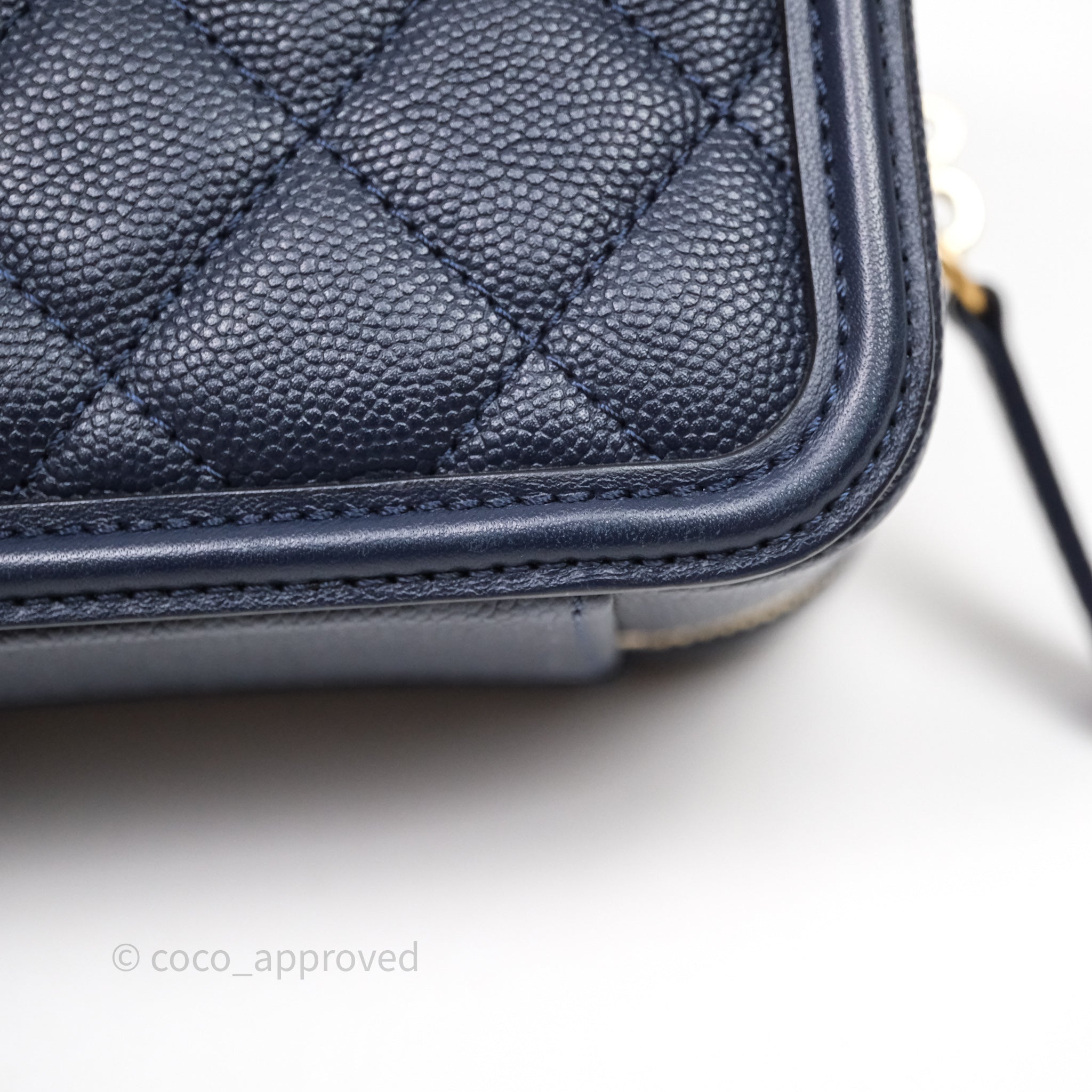 Chanel Quilted Small CC Filigree Vanity Case Navy Caviar Gold Hardware
