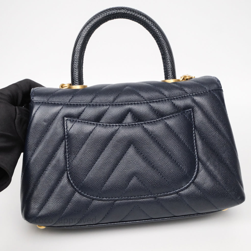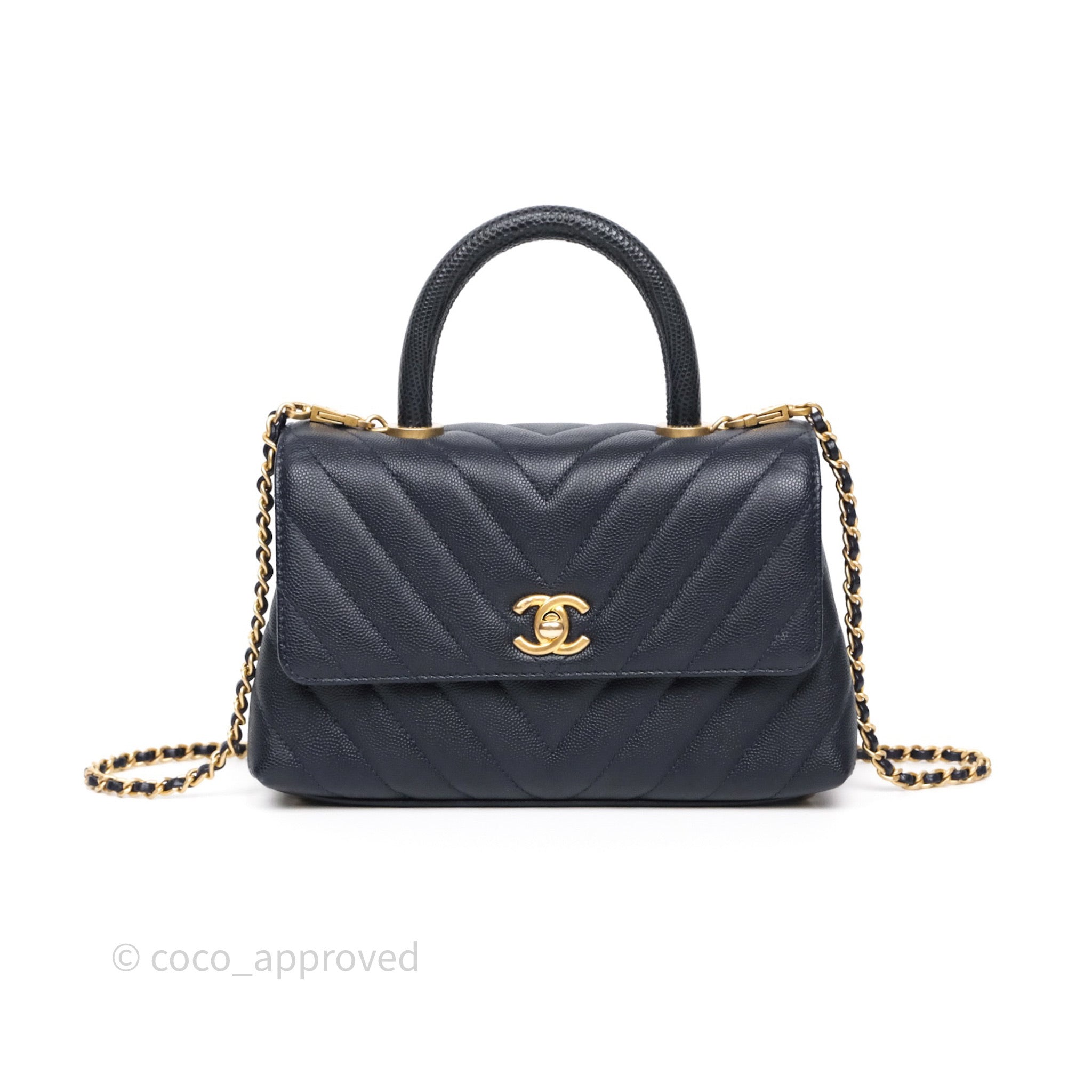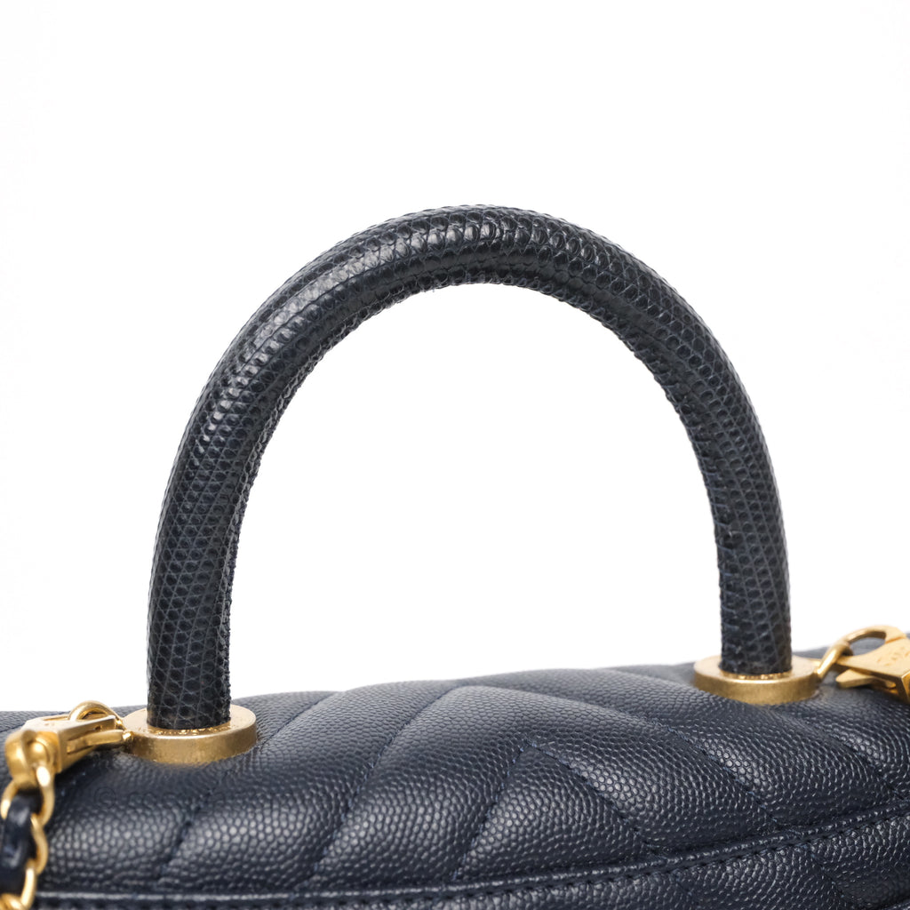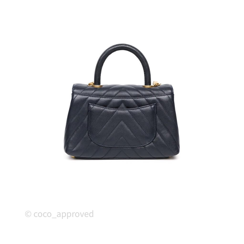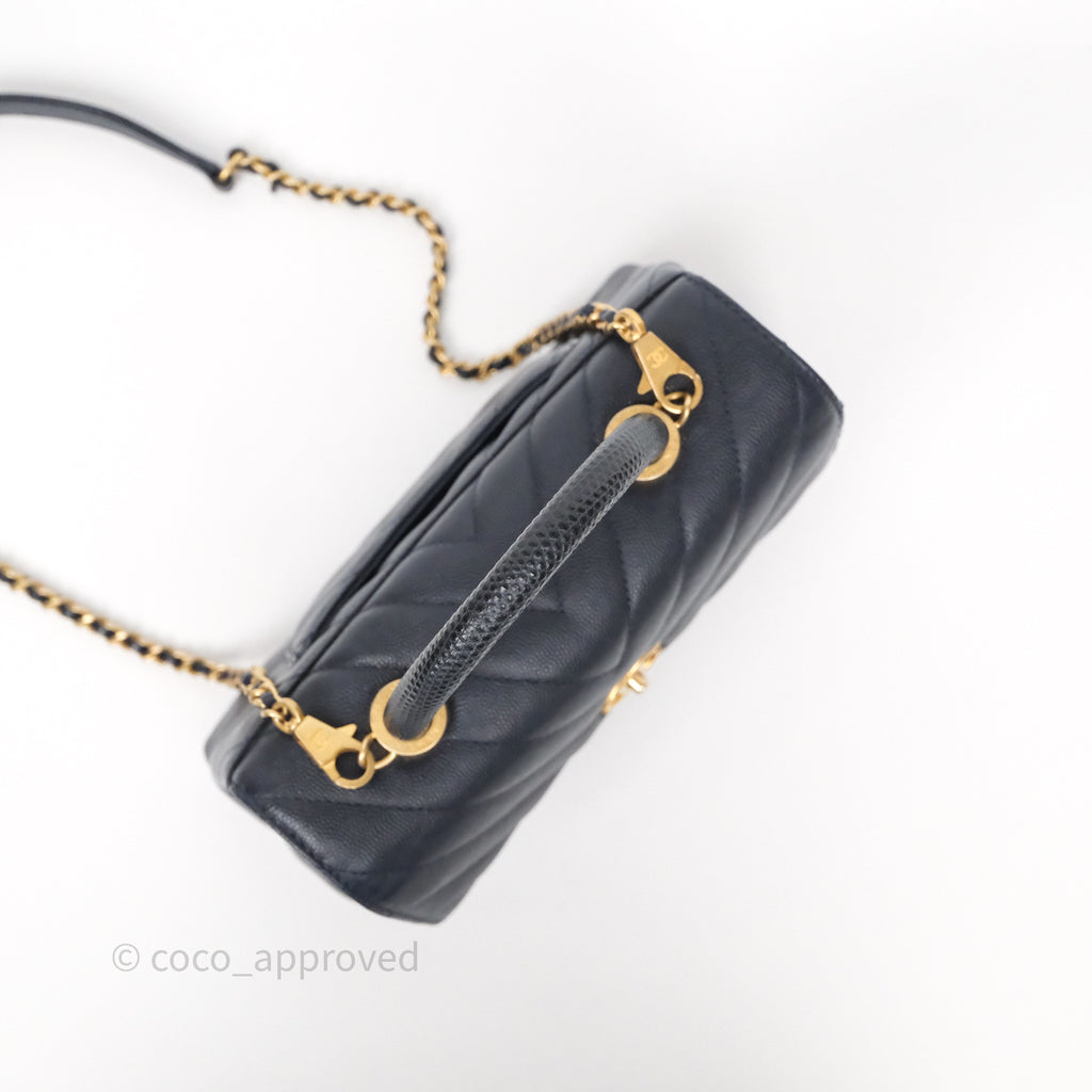 Chanel Small Coco Handle Chevron Navy Caviar Aged Gold Hardware Lizard Handle