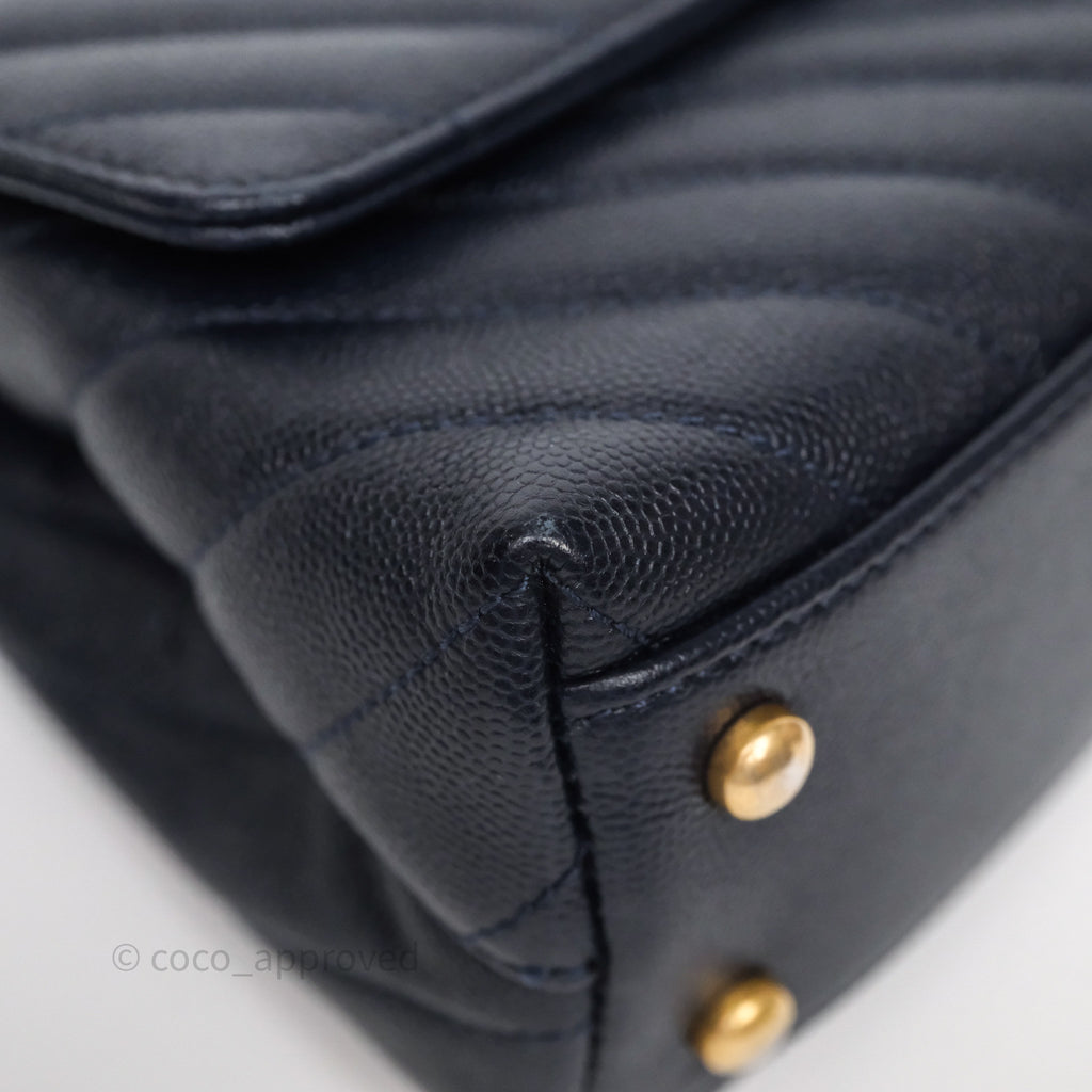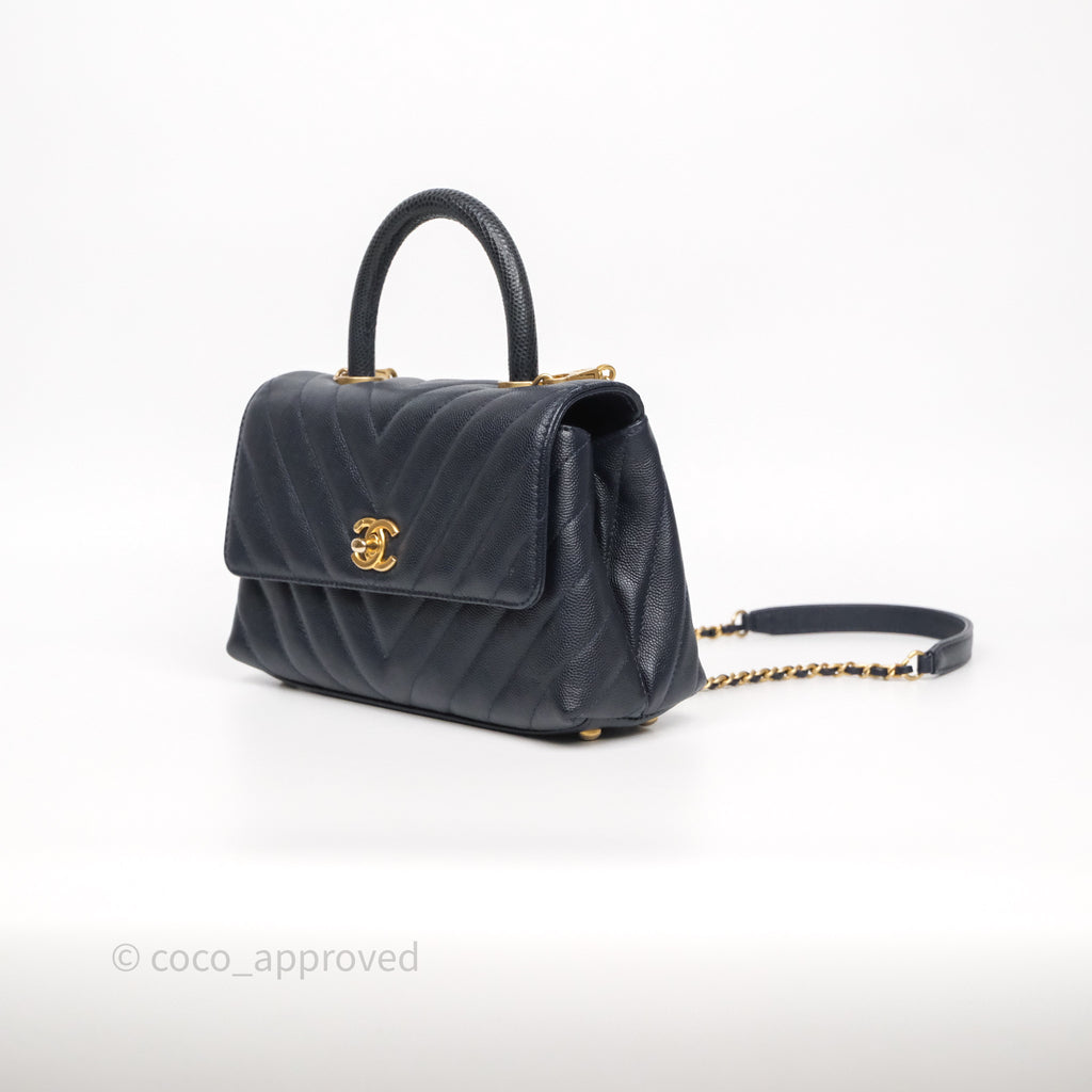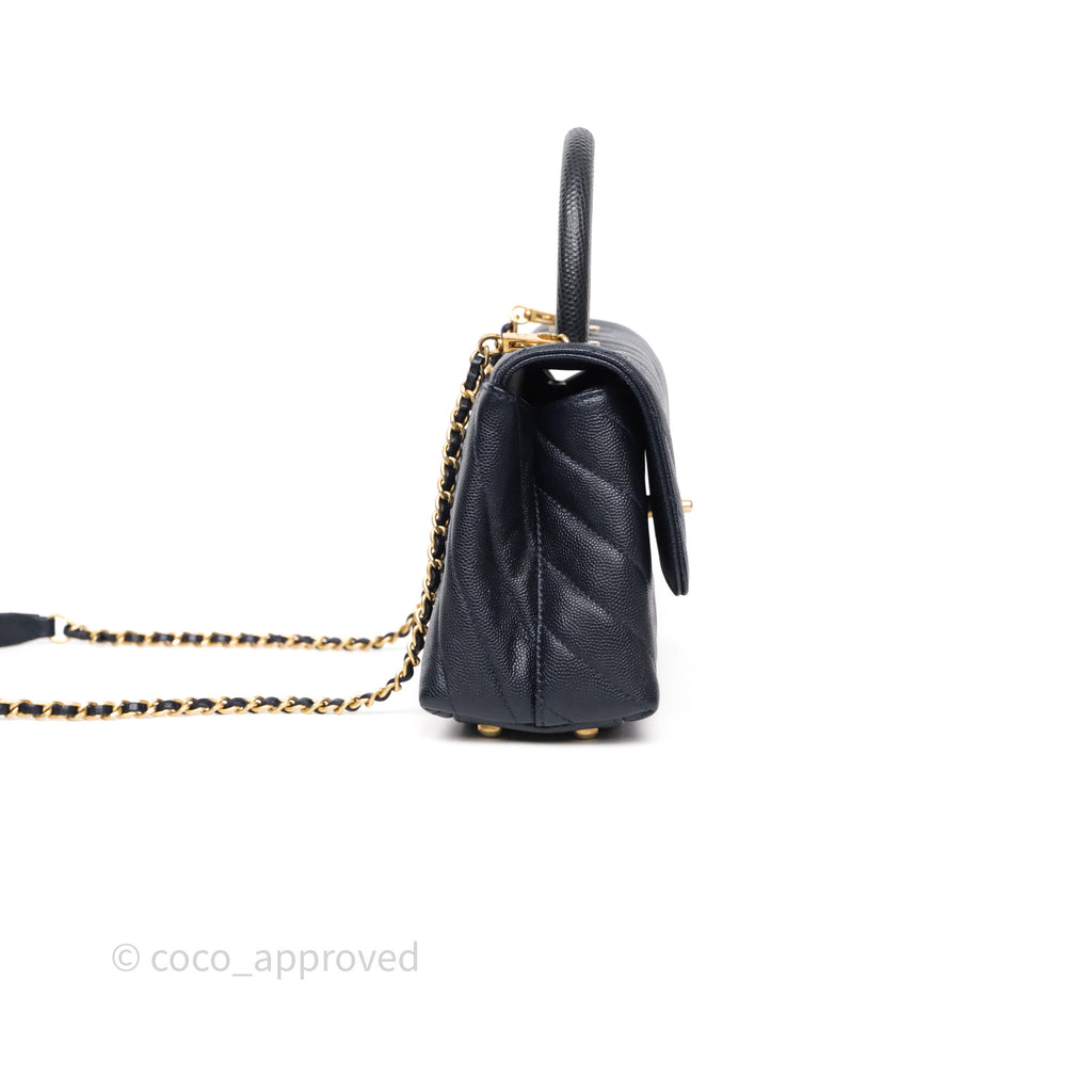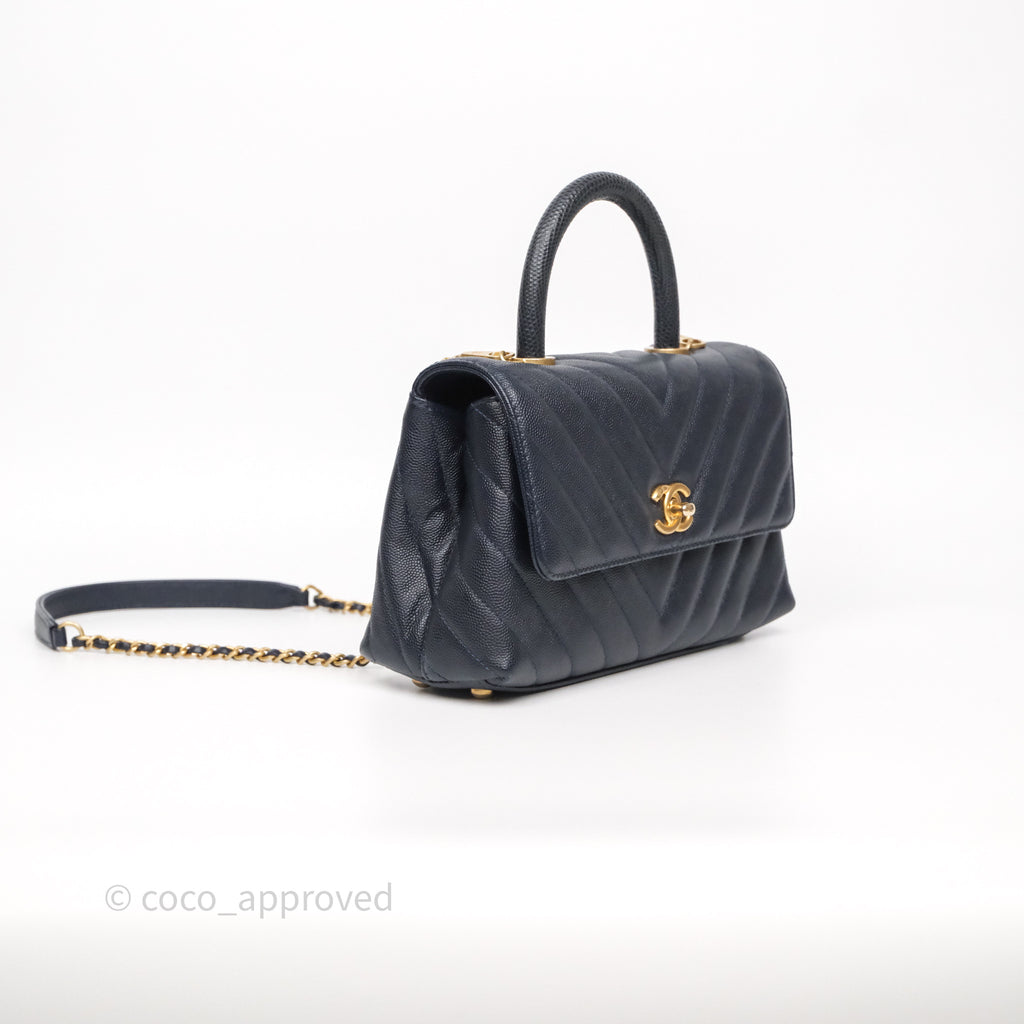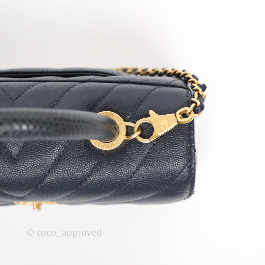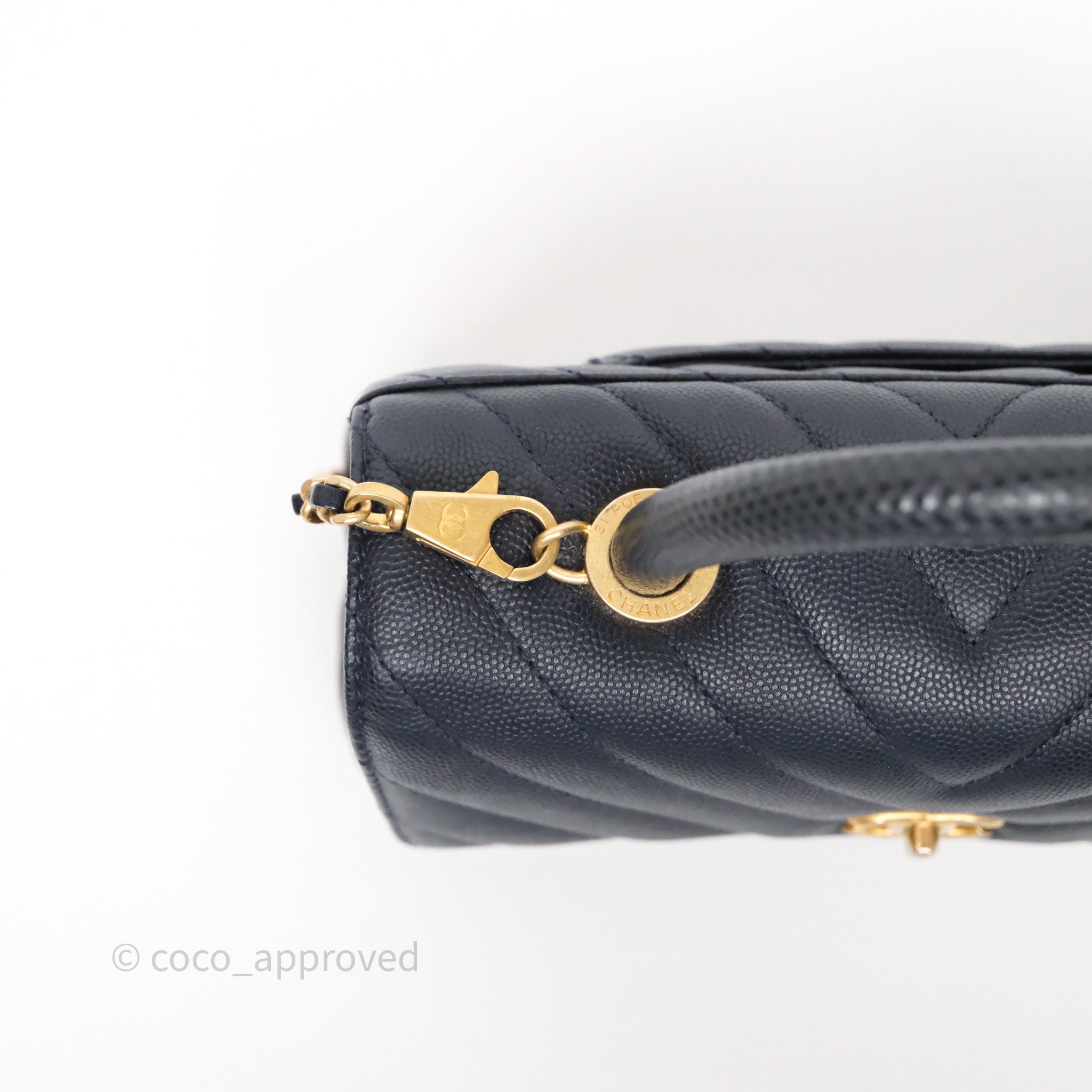 Chanel Small Coco Handle Chevron Navy Caviar Aged Gold Hardware Lizard Handle