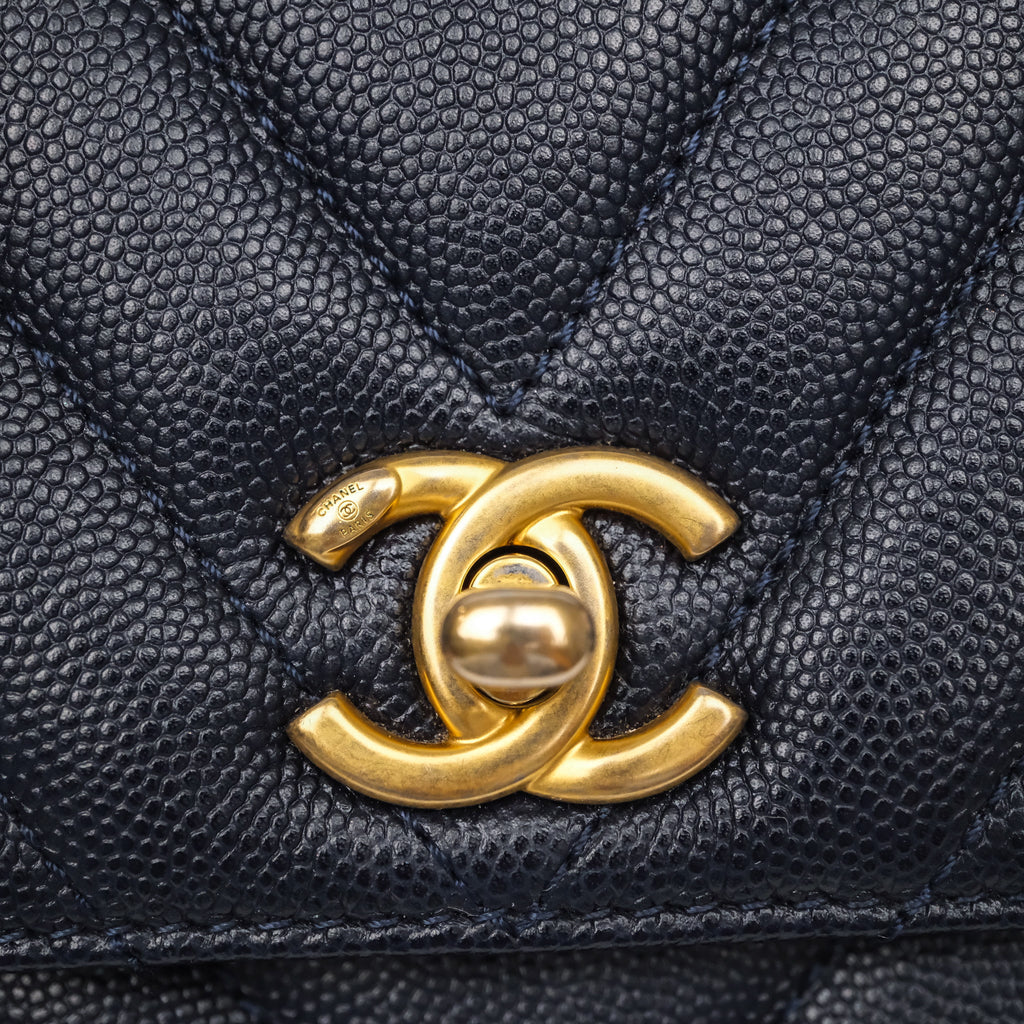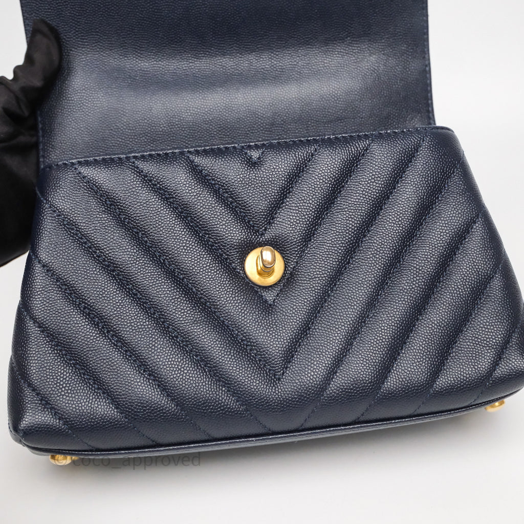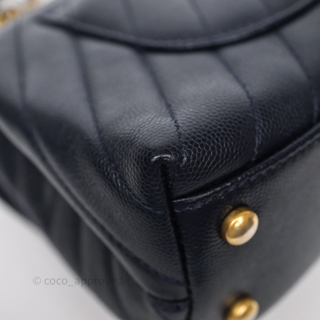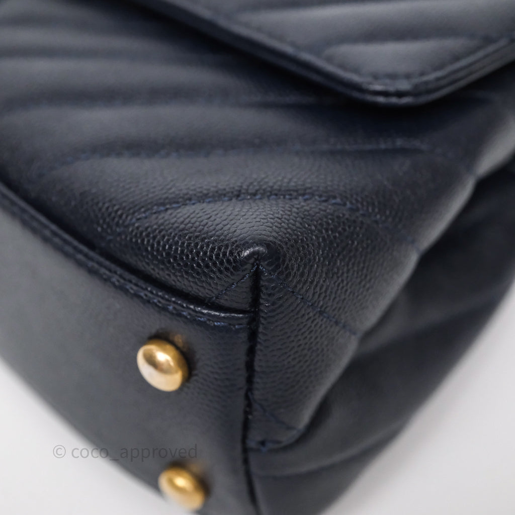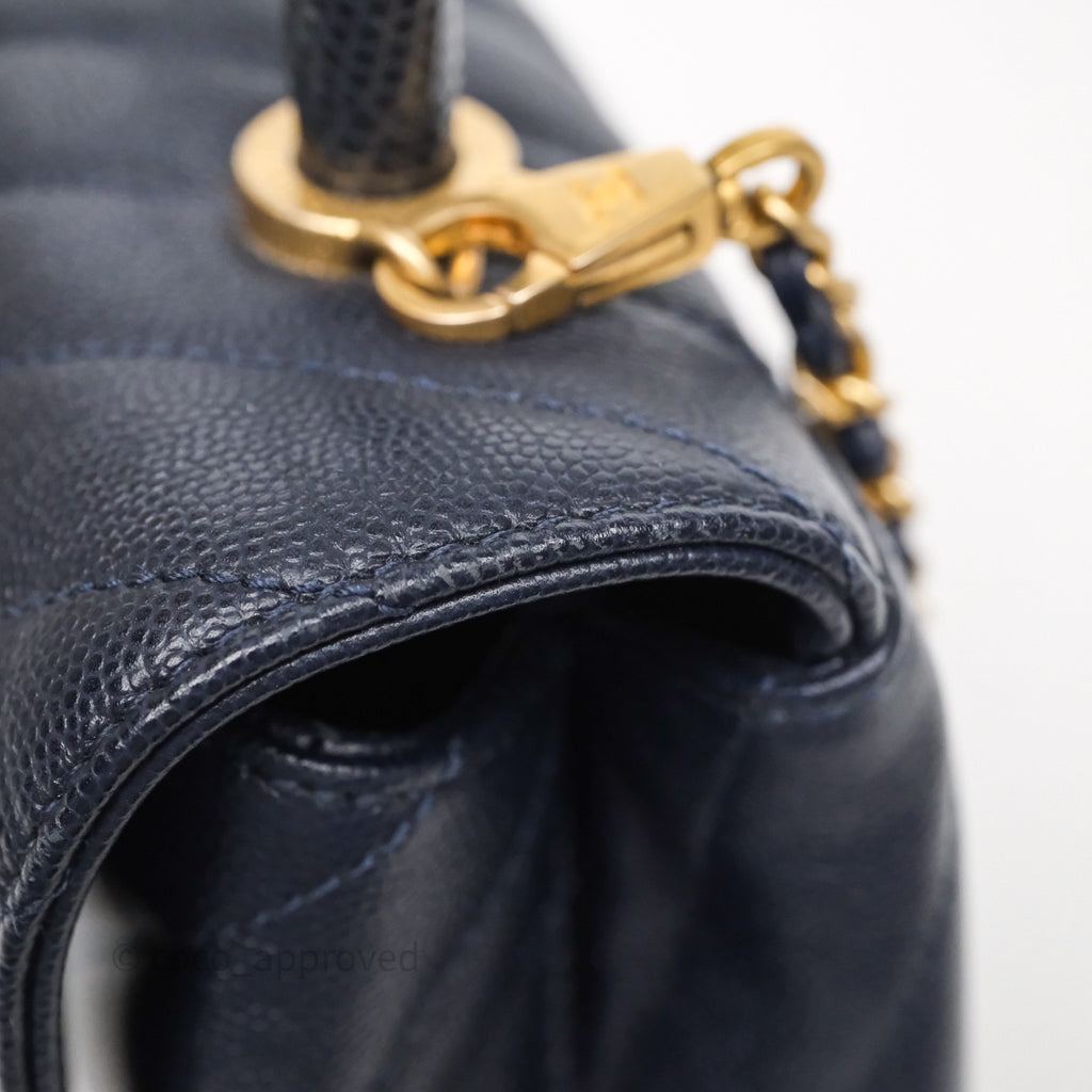 Chanel Small Coco Handle Chevron Navy Caviar Aged Gold Hardware Lizard Handle