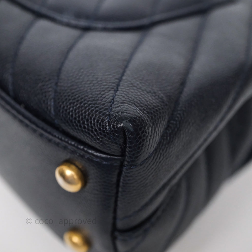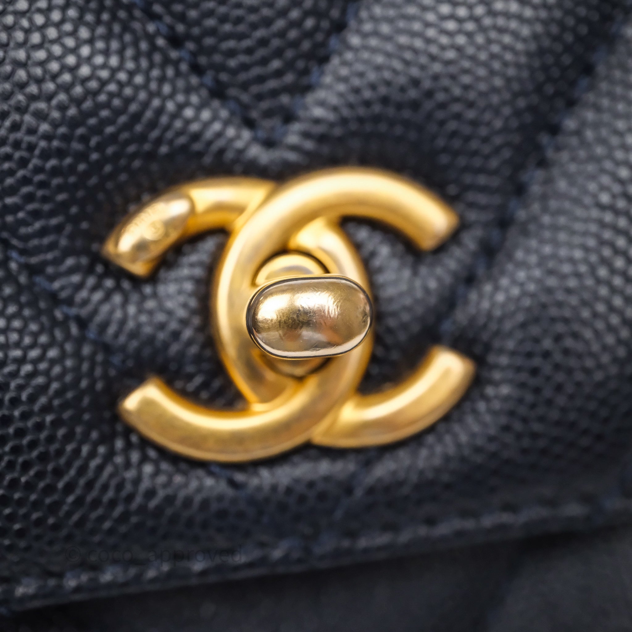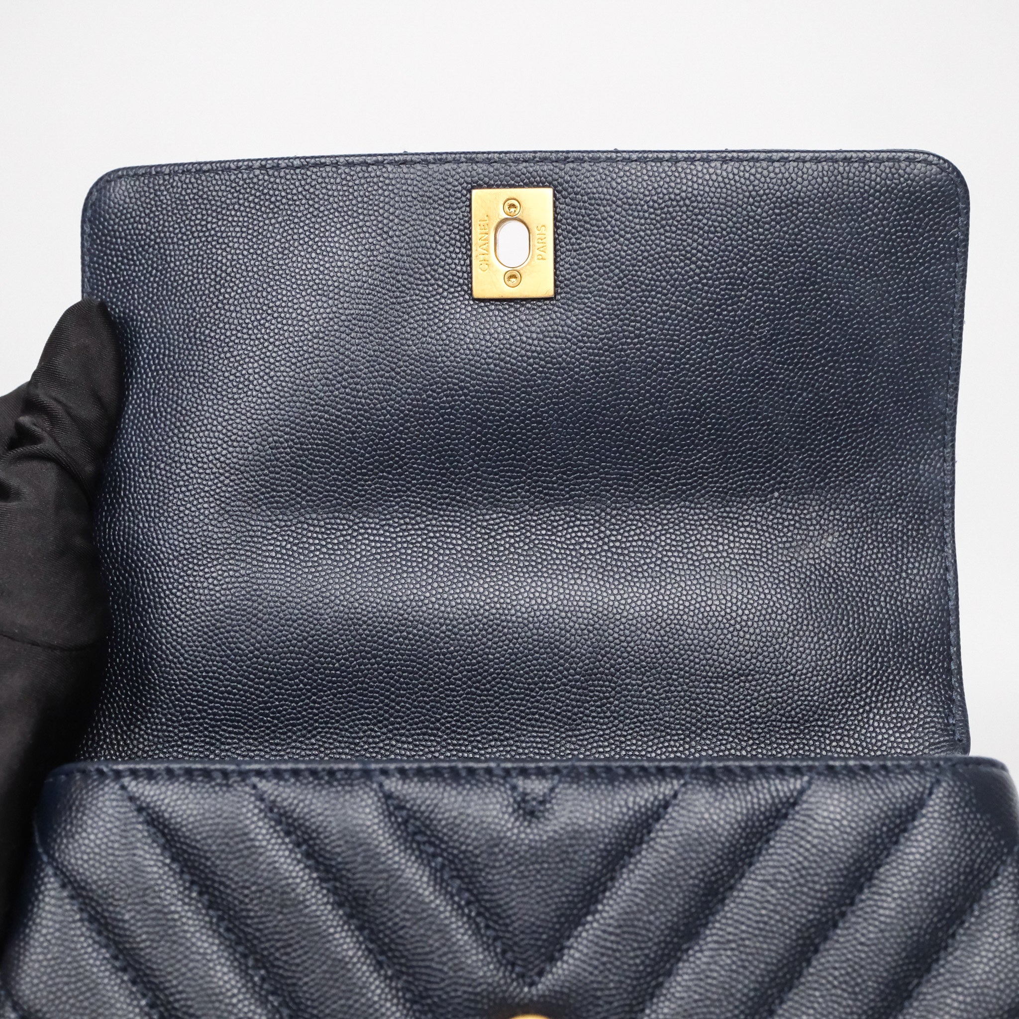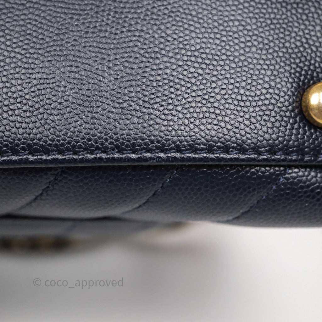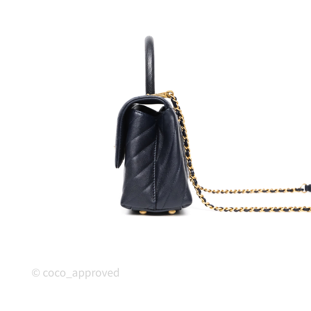 Chanel Small Coco Handle Chevron Navy Caviar Aged Gold Hardware Lizard Handle