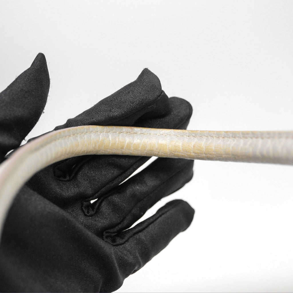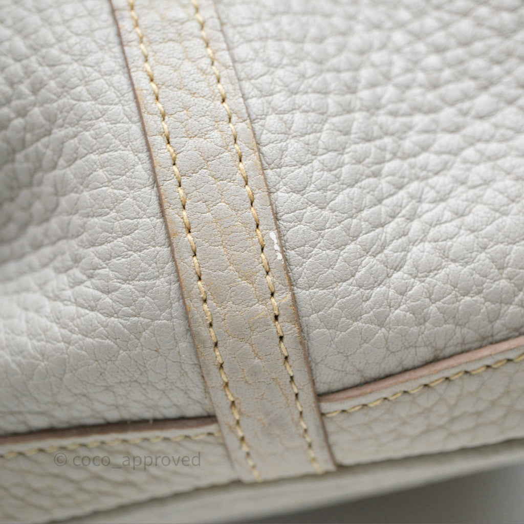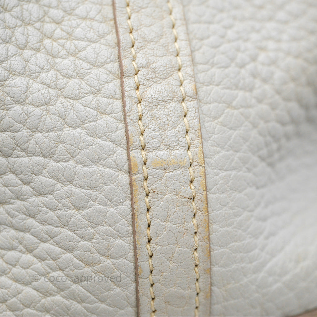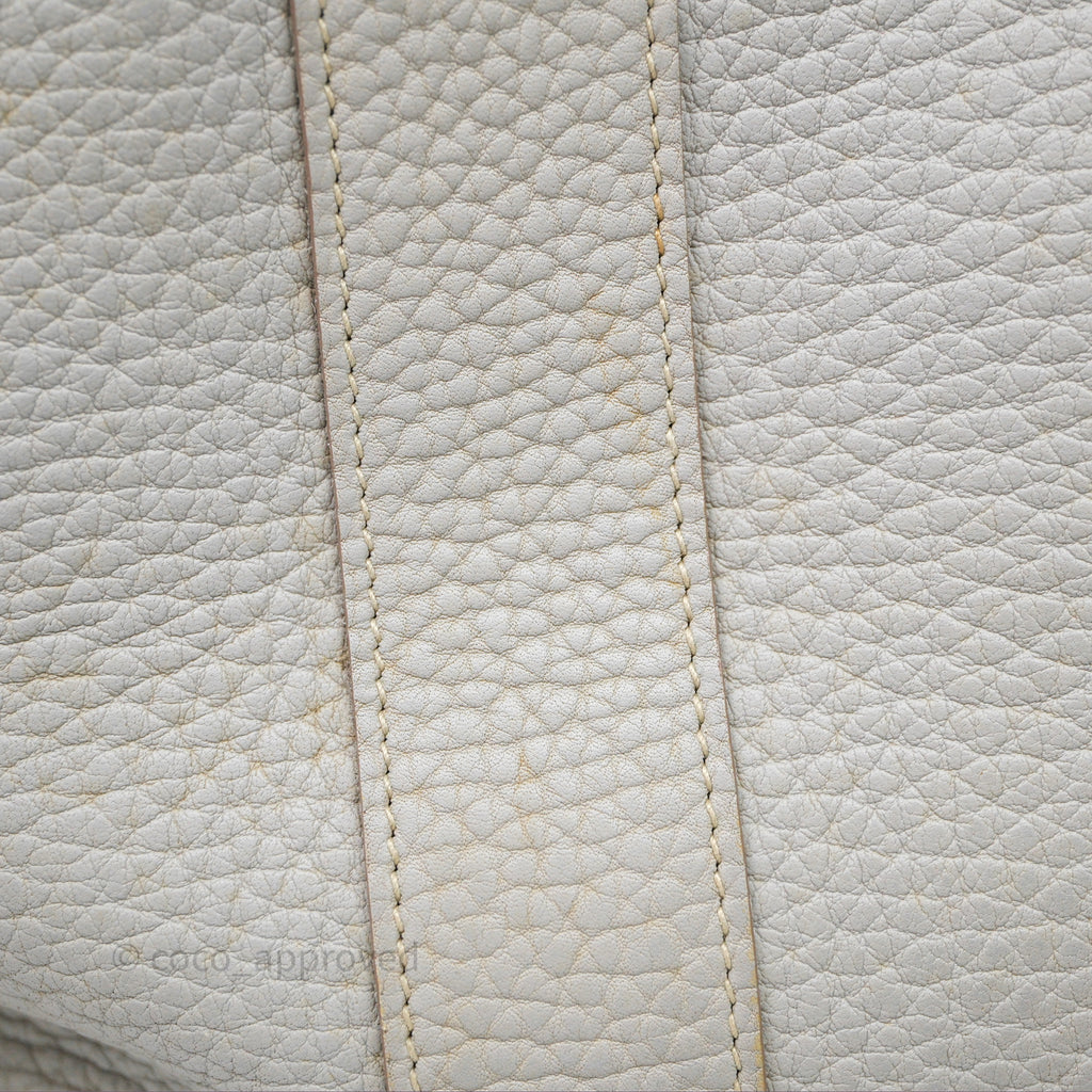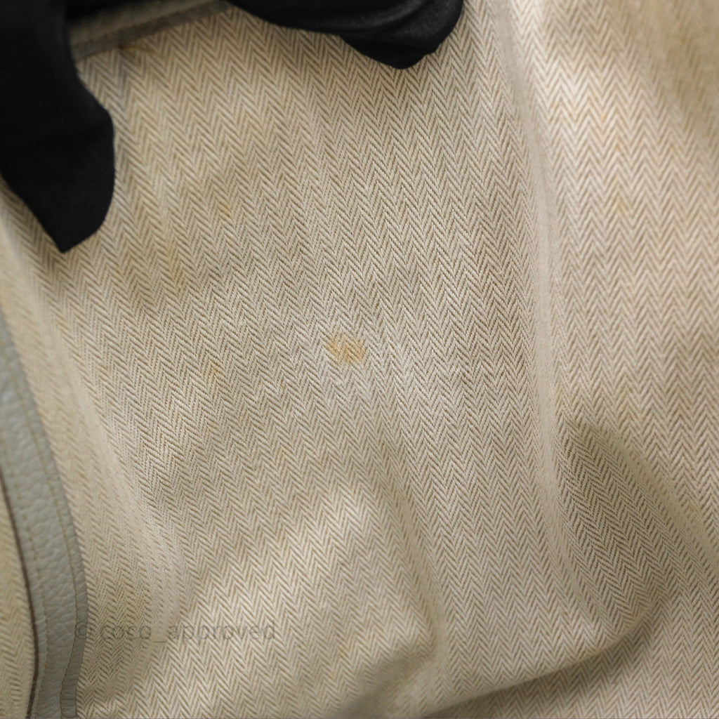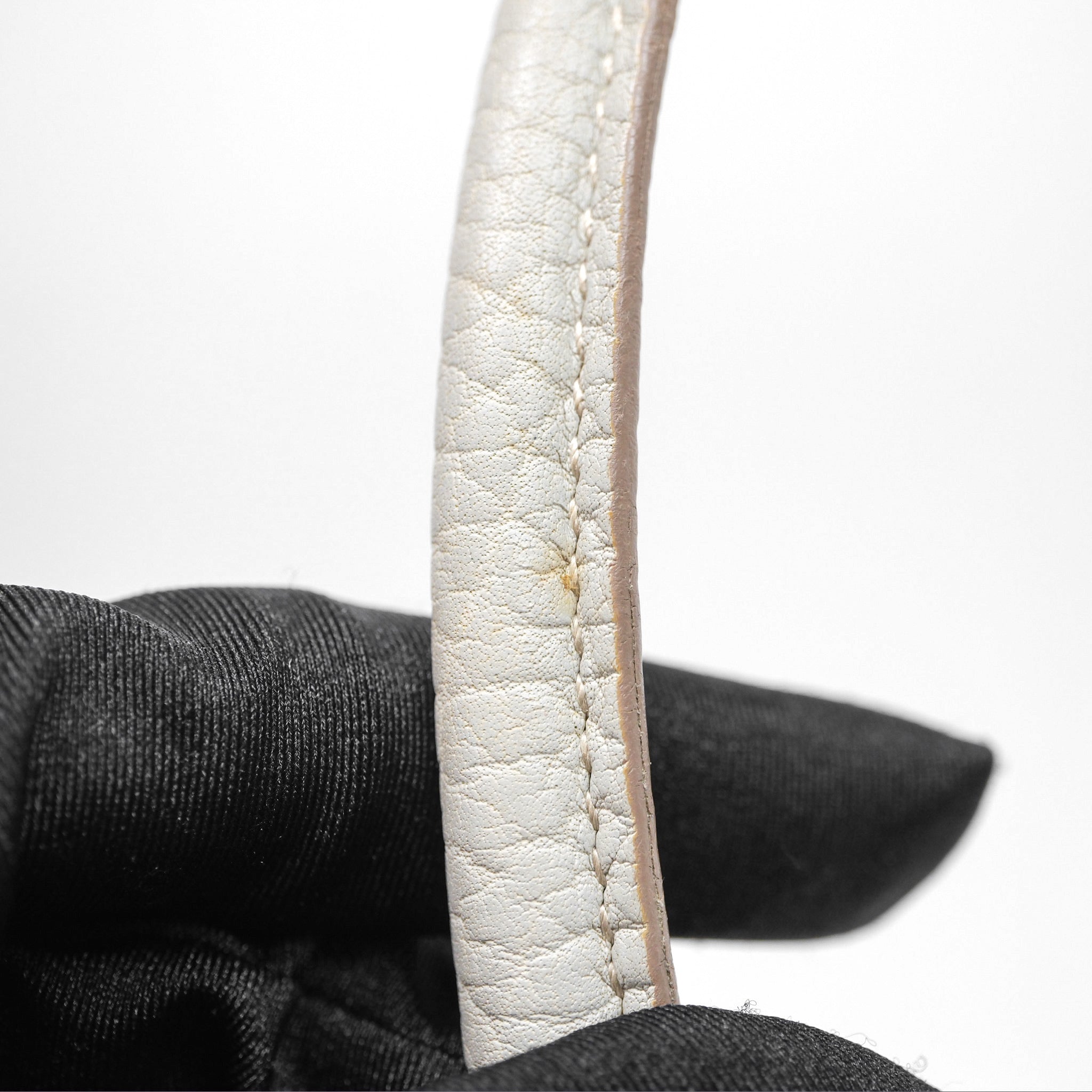8/10 pre-loved condition. Rubbing on corners and handle. Hairlines on hardware. Yellowing and darkening on surface. Pop stitch on interior rims.
