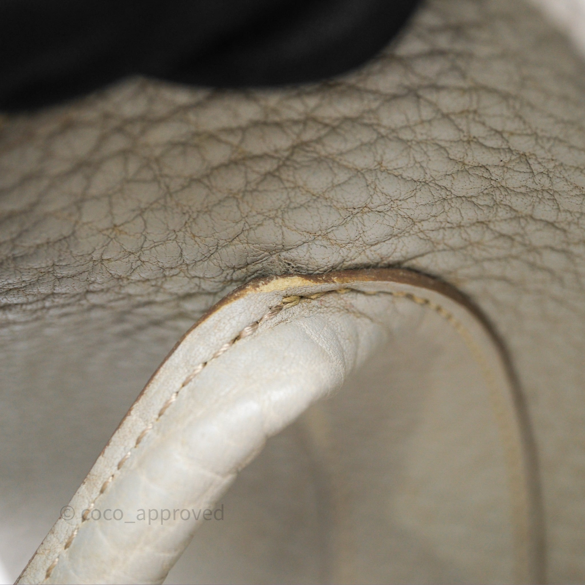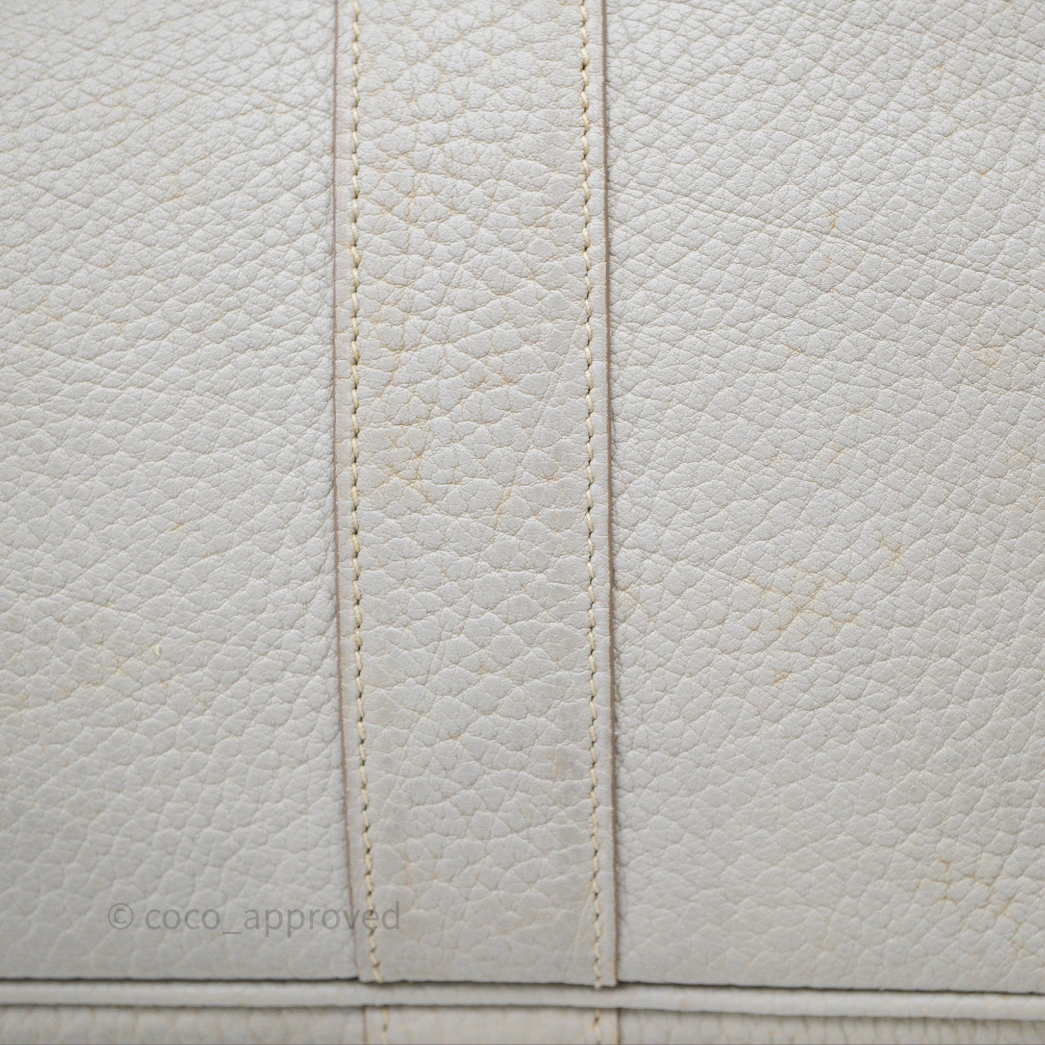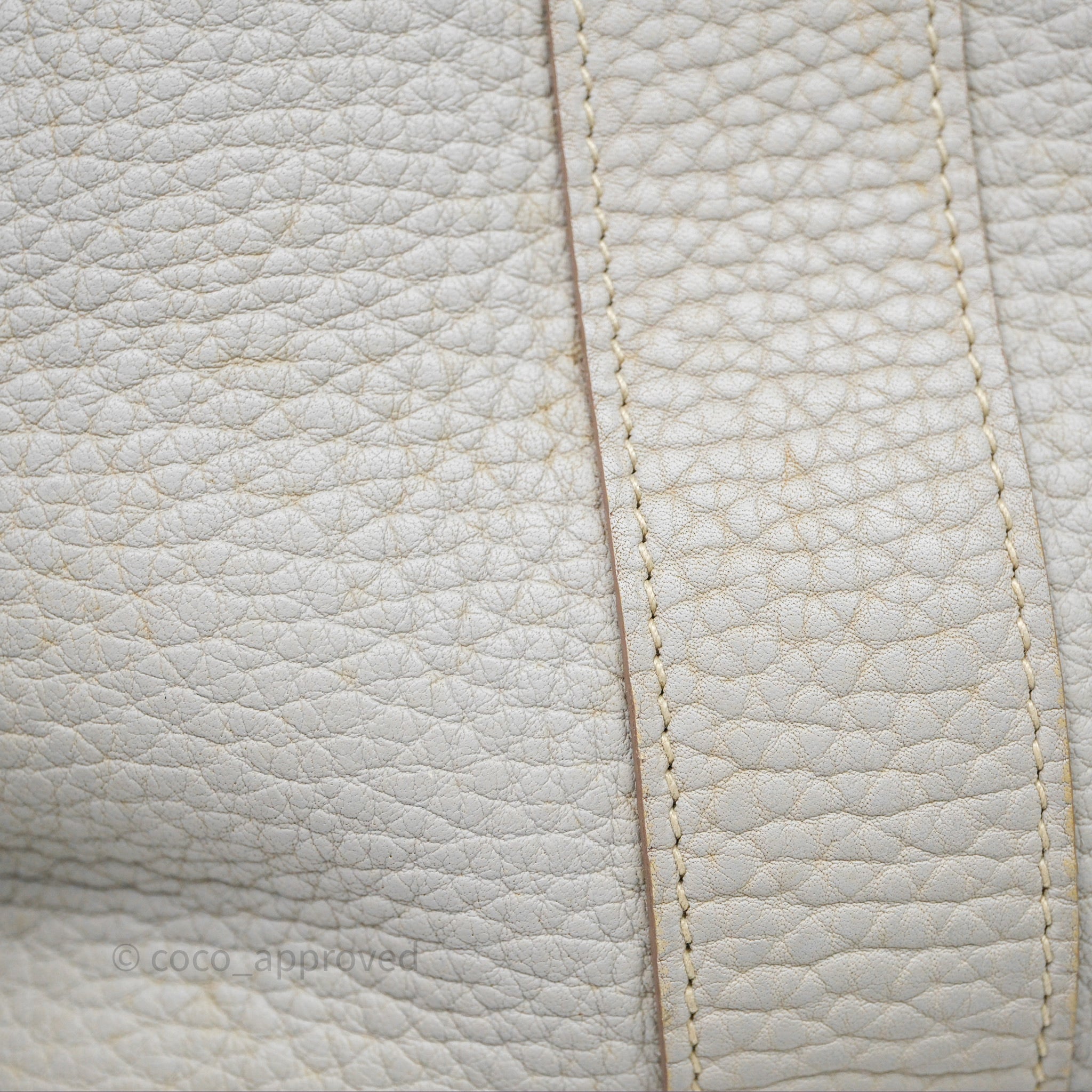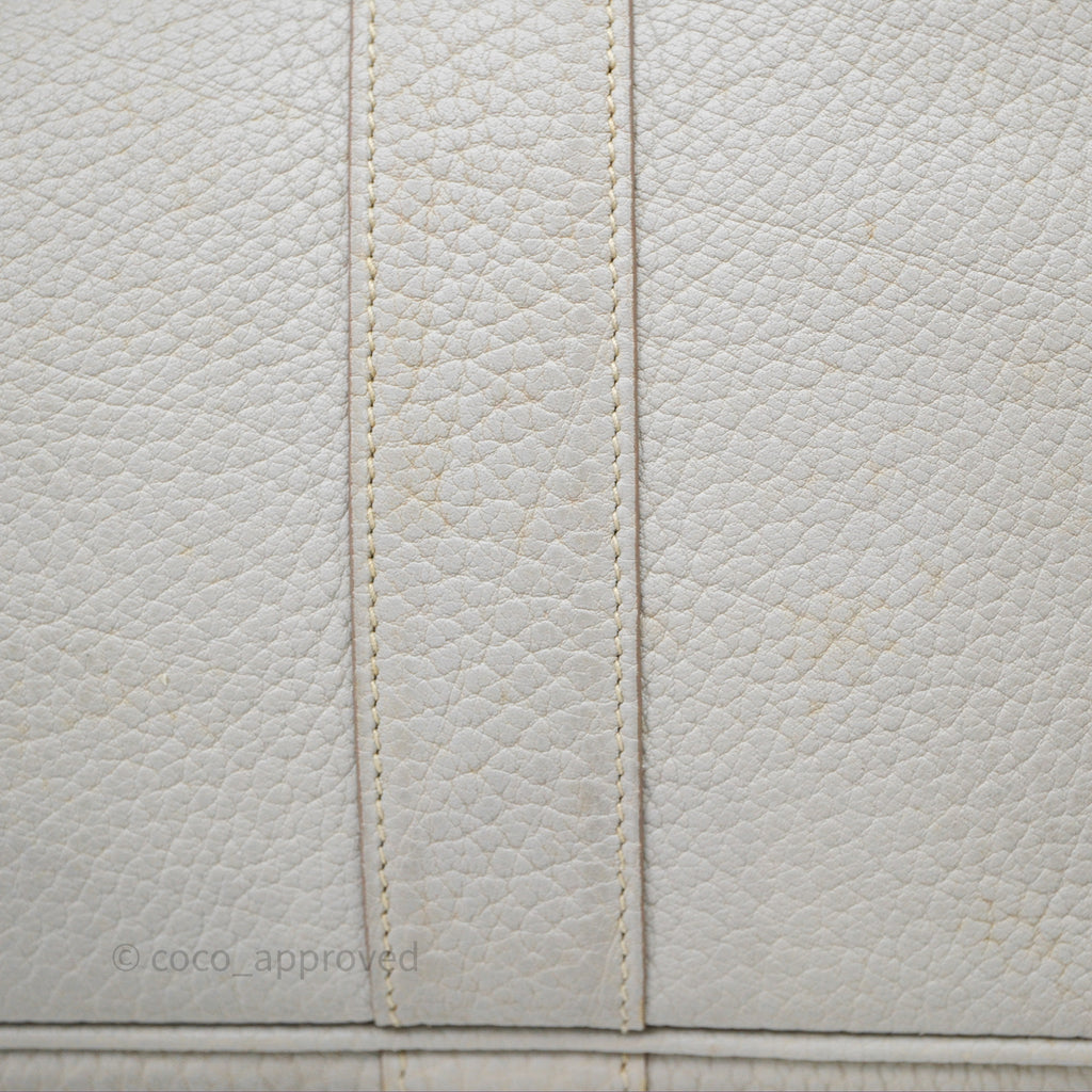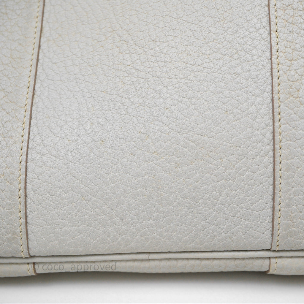 8/10 pre-loved condition. Rubbing on corners and handle. Hairlines on hardware. Yellowing and darkening on surface. Pop stitch on interior rims.