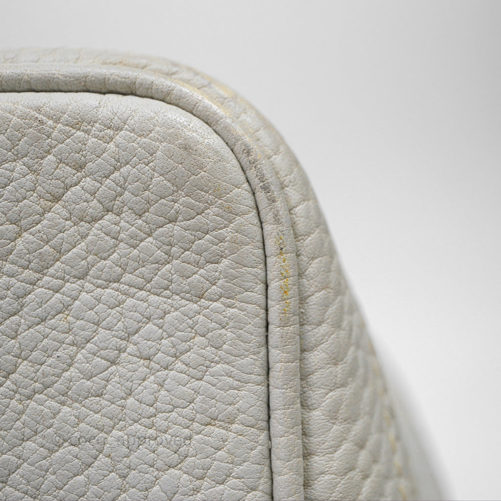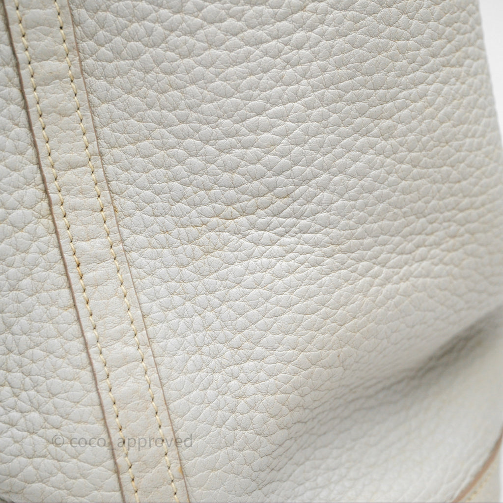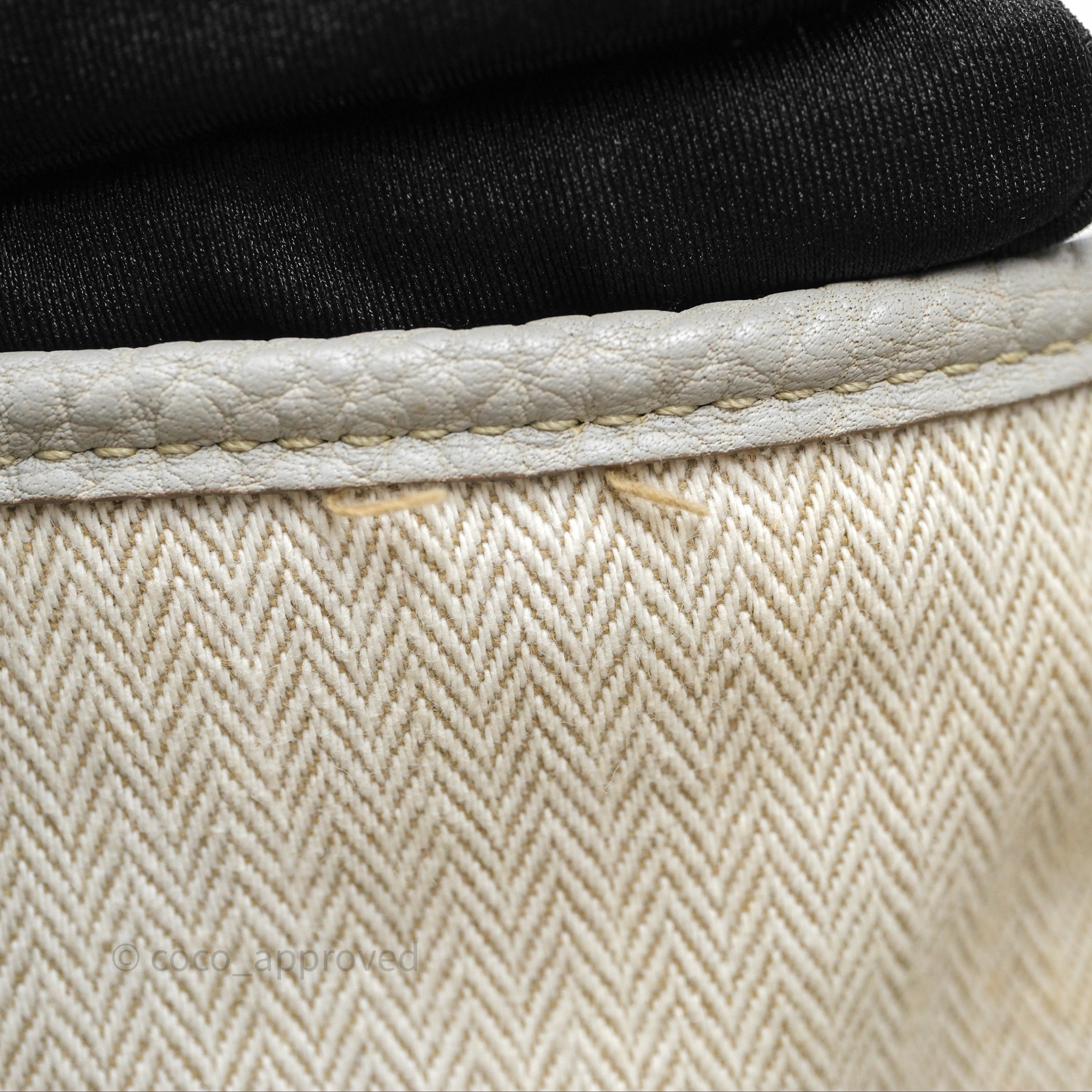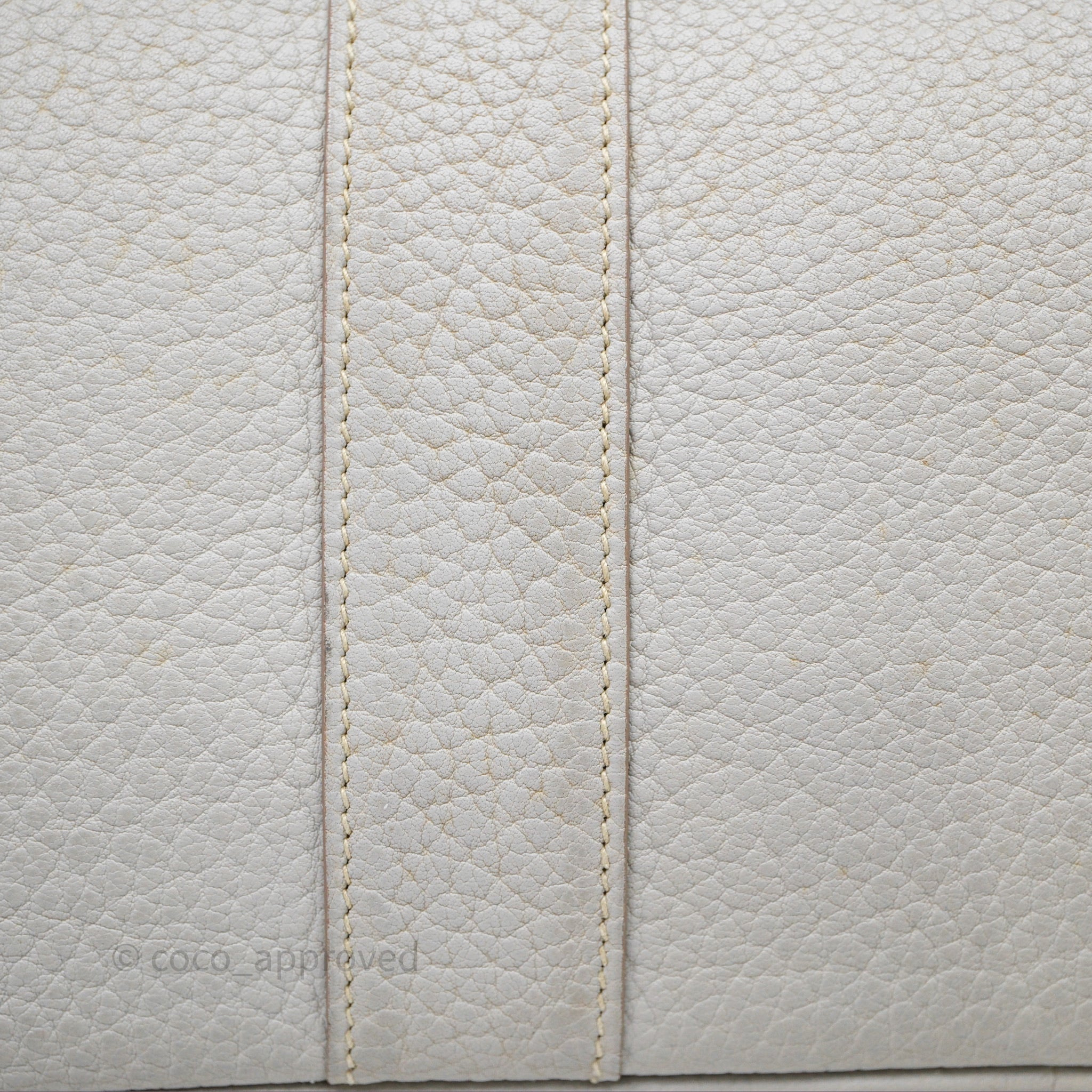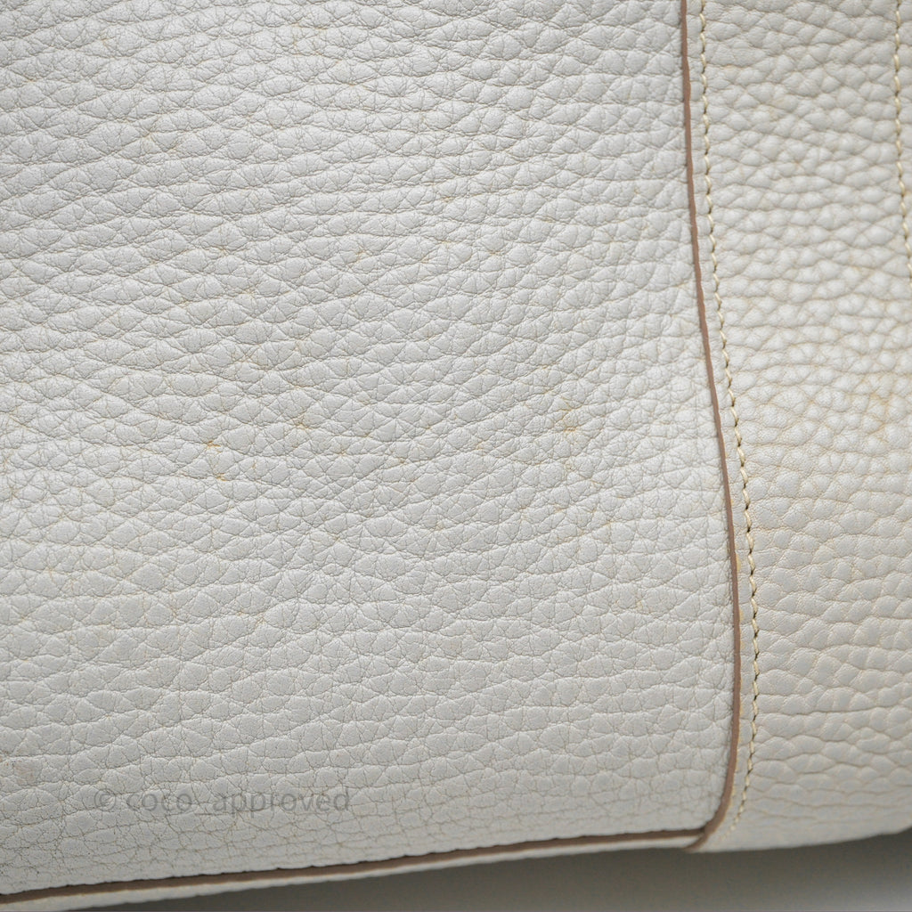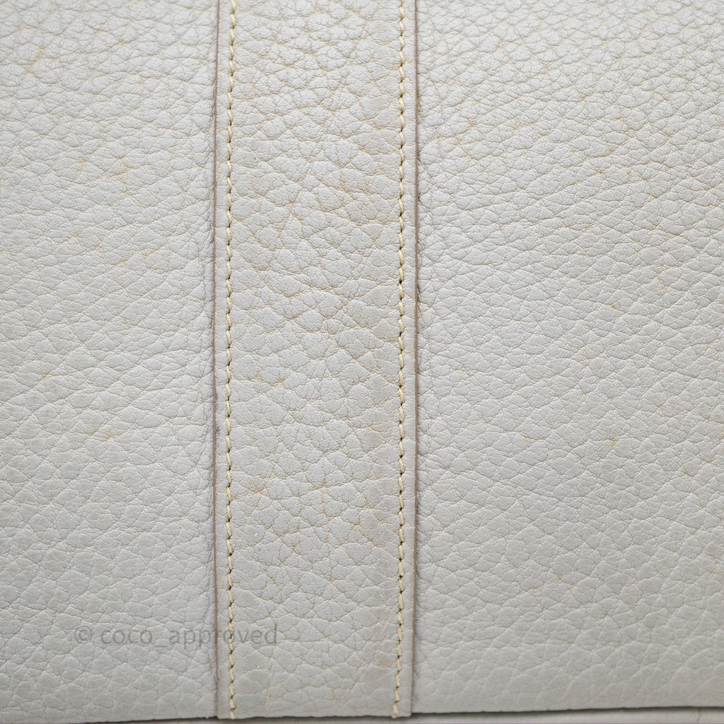 8/10 pre-loved condition. Rubbing on corners and handle. Hairlines on hardware. Yellowing and darkening on surface. Pop stitch on interior rims.