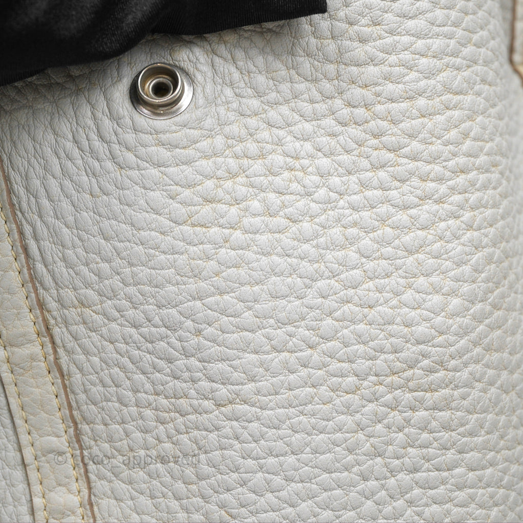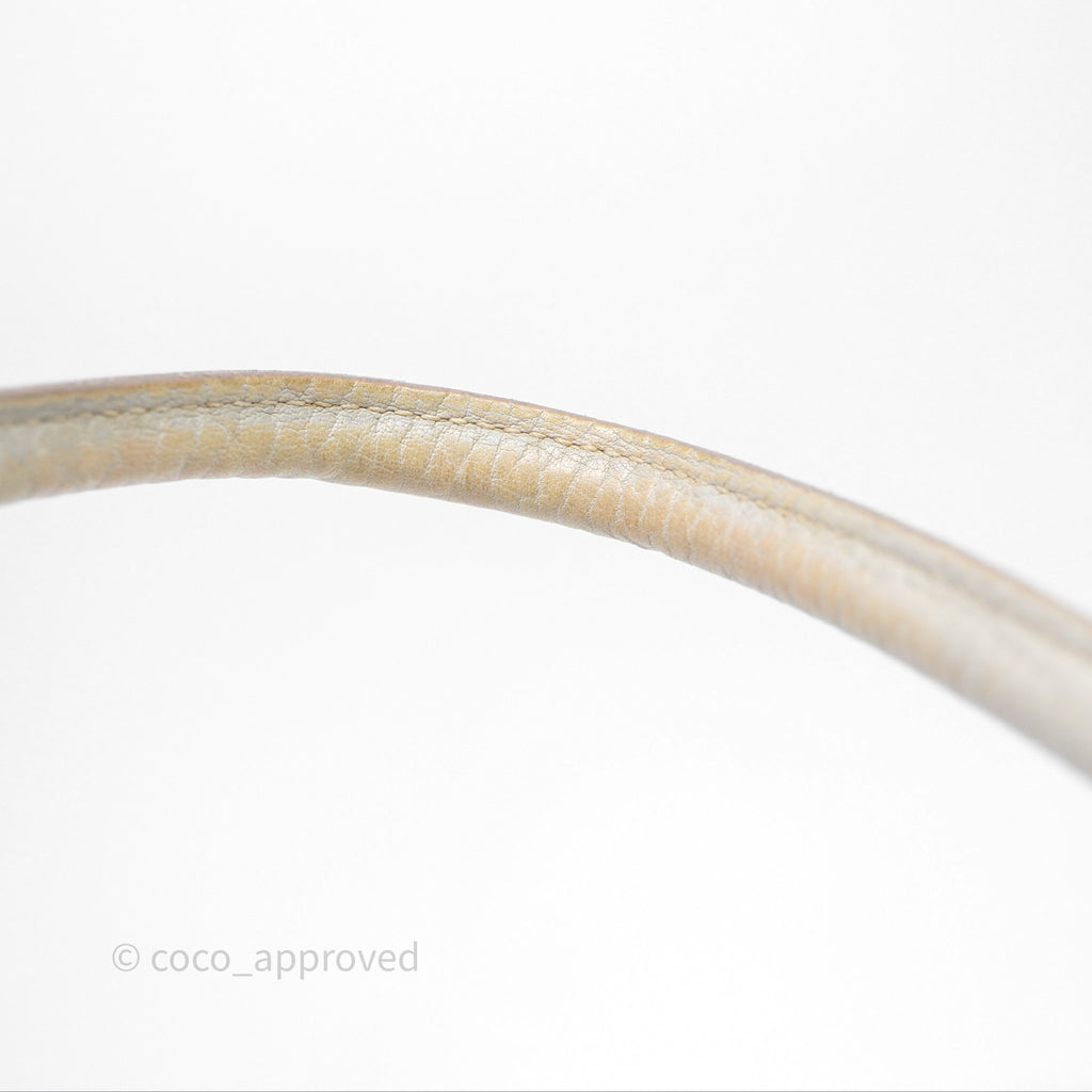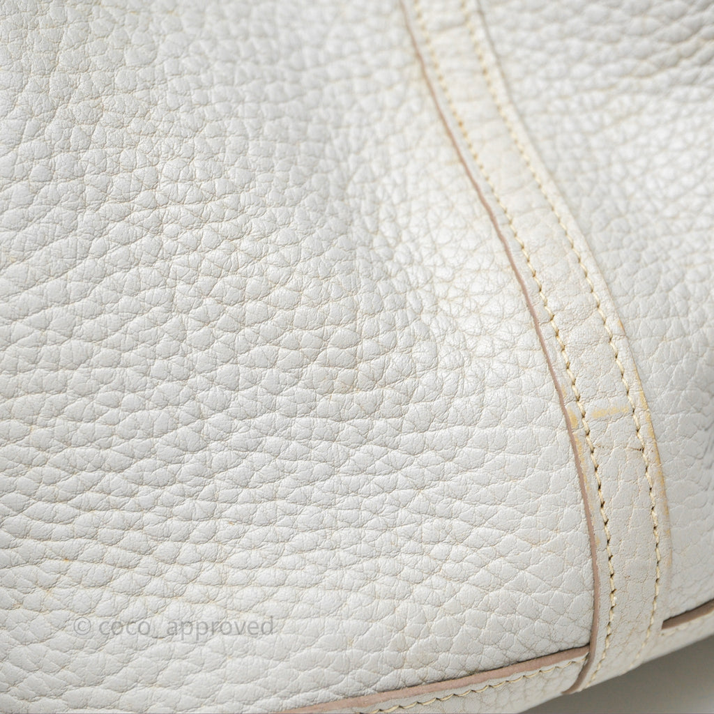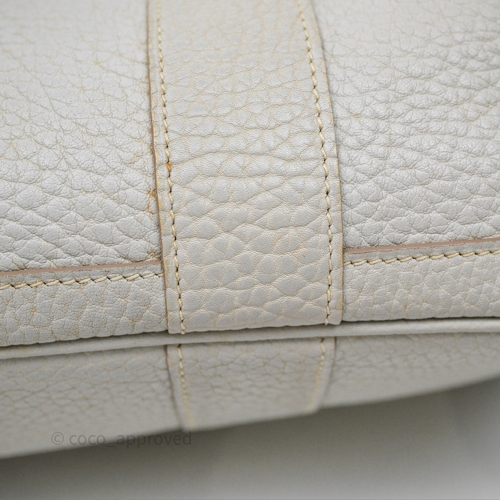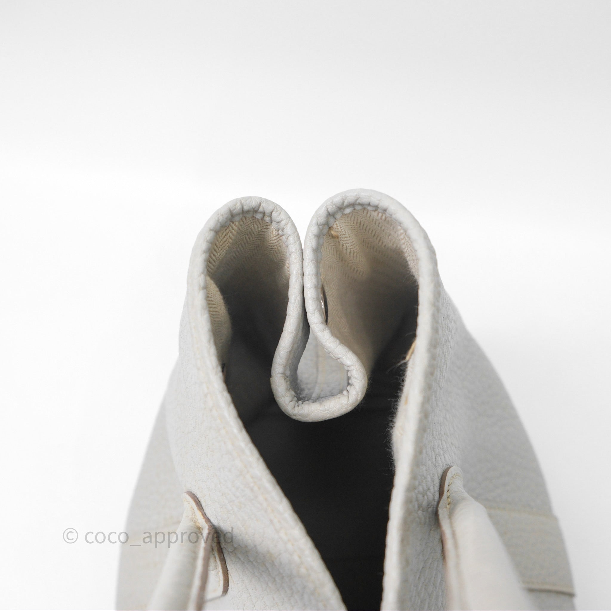 8/10 pre-loved condition. Rubbing on corners and handle. Hairlines on hardware. Yellowing and darkening on surface. Pop stitch on interior rims.