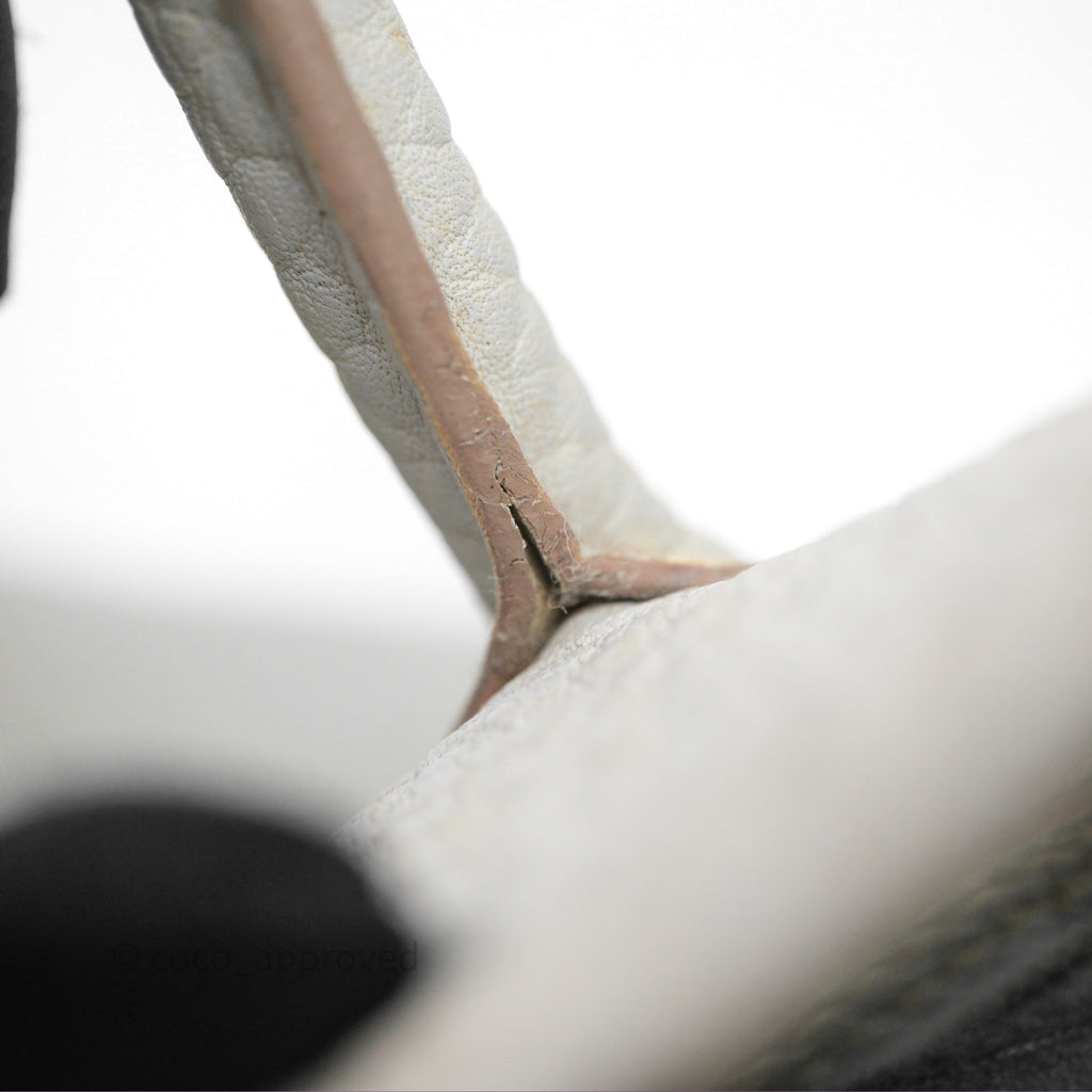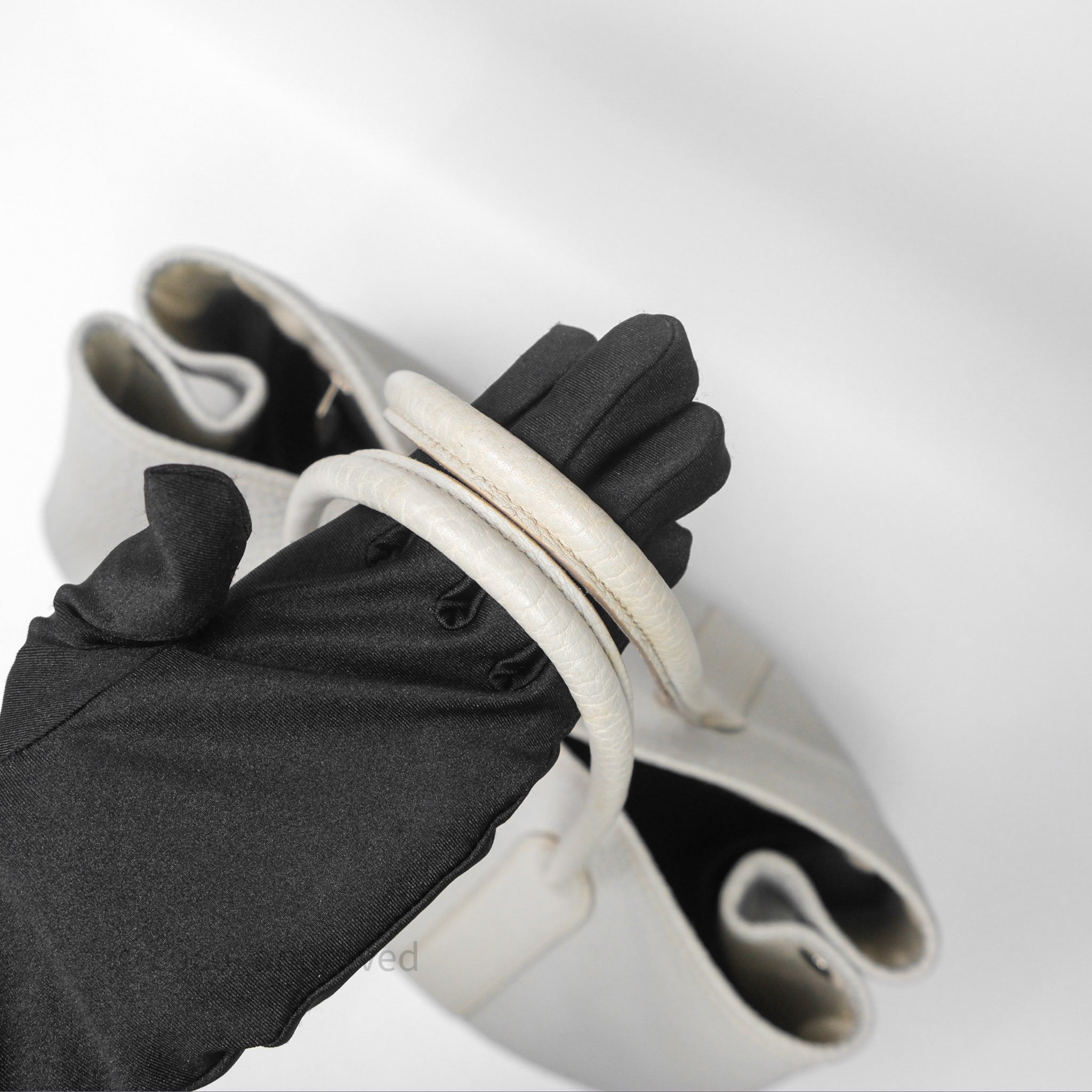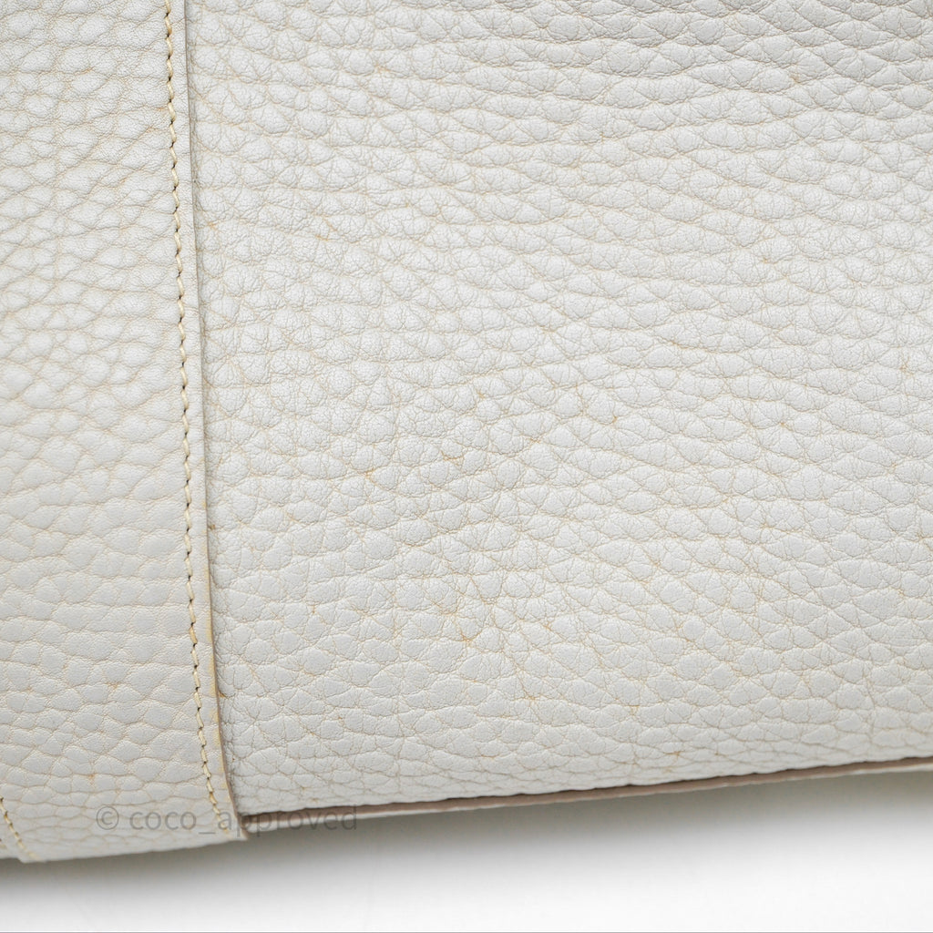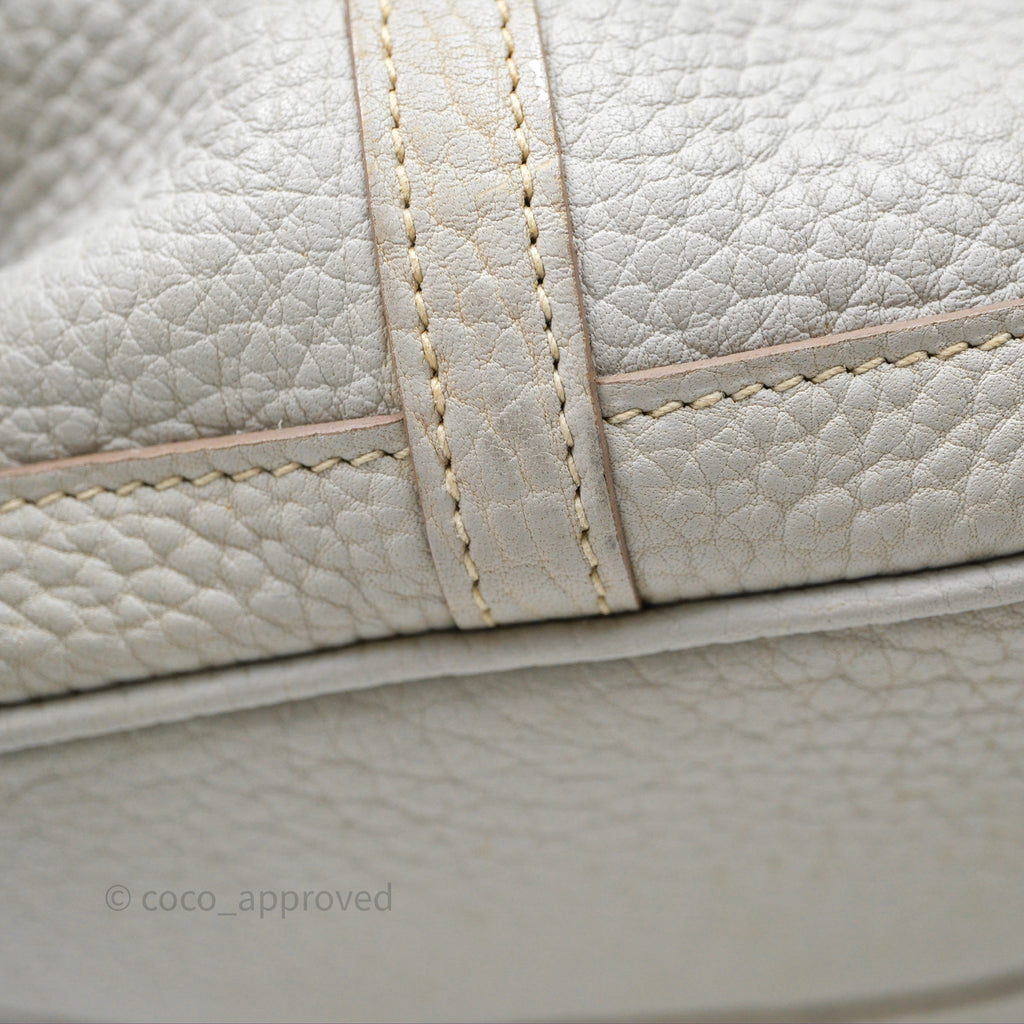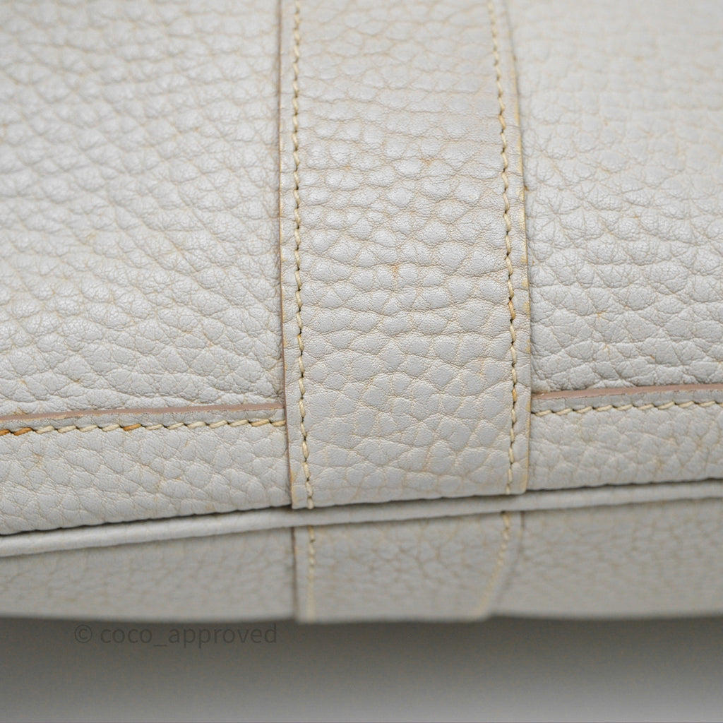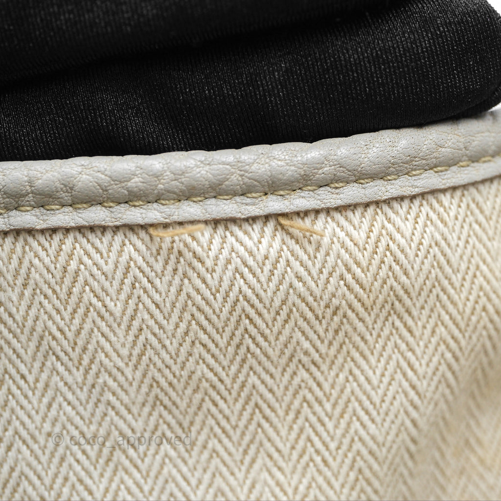 8/10 pre-loved condition. Rubbing on corners and handle. Hairlines on hardware. Yellowing and darkening on surface. Pop stitch on interior rims.