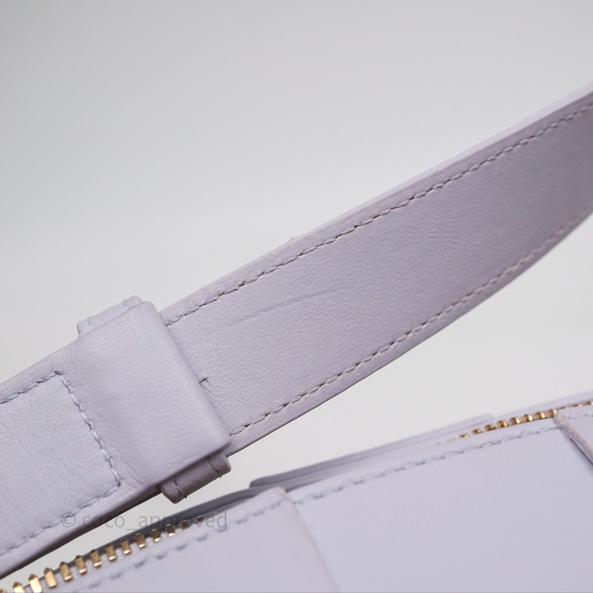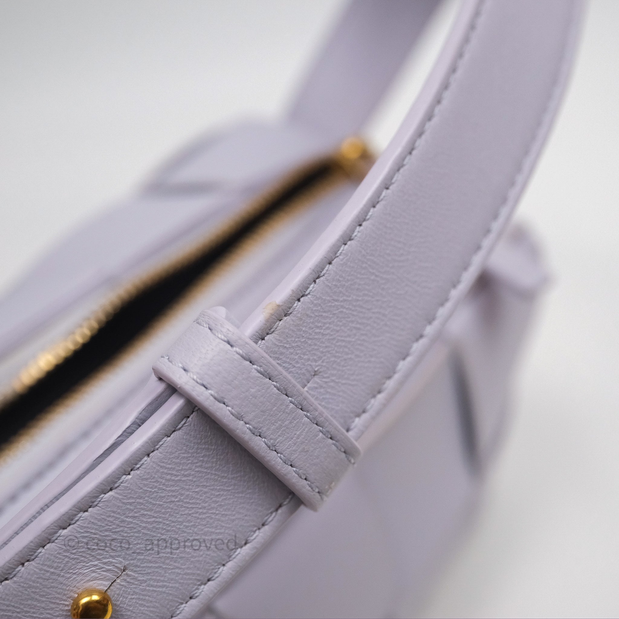 9.3/10 excellent condition. Minor hairline on hardware. Rubbing on rims and strap. Tiny scratches and glue stain on straps. Dent on bottom and in interior.