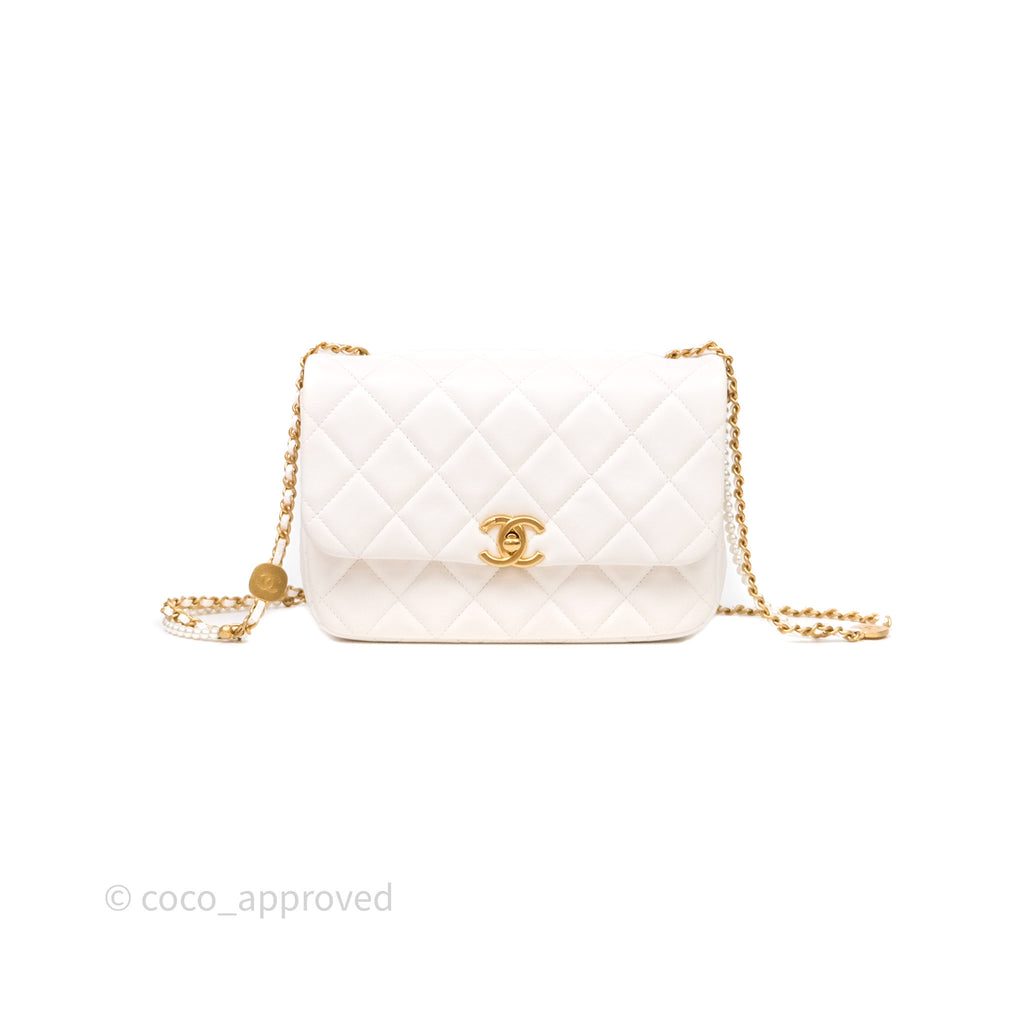 Chanel Flap Bag with Pearl Chain Ivory White Aged Gold Hardware 25P