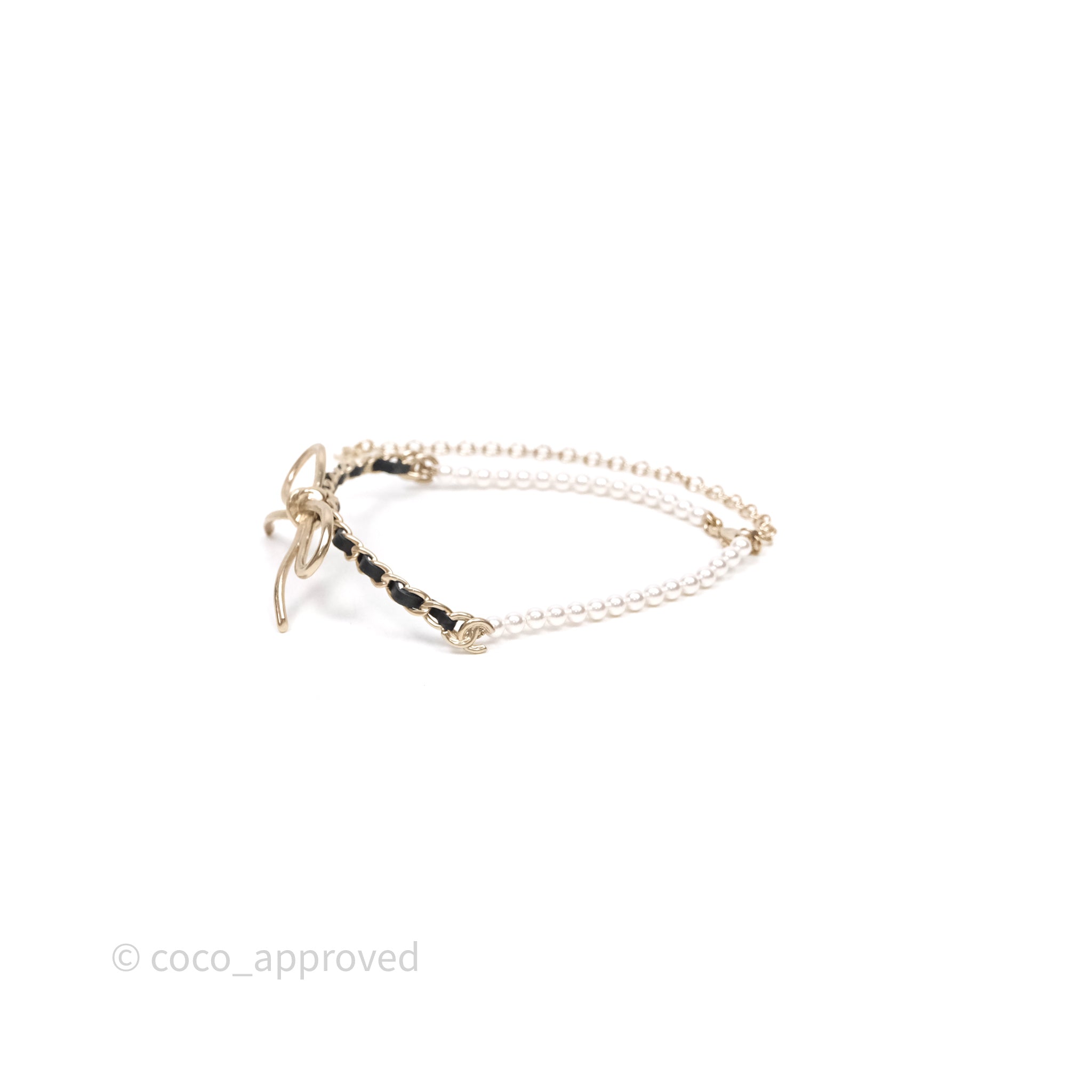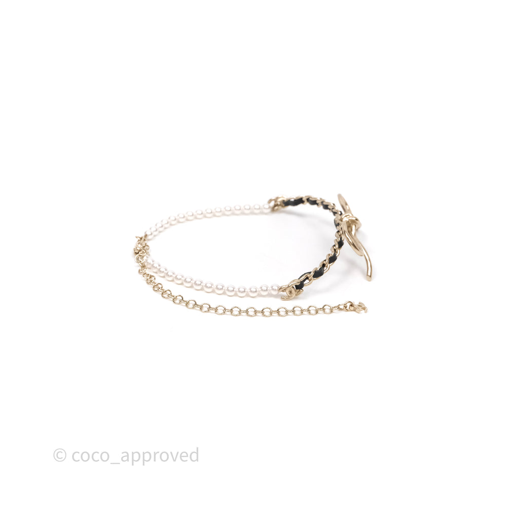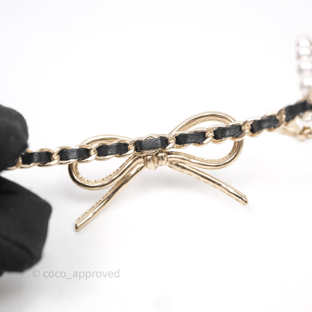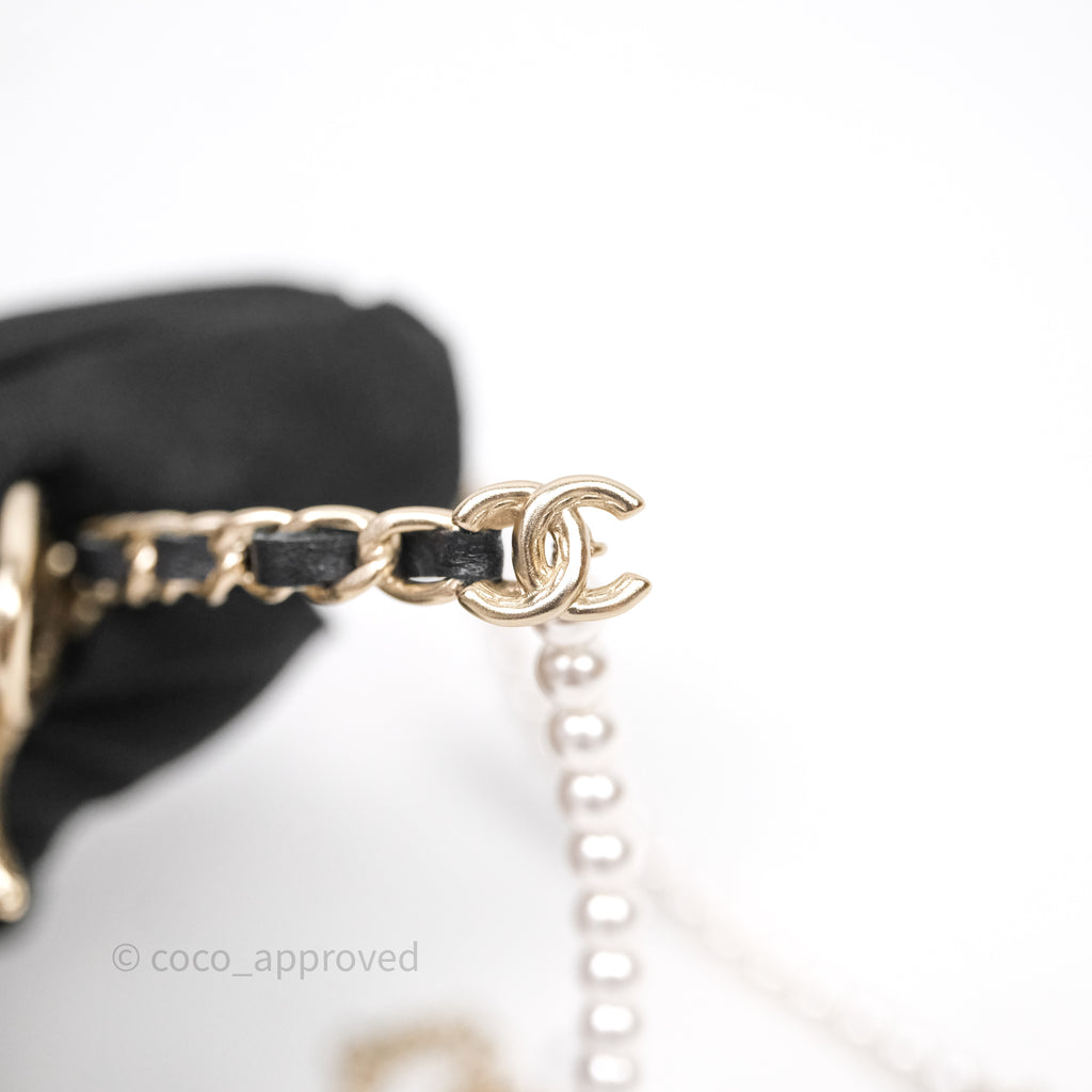 Chanel Ribbon Black Leather Pearl Chain Choker Gold Tone 22S