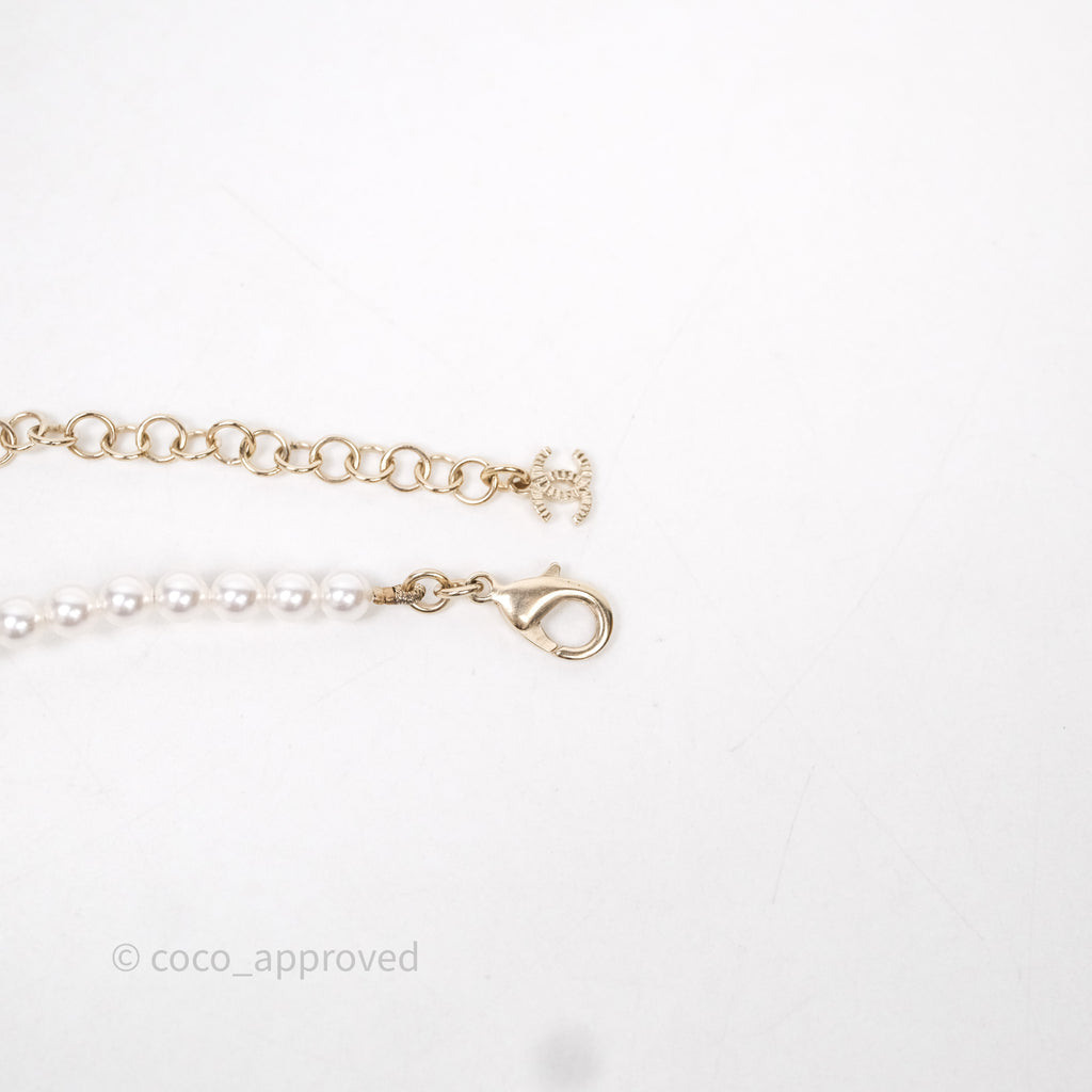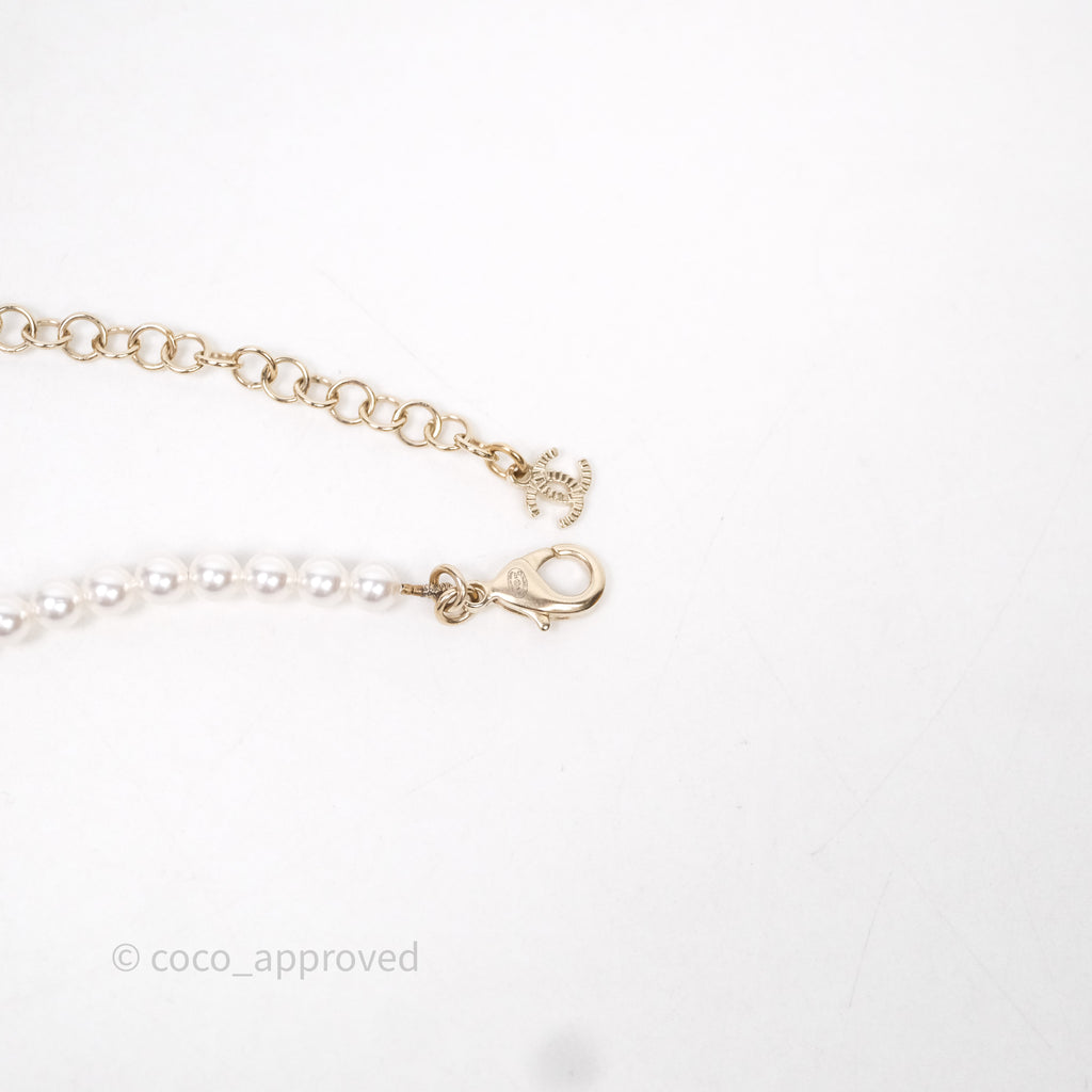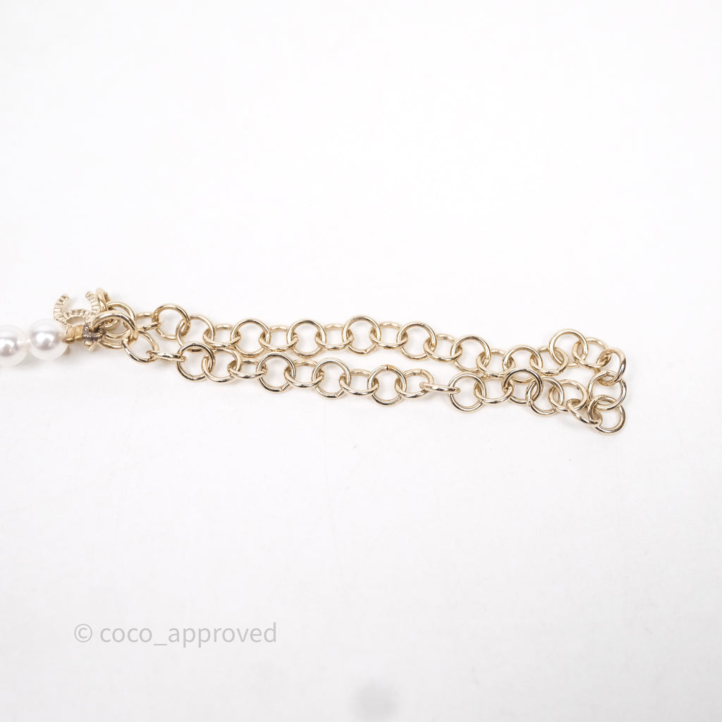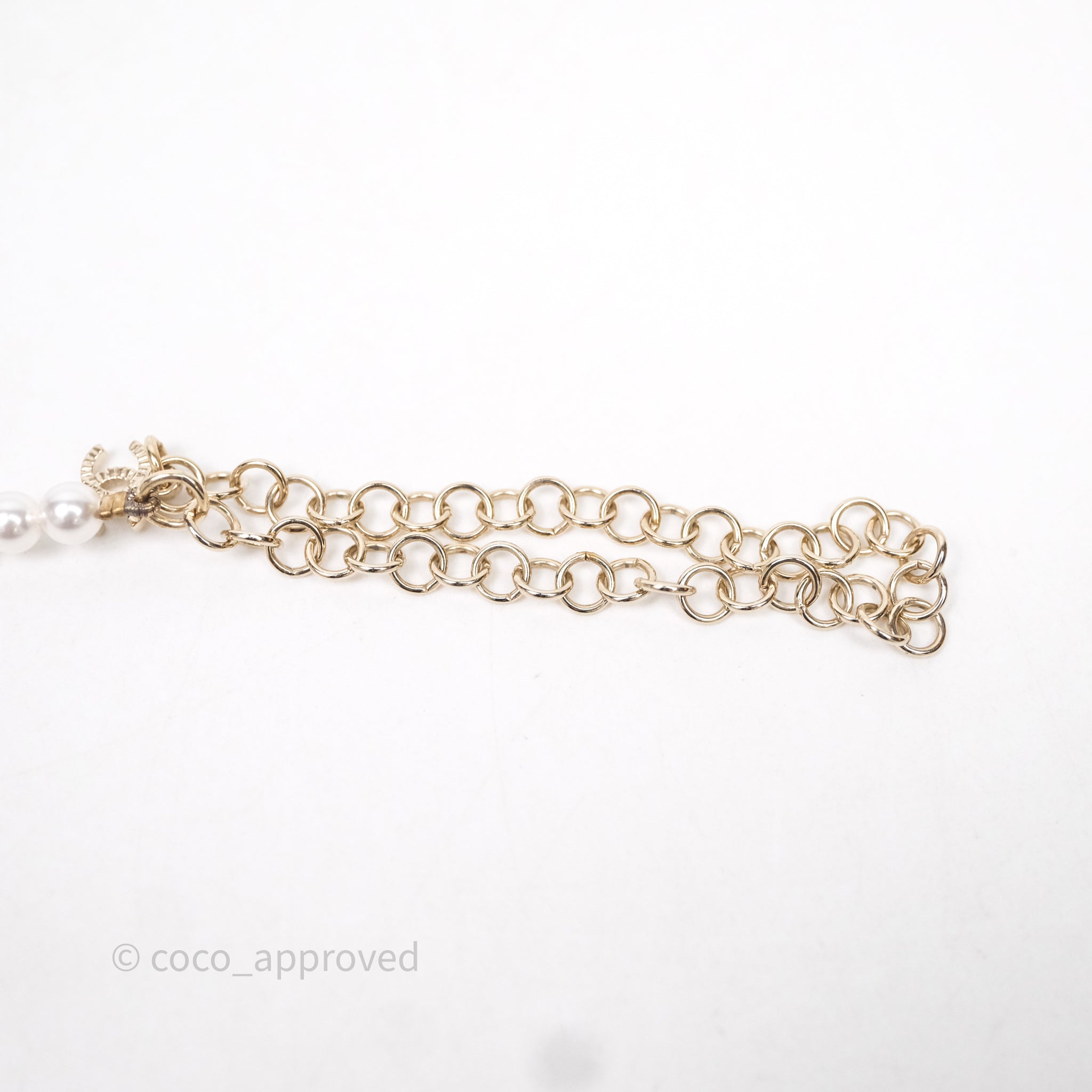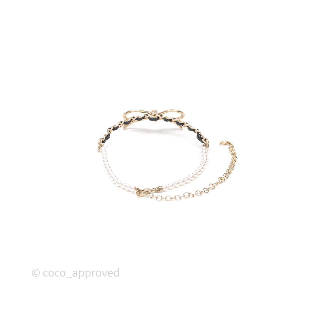 Chanel Ribbon Black Leather Pearl Chain Choker Gold Tone 22S