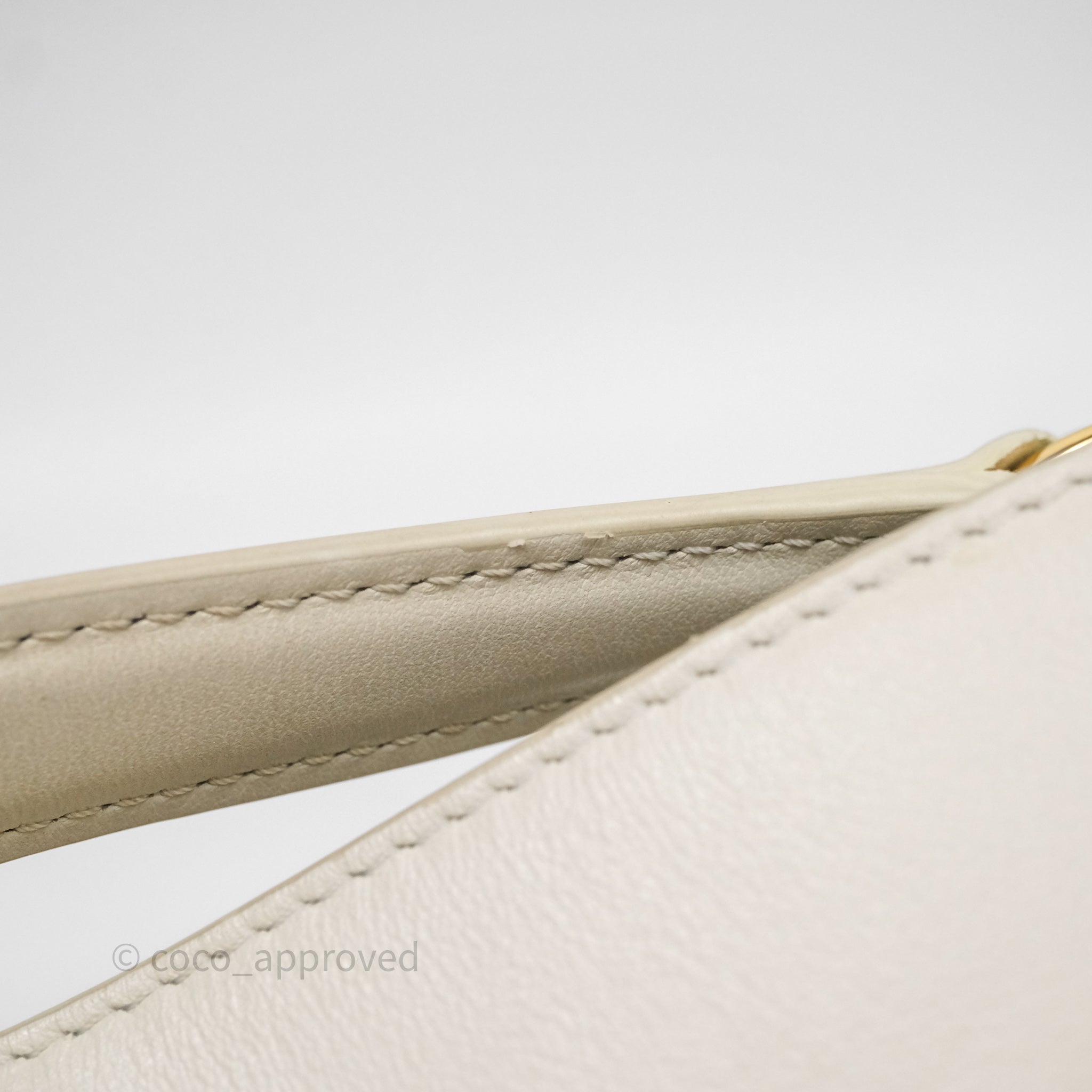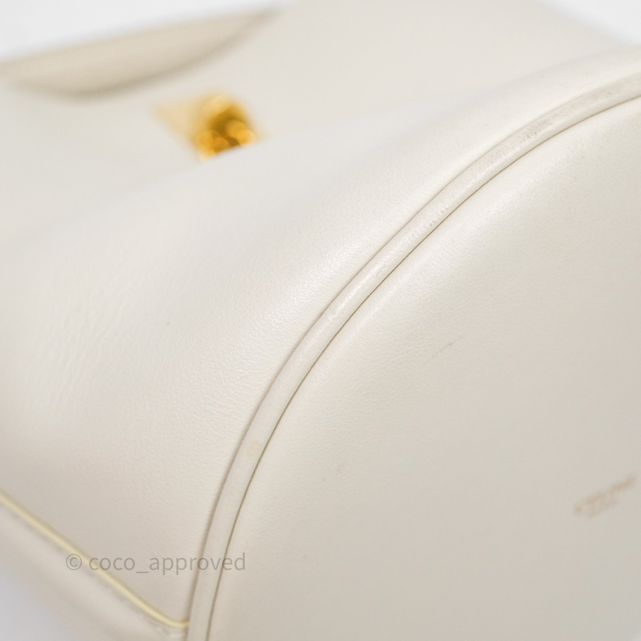 8.8/10 very good condition. Rubbing on bottom rims and strap. Marks and minor darkening on bottom, rims, handle, strap and interior. Scratches on hardware and bottom