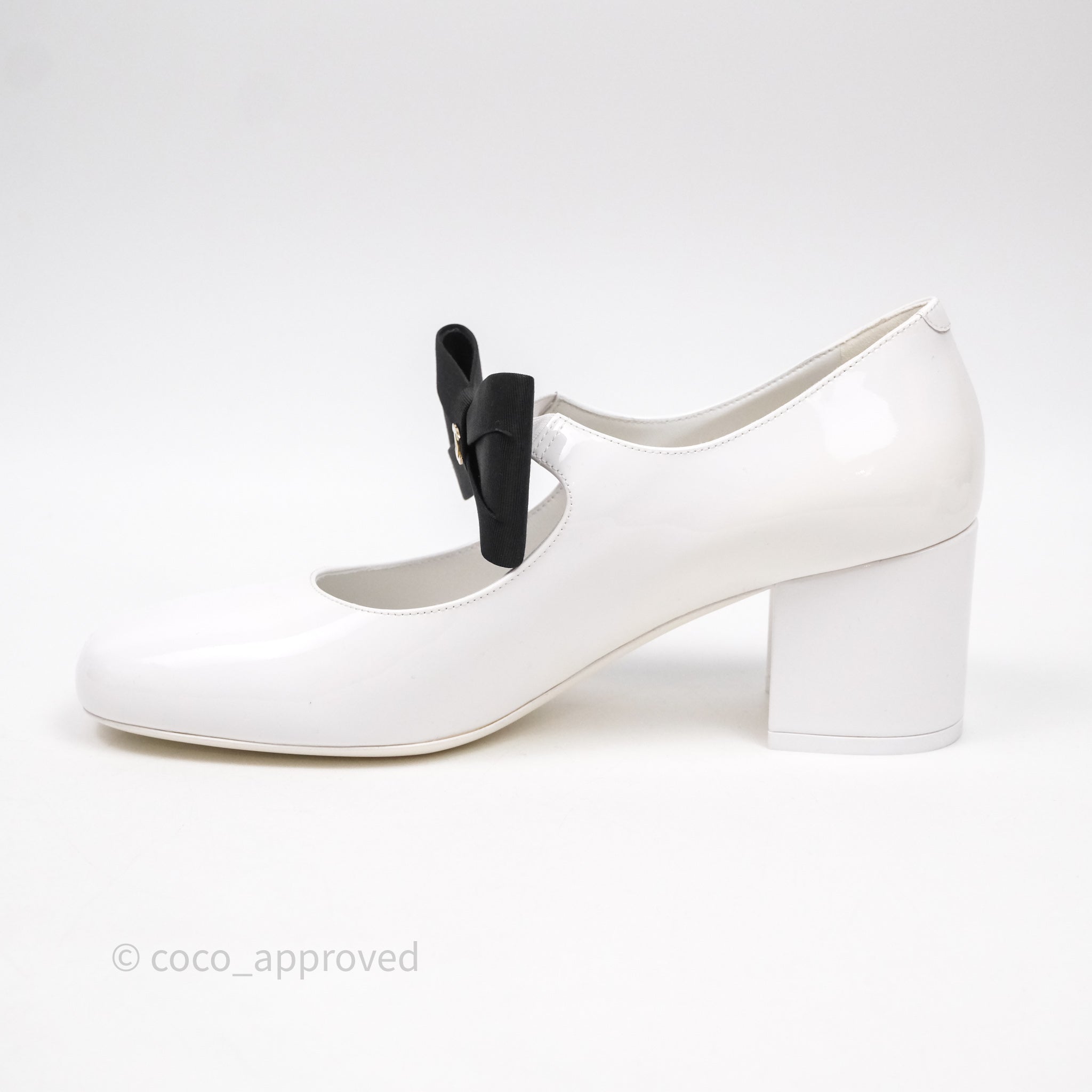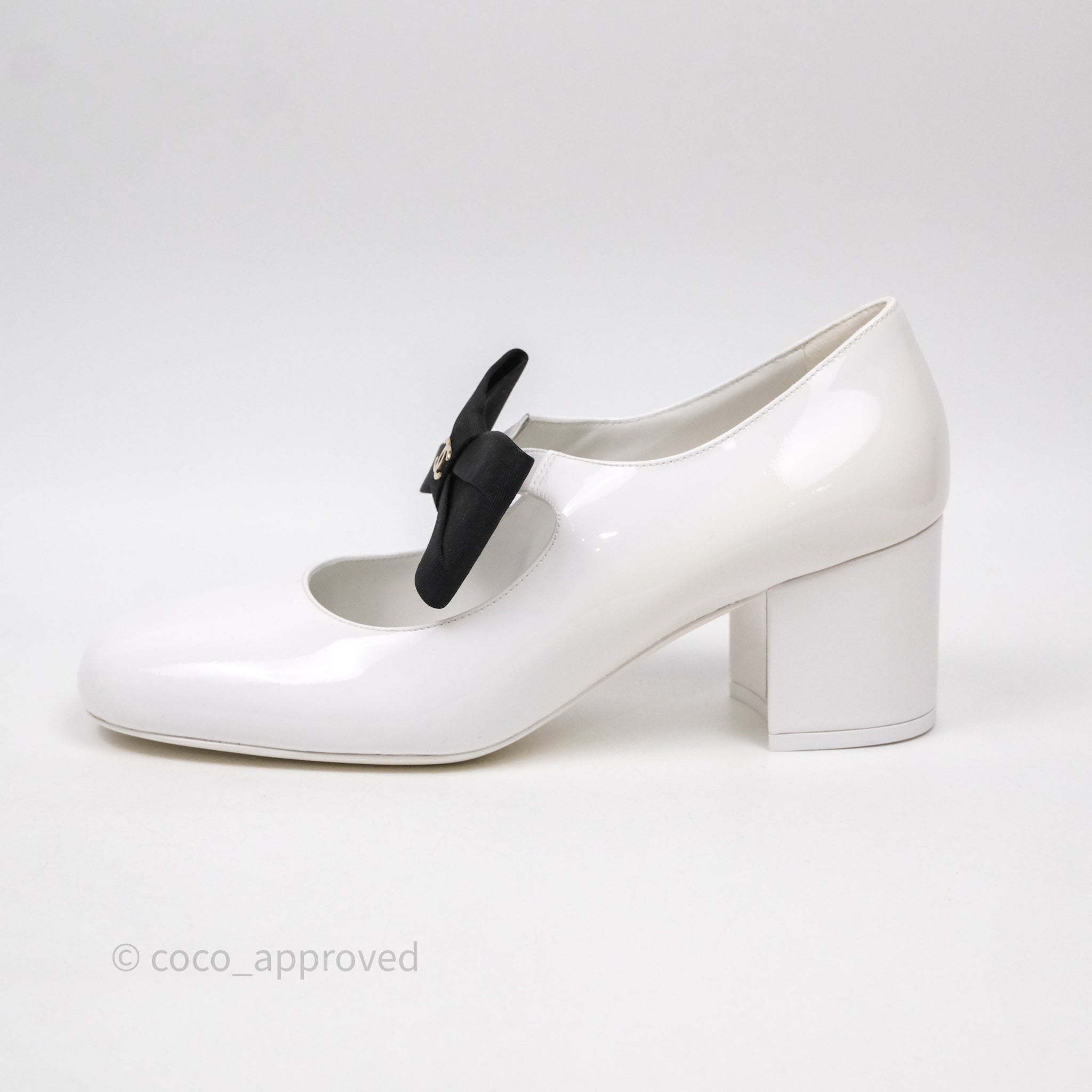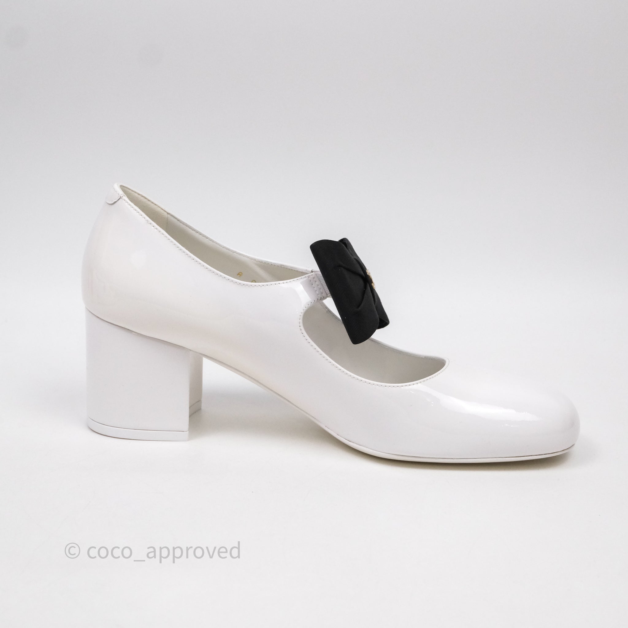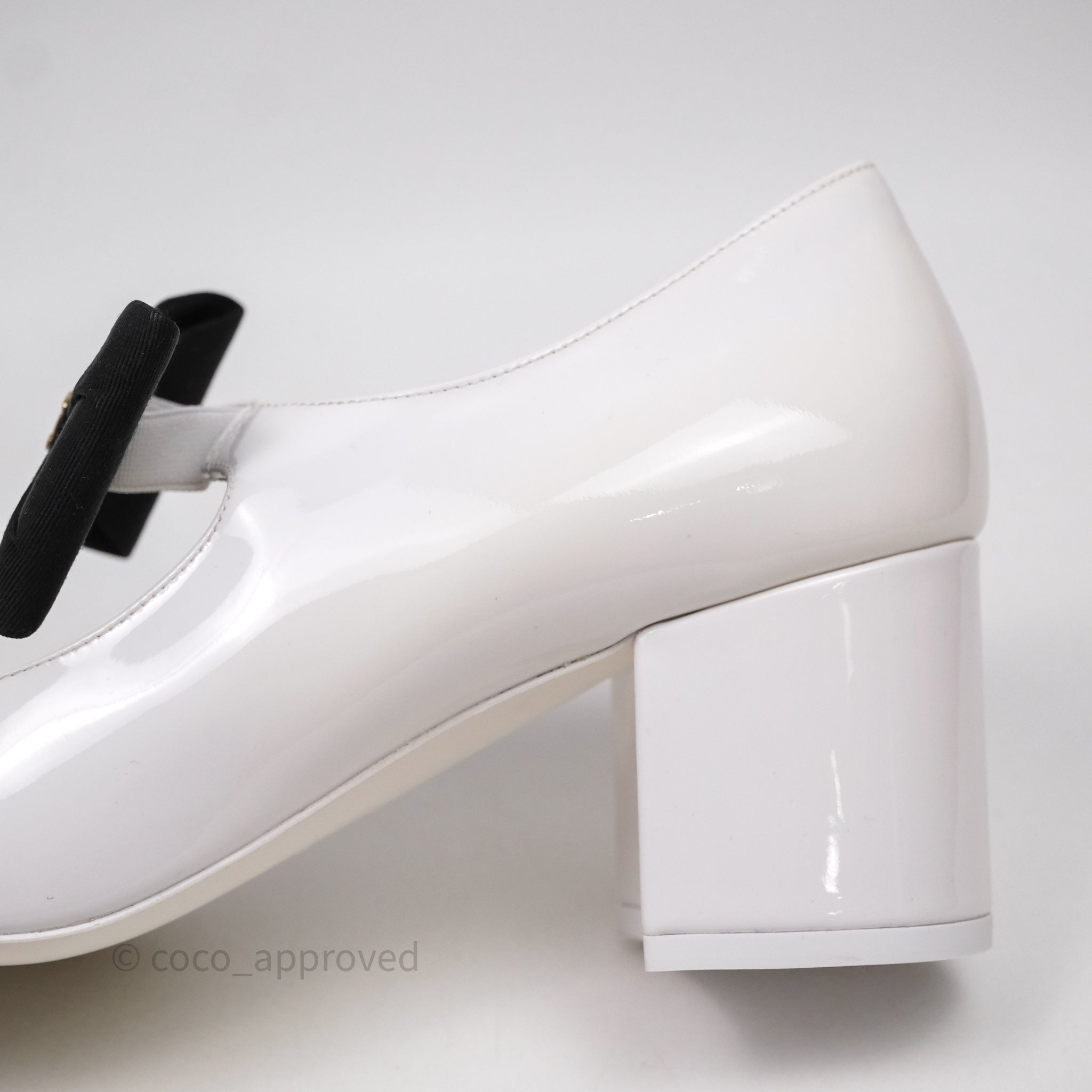 Chanel CC Ribbon Mary Jane Block Heels White Patent Size 39