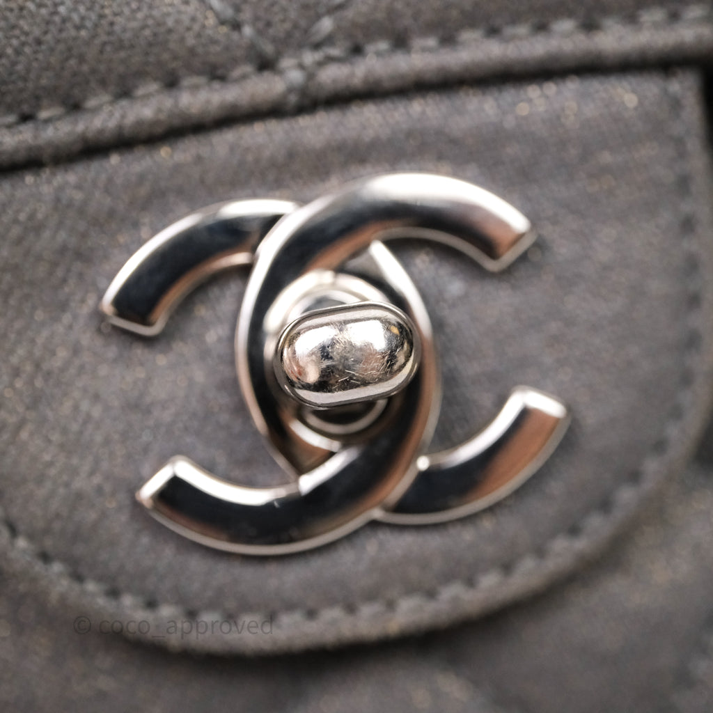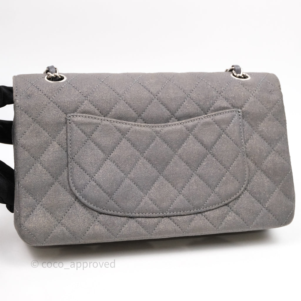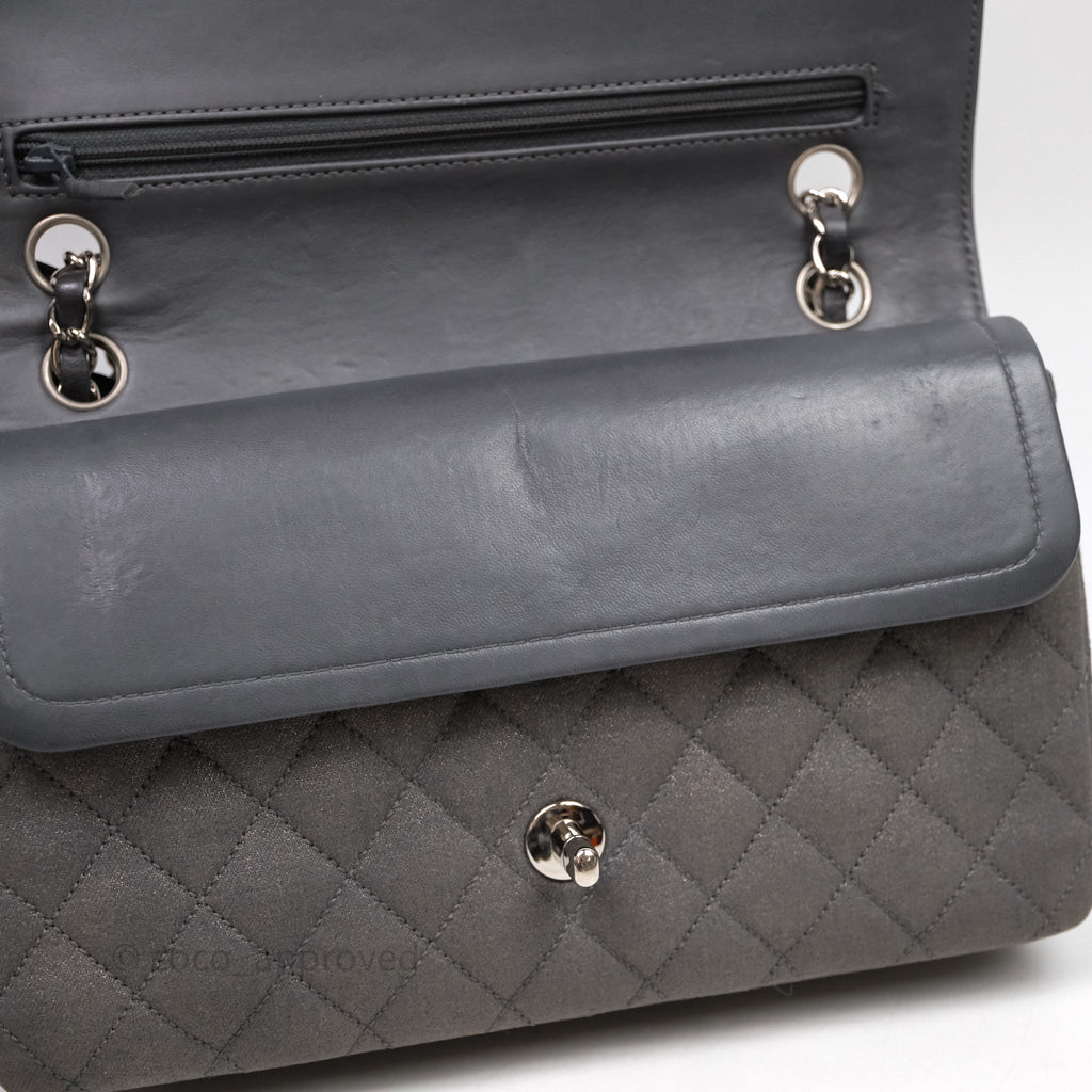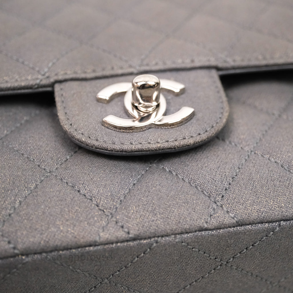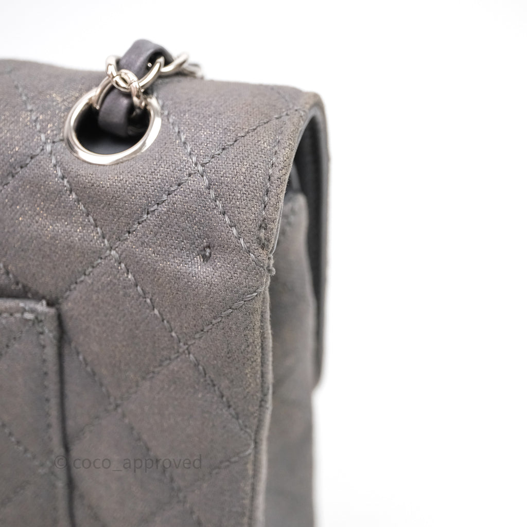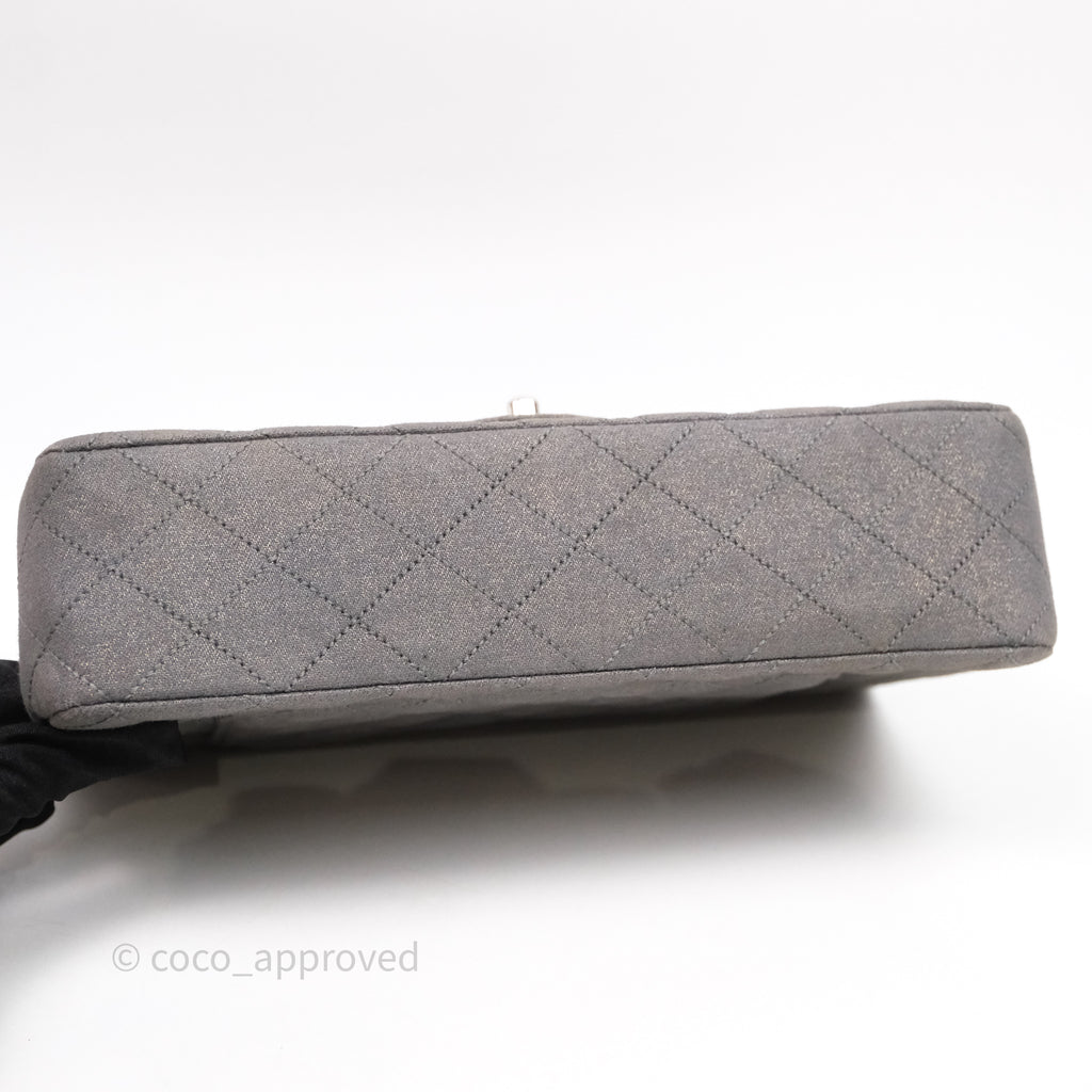 Chanel Classic M/L Medium Flap Quilted Iridescent Metallic Grey Canvas Silver Hardware