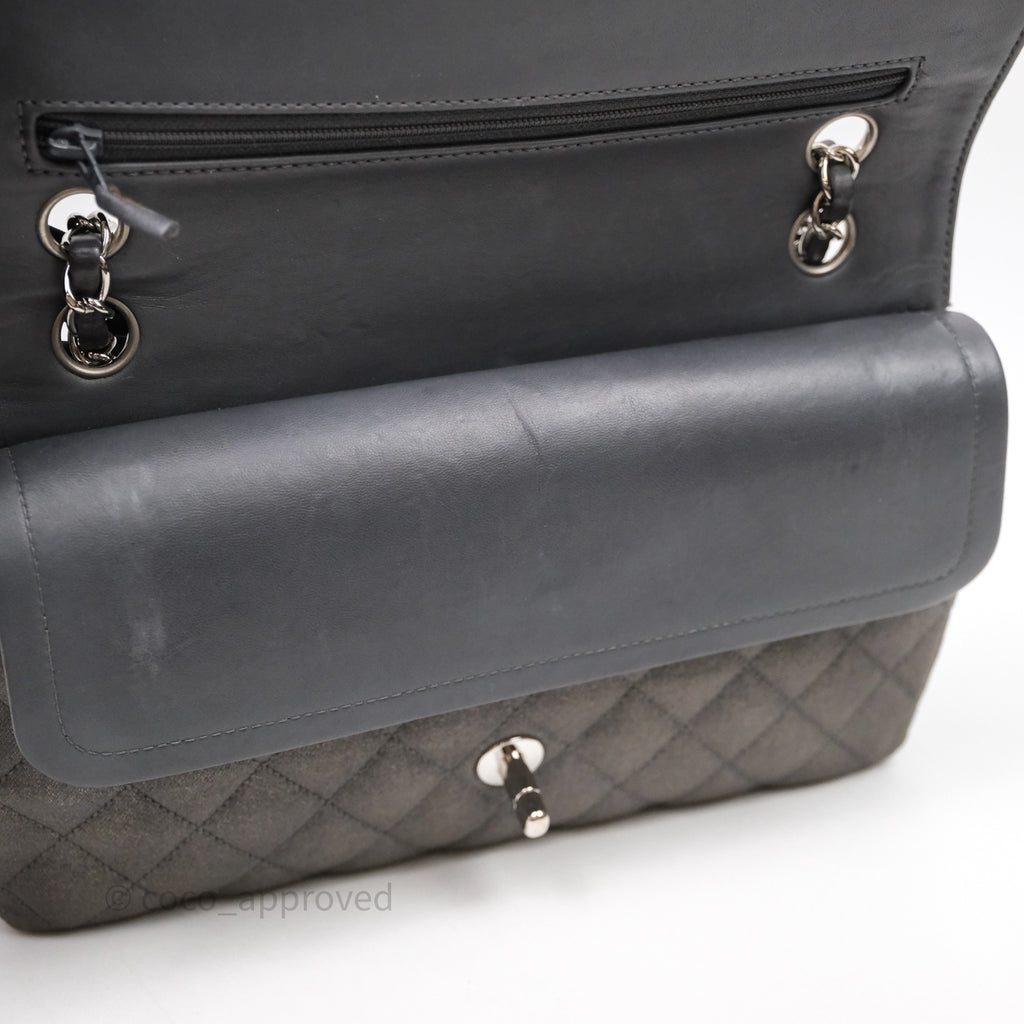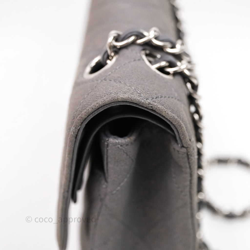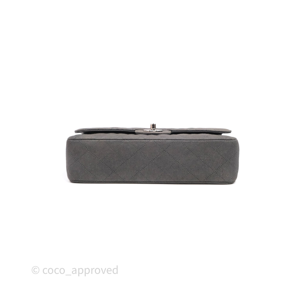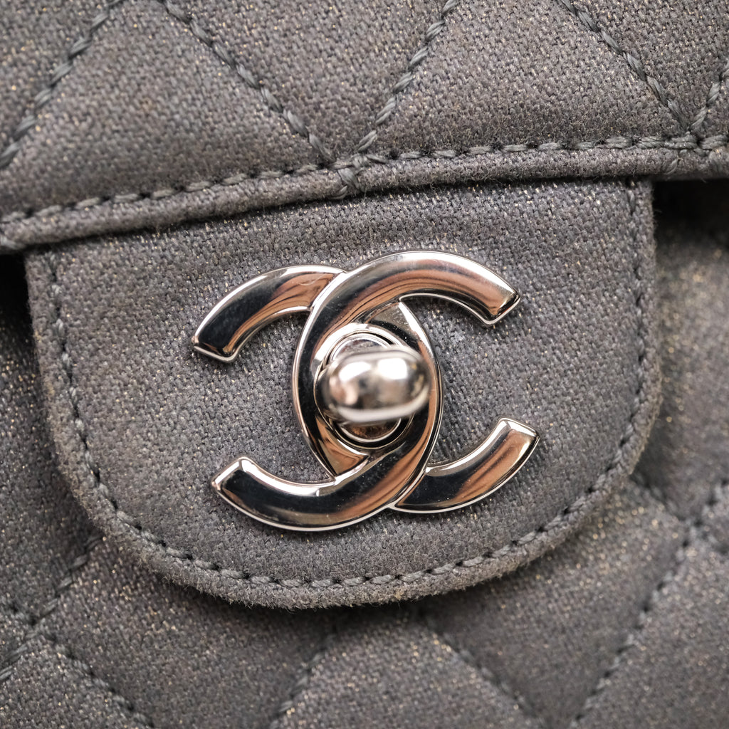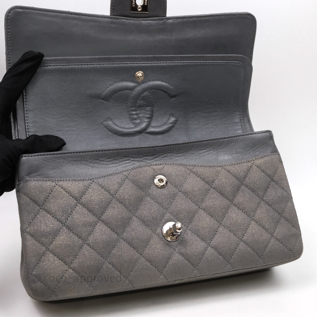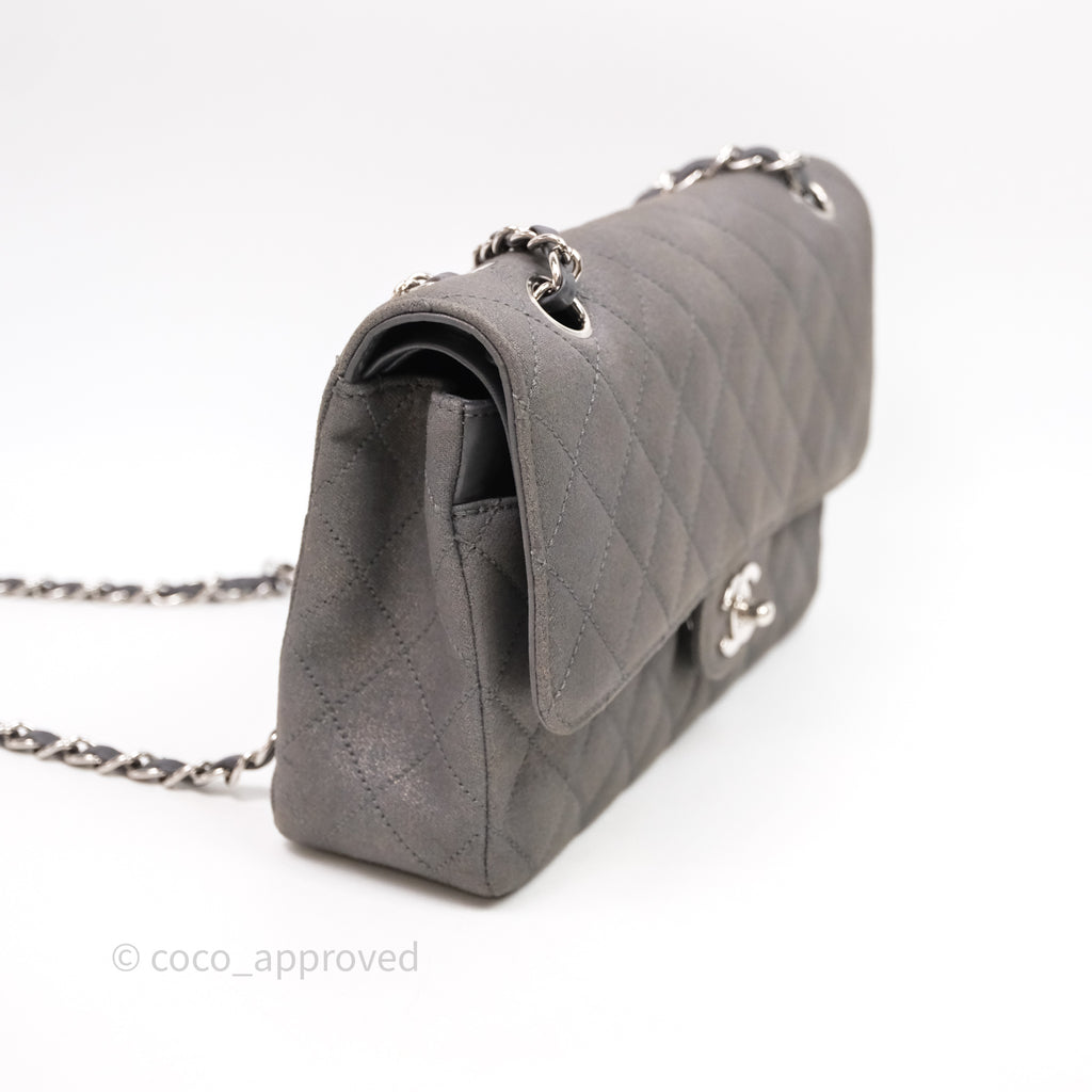 Chanel Classic M/L Medium Flap Quilted Iridescent Metallic Grey Canvas Silver Hardware