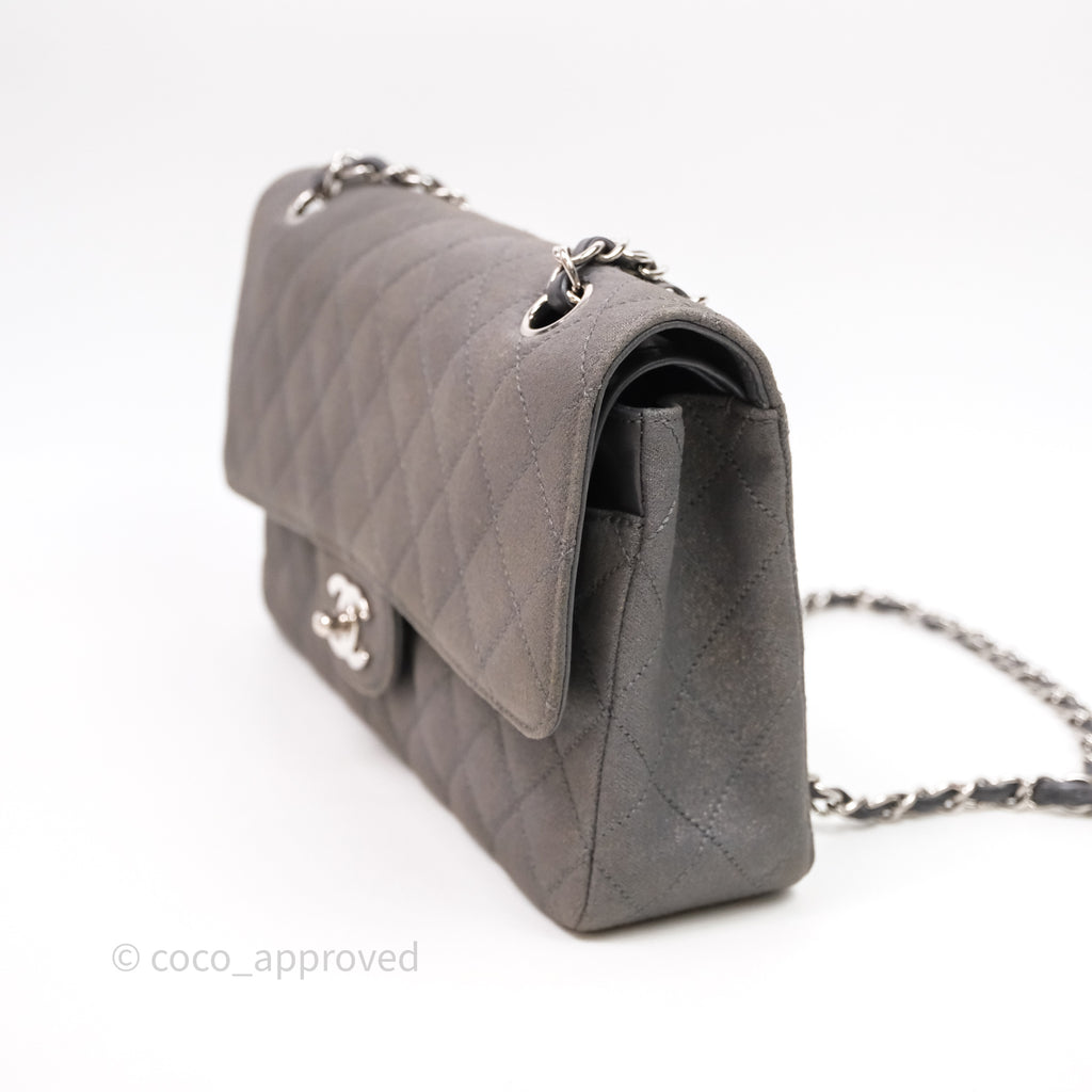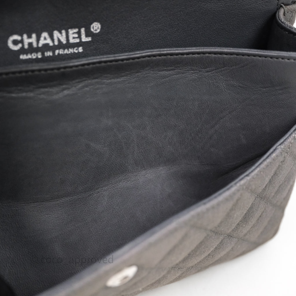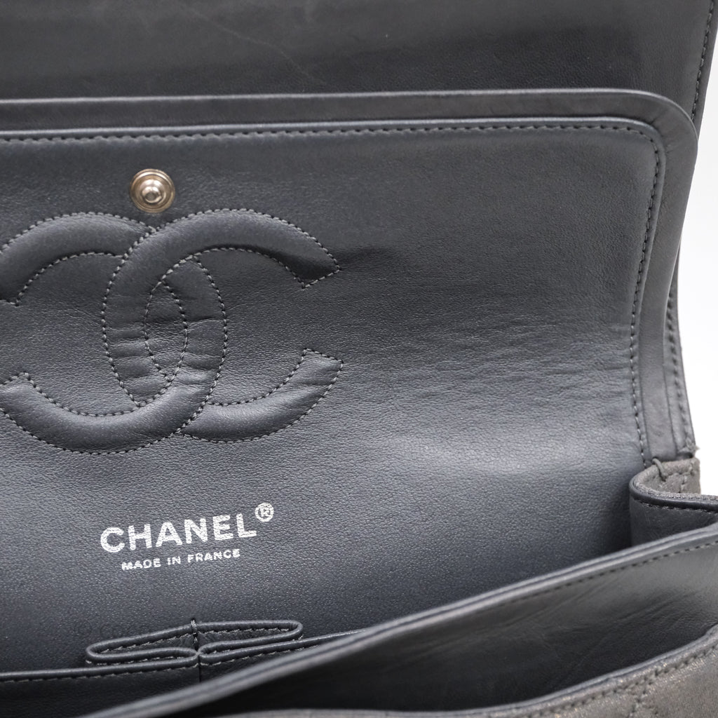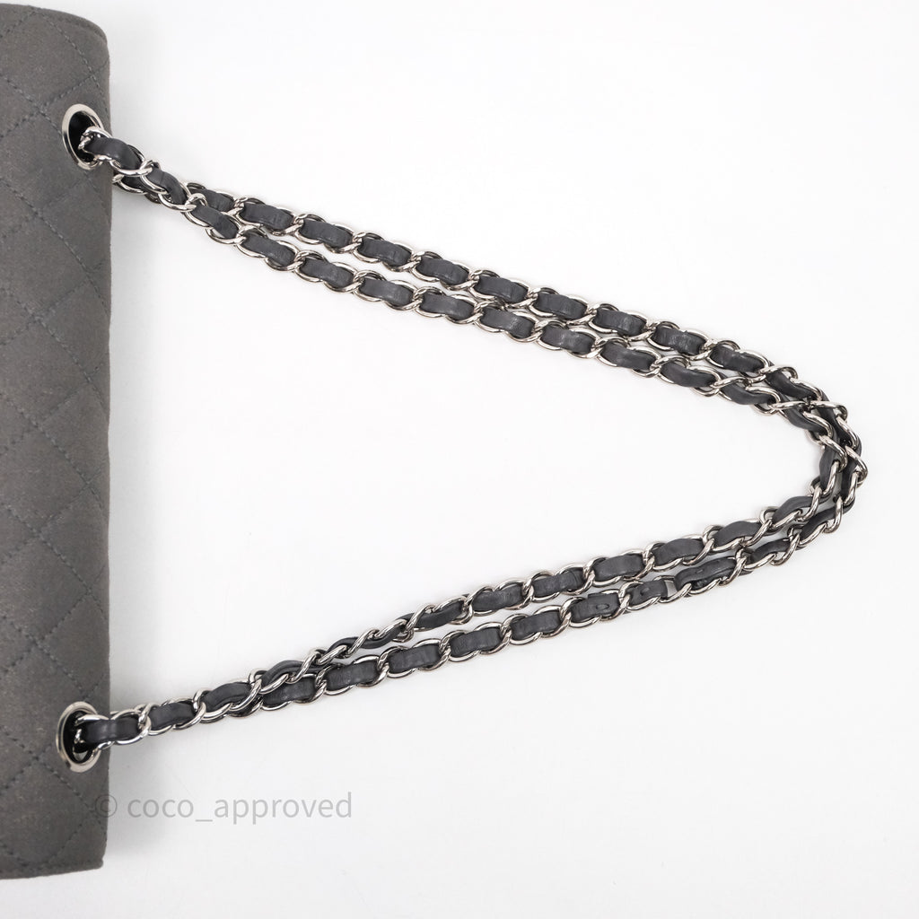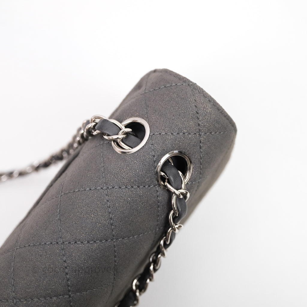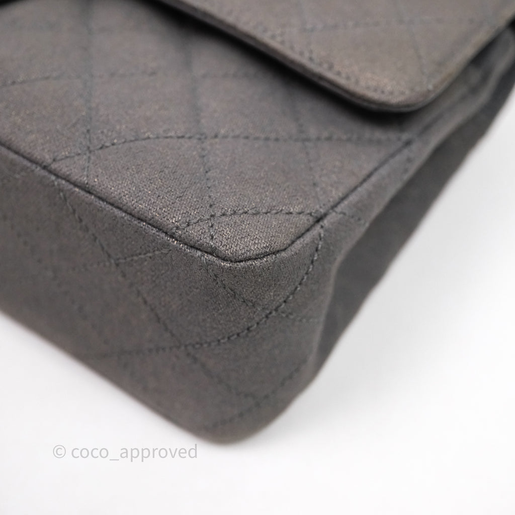 Chanel Classic M/L Medium Flap Quilted Iridescent Metallic Grey Canvas Silver Hardware