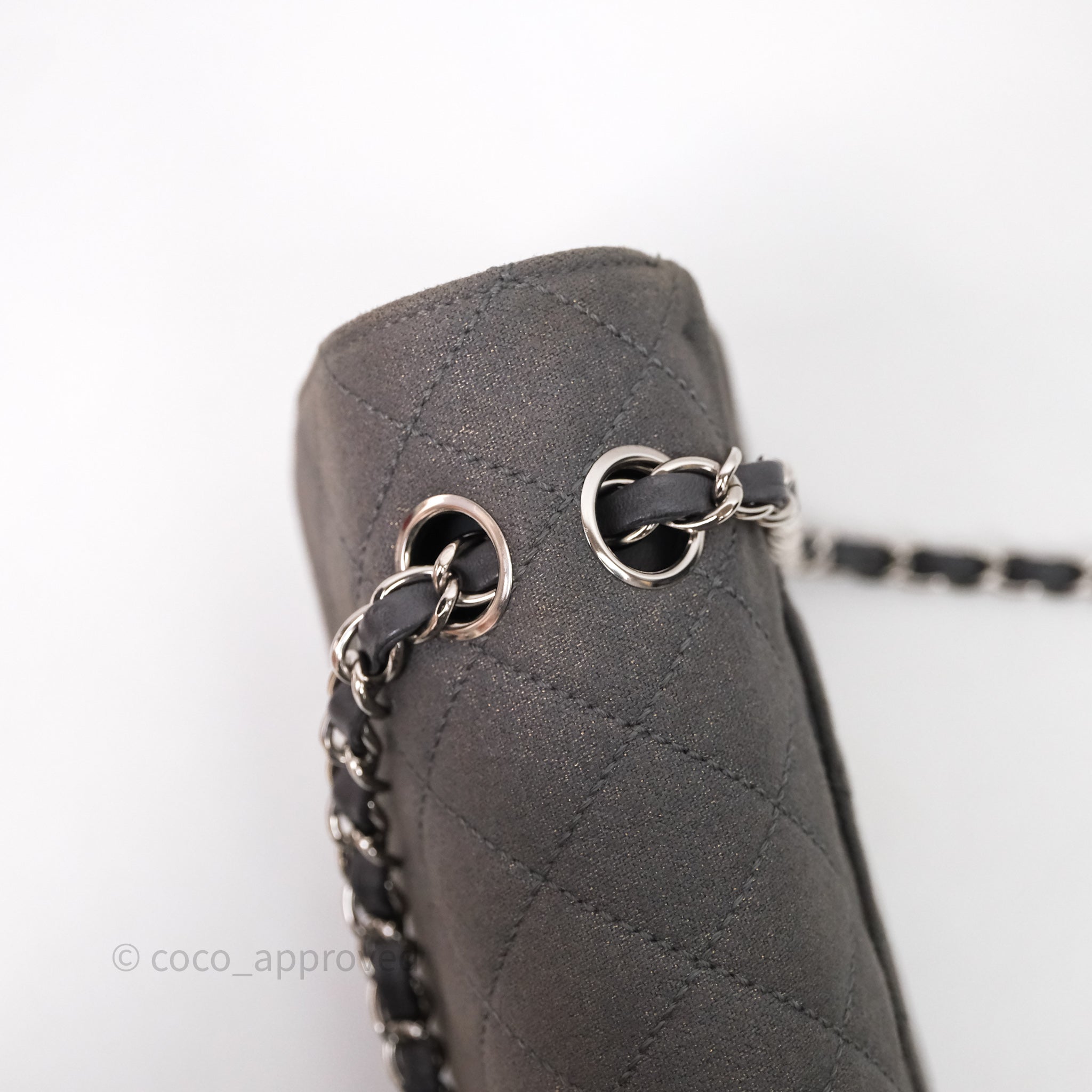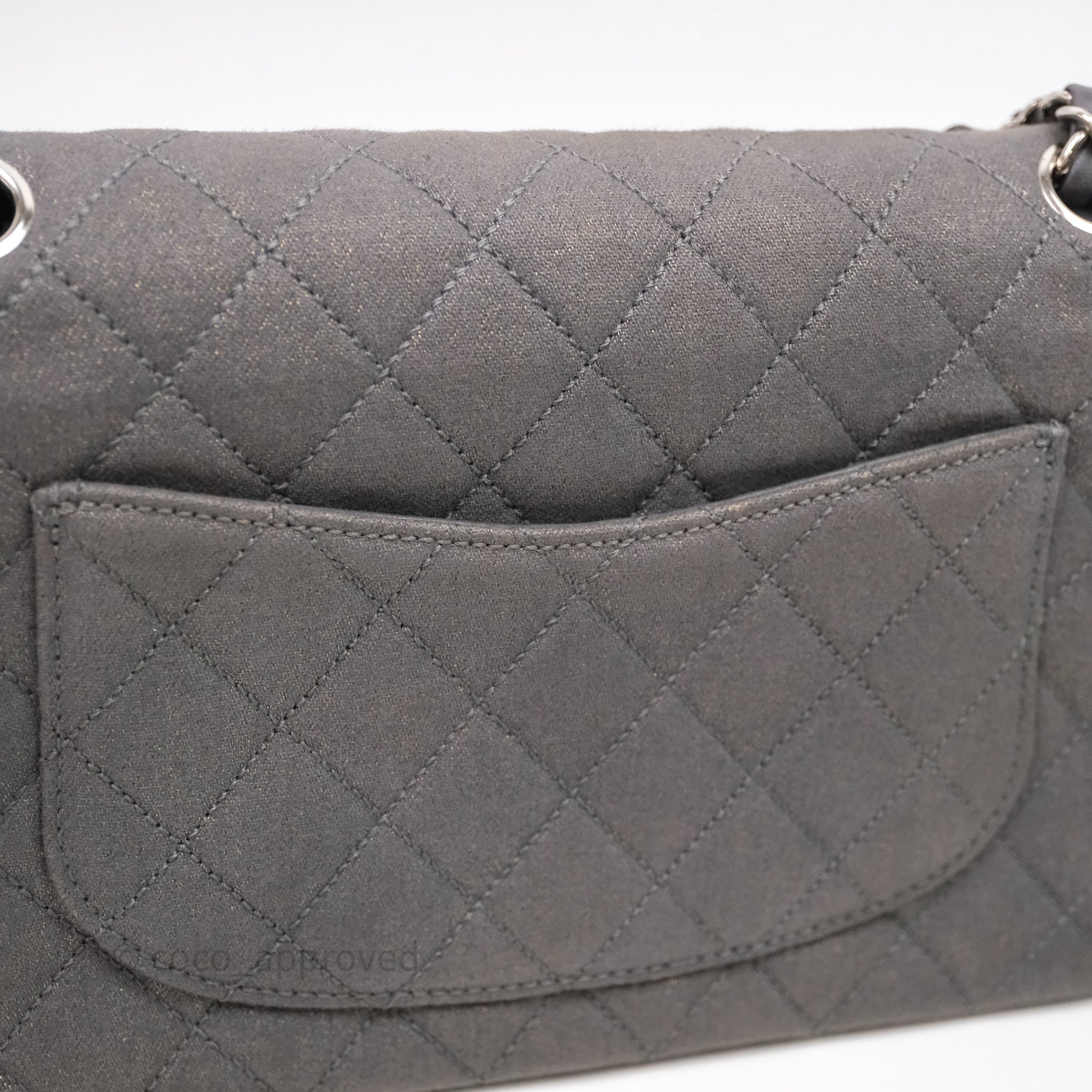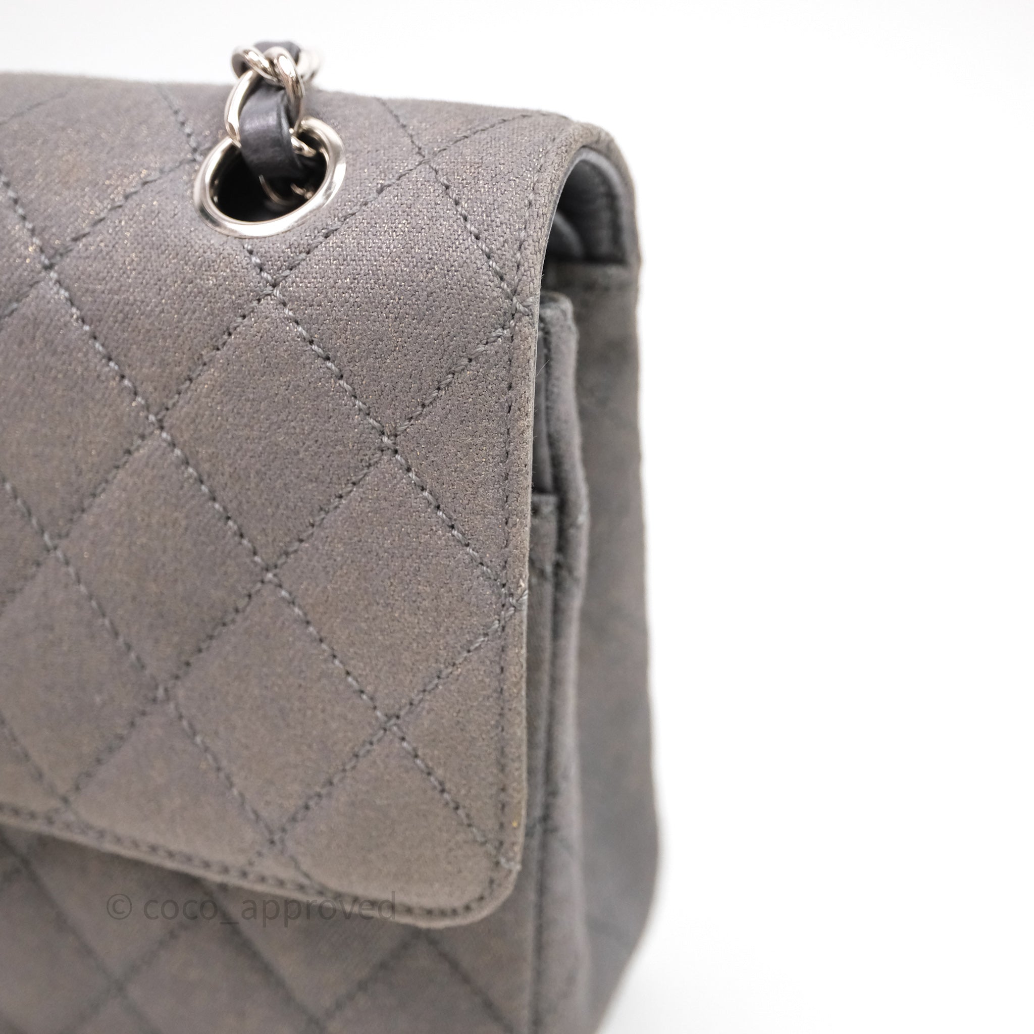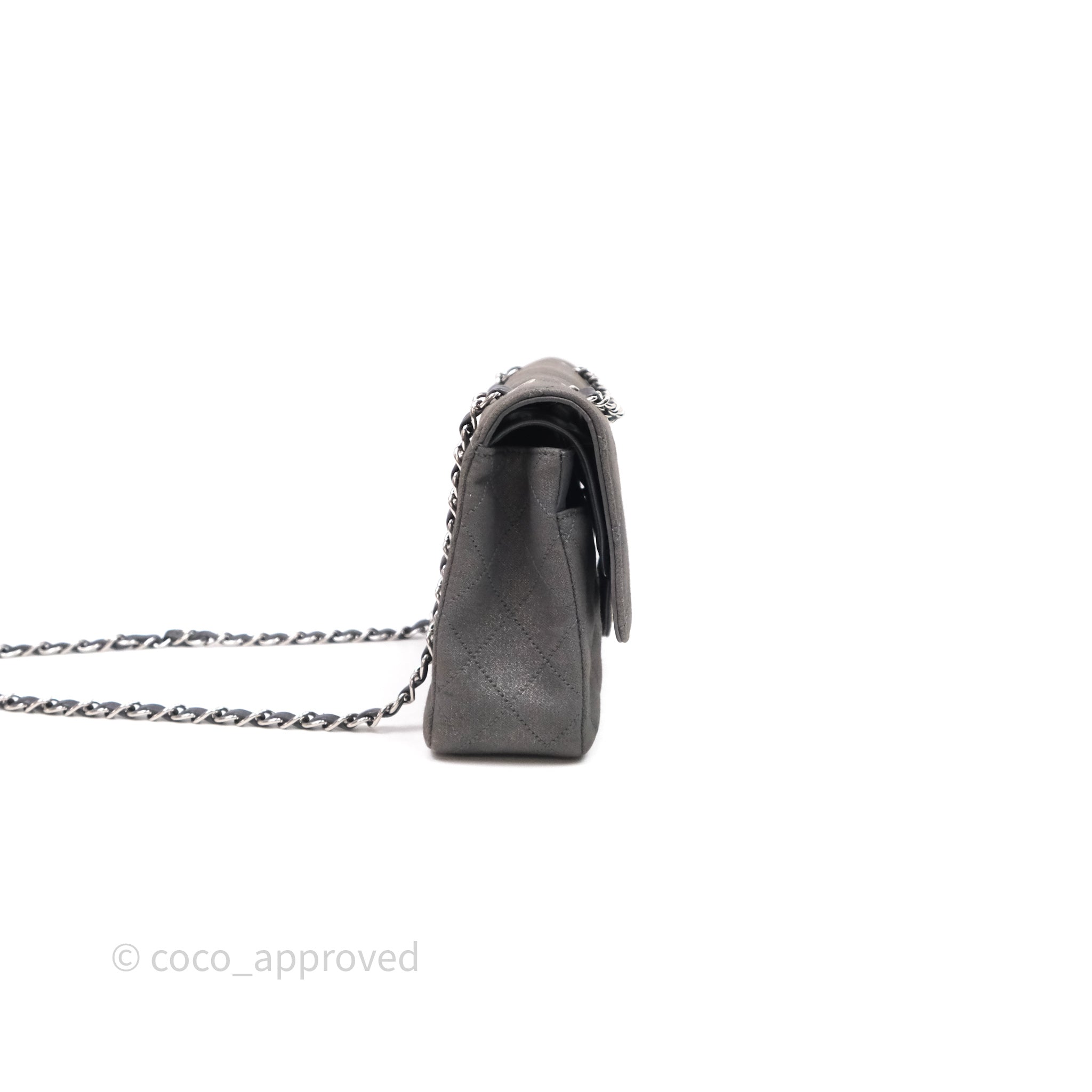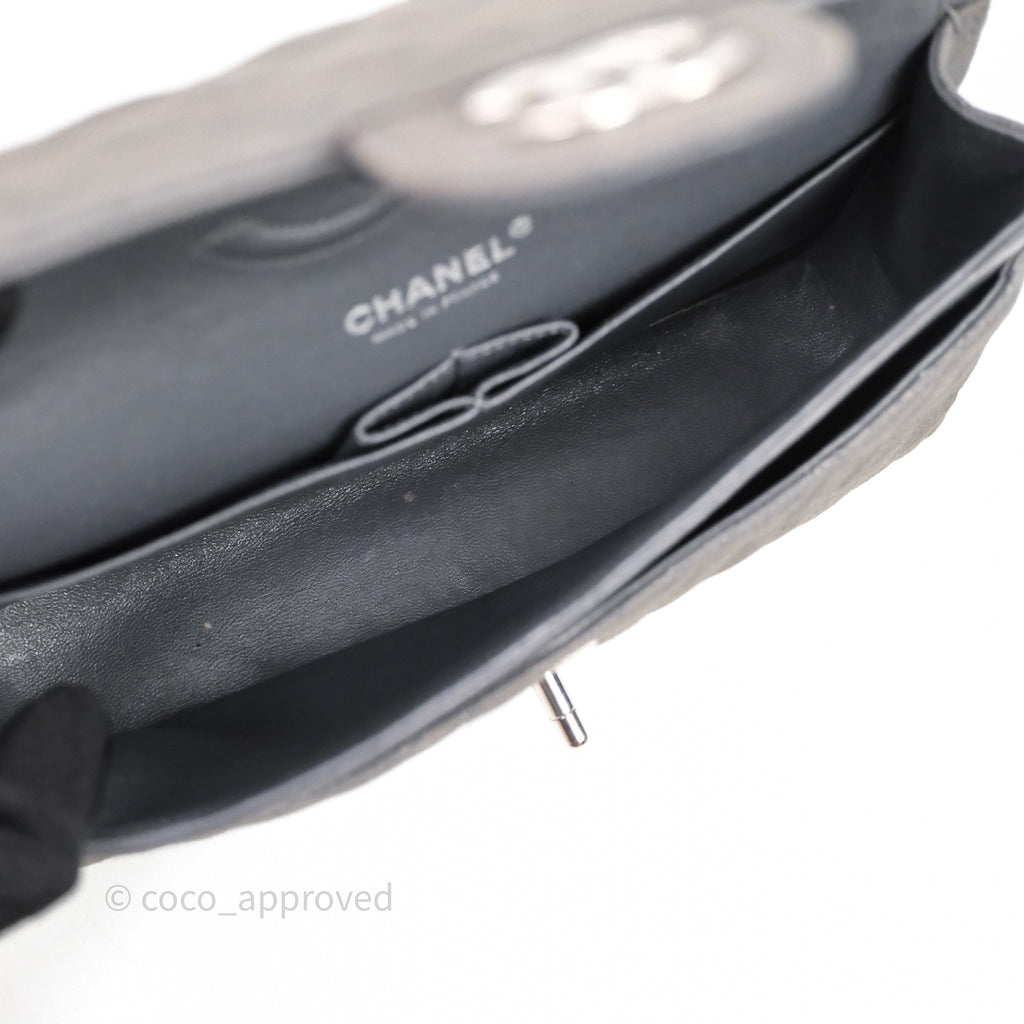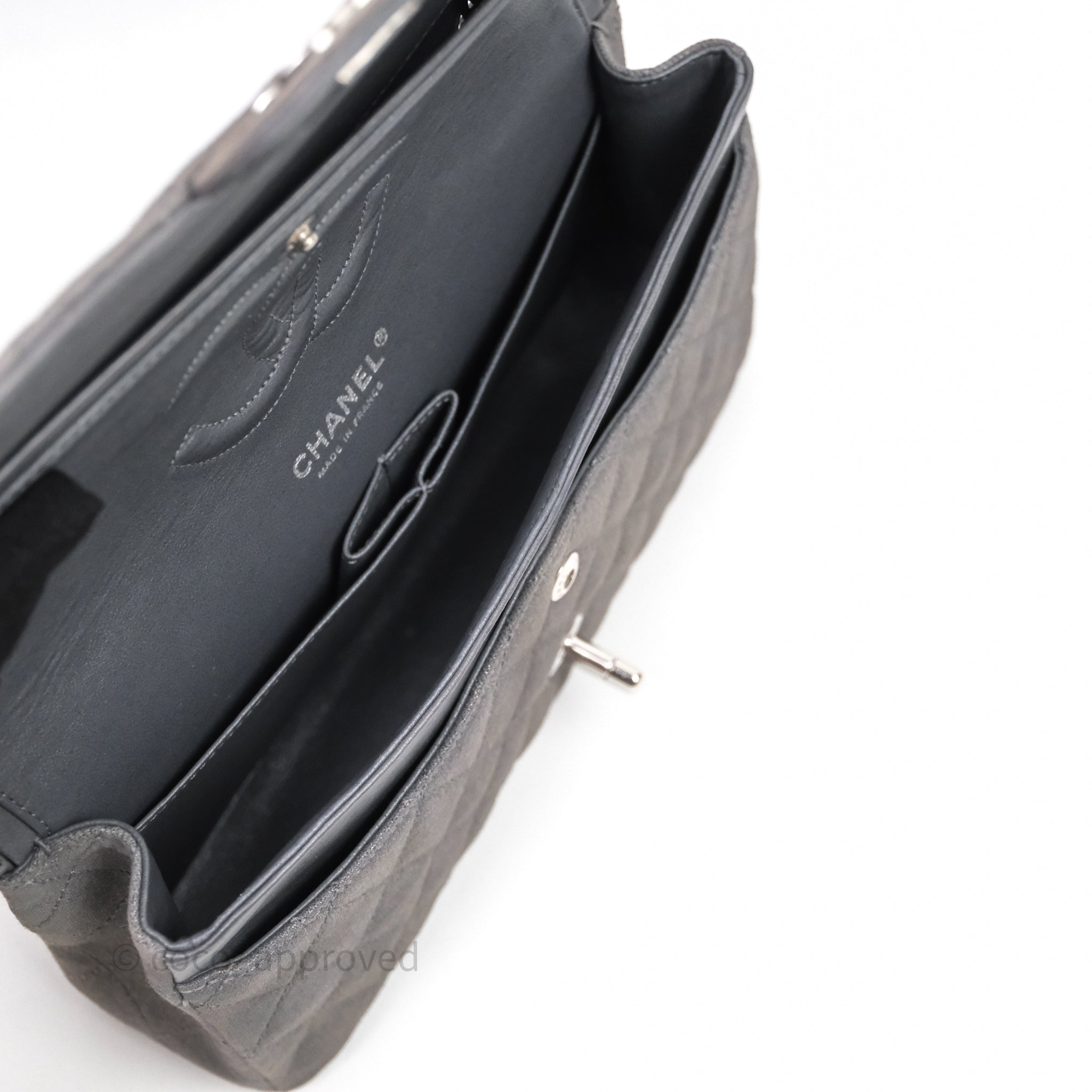 Chanel Classic M/L Medium Flap Quilted Iridescent Metallic Grey Canvas Silver Hardware