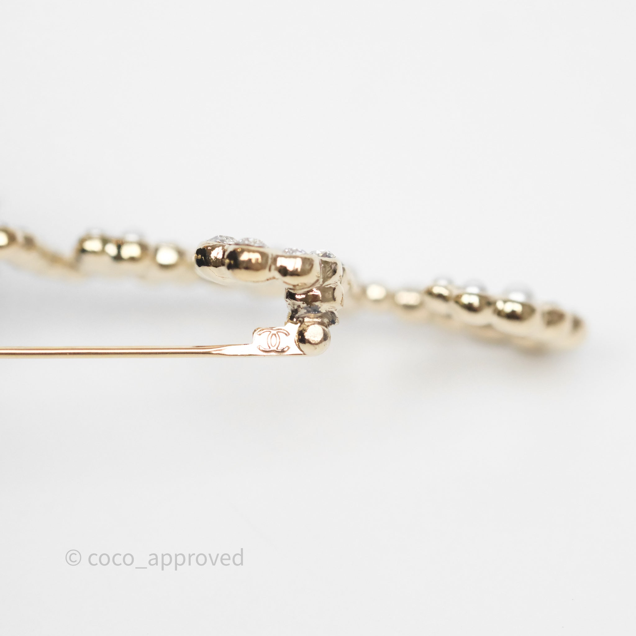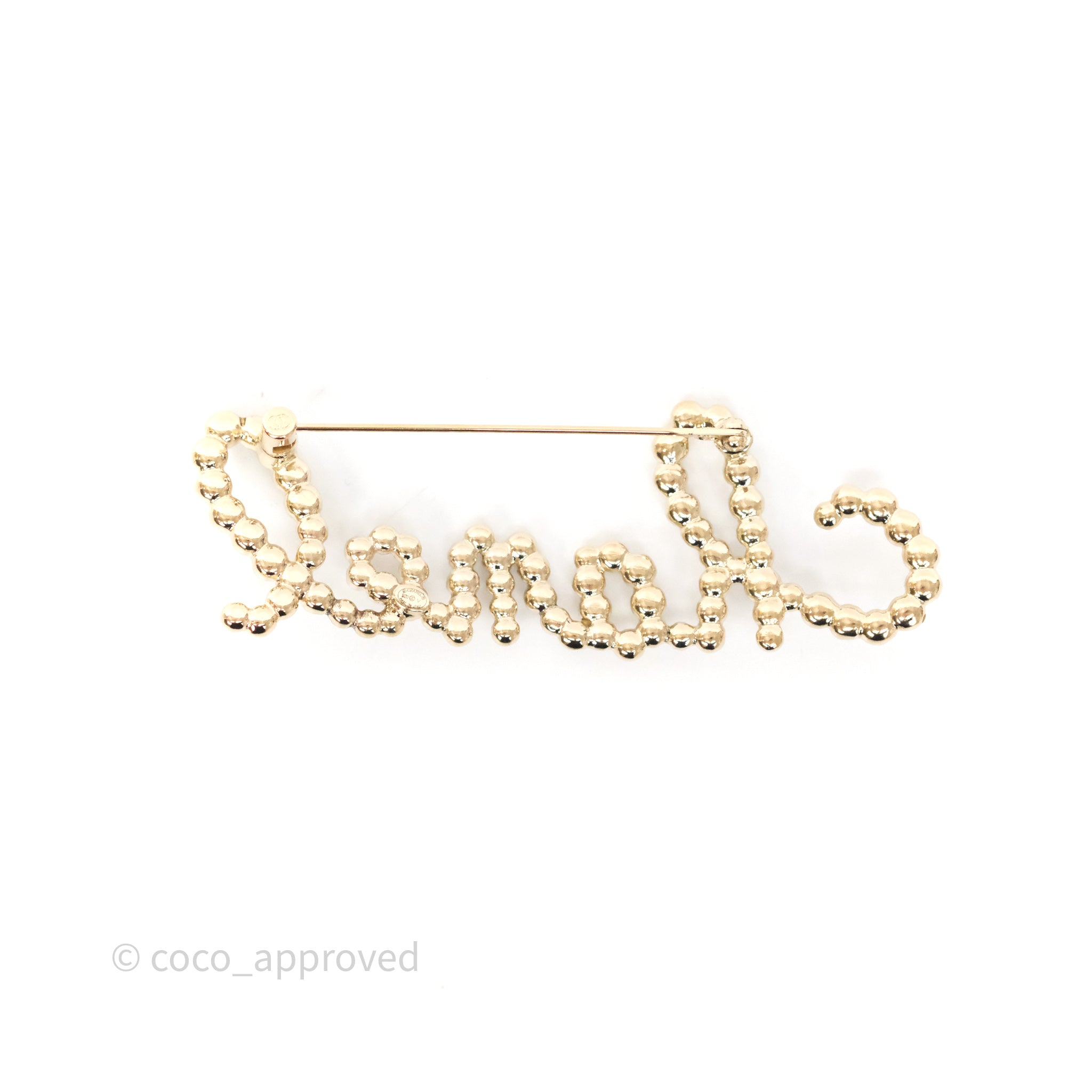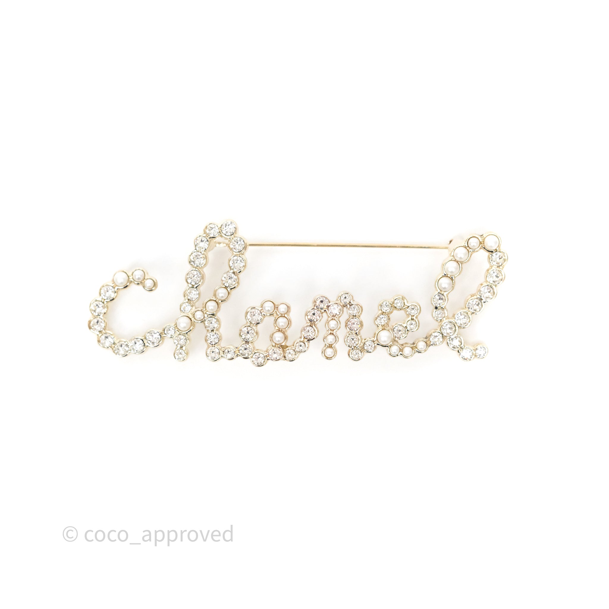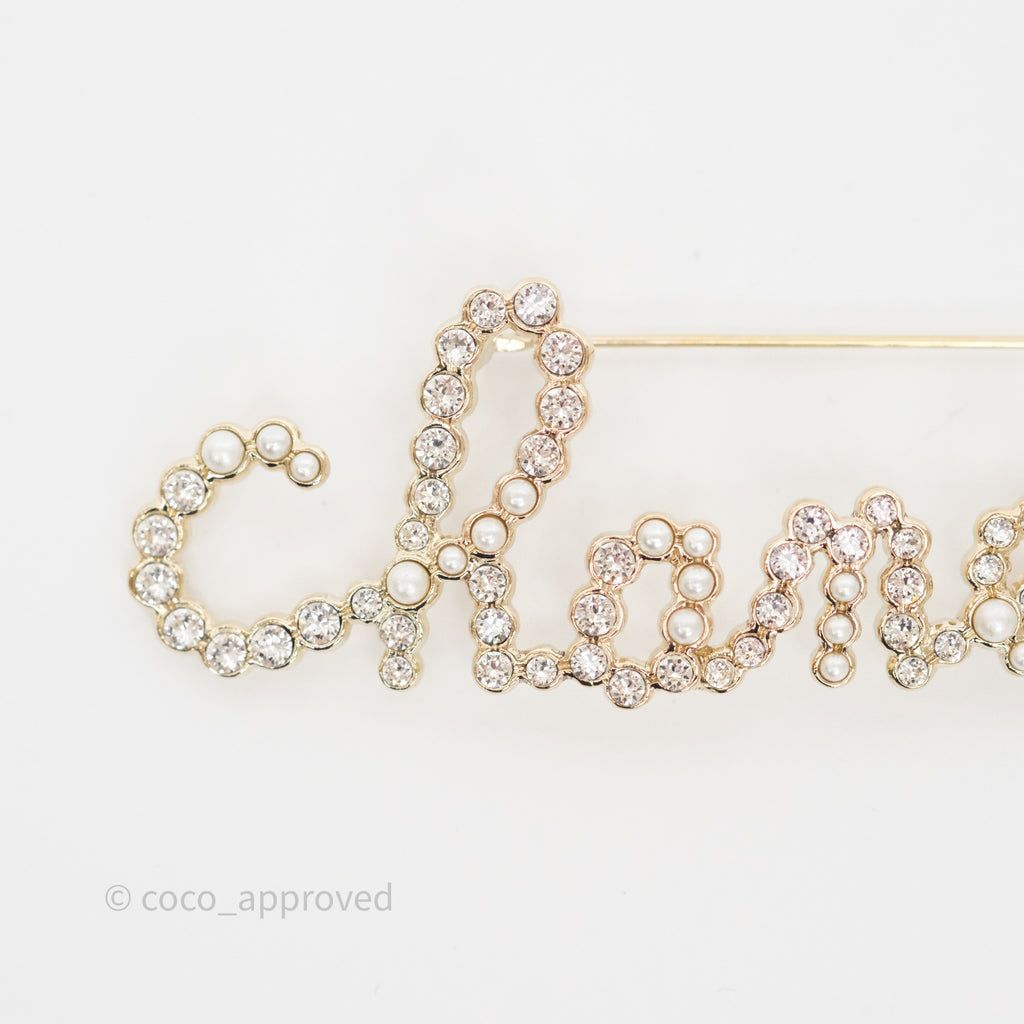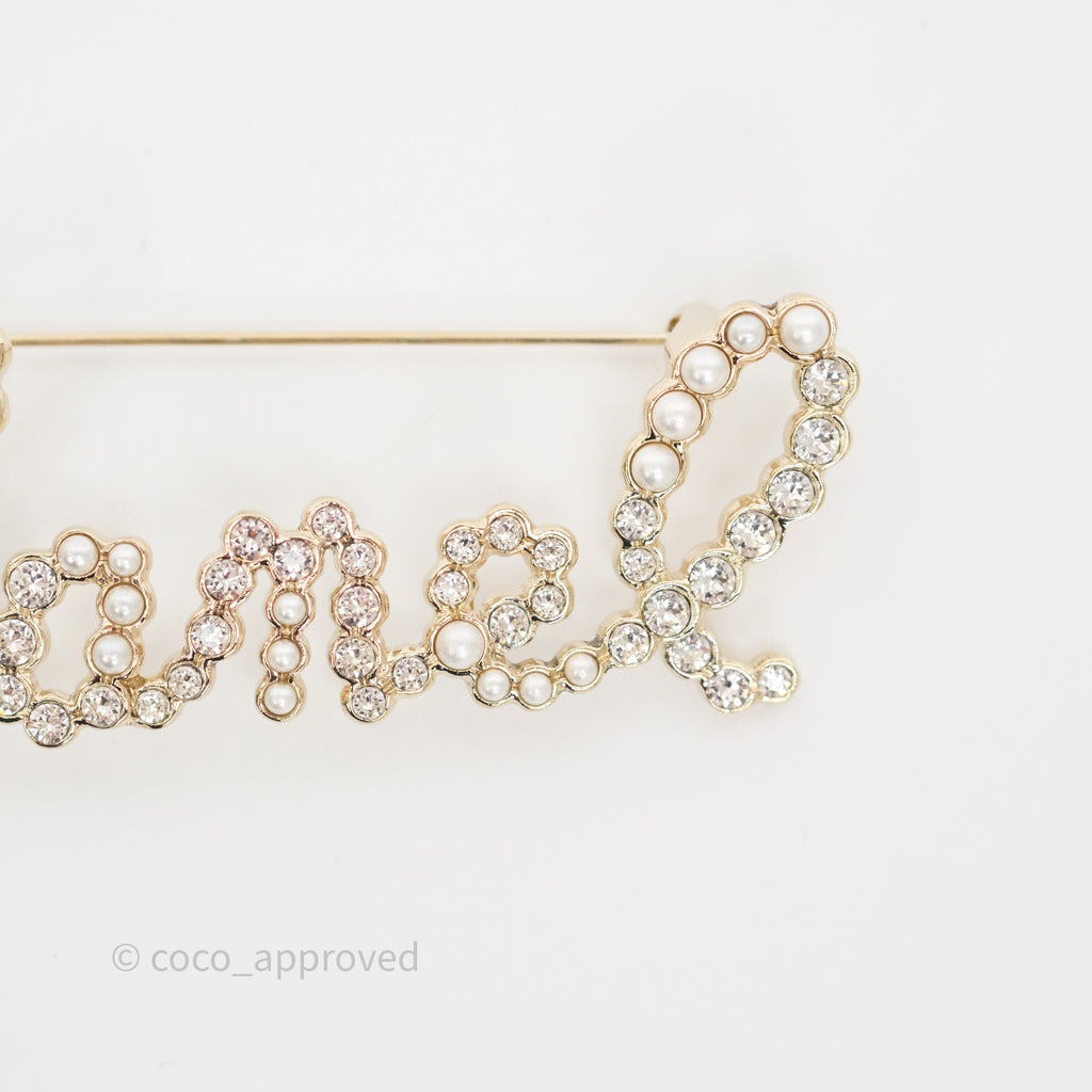 Chanel Logo Pearl Crystal Brooch Gold Tone 20V