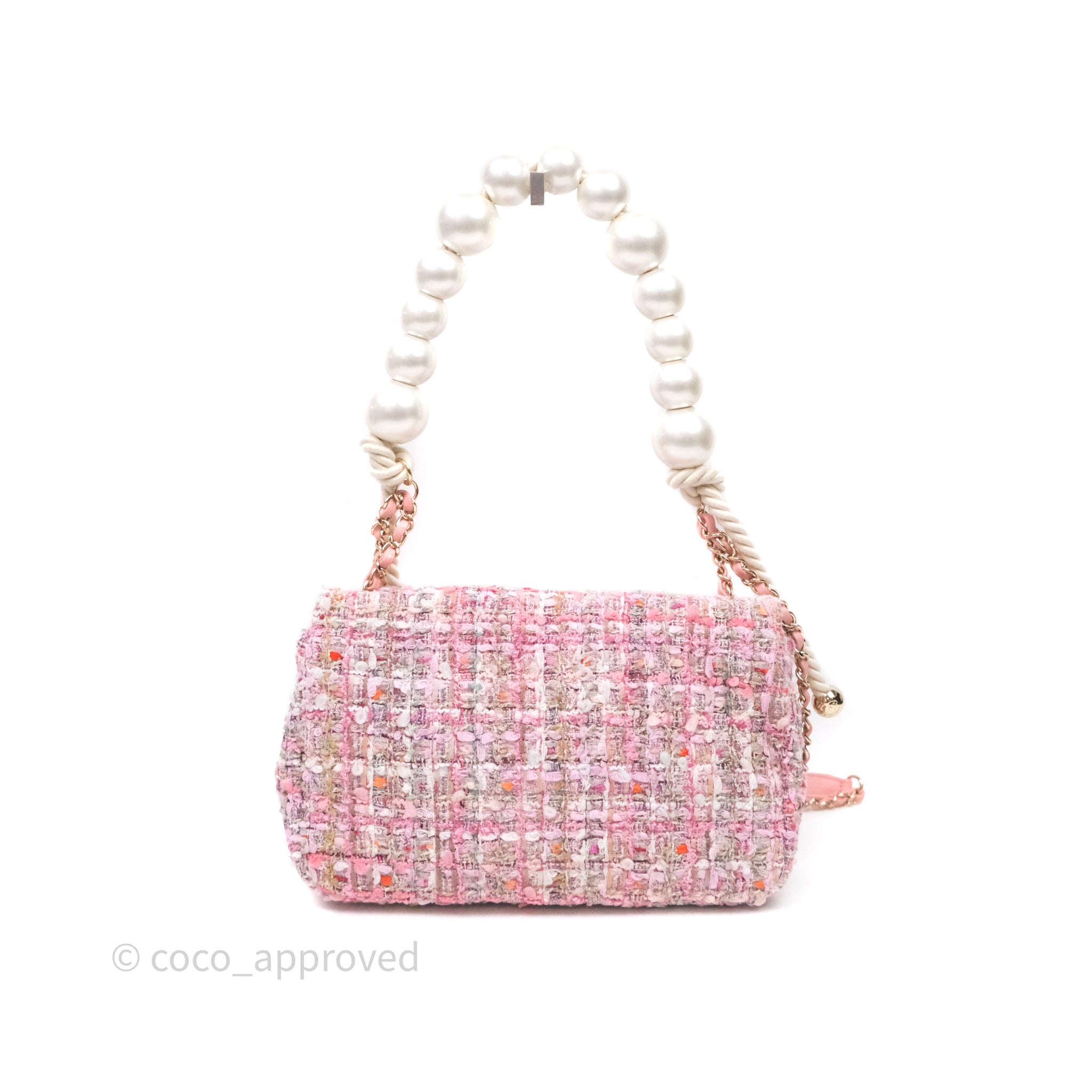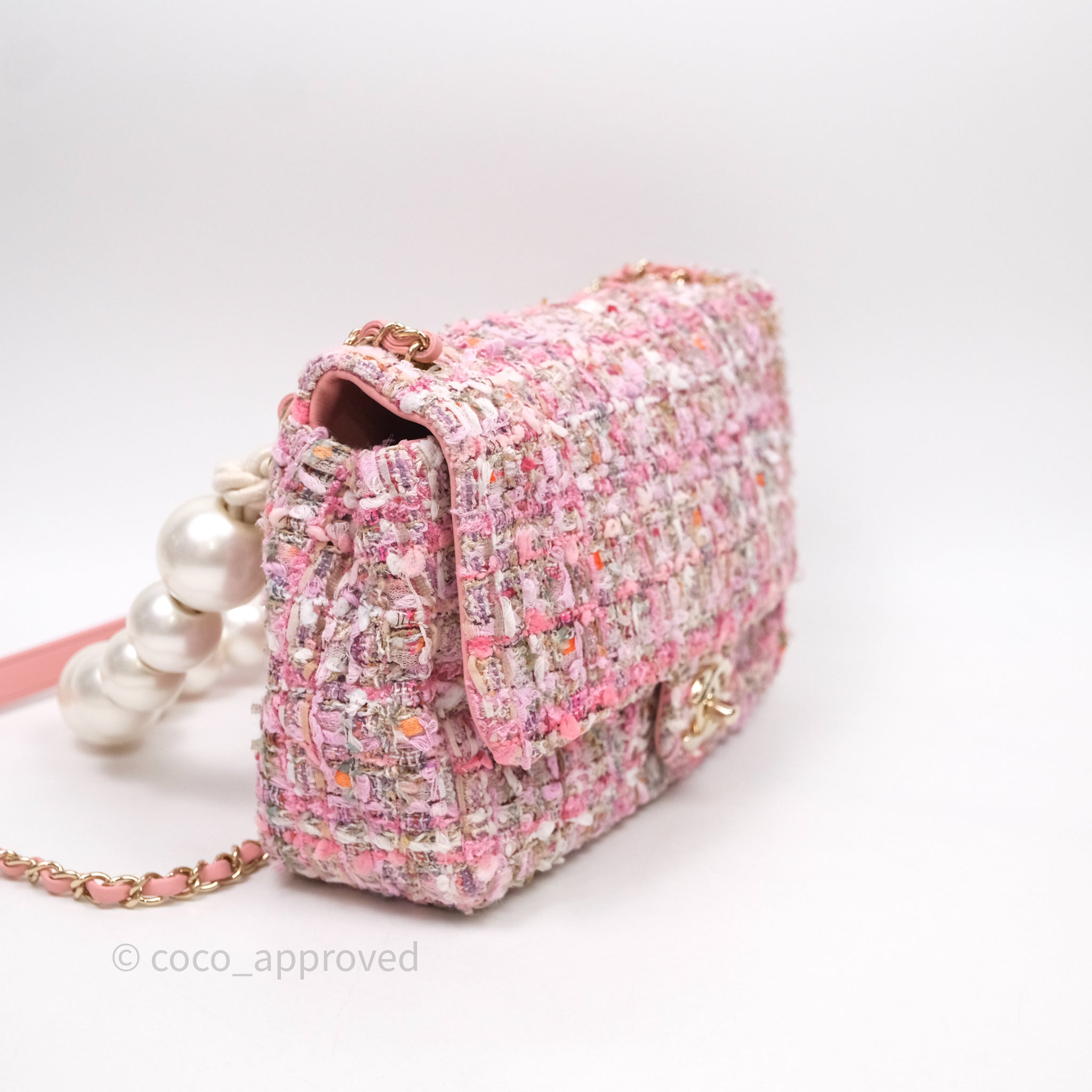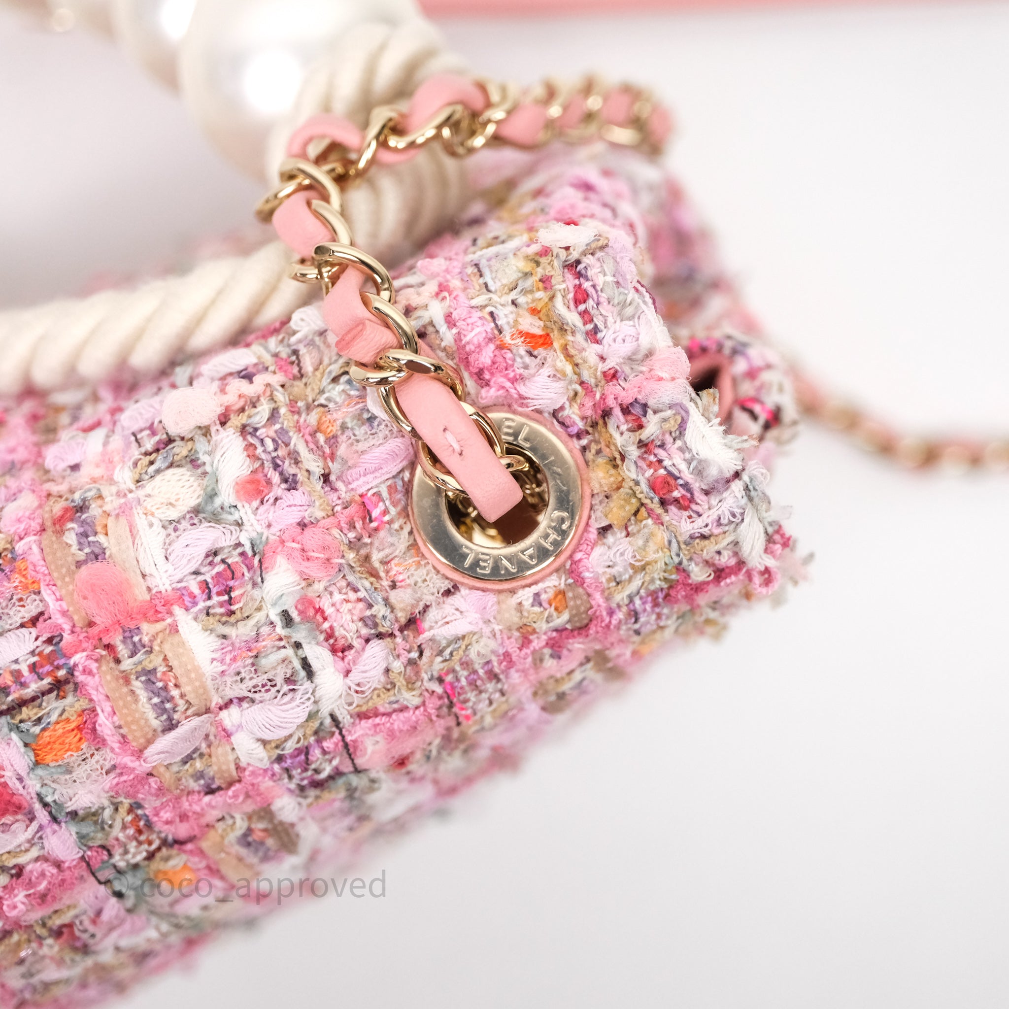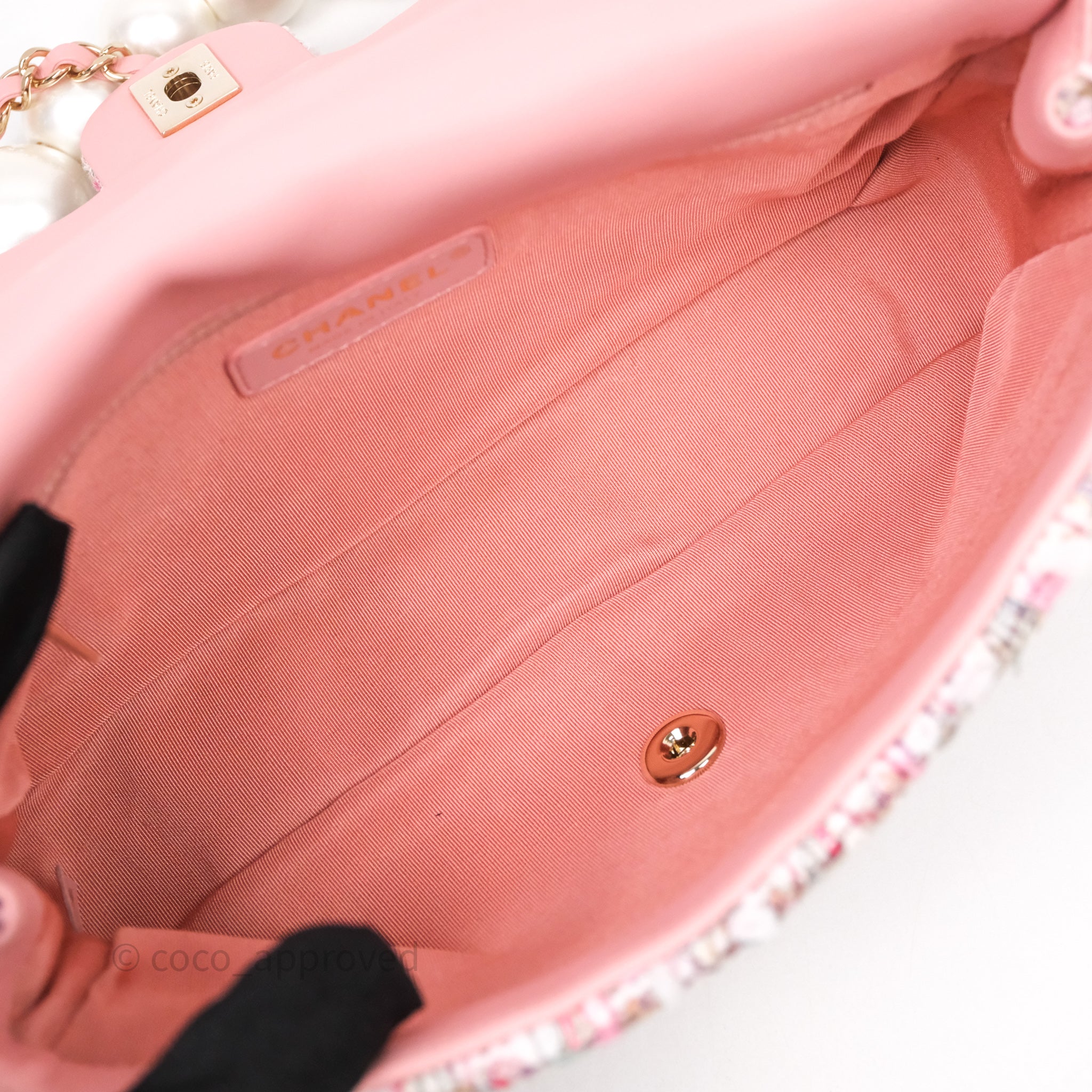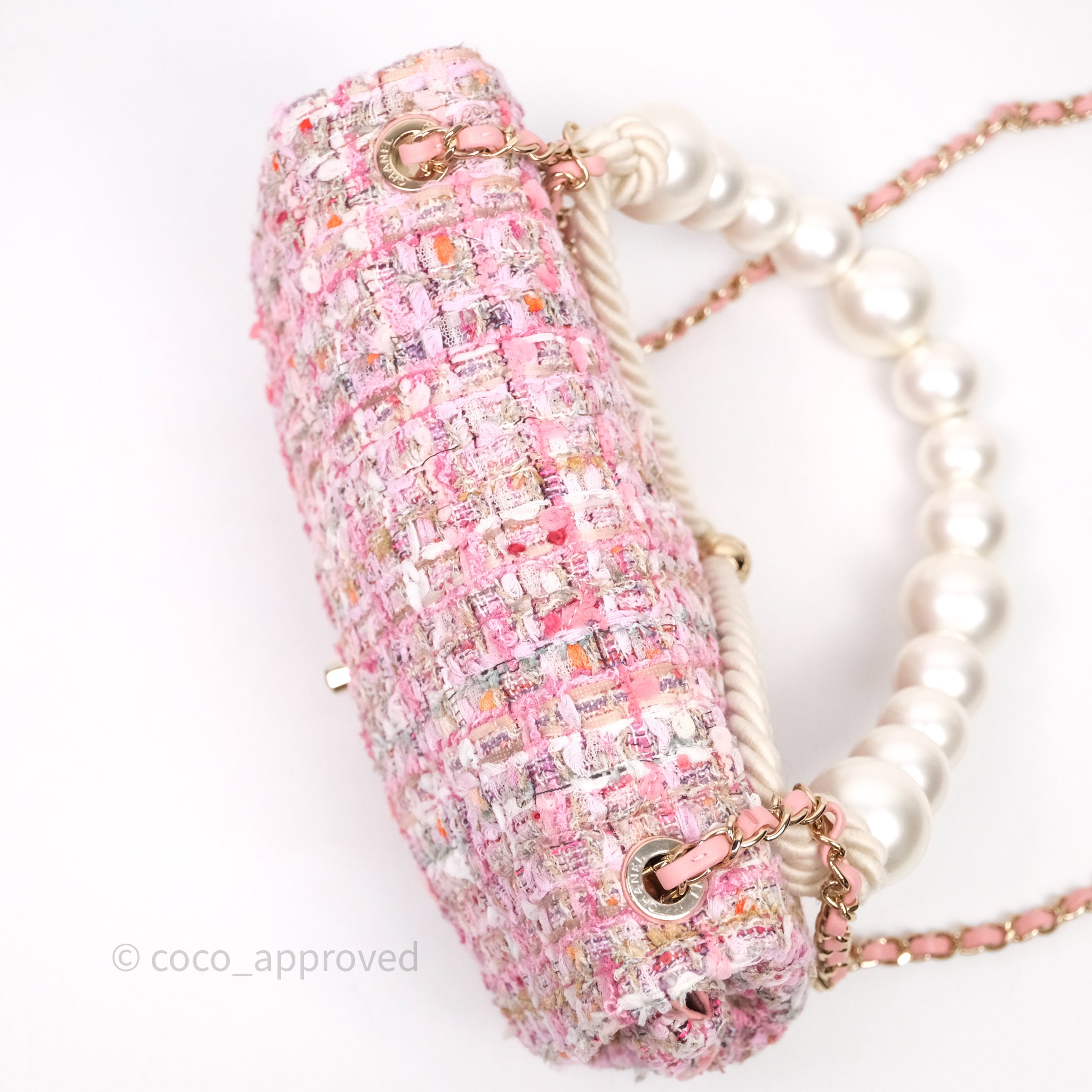 Chanel Pink Tweed Flap Bag With Large Pearl Handle Gold Hardware