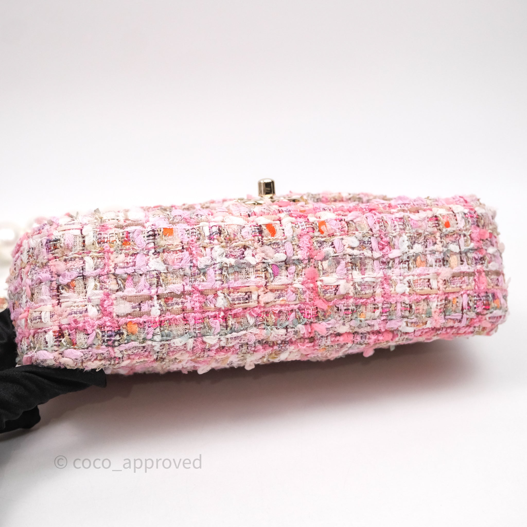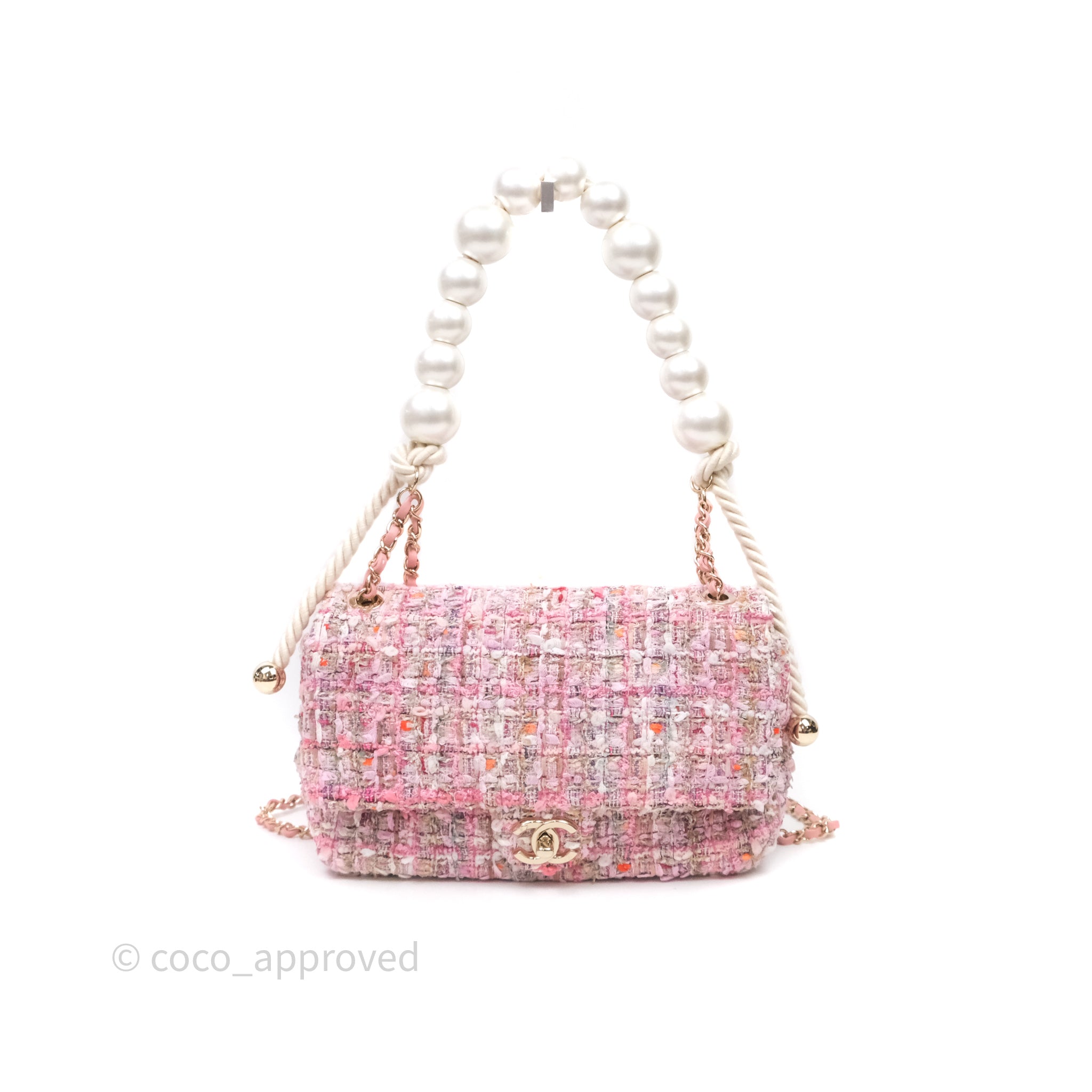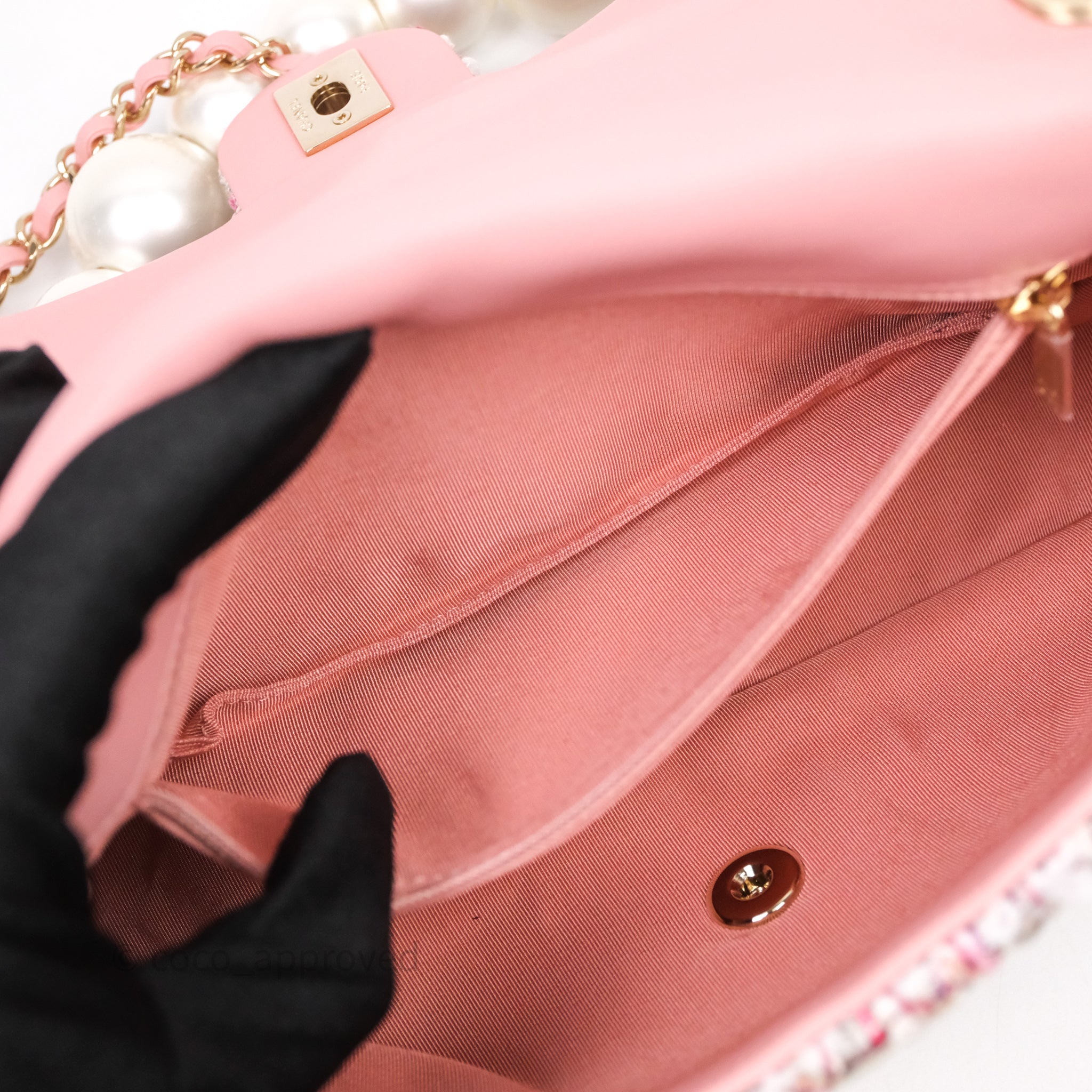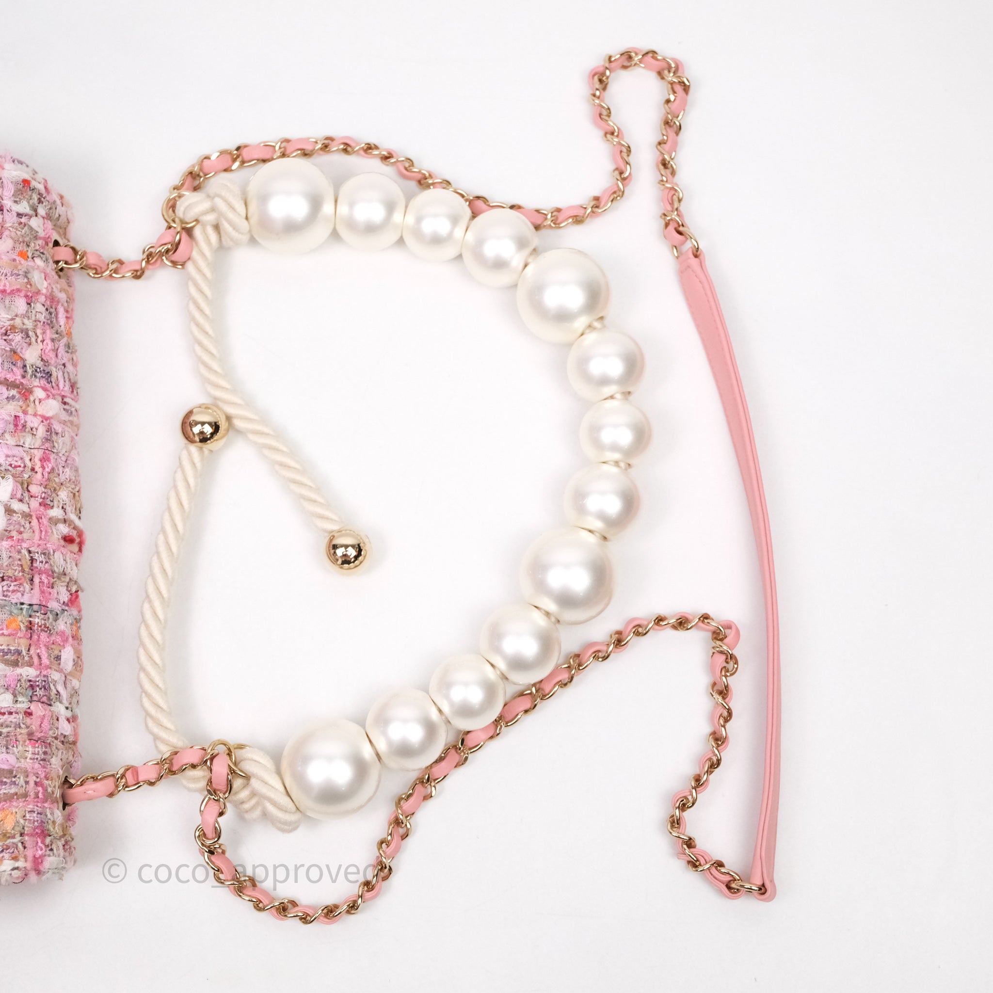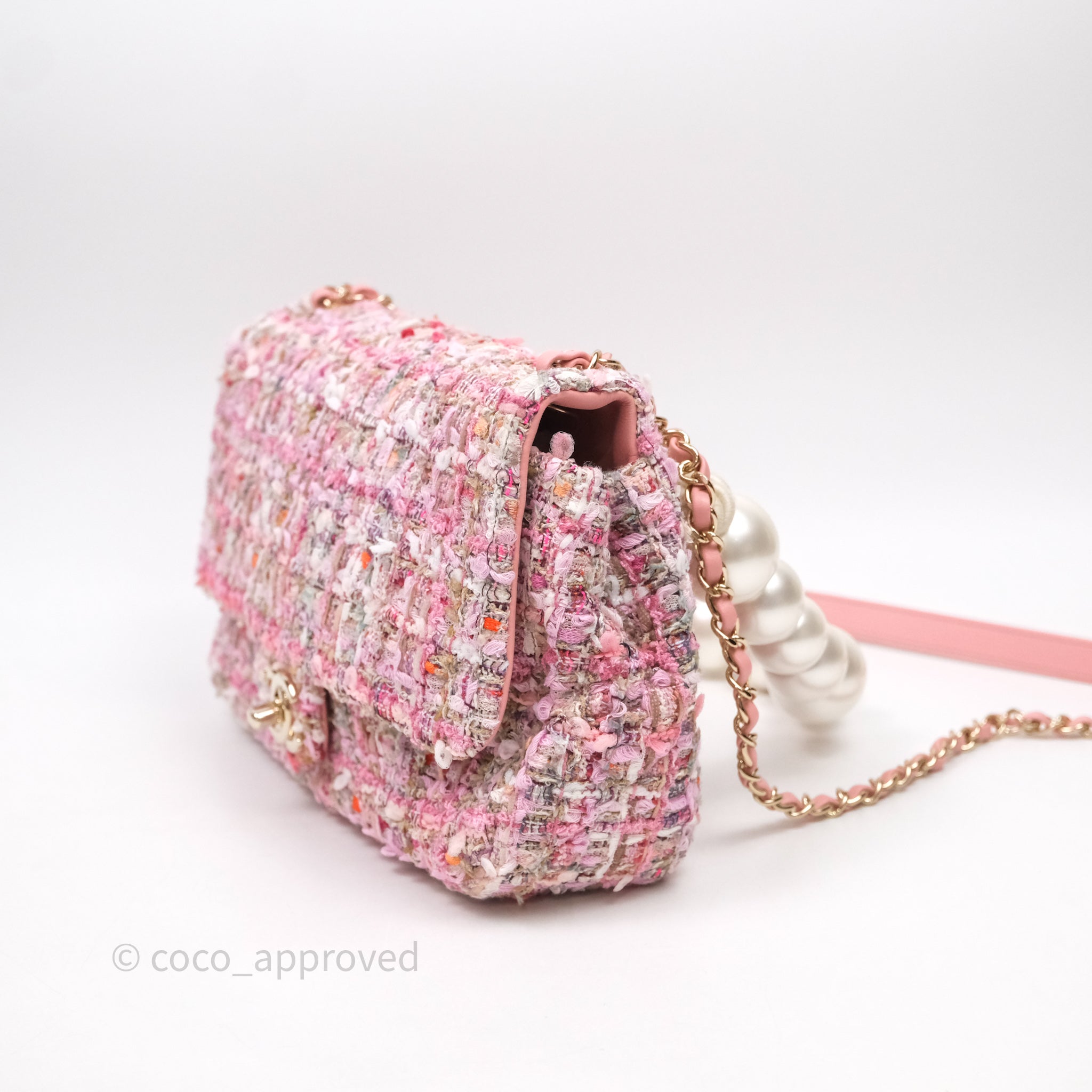 Chanel Pink Tweed Flap Bag With Large Pearl Handle Gold Hardware