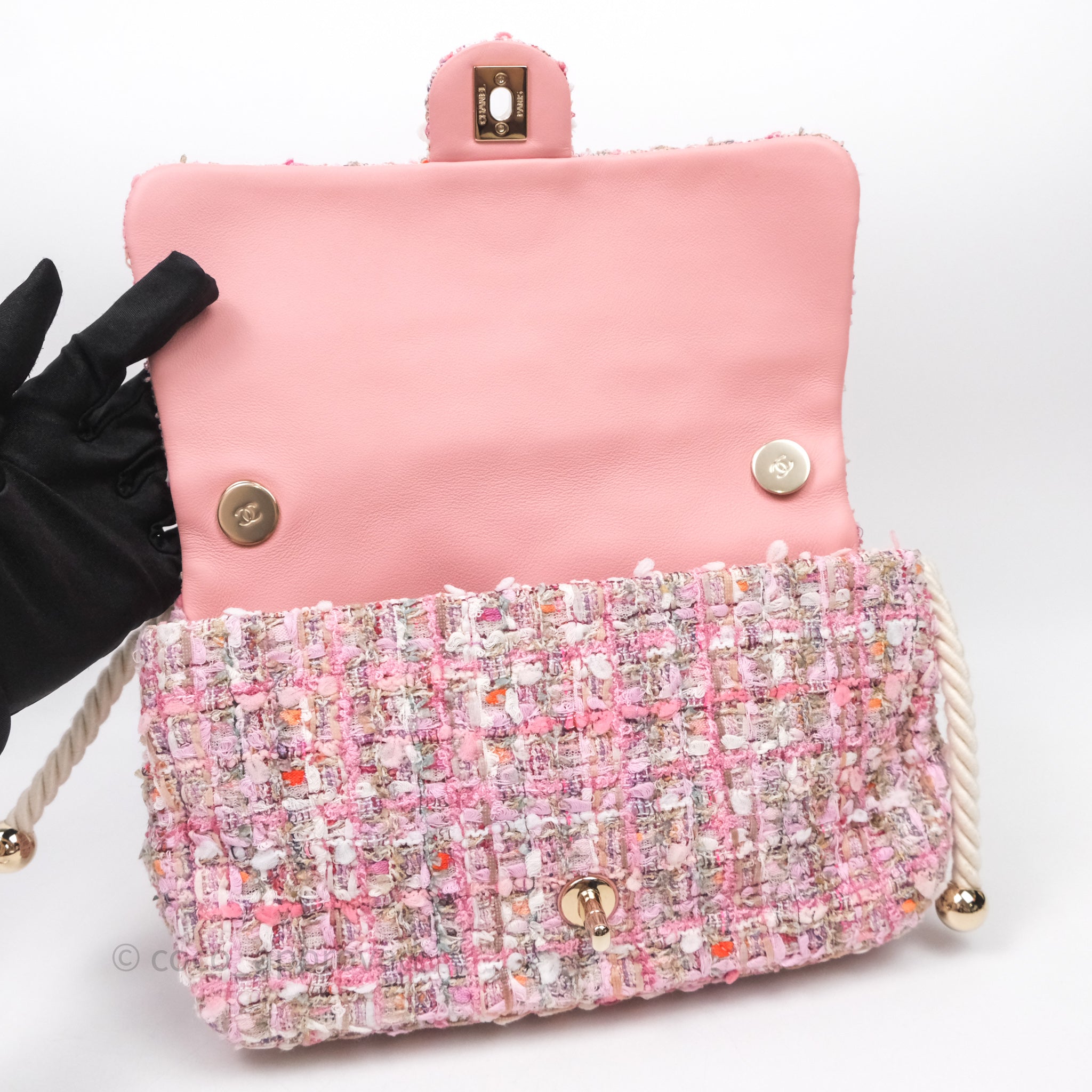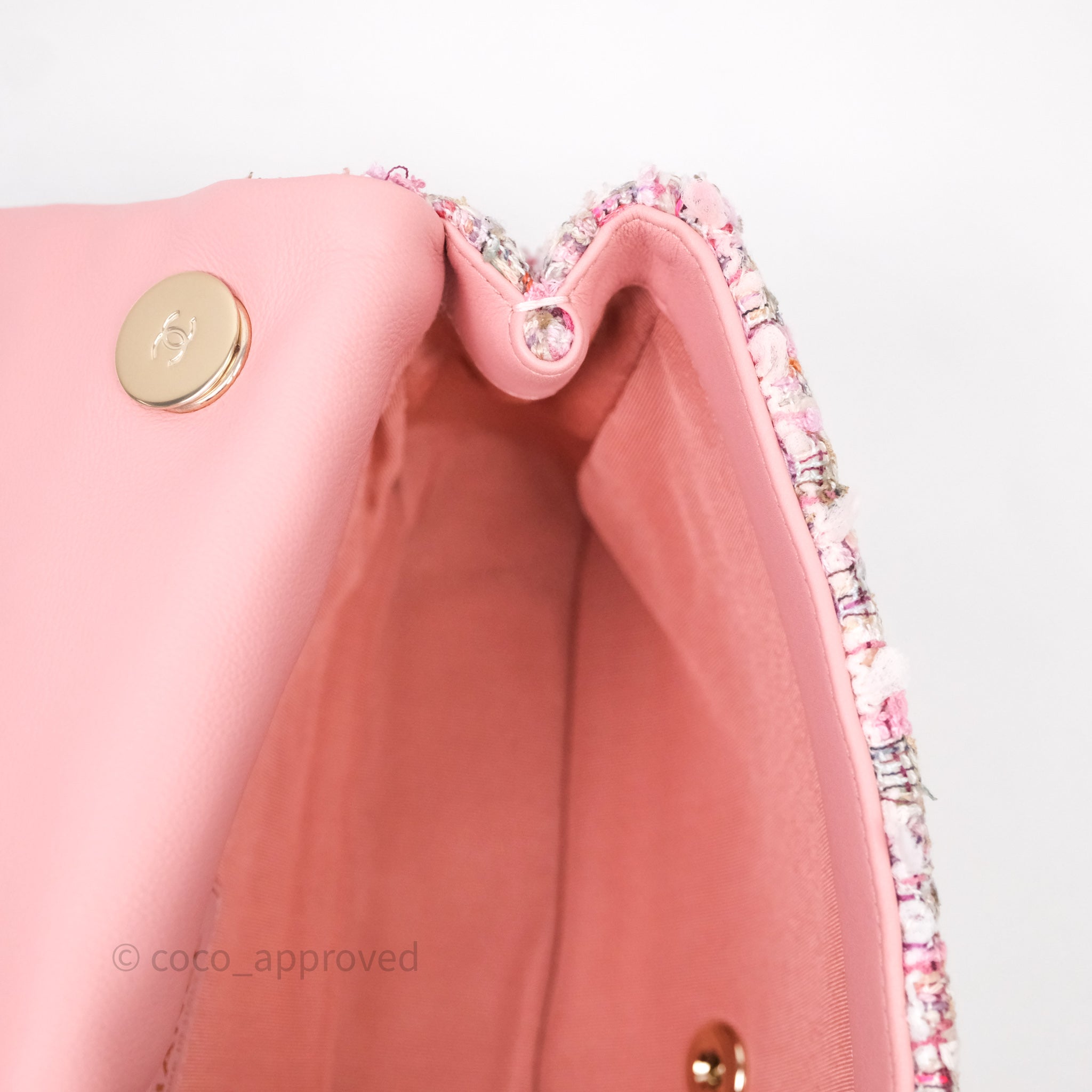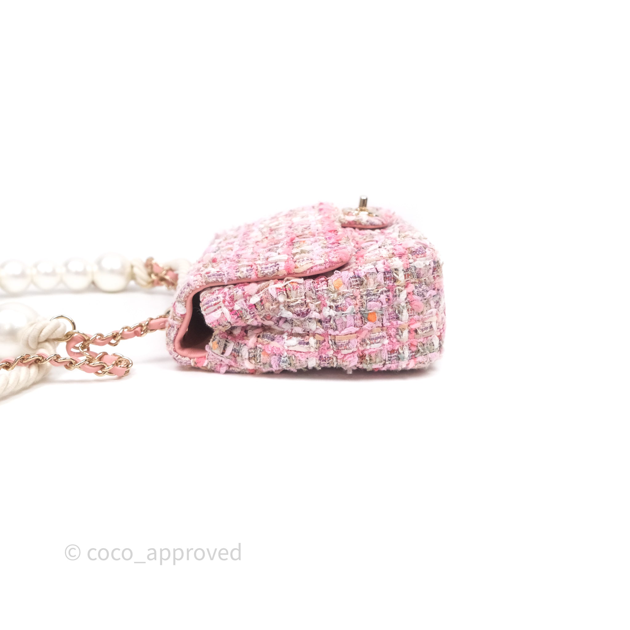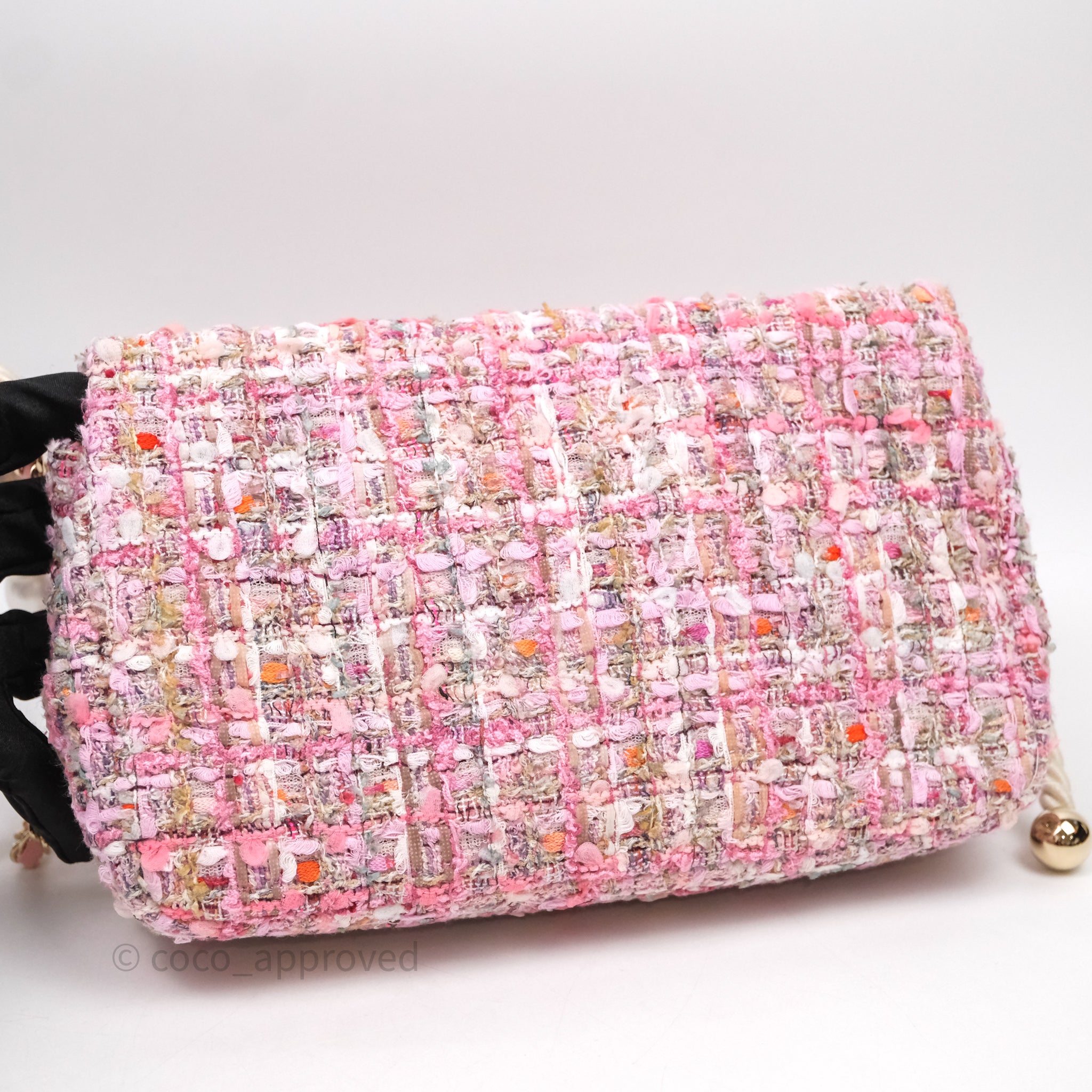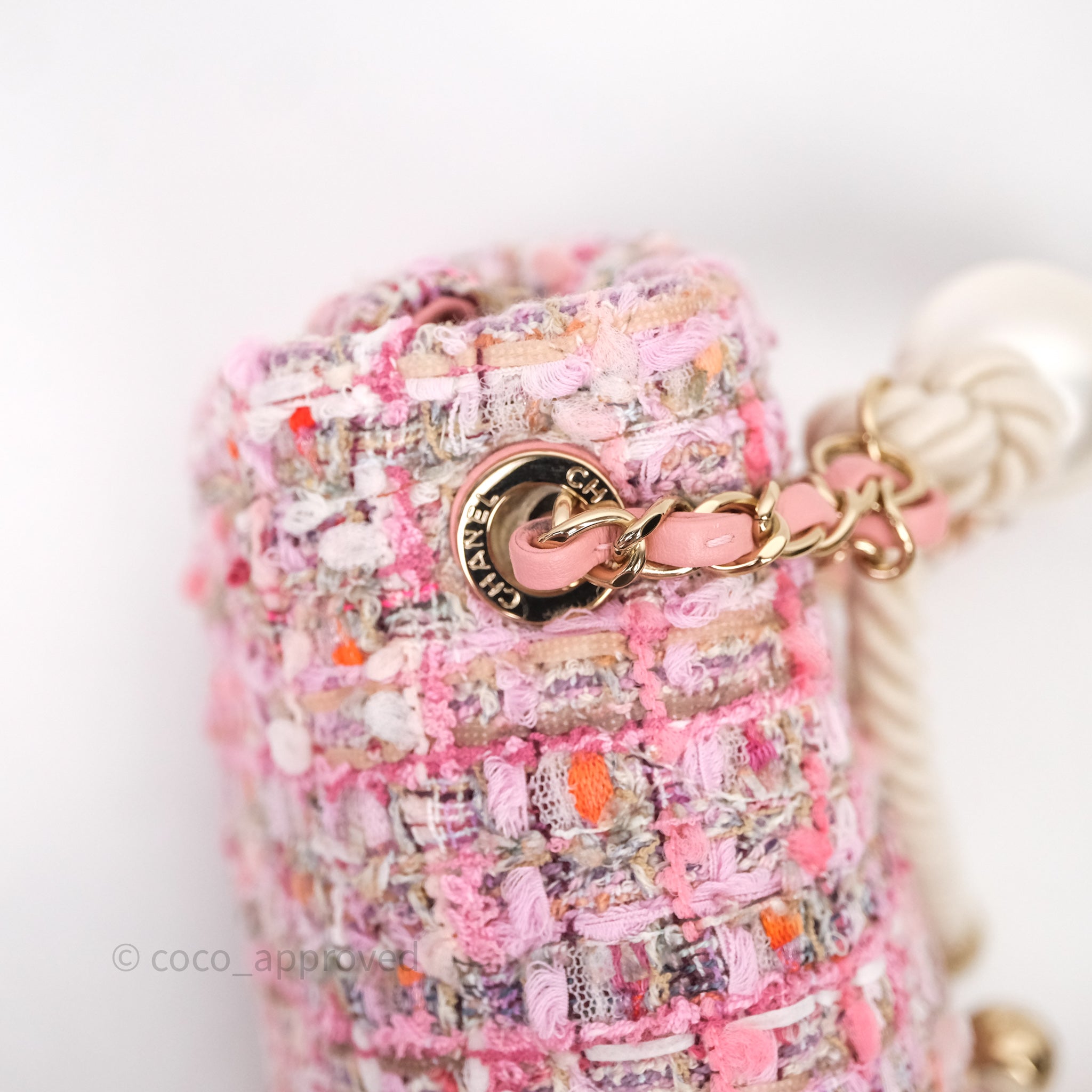 Chanel Pink Tweed Flap Bag With Large Pearl Handle Gold Hardware