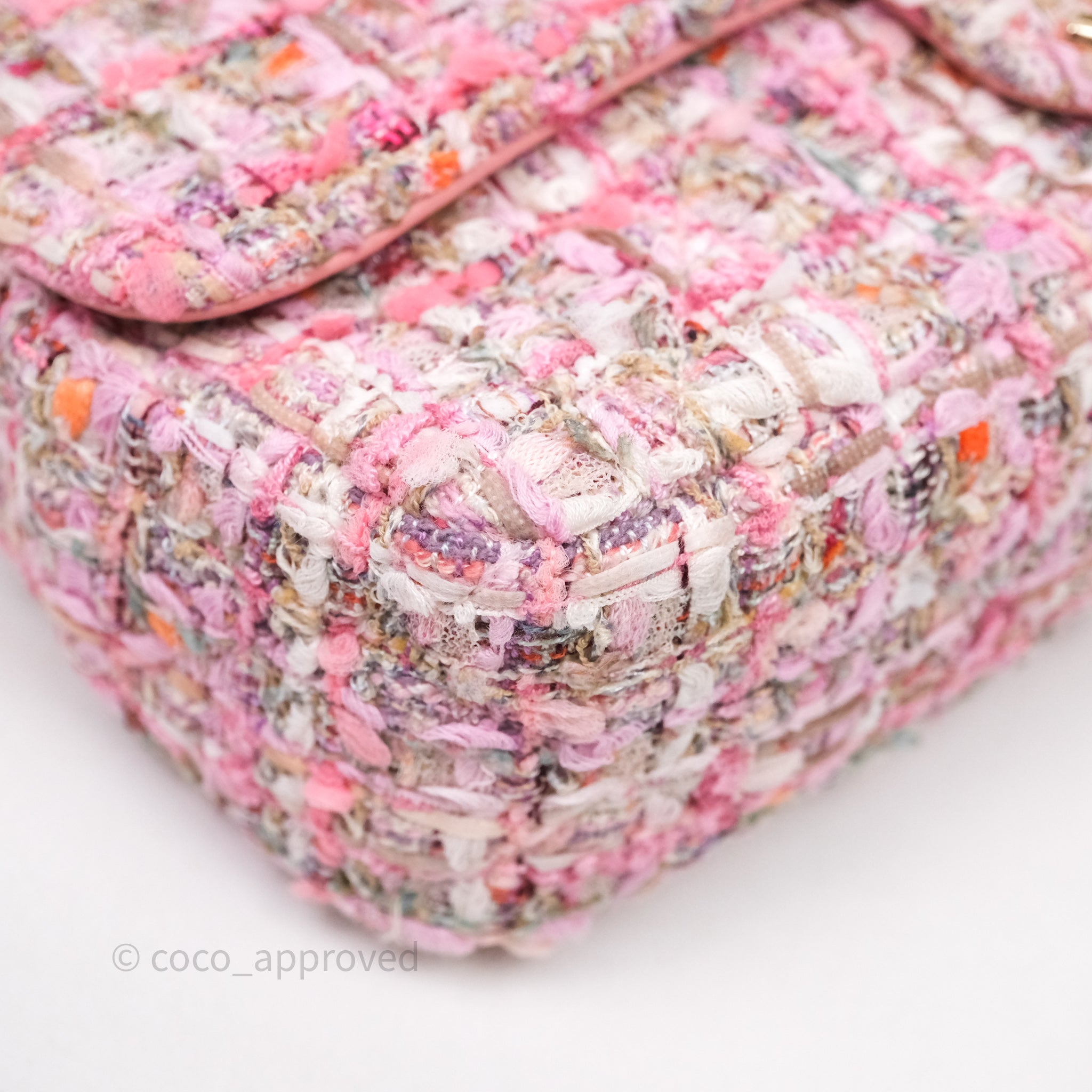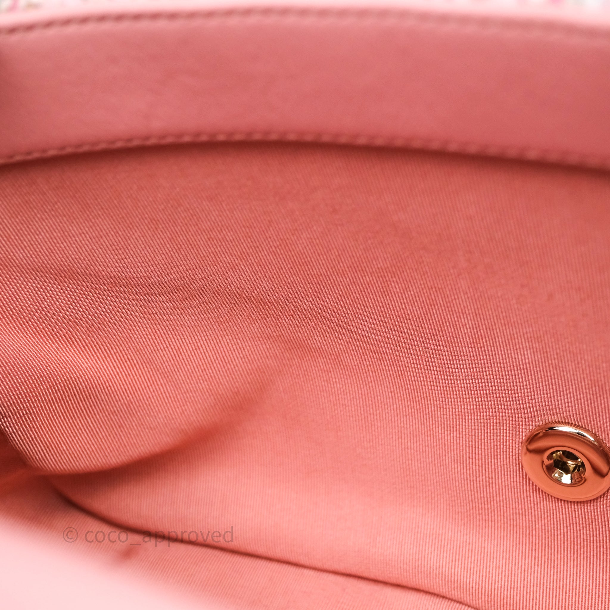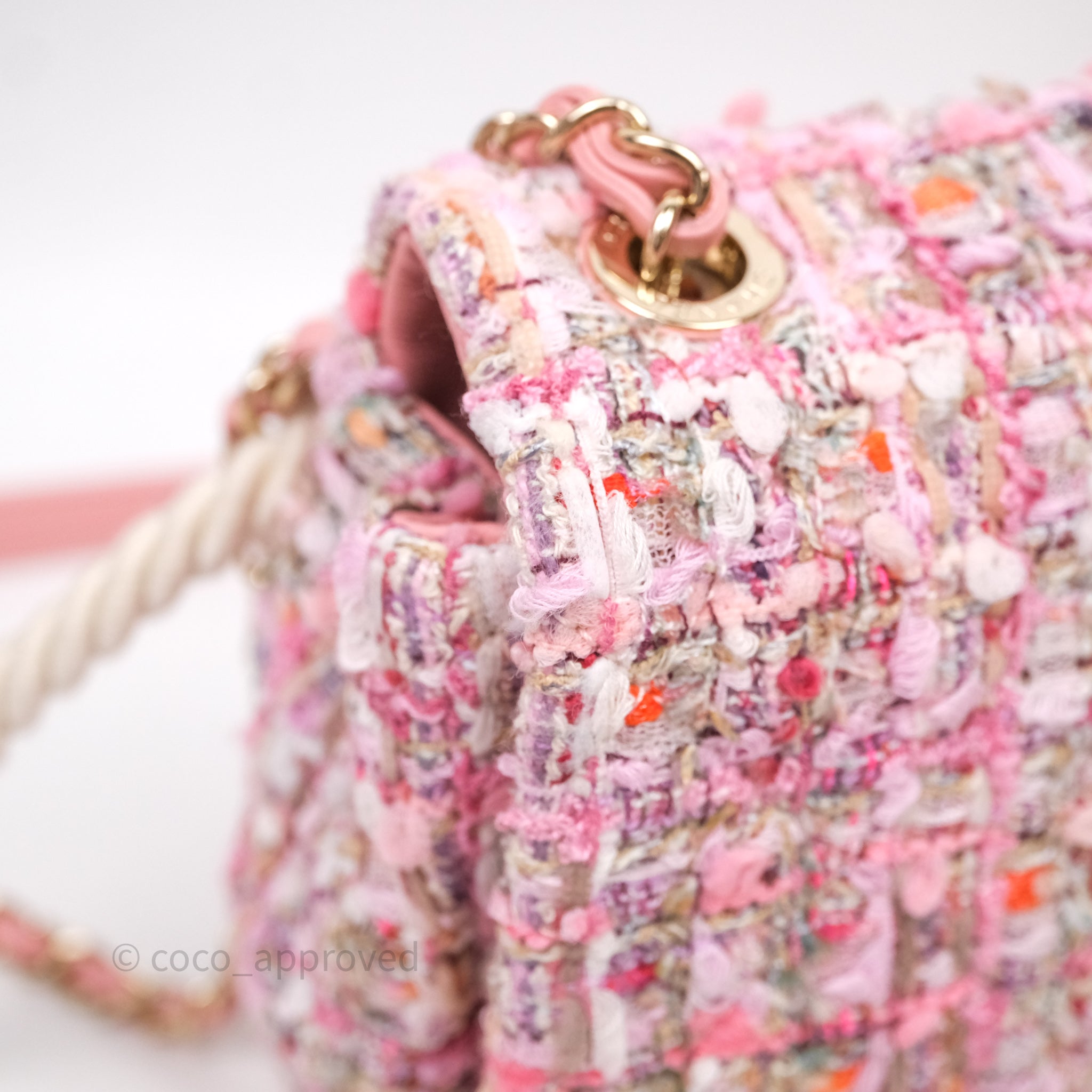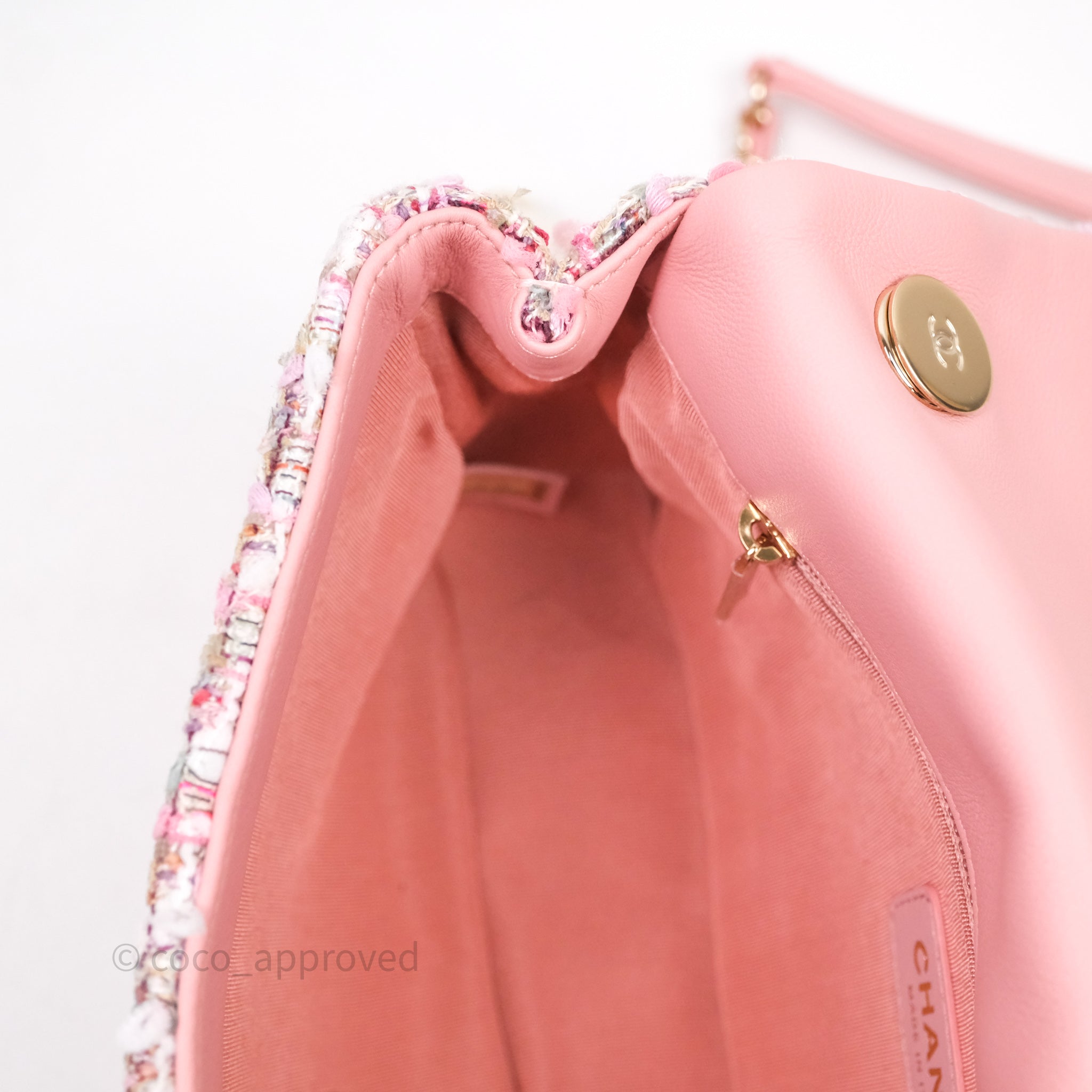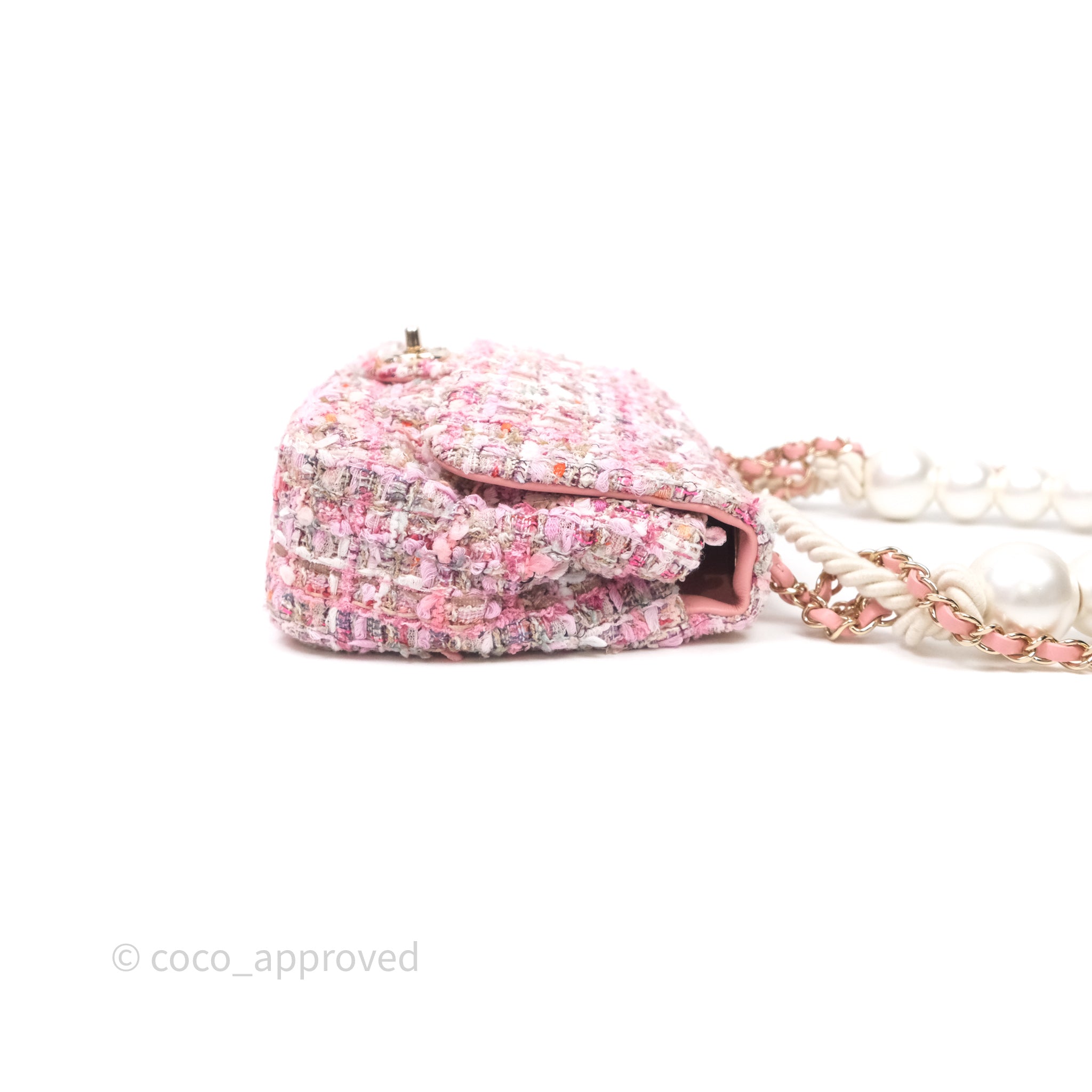Chanel Pink Tweed Flap Bag With Large Pearl Handle Gold Hardware