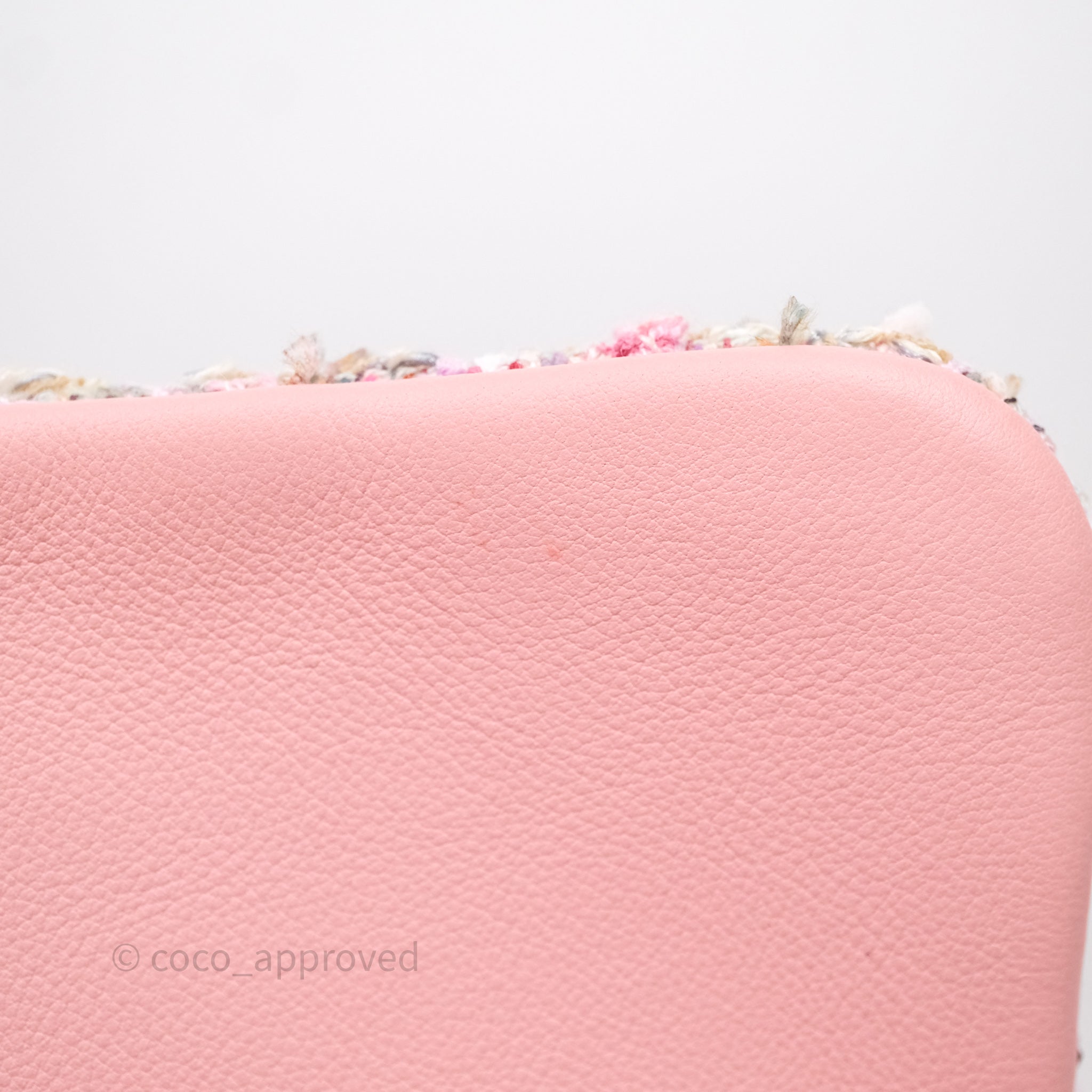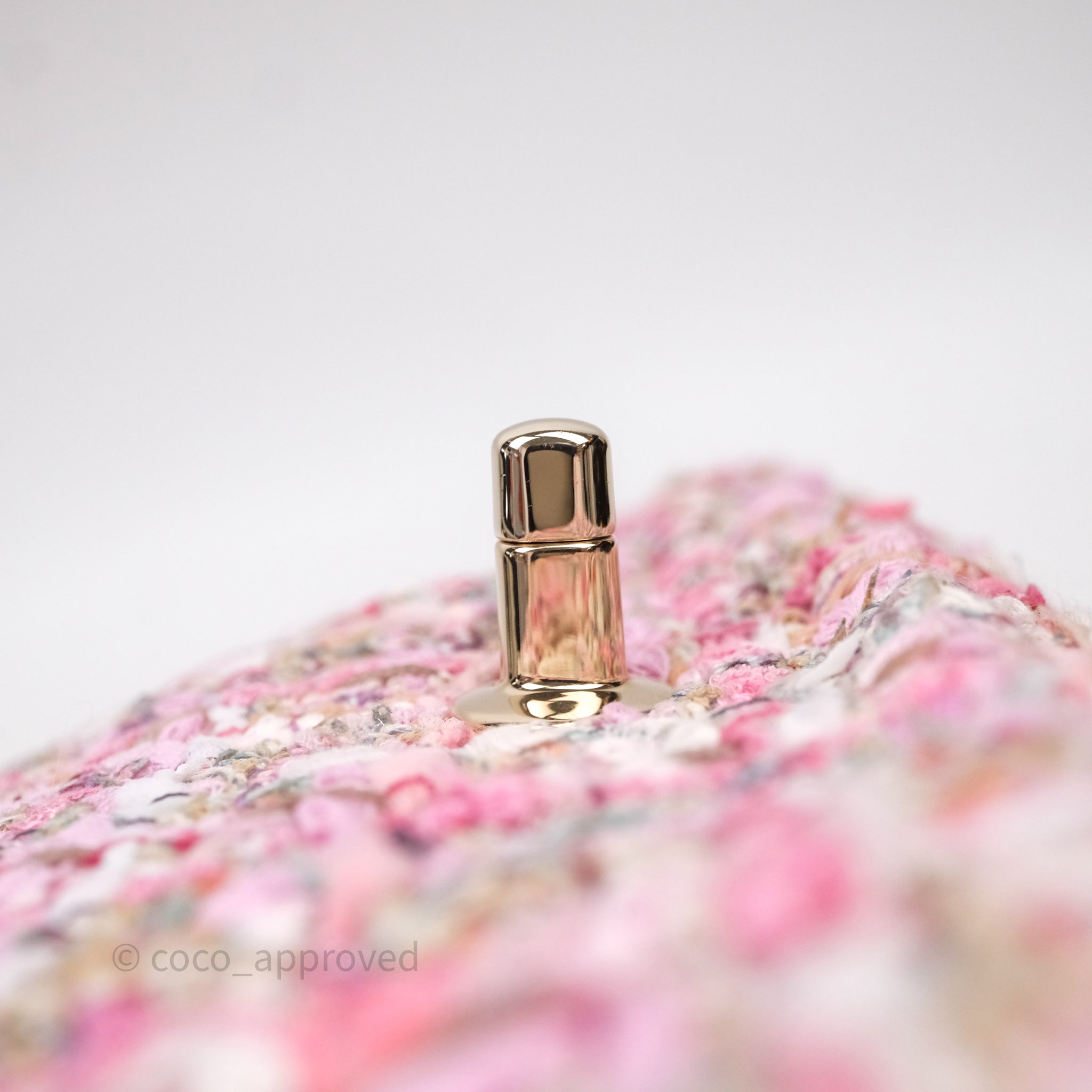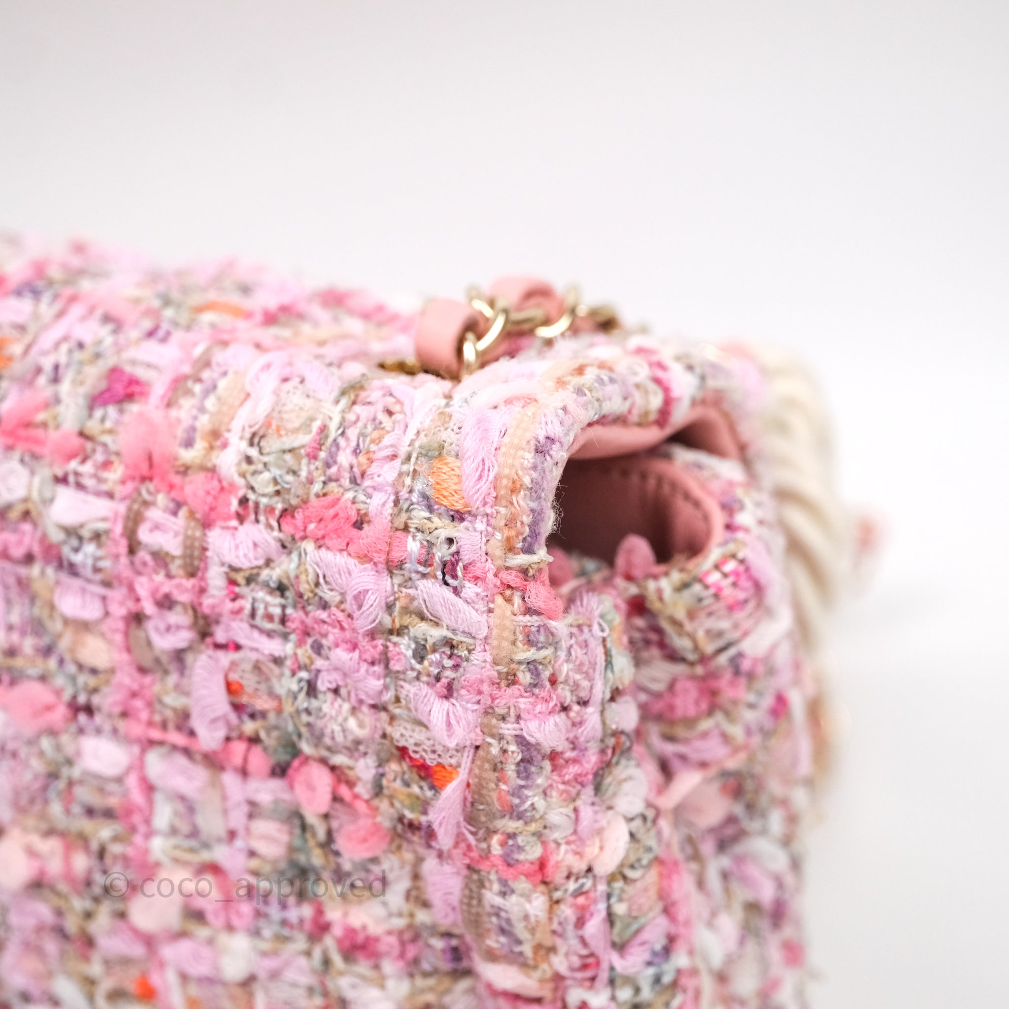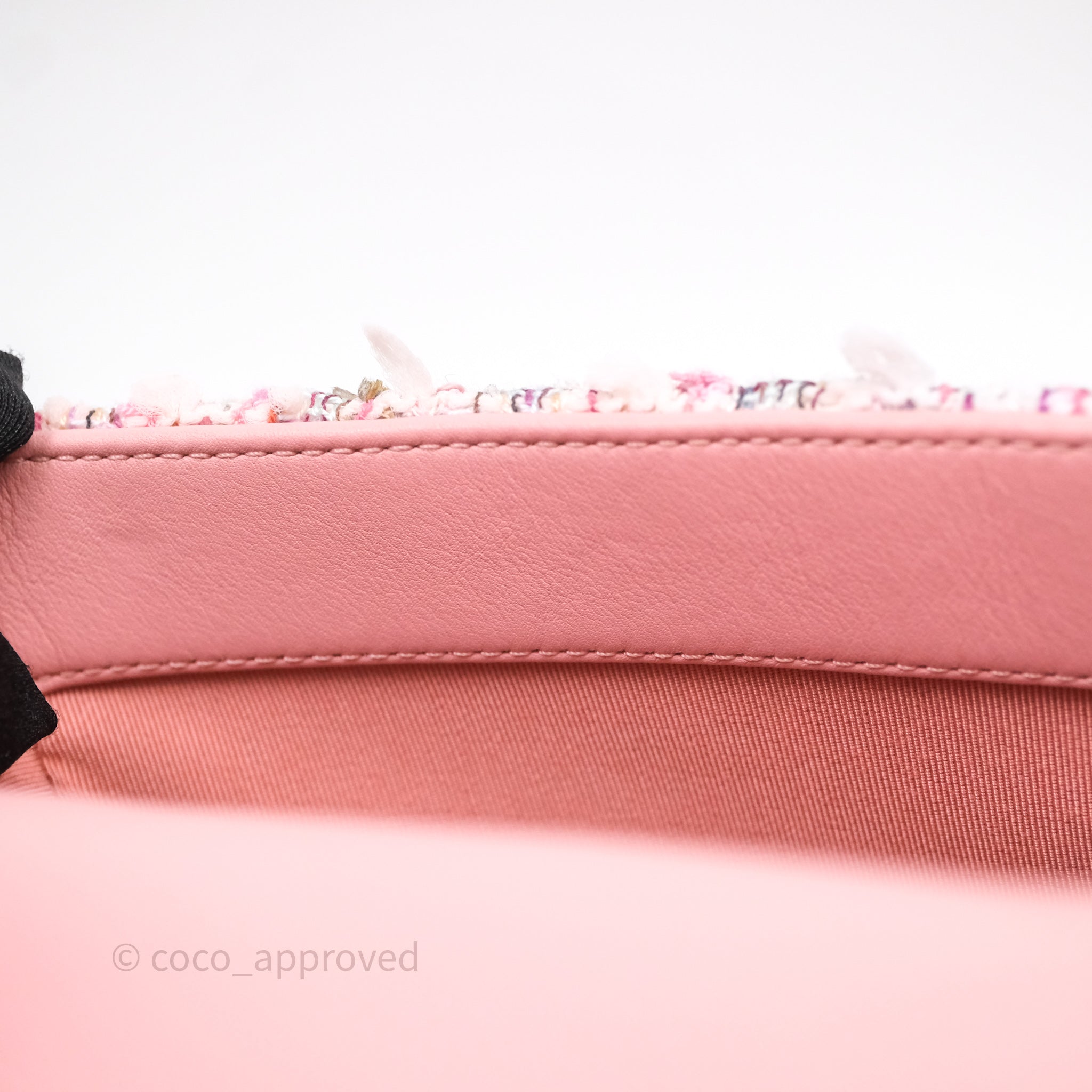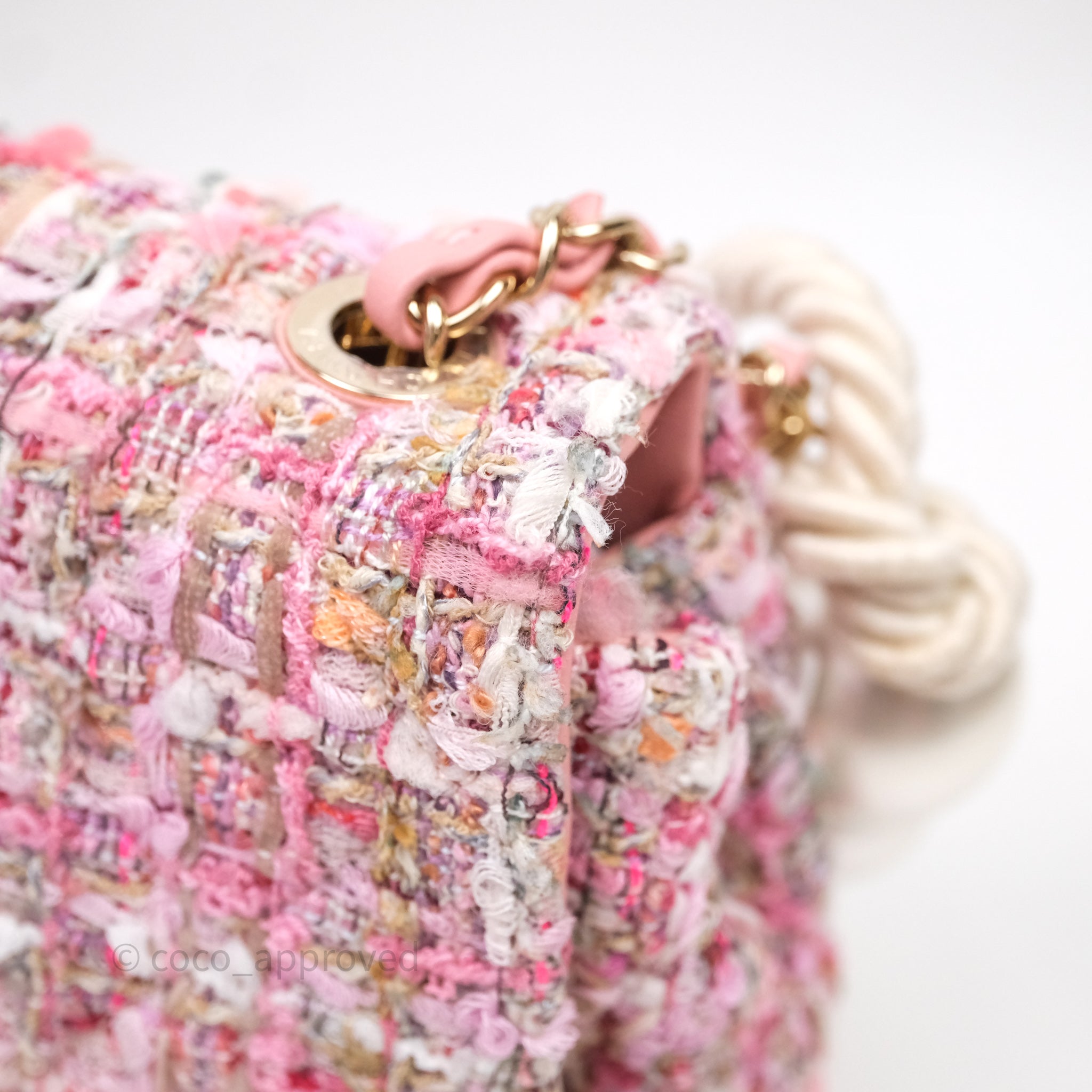 Chanel Pink Tweed Flap Bag With Large Pearl Handle Gold Hardware