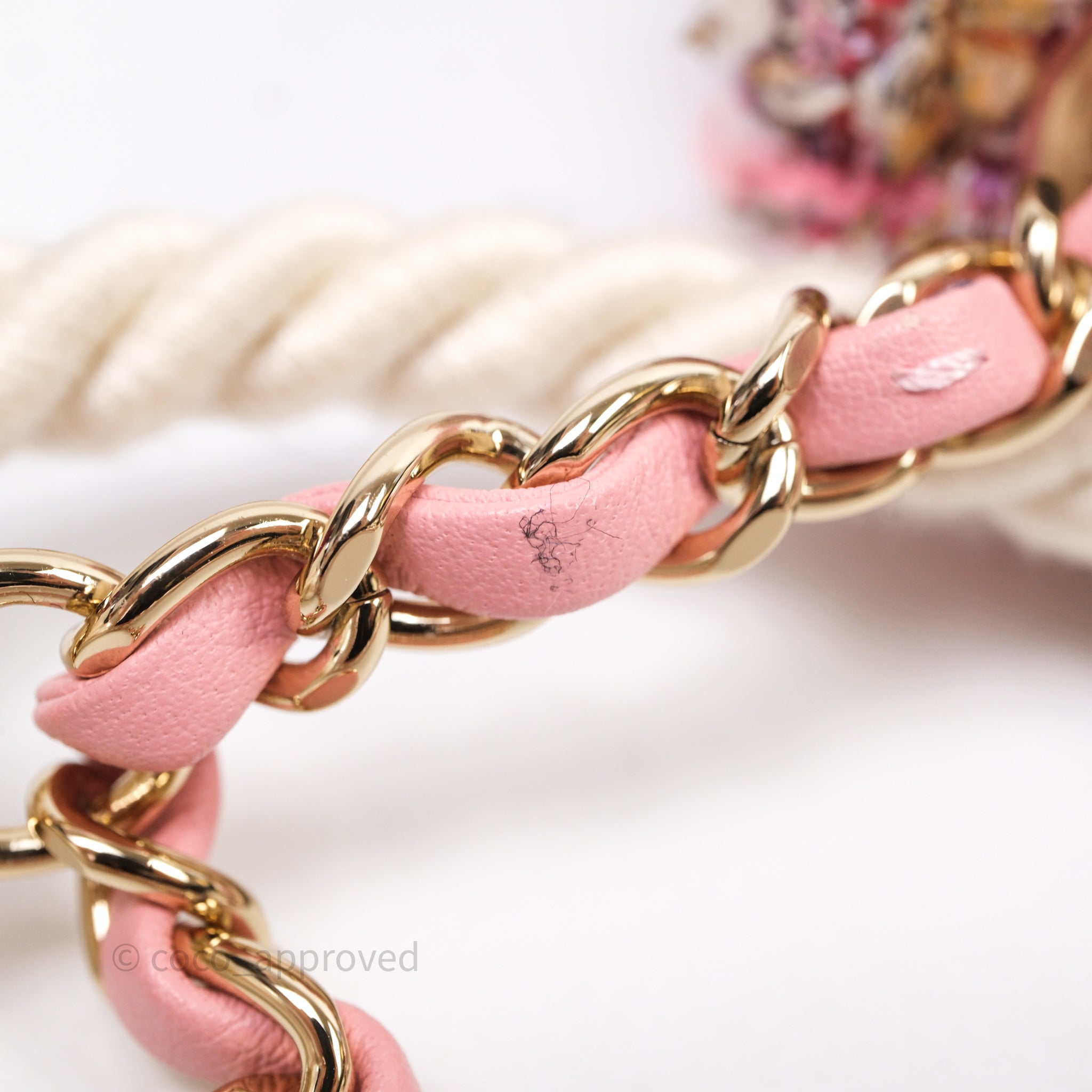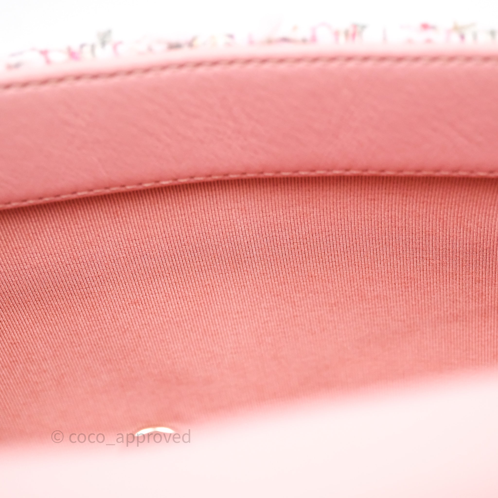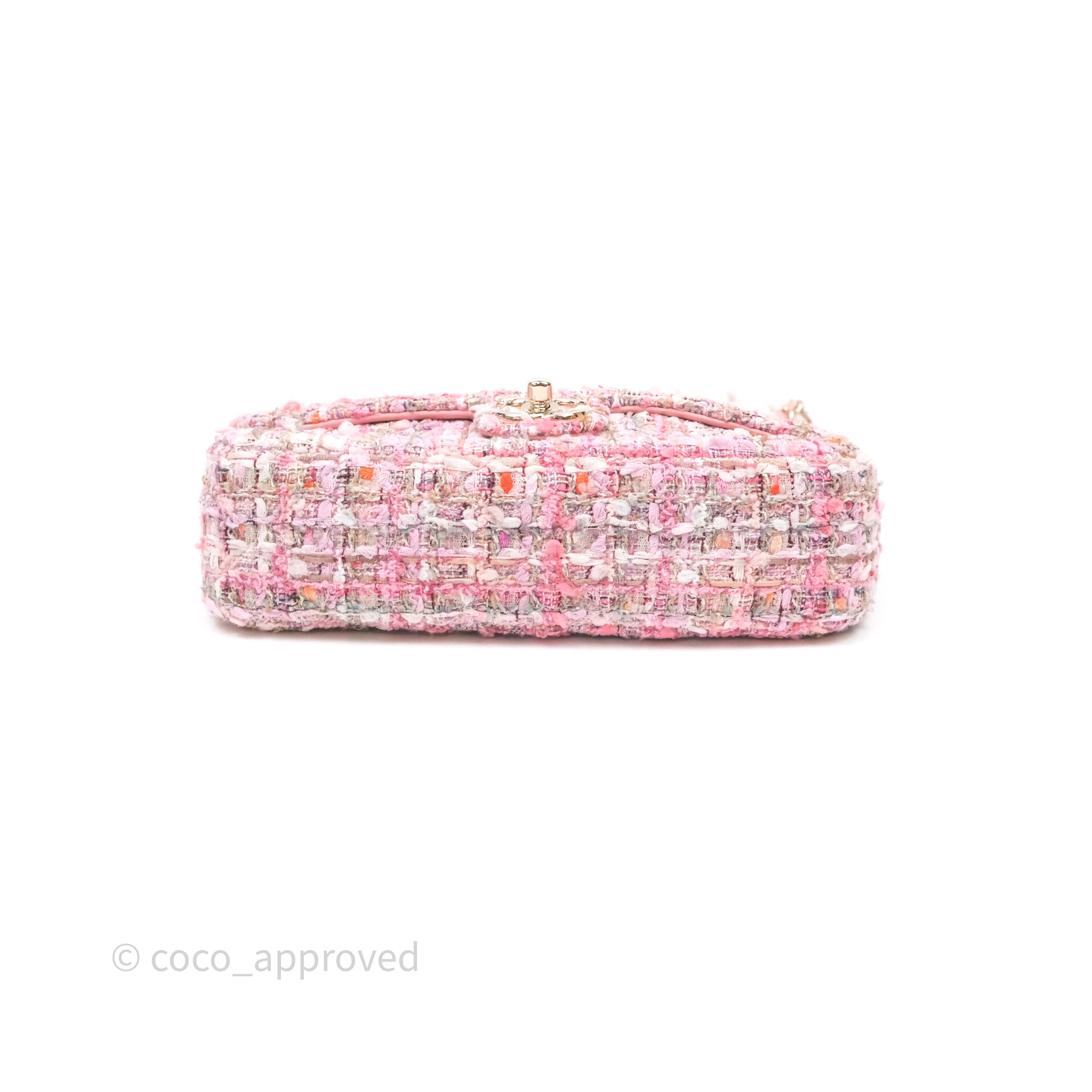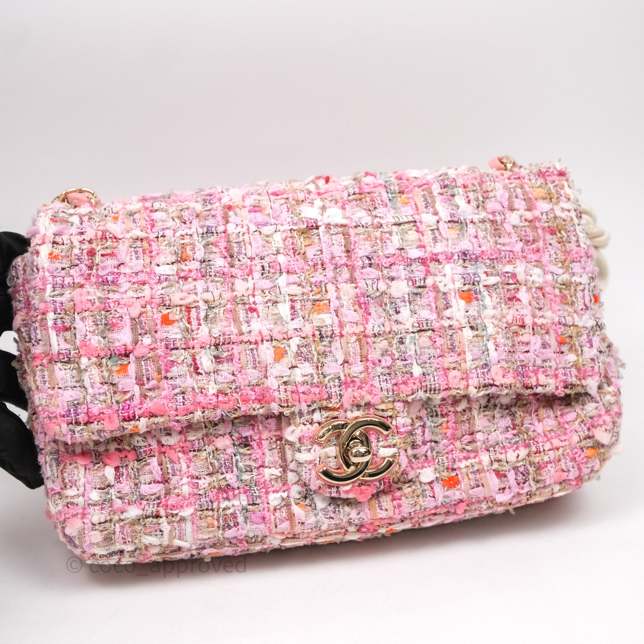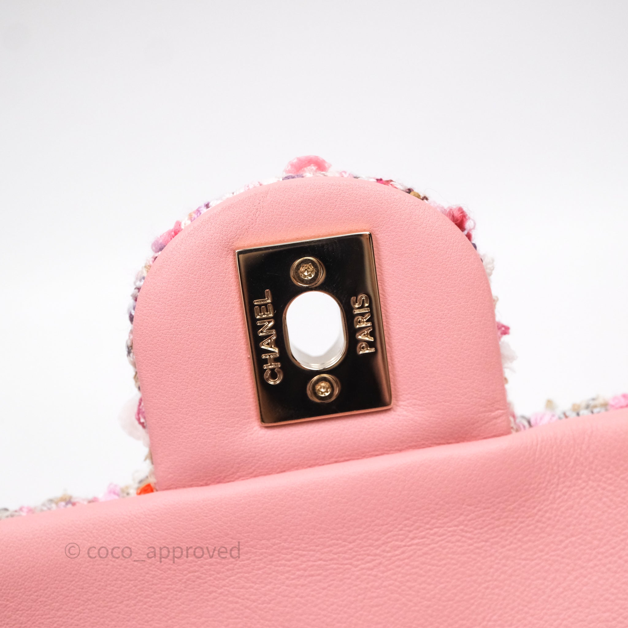 Chanel Pink Tweed Flap Bag With Large Pearl Handle Gold Hardware