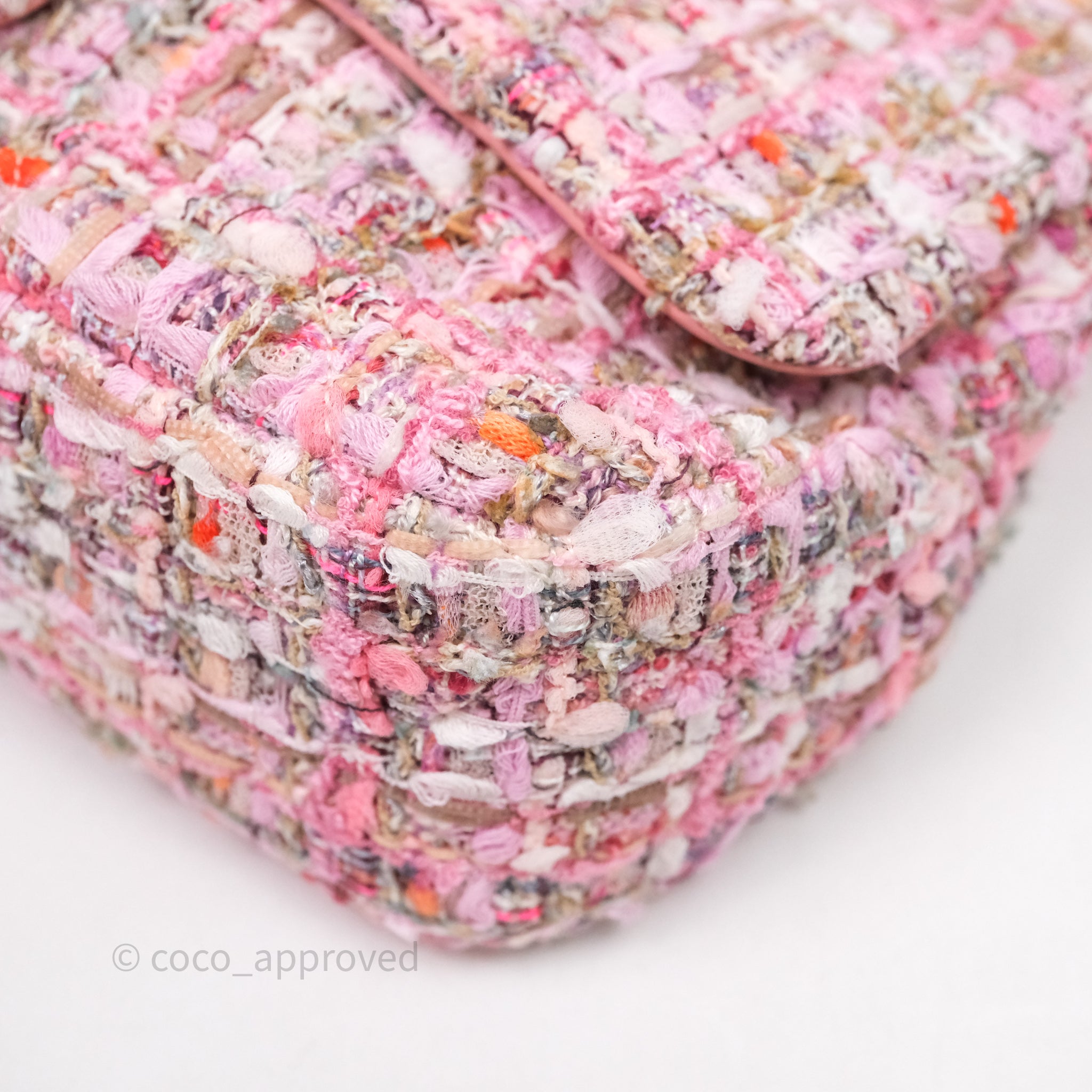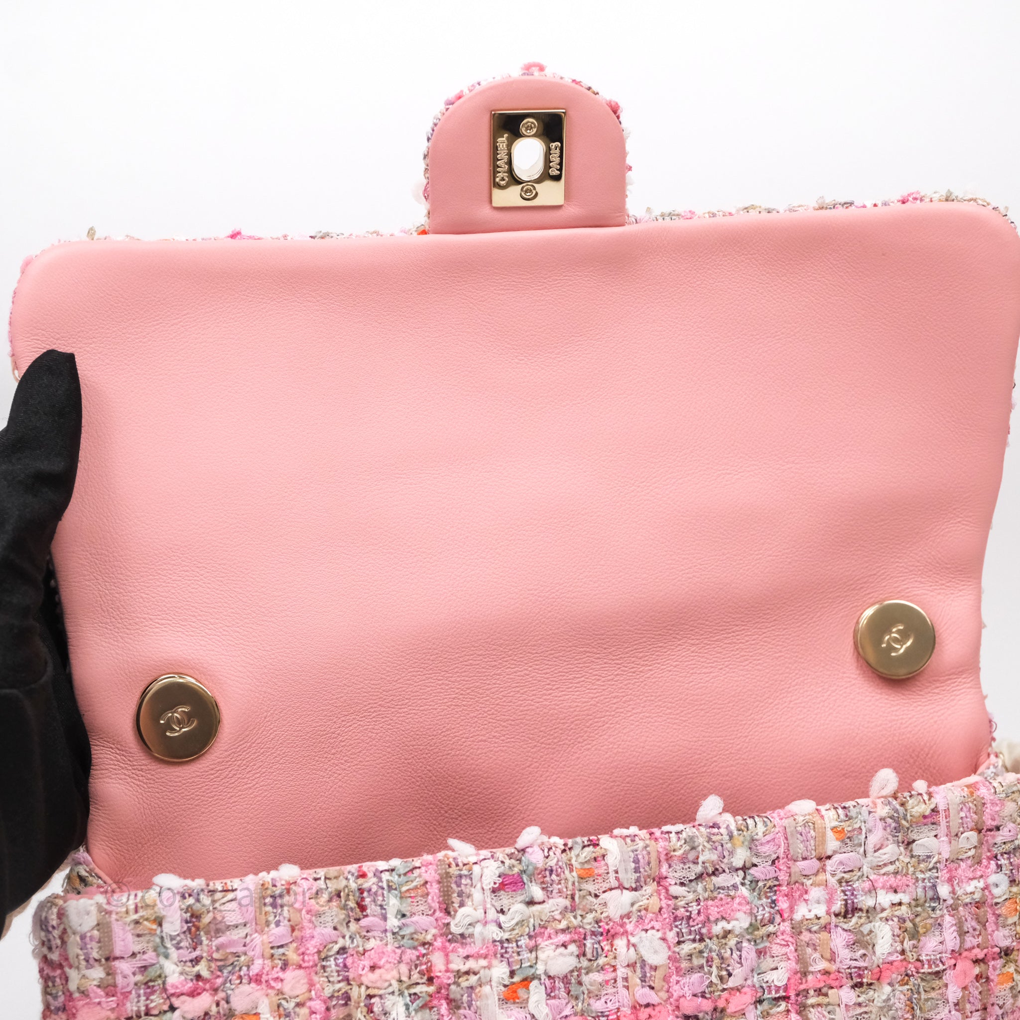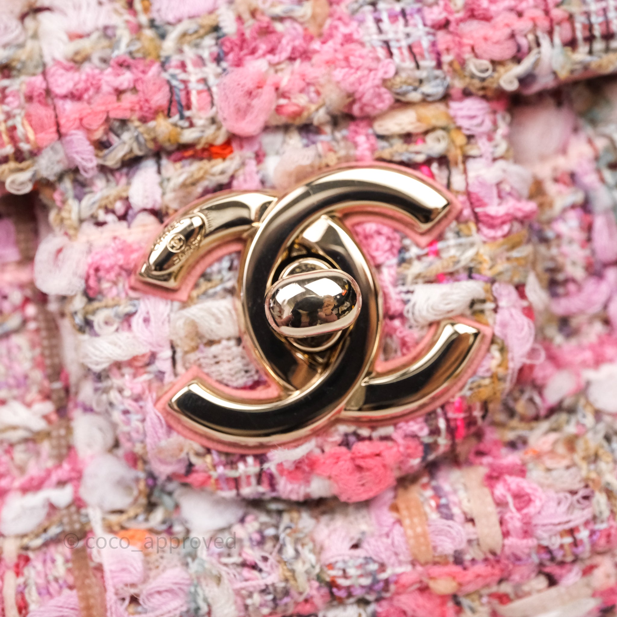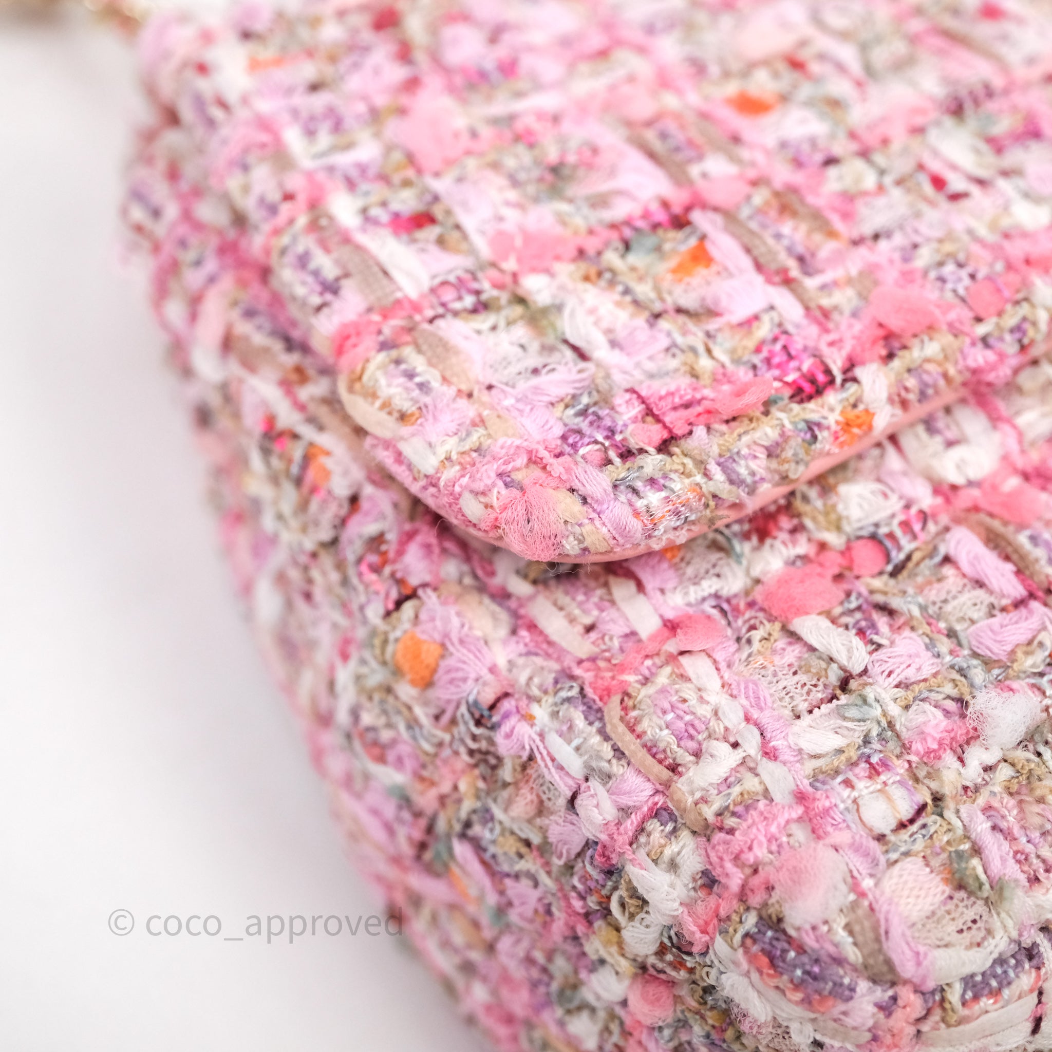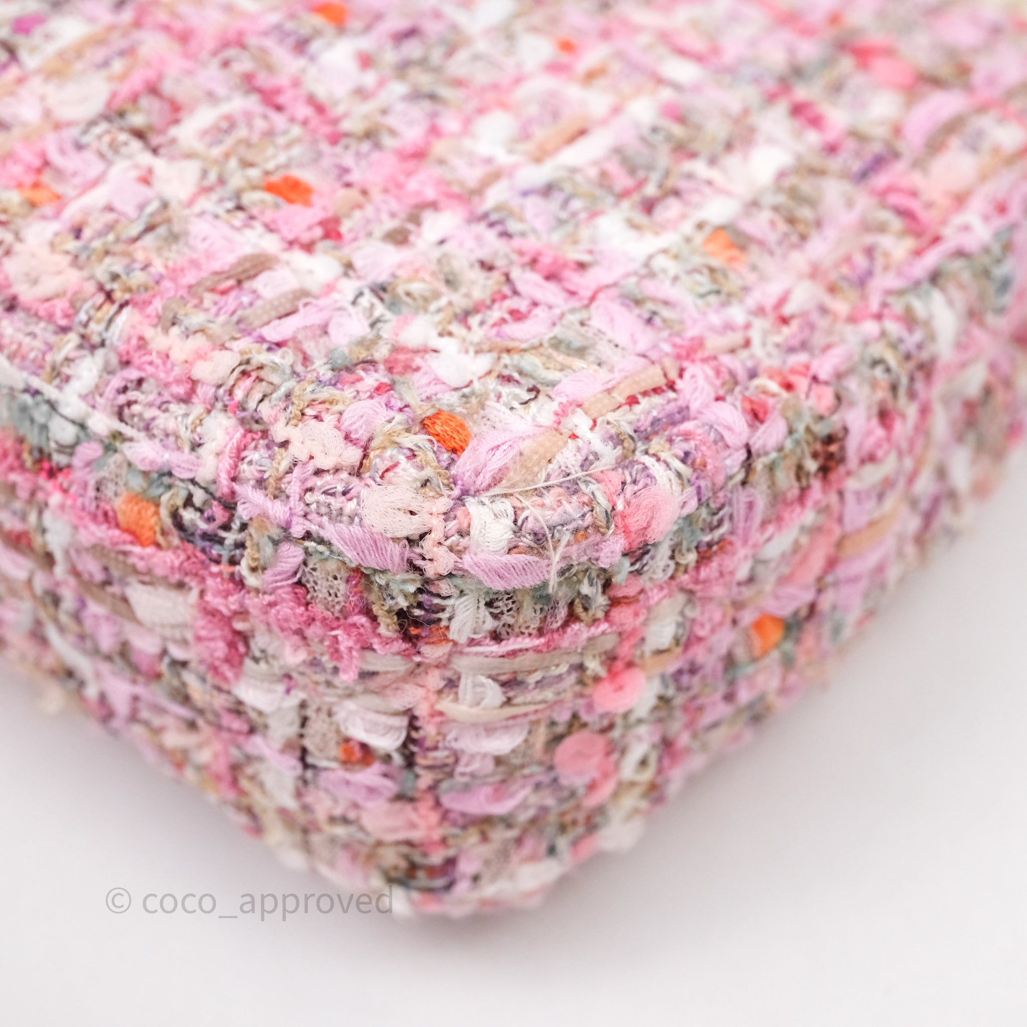 Chanel Pink Tweed Flap Bag With Large Pearl Handle Gold Hardware
