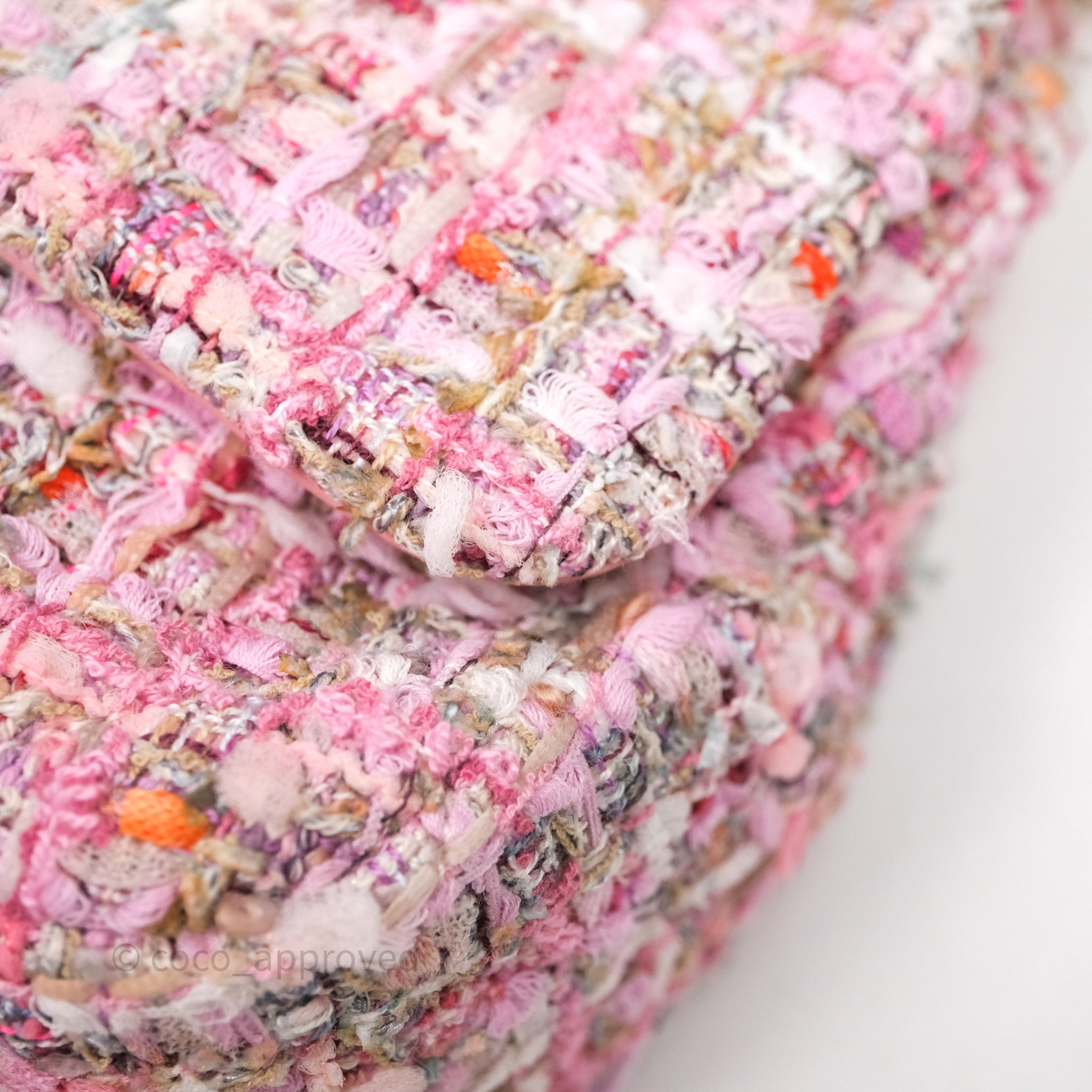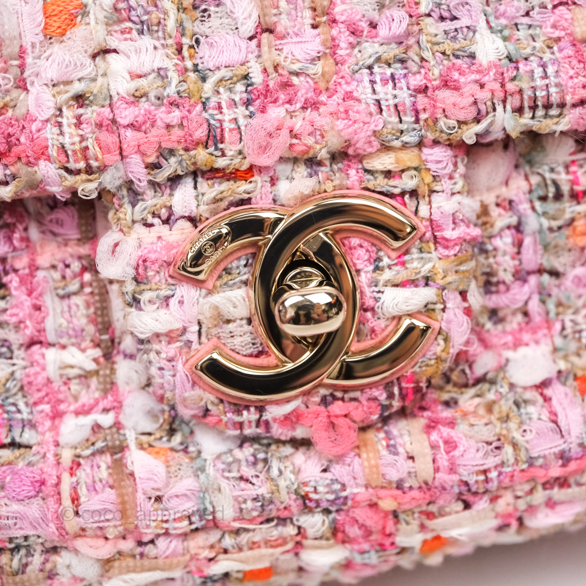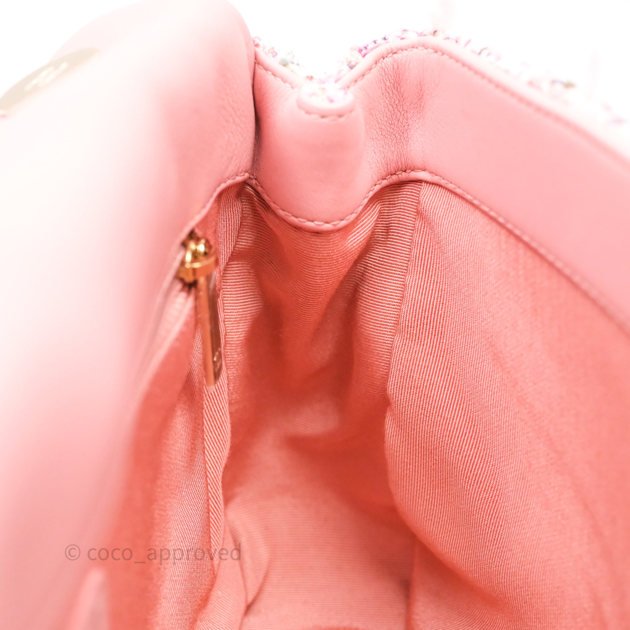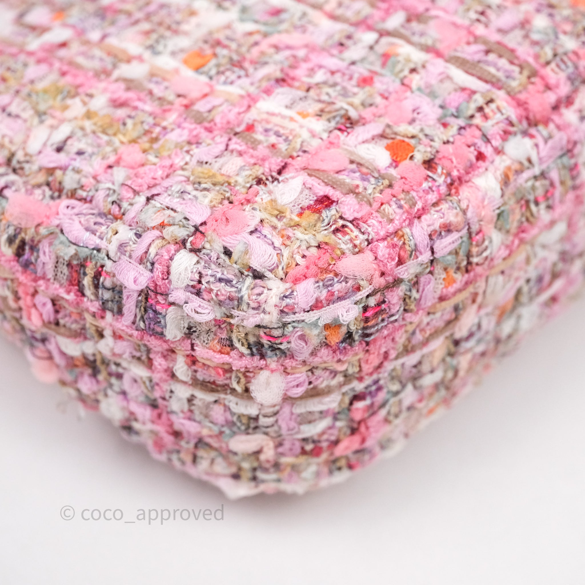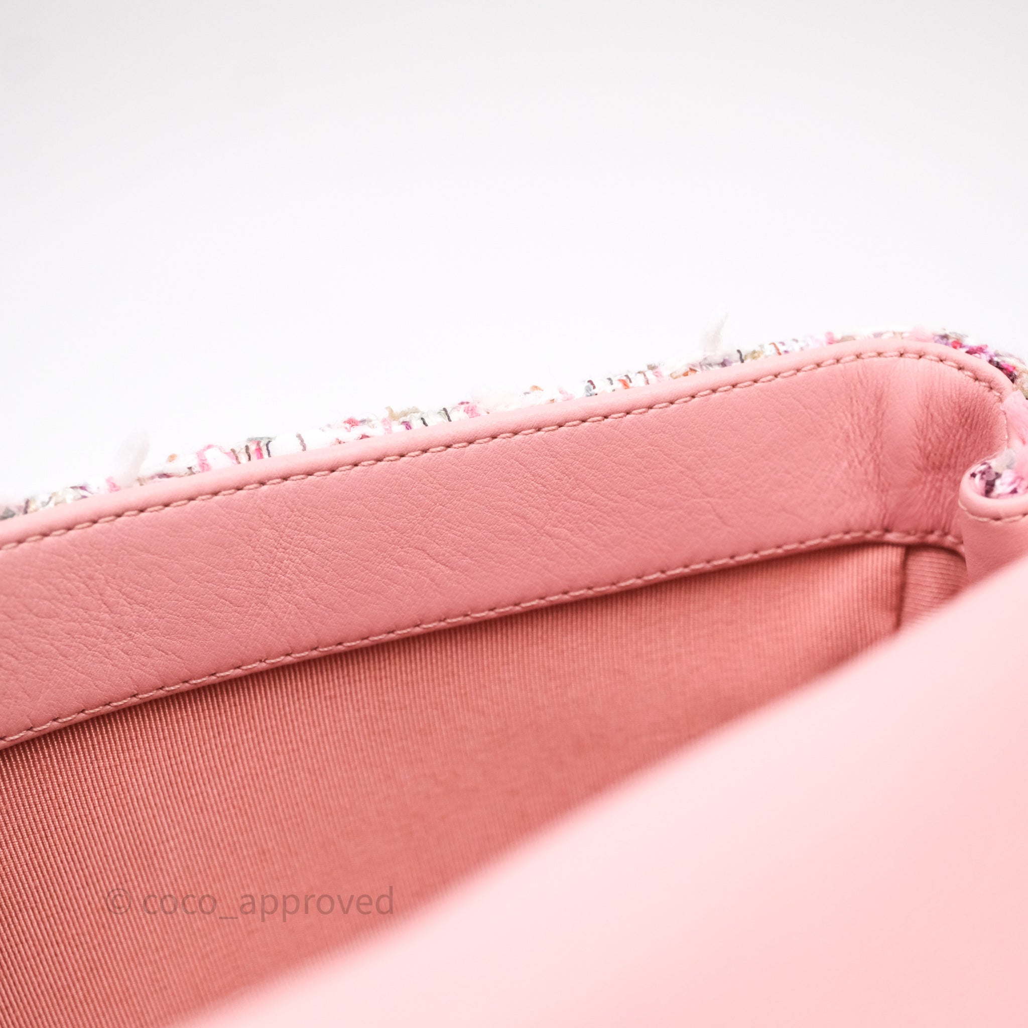 Chanel Pink Tweed Flap Bag With Large Pearl Handle Gold Hardware