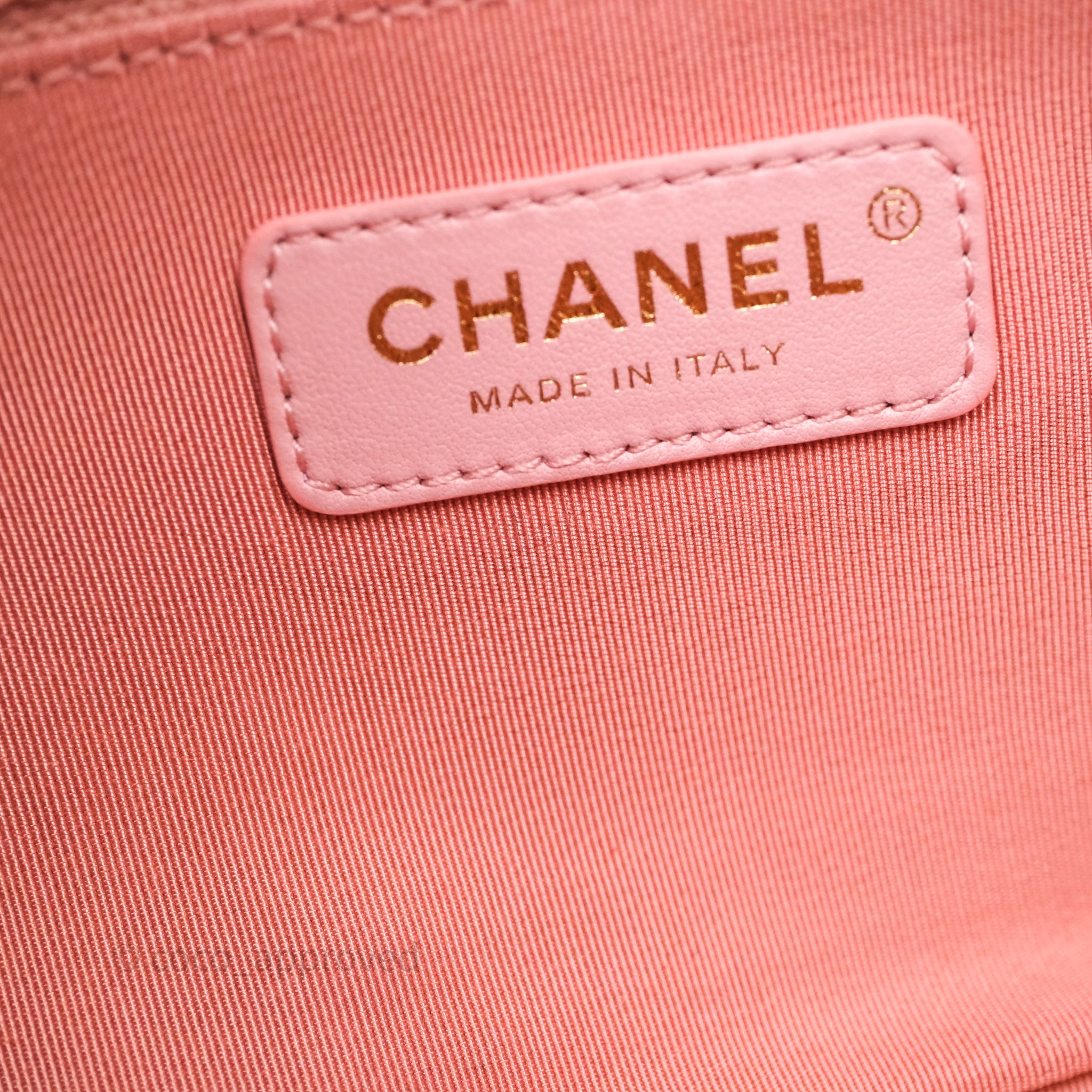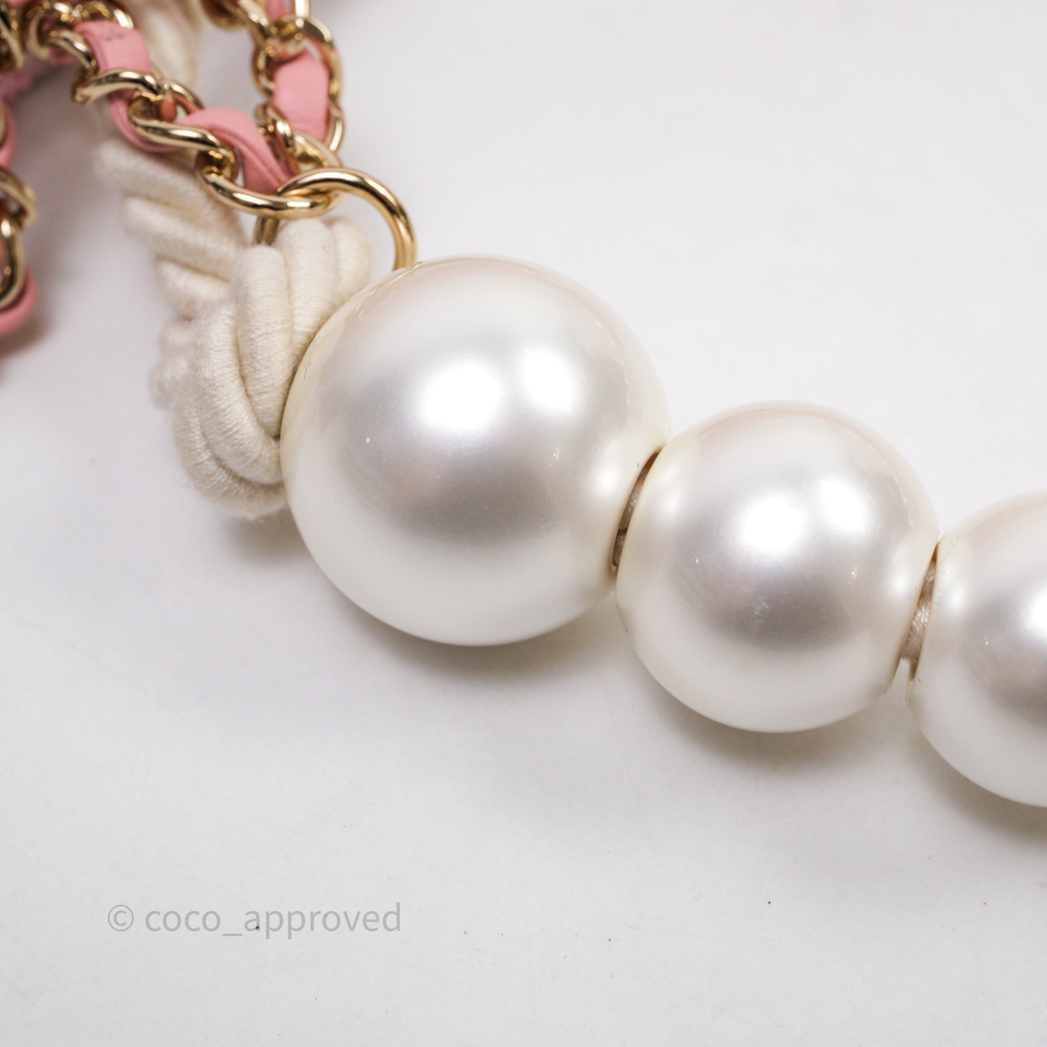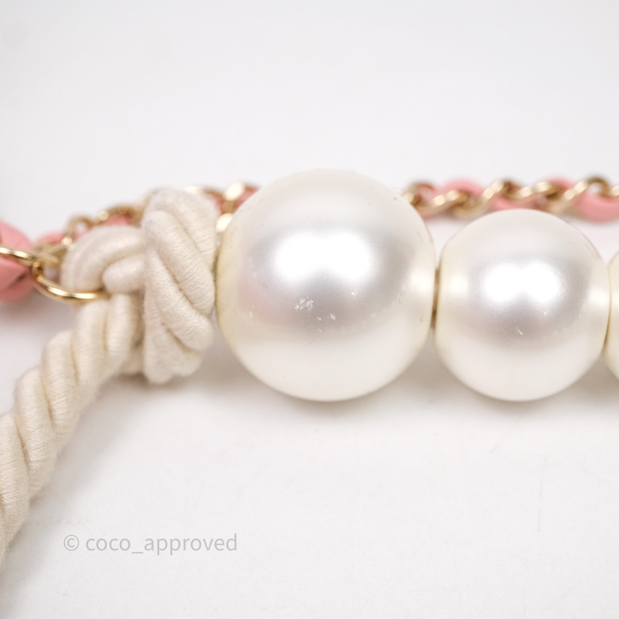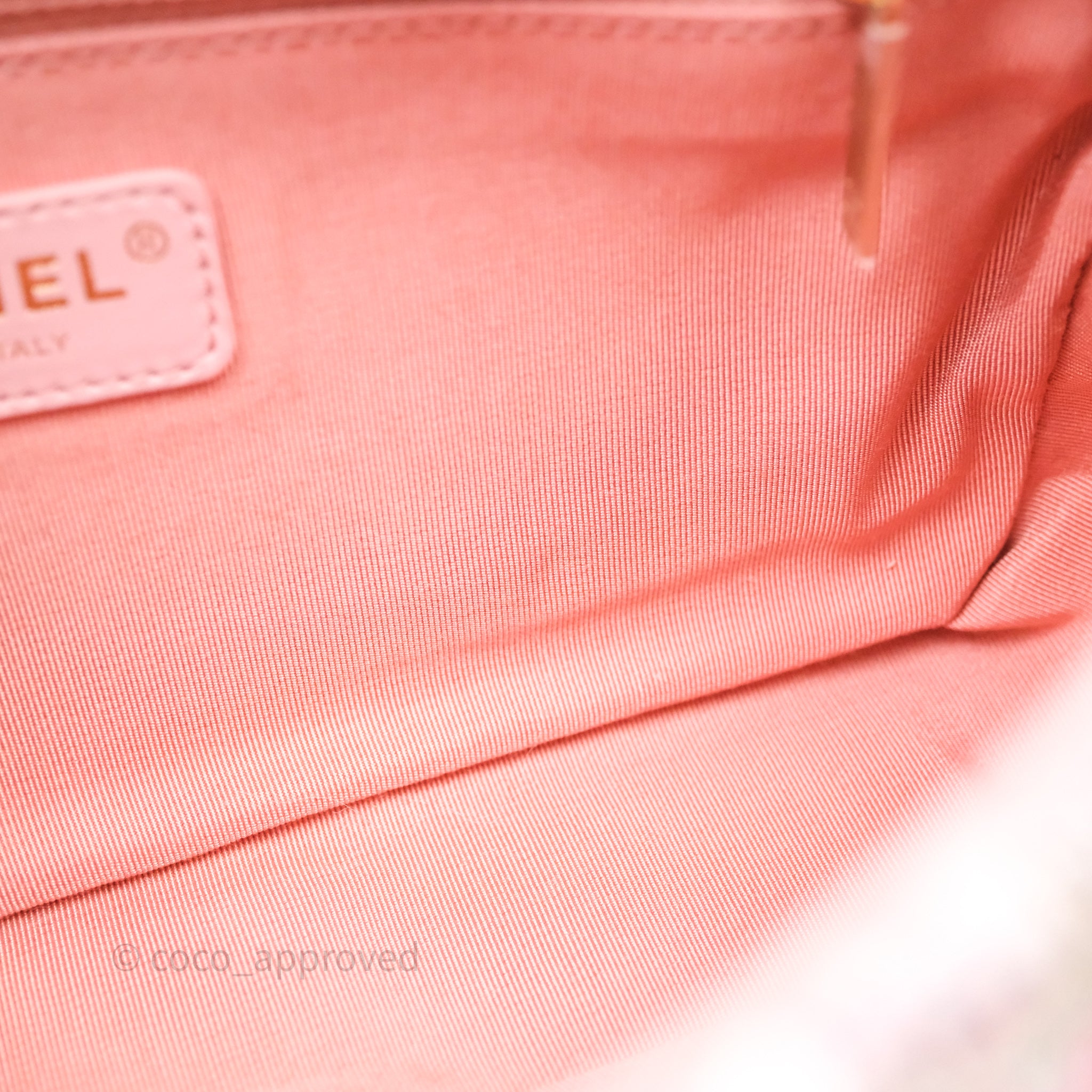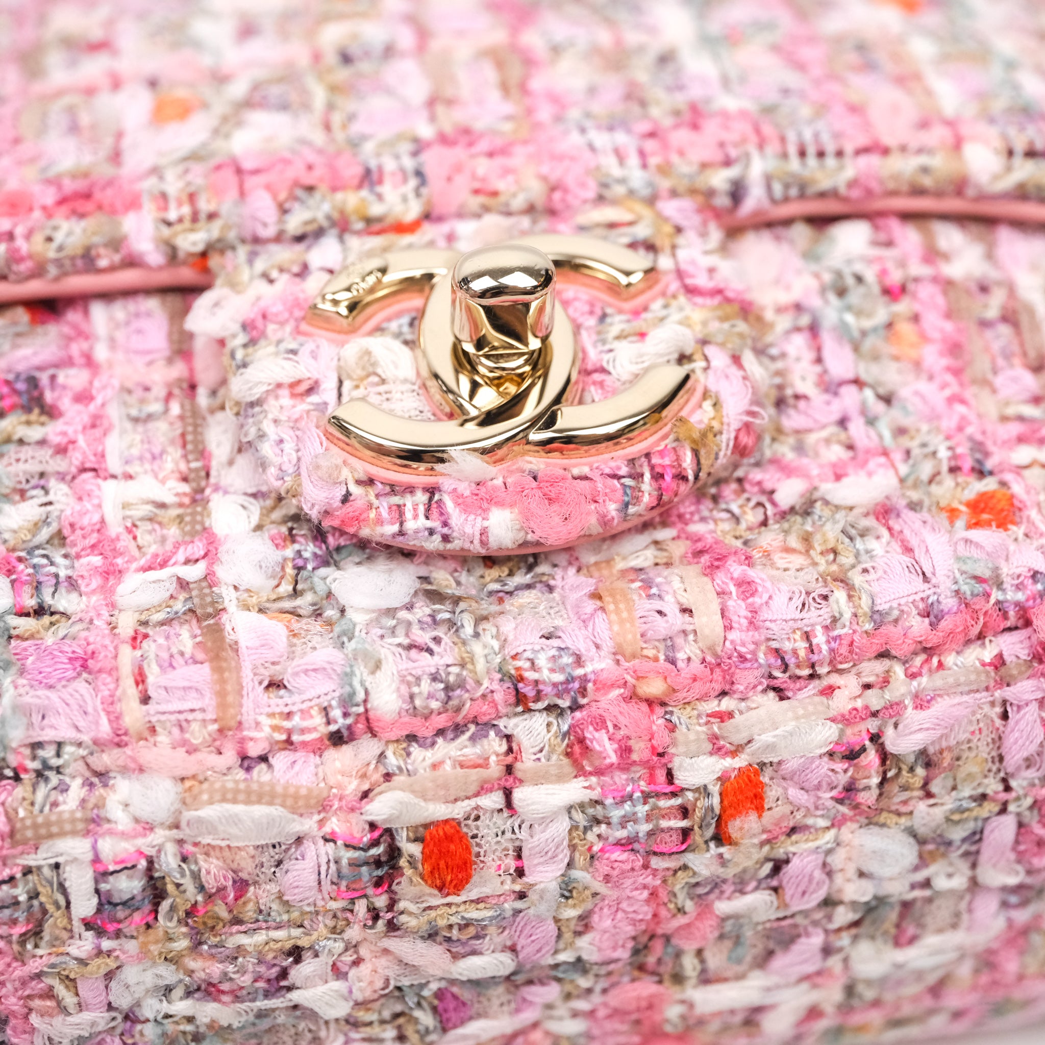 Chanel Pink Tweed Flap Bag With Large Pearl Handle Gold Hardware