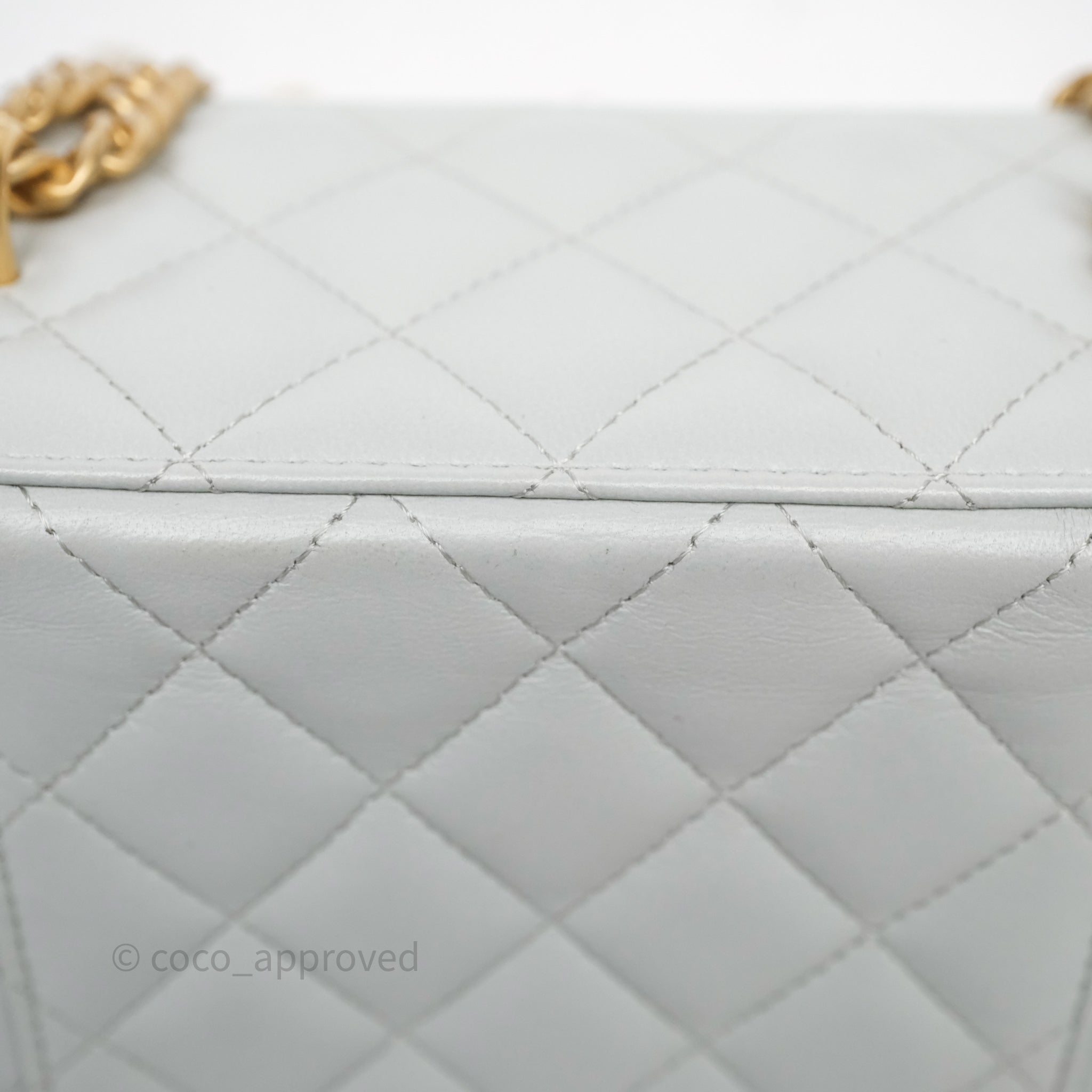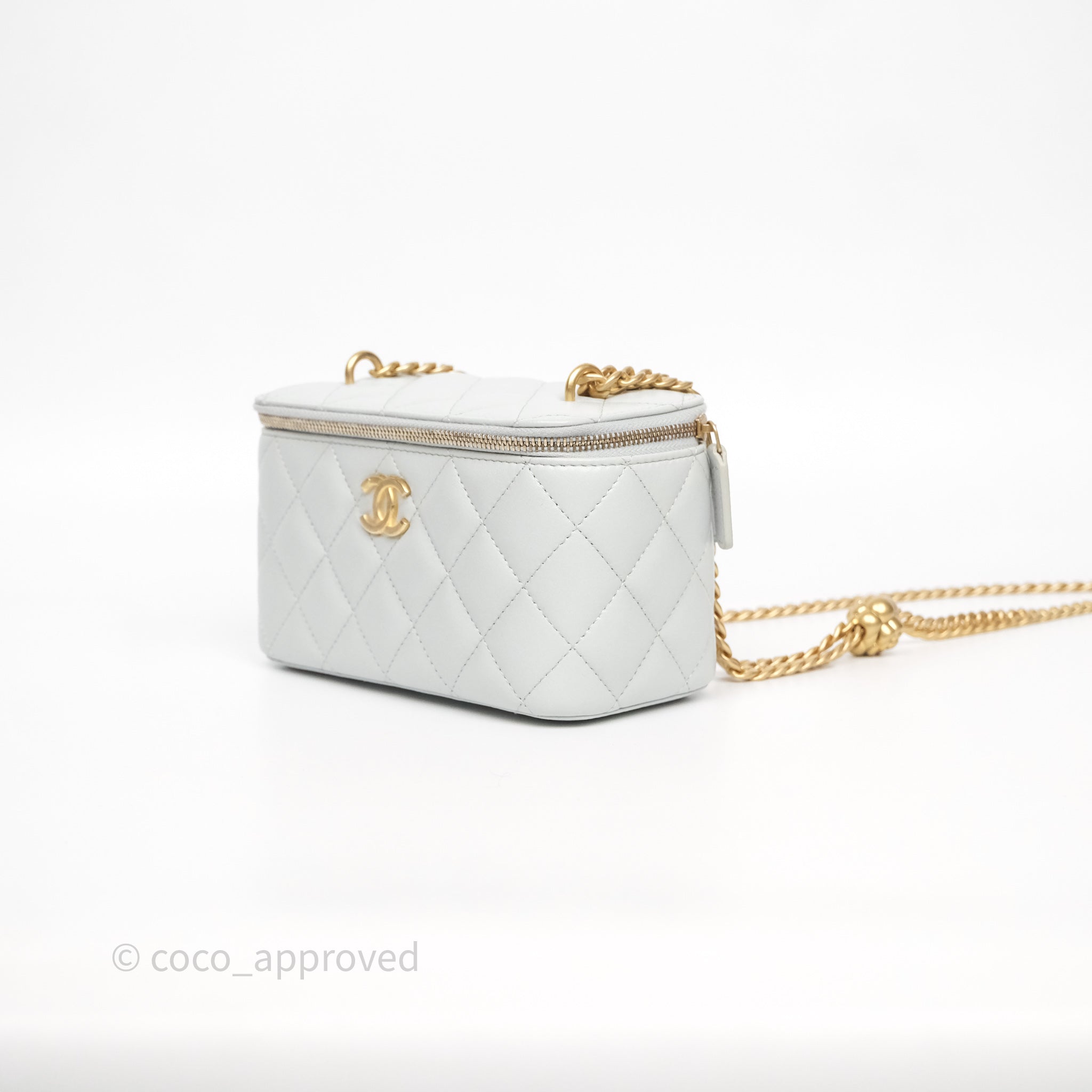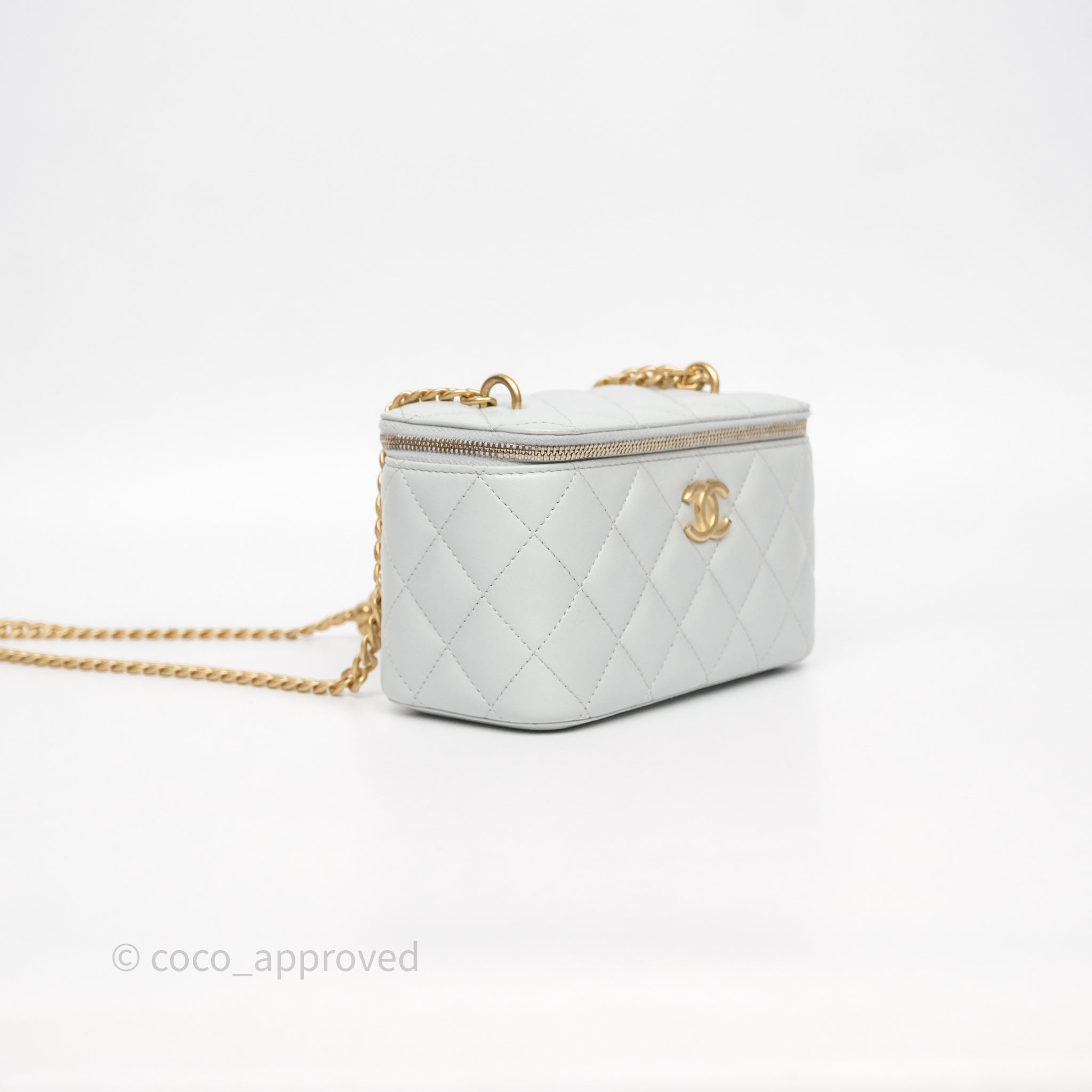 Chanel Quilted Vanity Rectangular with Camellia Adjustable Chain Blue Grey Lambskin Aged Gold Hardware