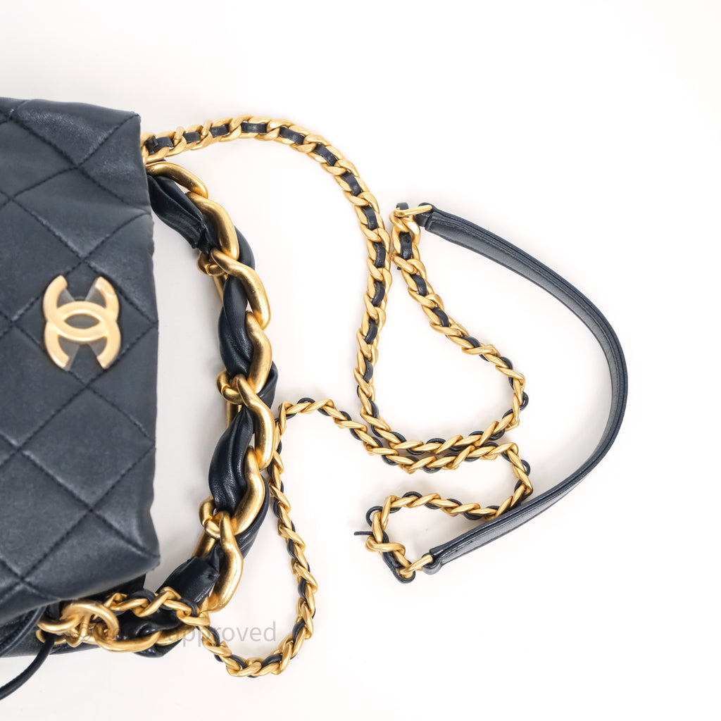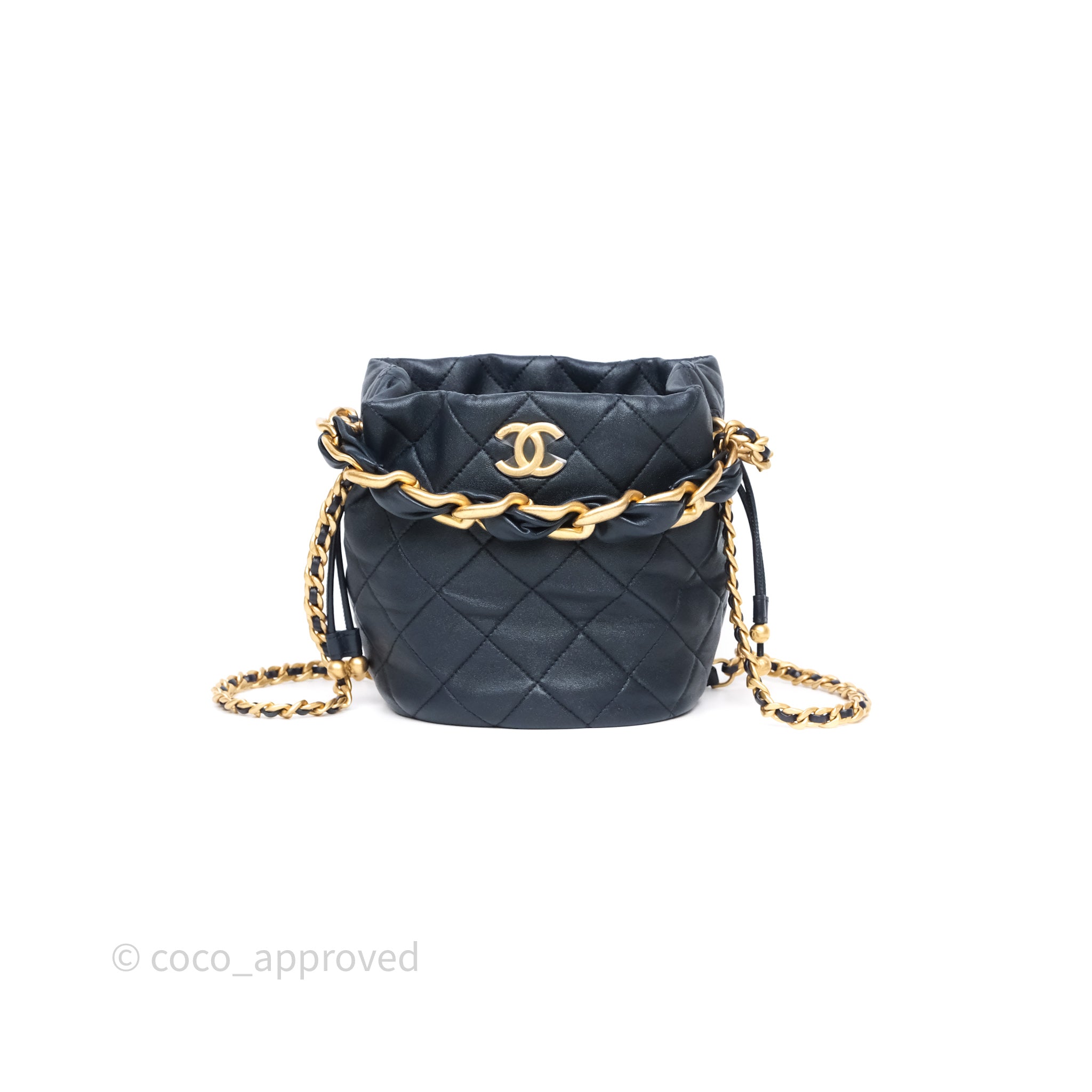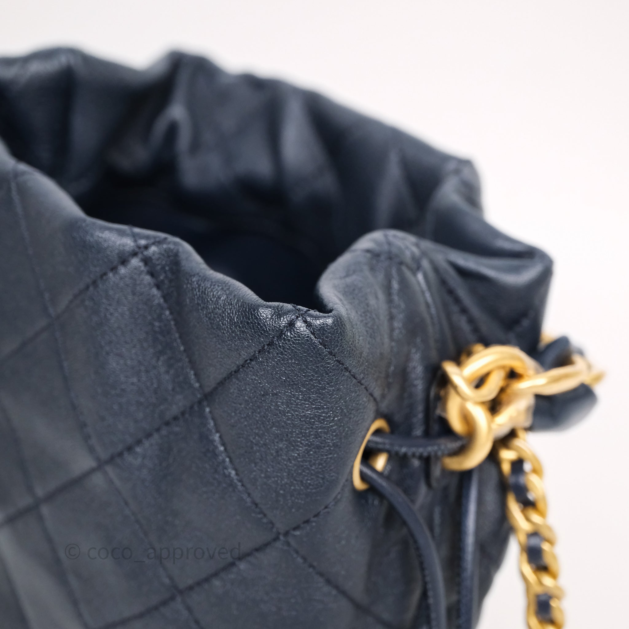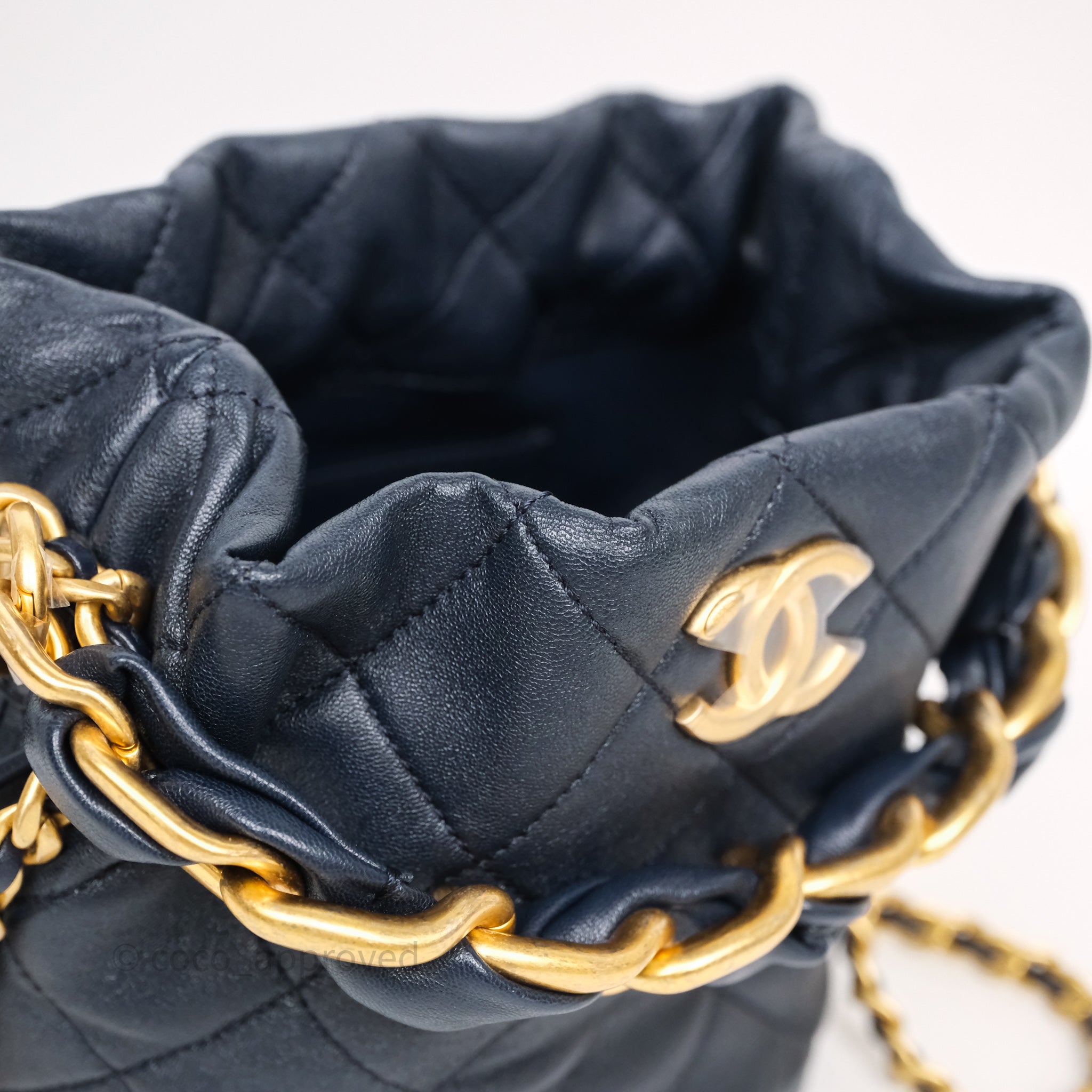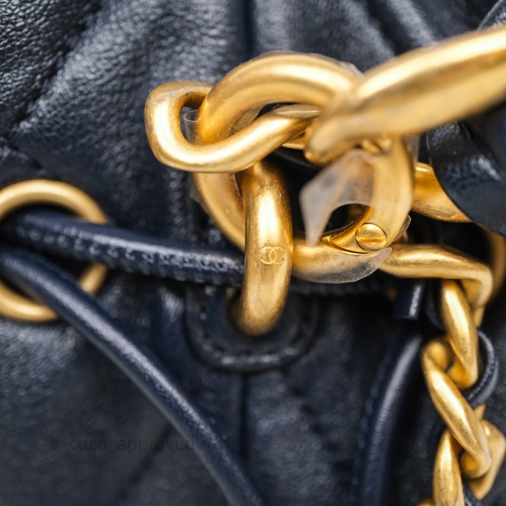 Chanel Small Entwined Chain Drawstring Bucket Bag Navy Lambskin Age Gold Hardware