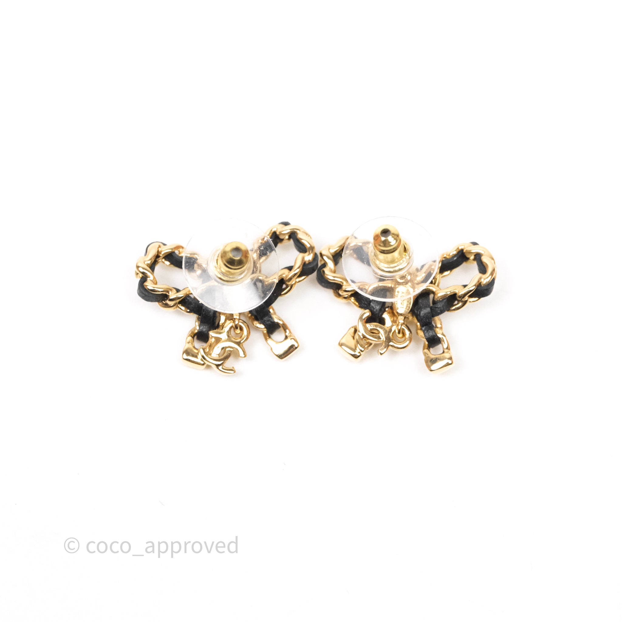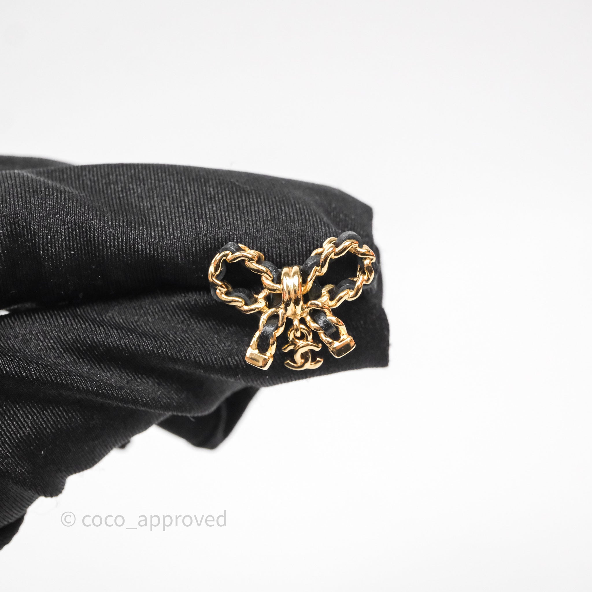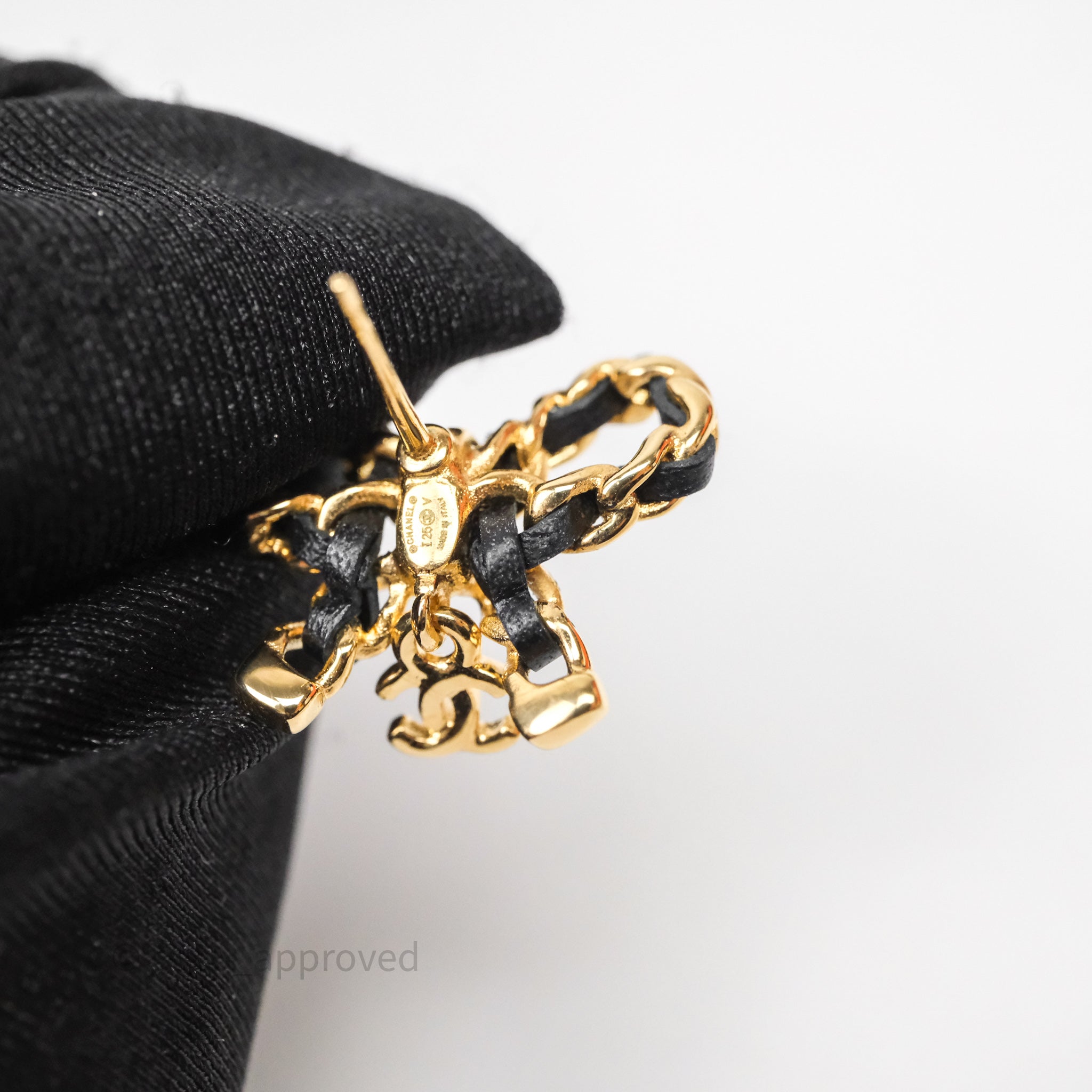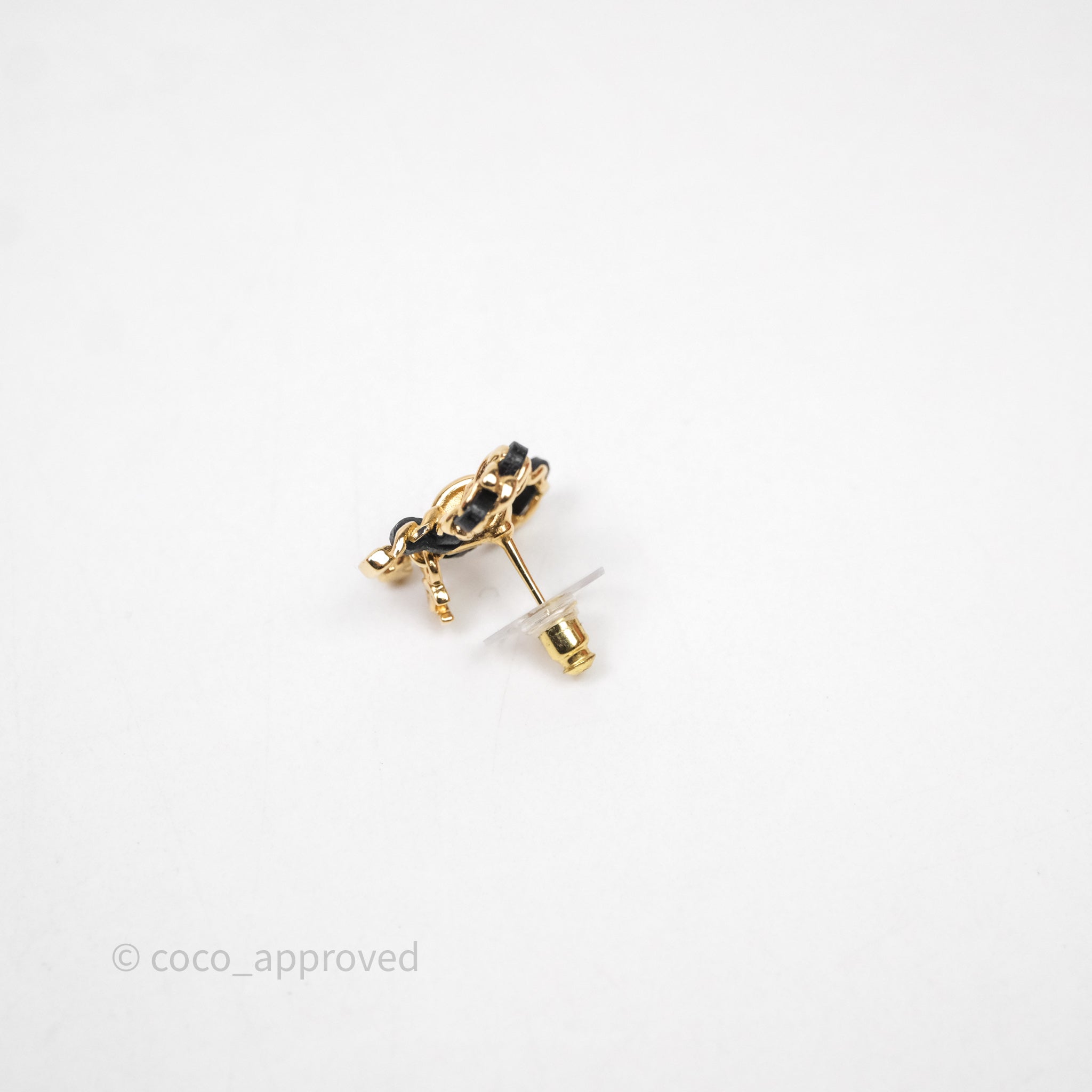 Chanel Woven Ribbon Bow Black Earrings Gold Tone 25V