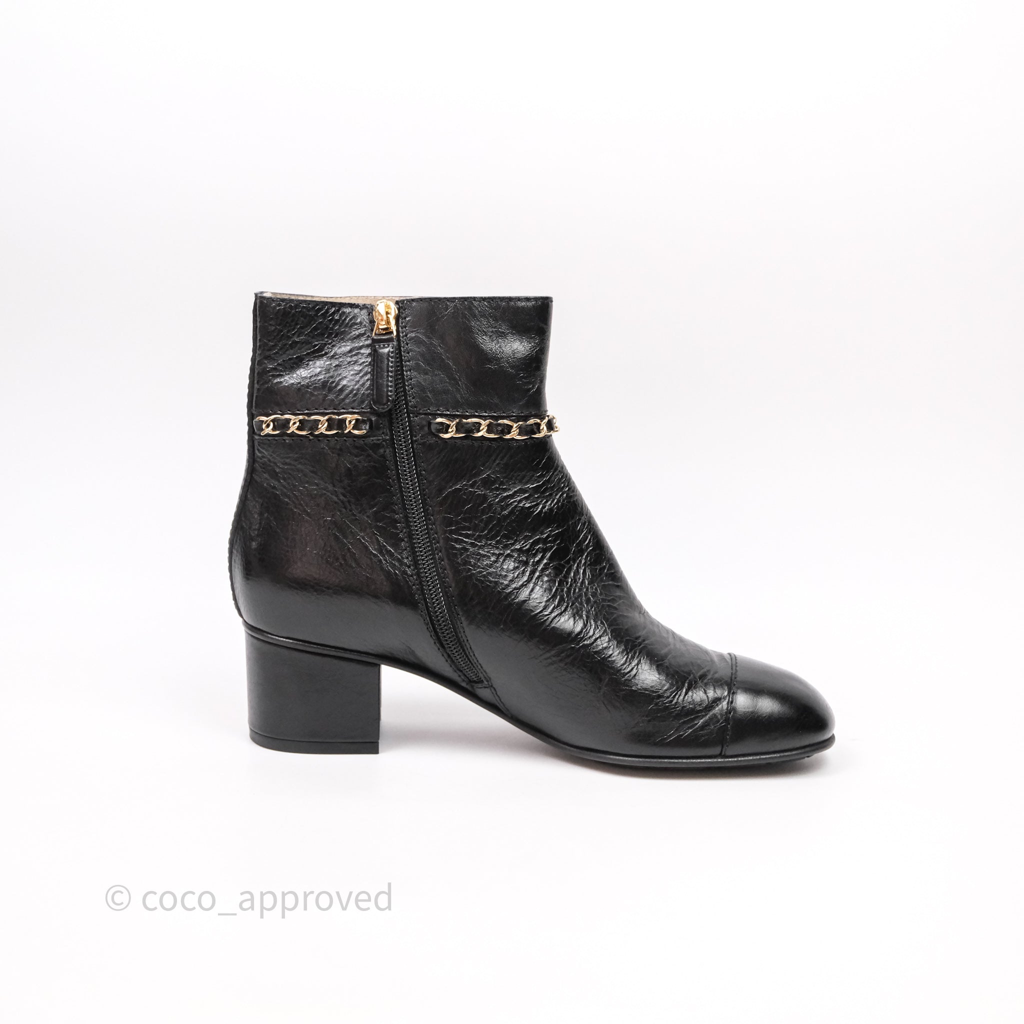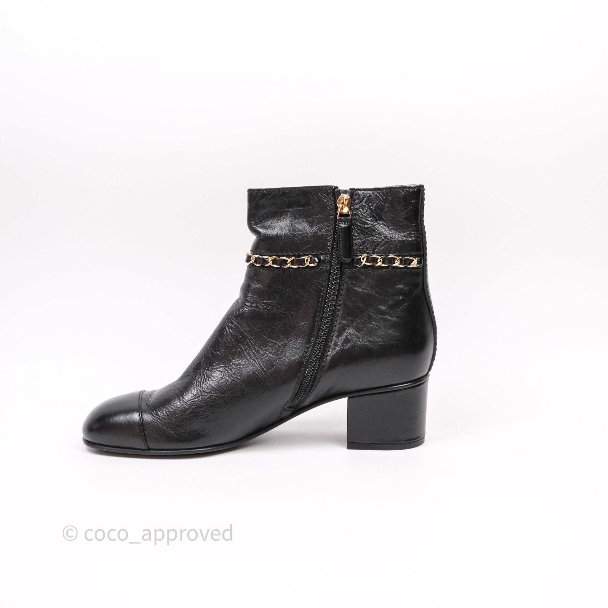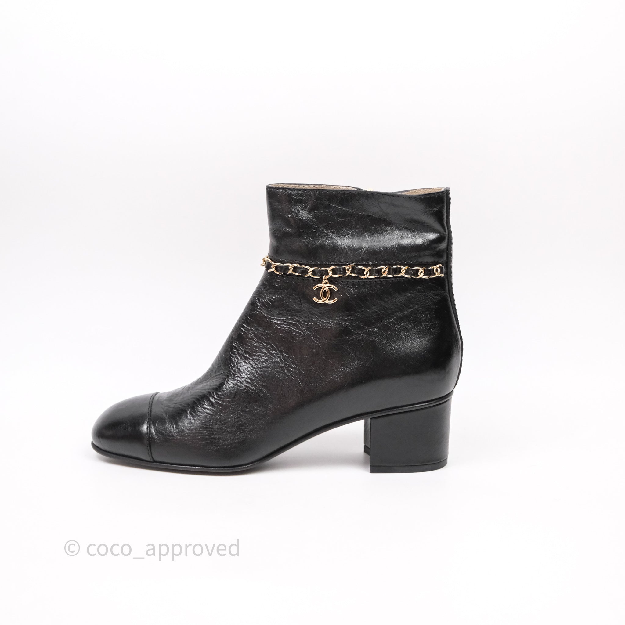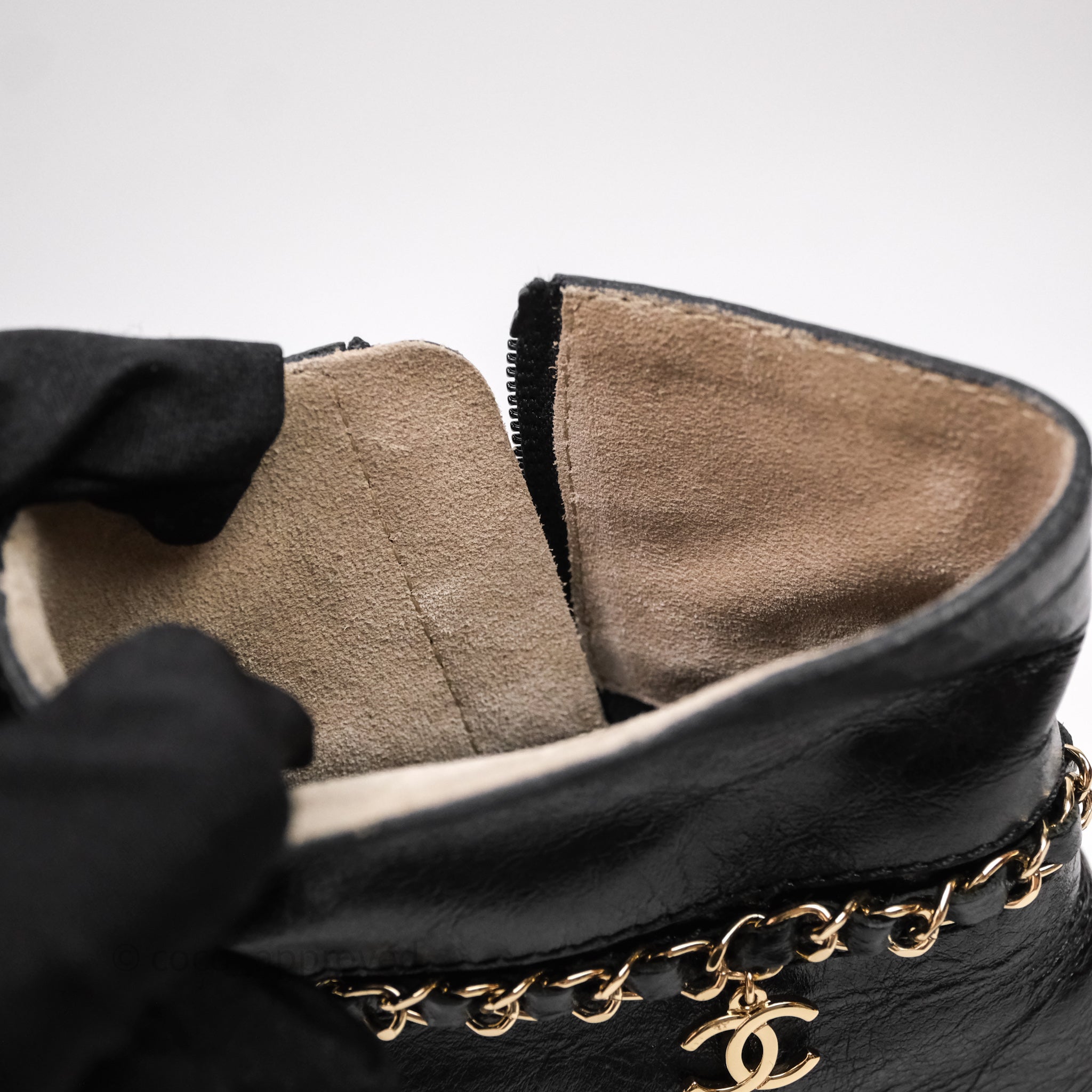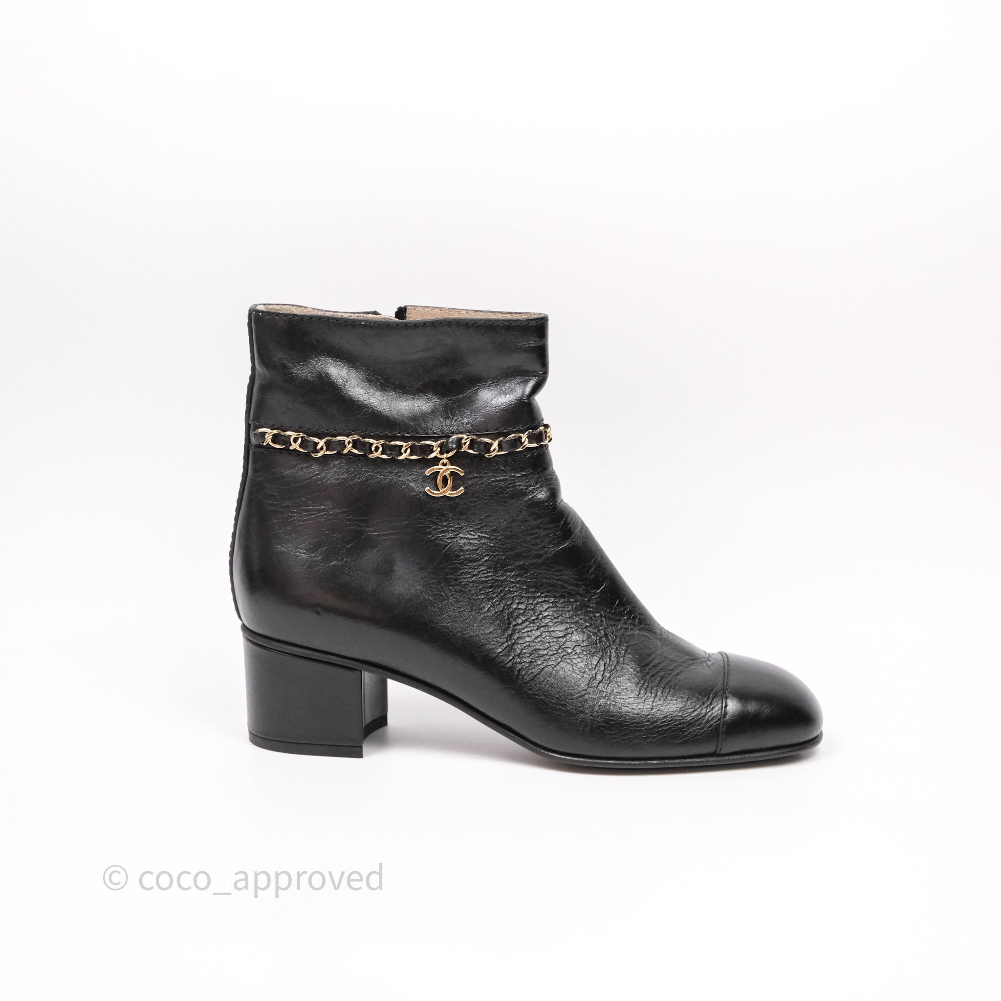 Chanel CC Black Leather Chain Ankle Boots Size 39