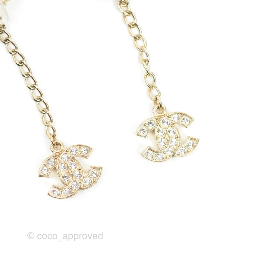 Chanel Pearl Chain Crystal CC Drop Earrings Gold Tone 20B