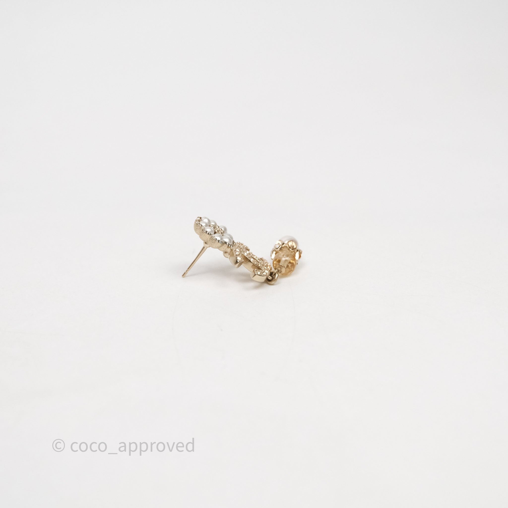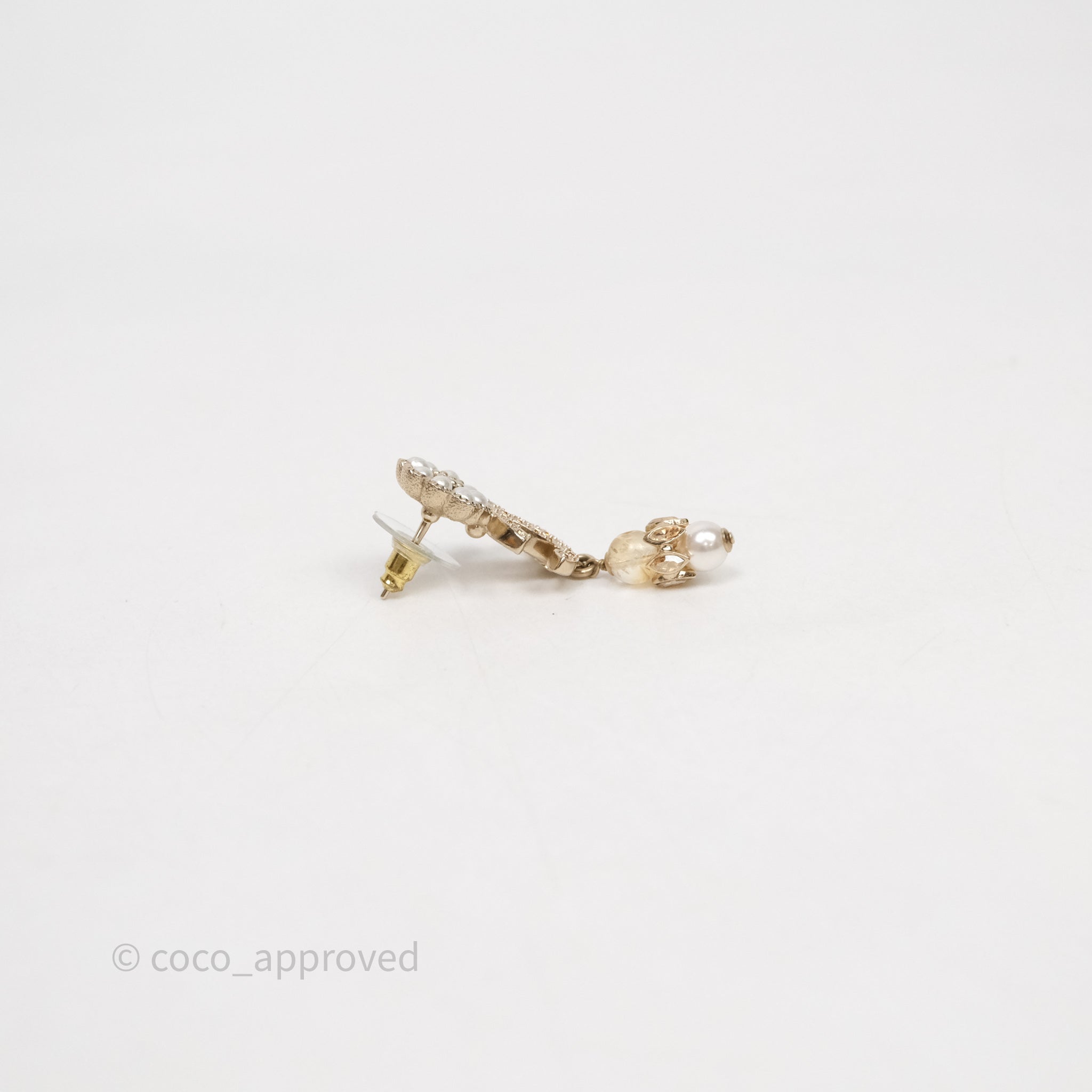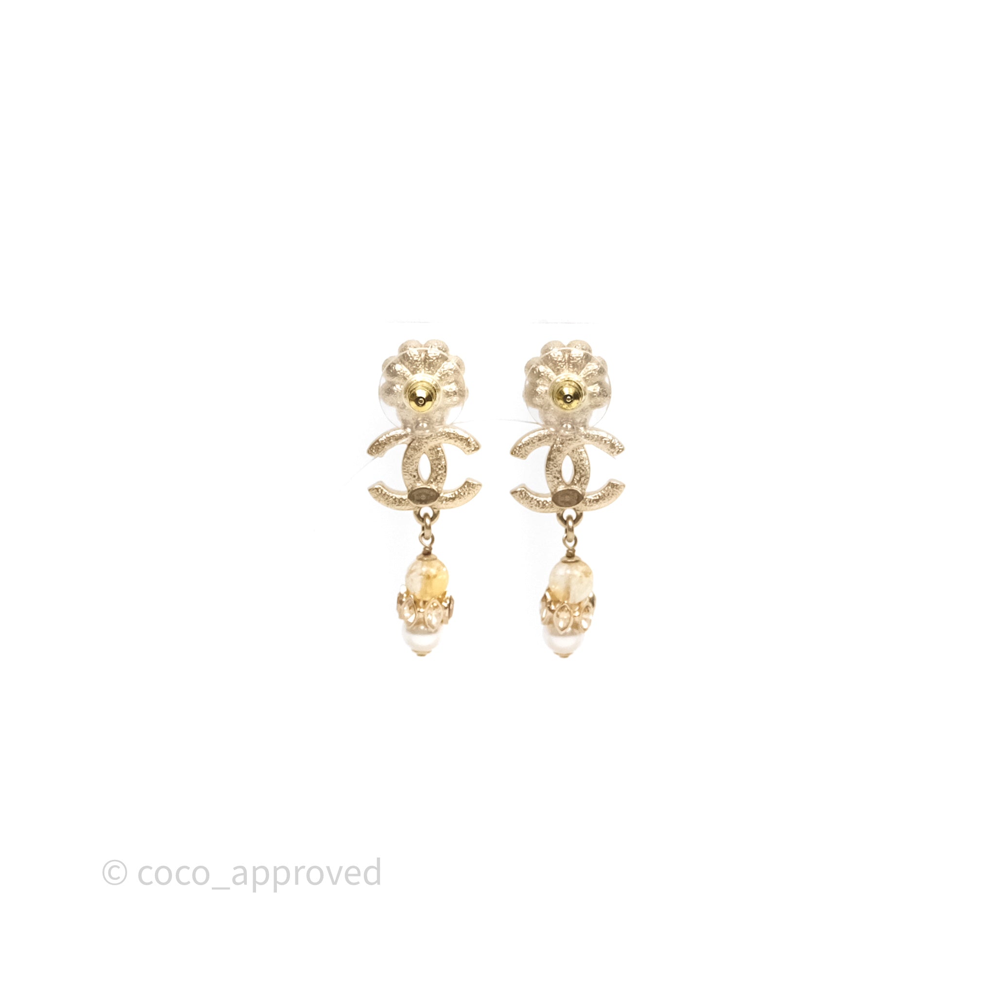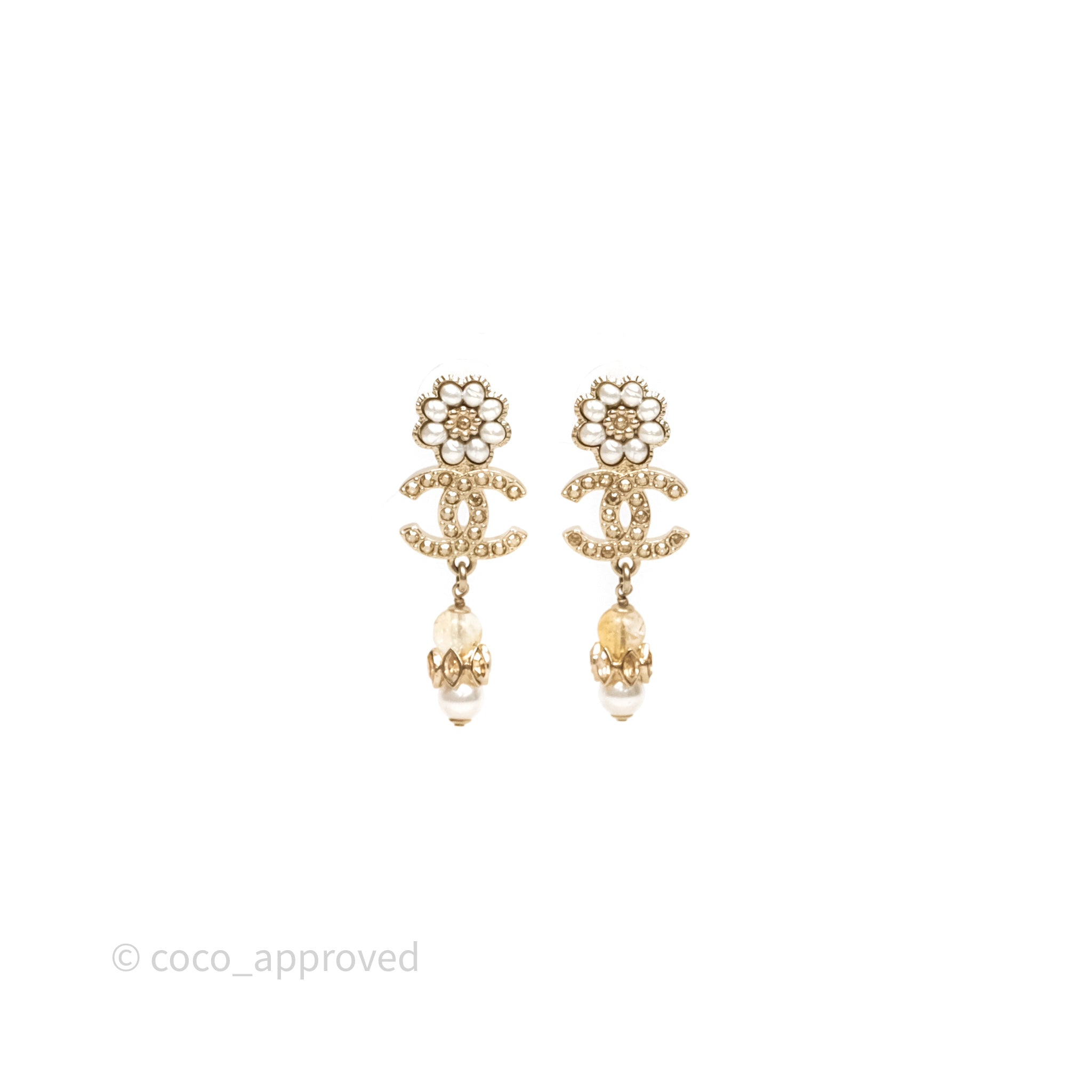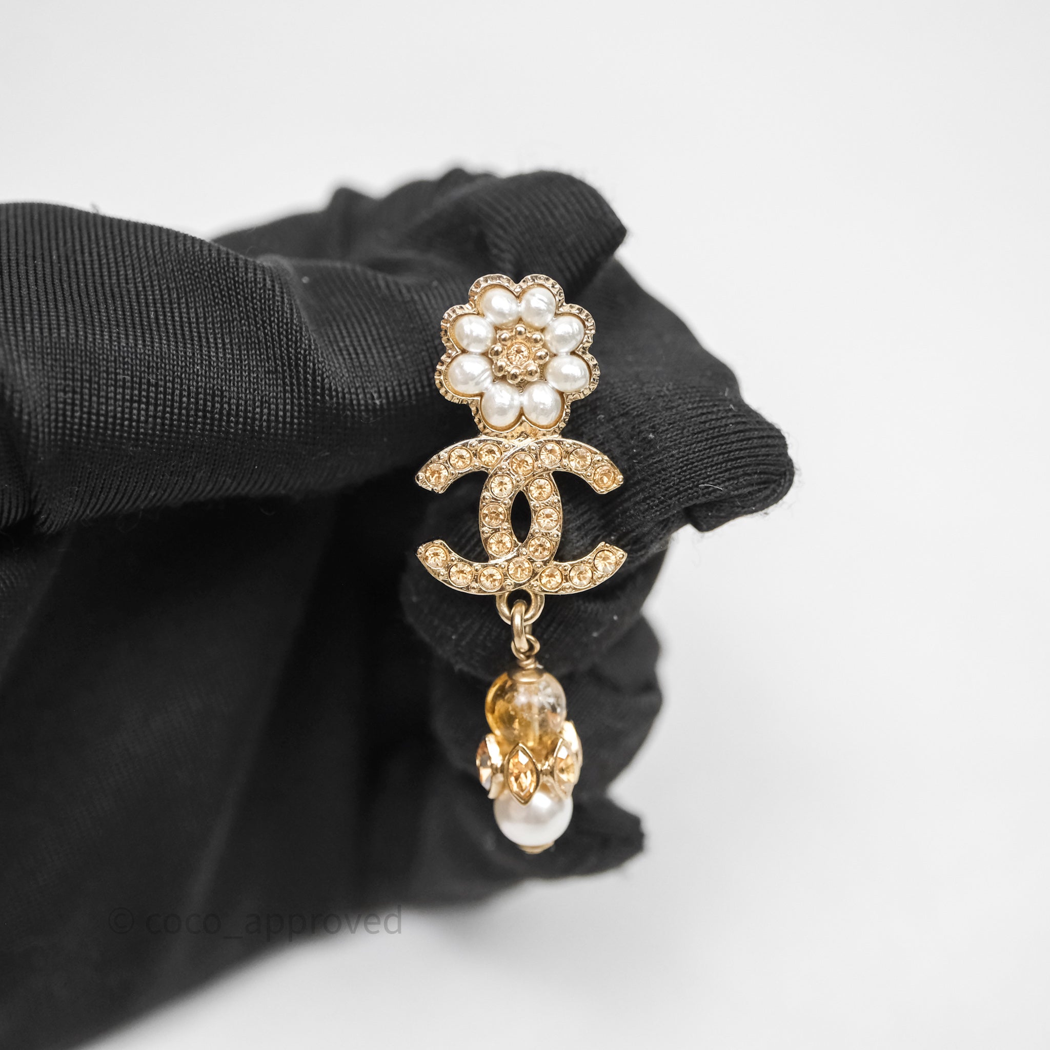 Chanel Pearl Flower CC Crystal Drop Earrings Gold Tone 22K