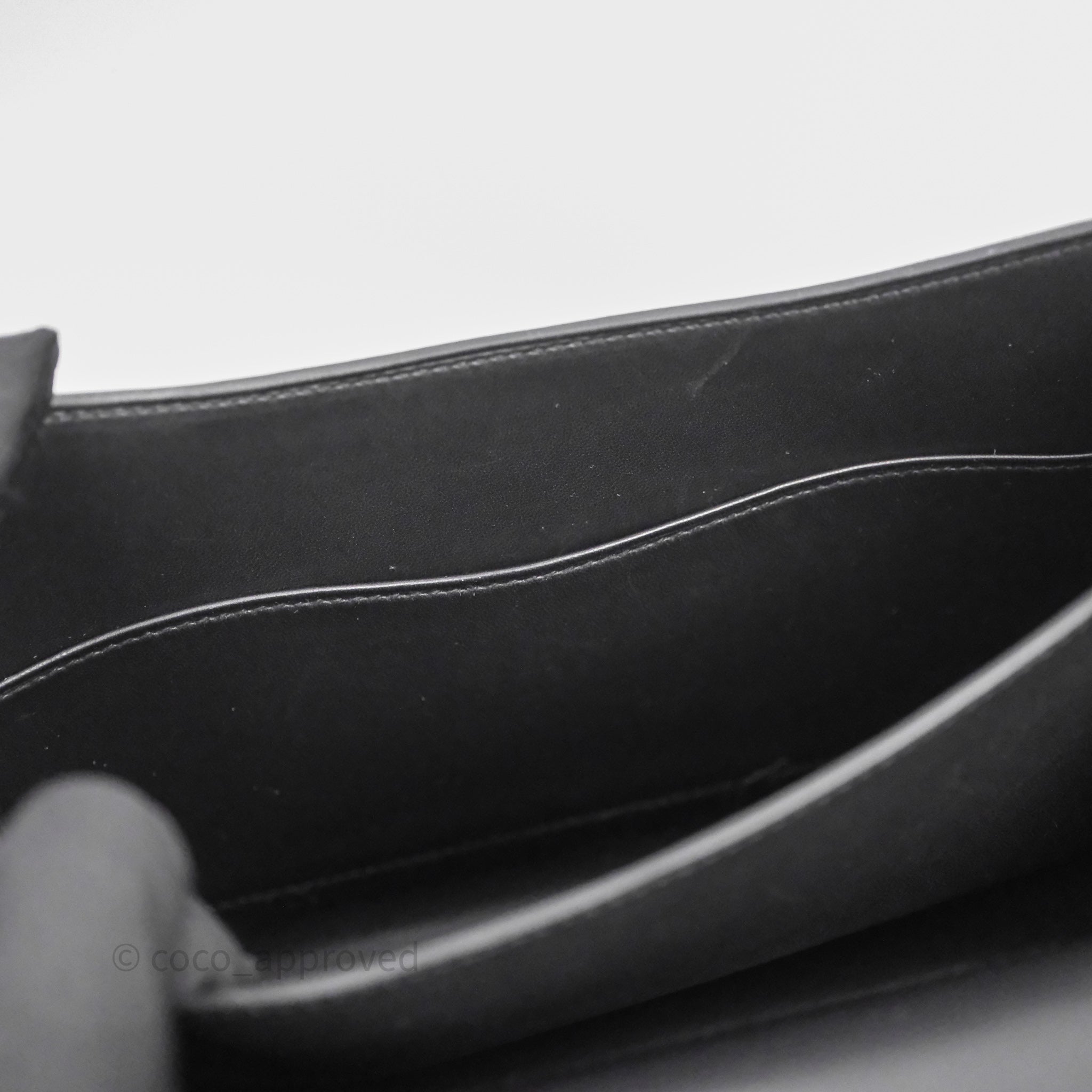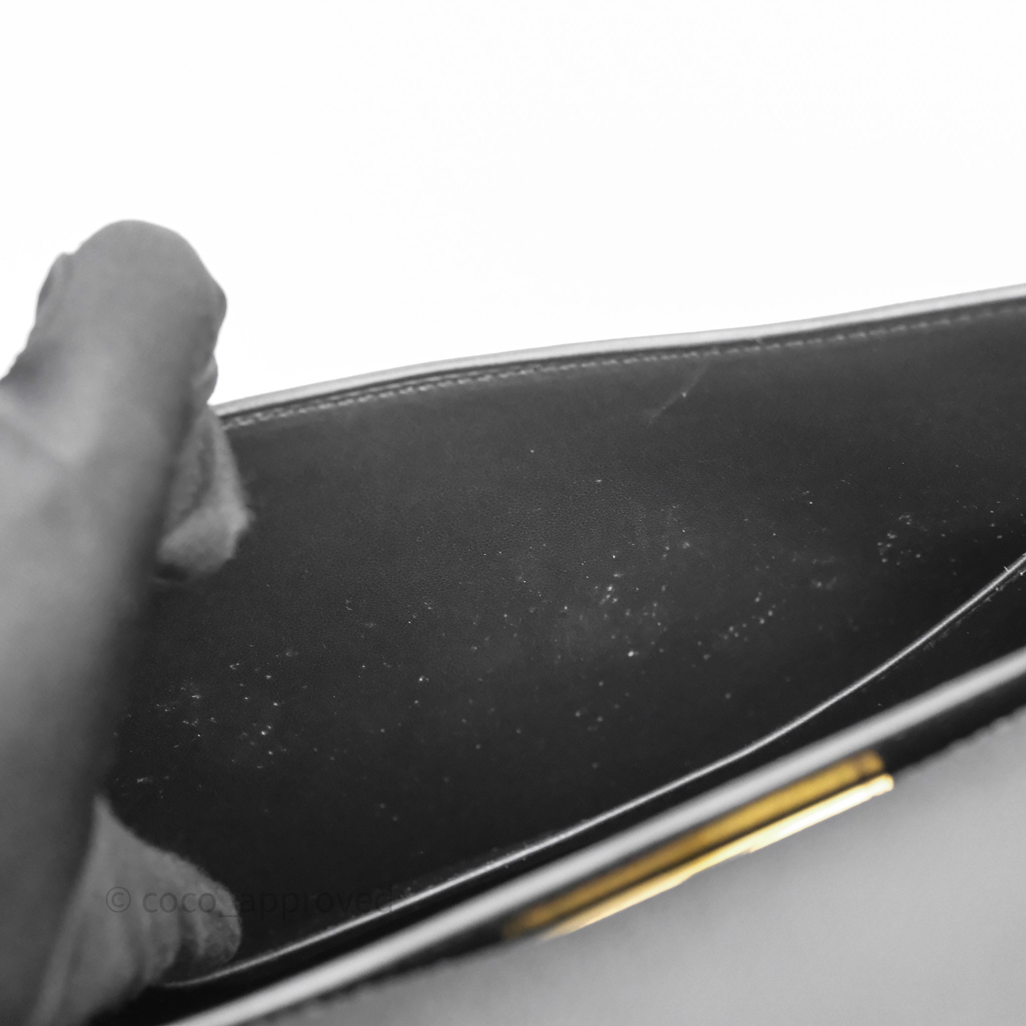9.3/10 excellent condition. Hairlines and marks on interior and under flap. Dent on under flap.