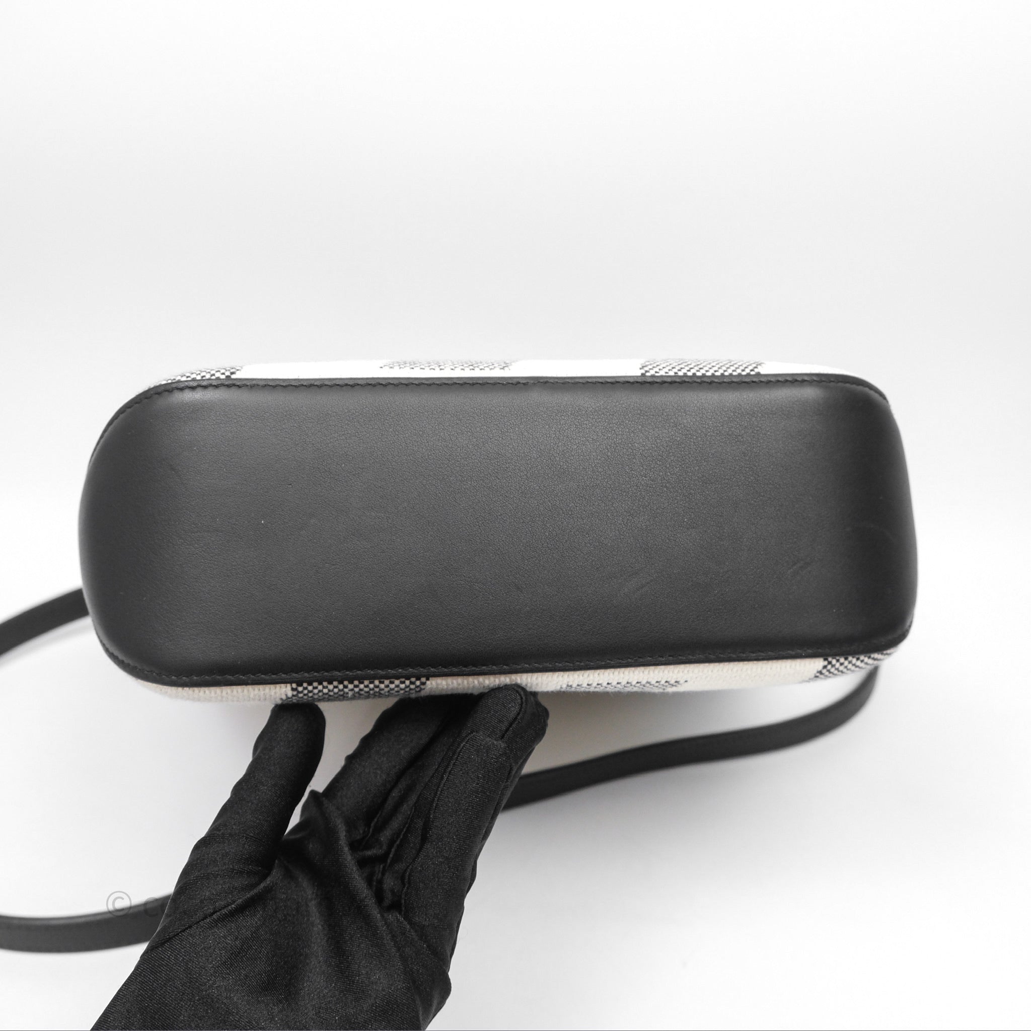9.4/10 excellent to mint condition. Dent and scratches on bottom and interior . Mark on strap and back.